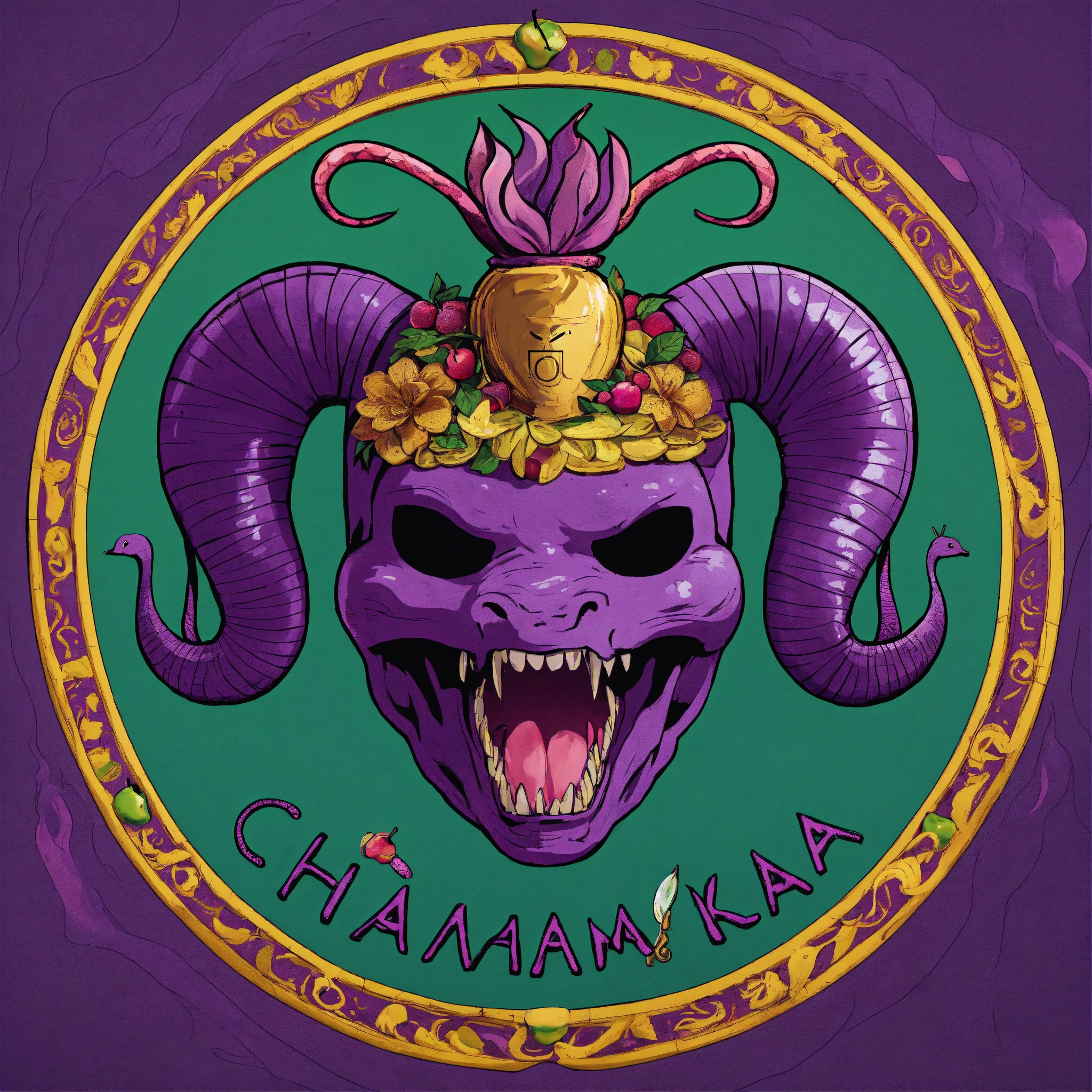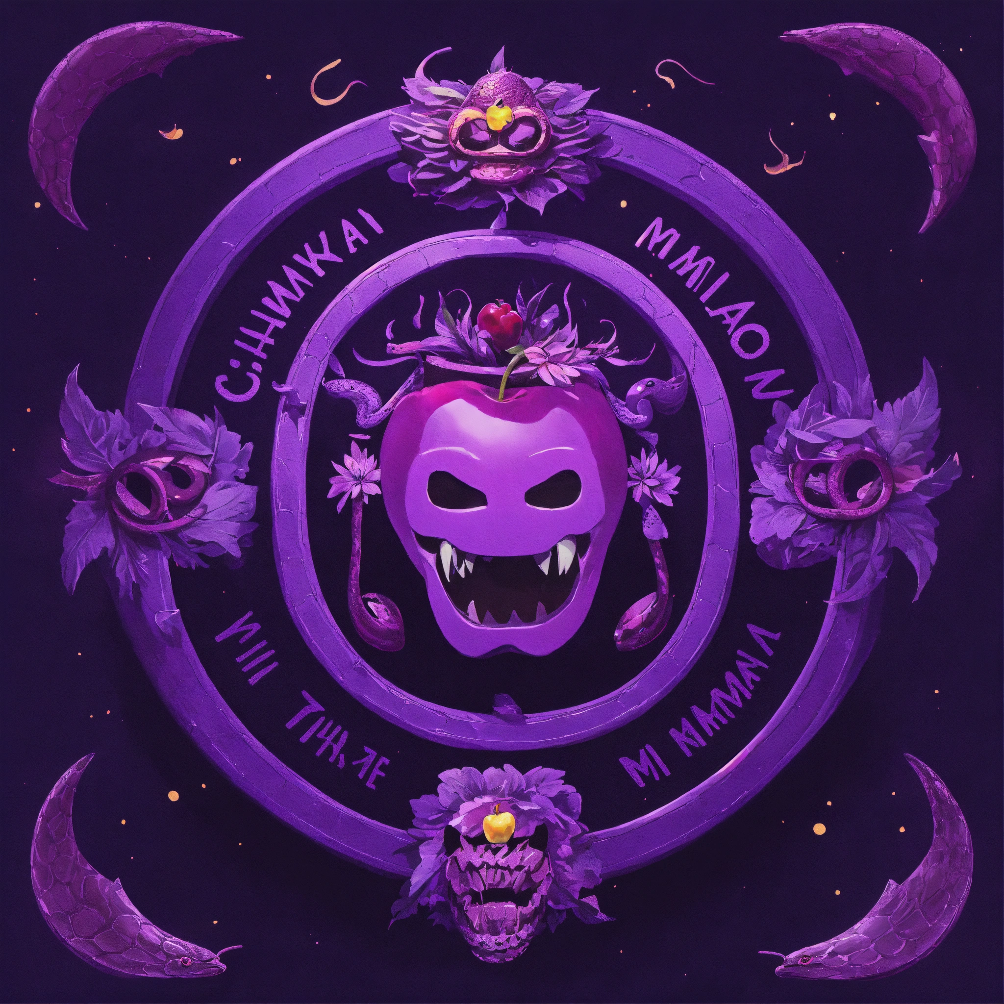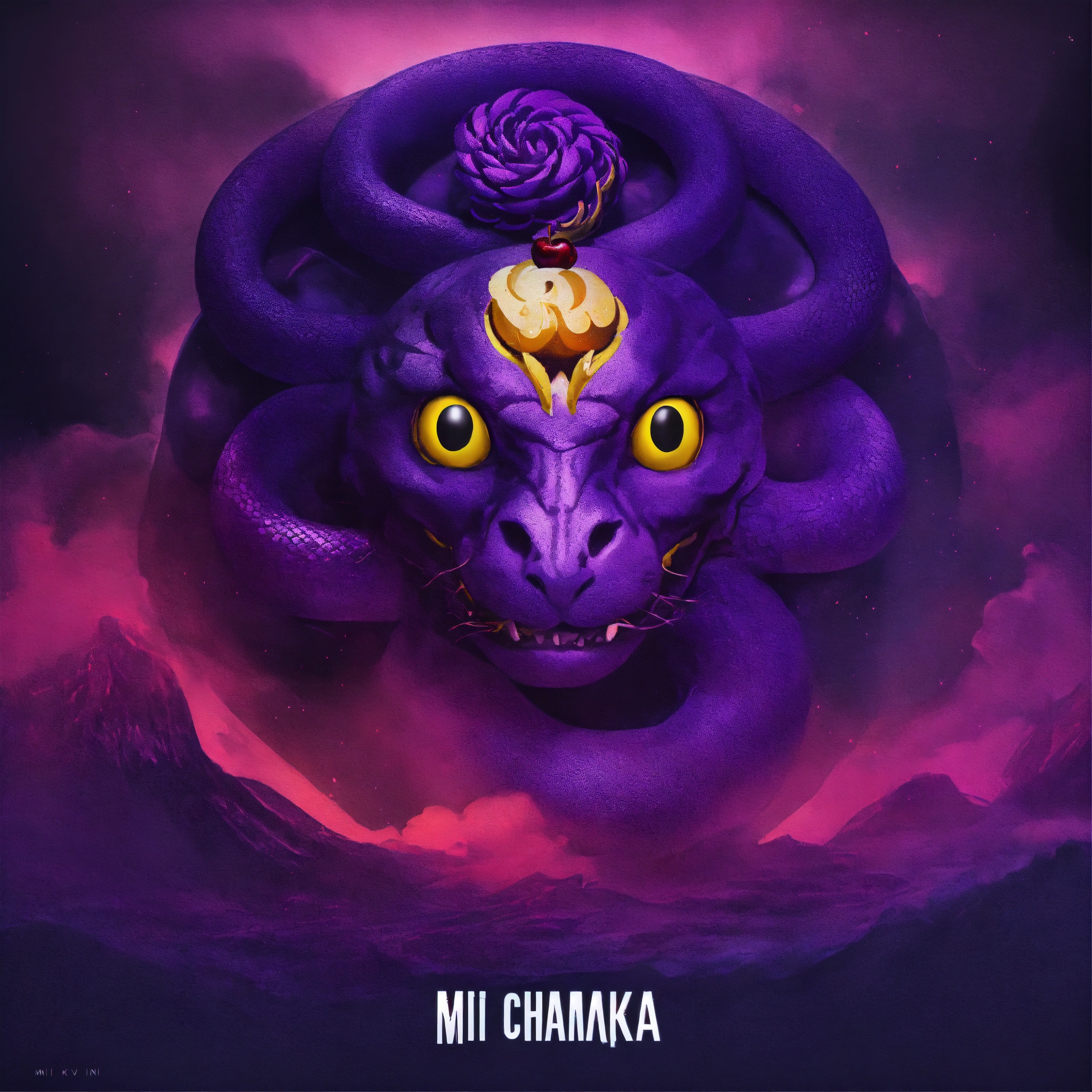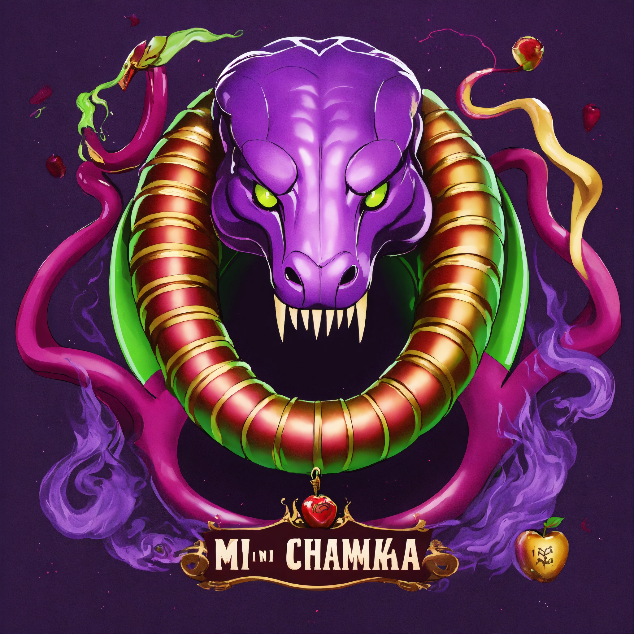 Single reggeaton song artwork, dark colors, dominant purple, with a bitte apple in the middle wrapped by a snake, high definition, creative devil emoji at the bottom, at the top letters with smoke that say "mi chamaka"