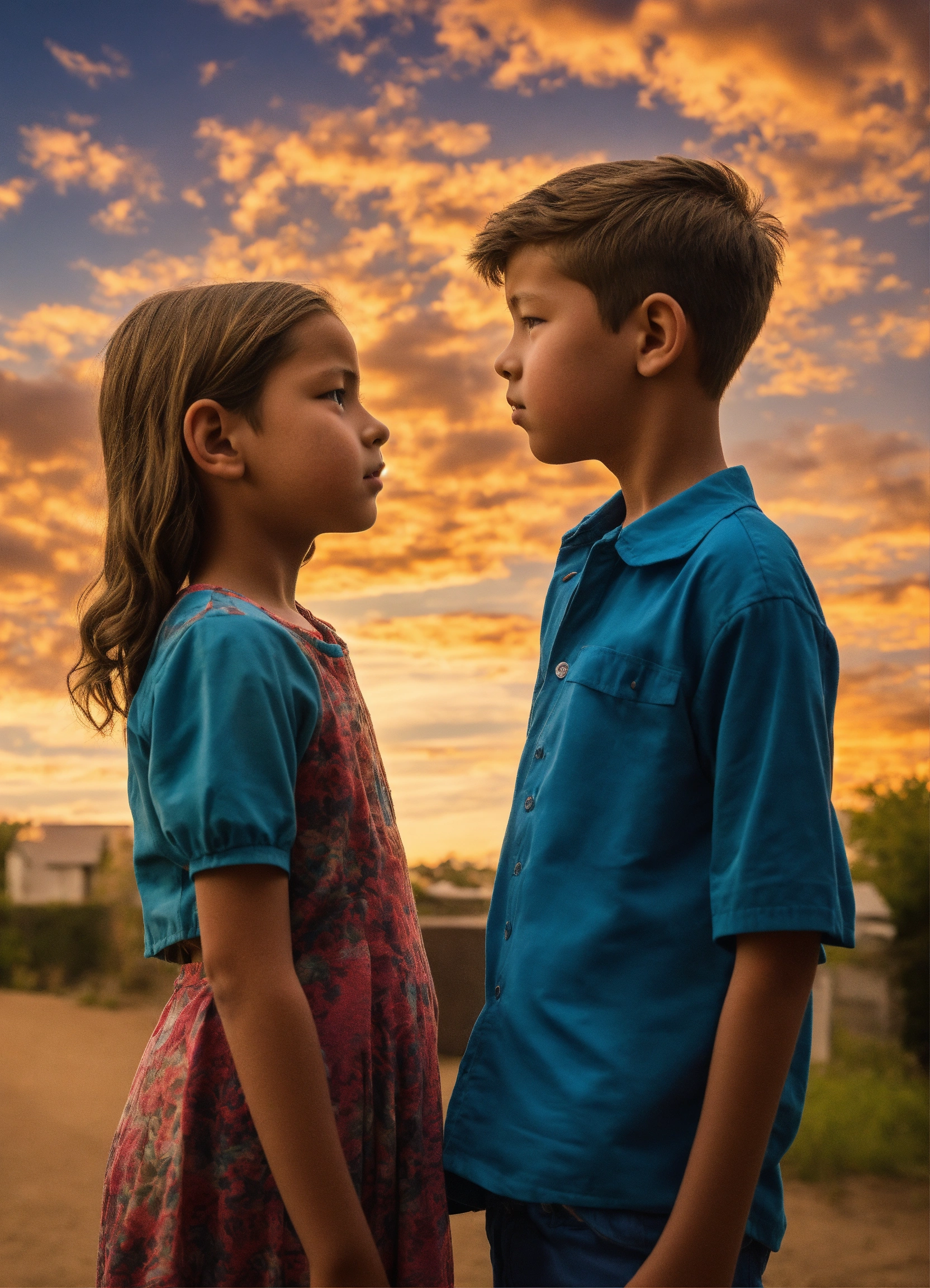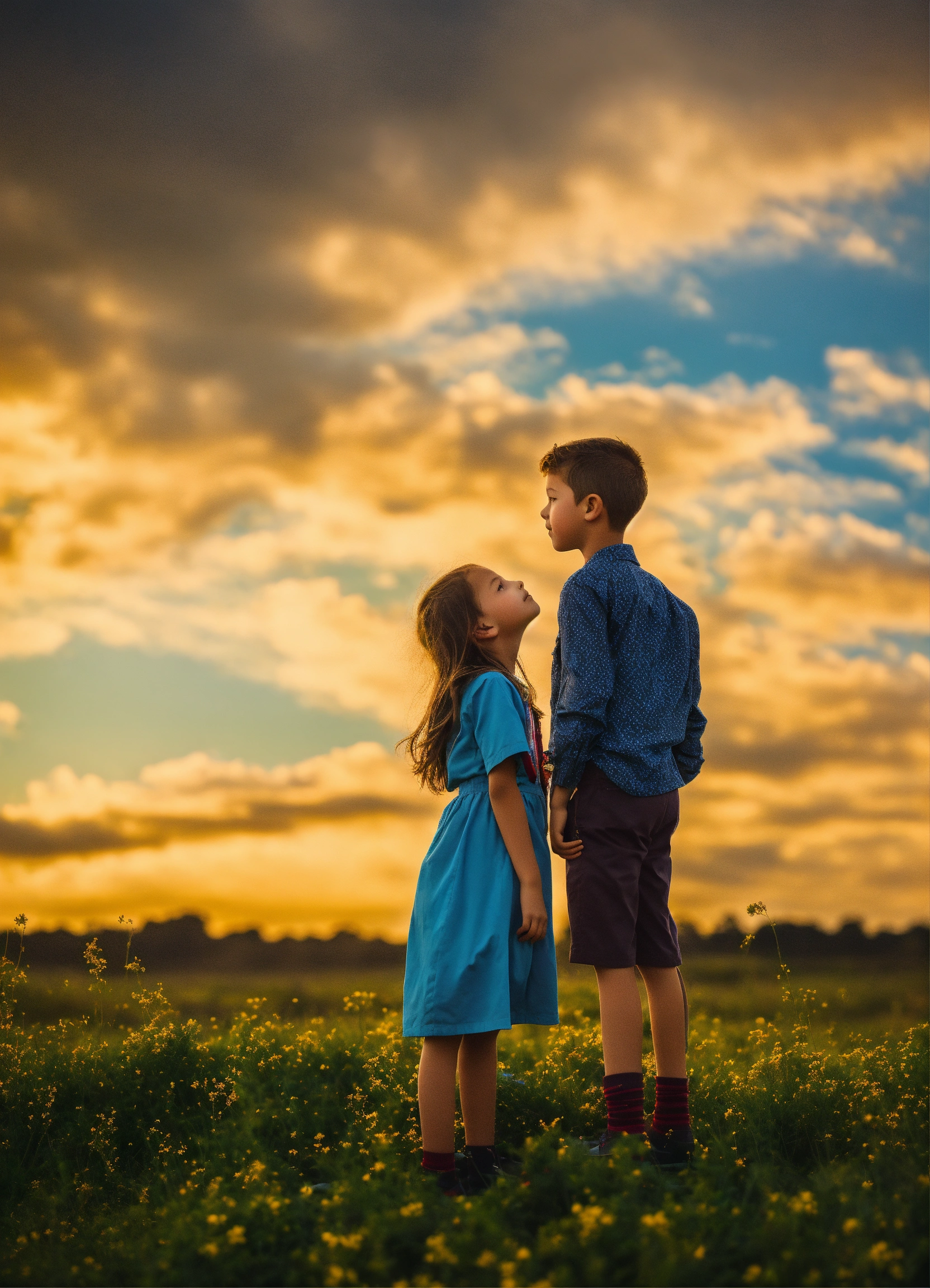A 12-year-old boy and his 9-year-old sister looking at the sky fascinated, verys beautiful and well dressed and modern