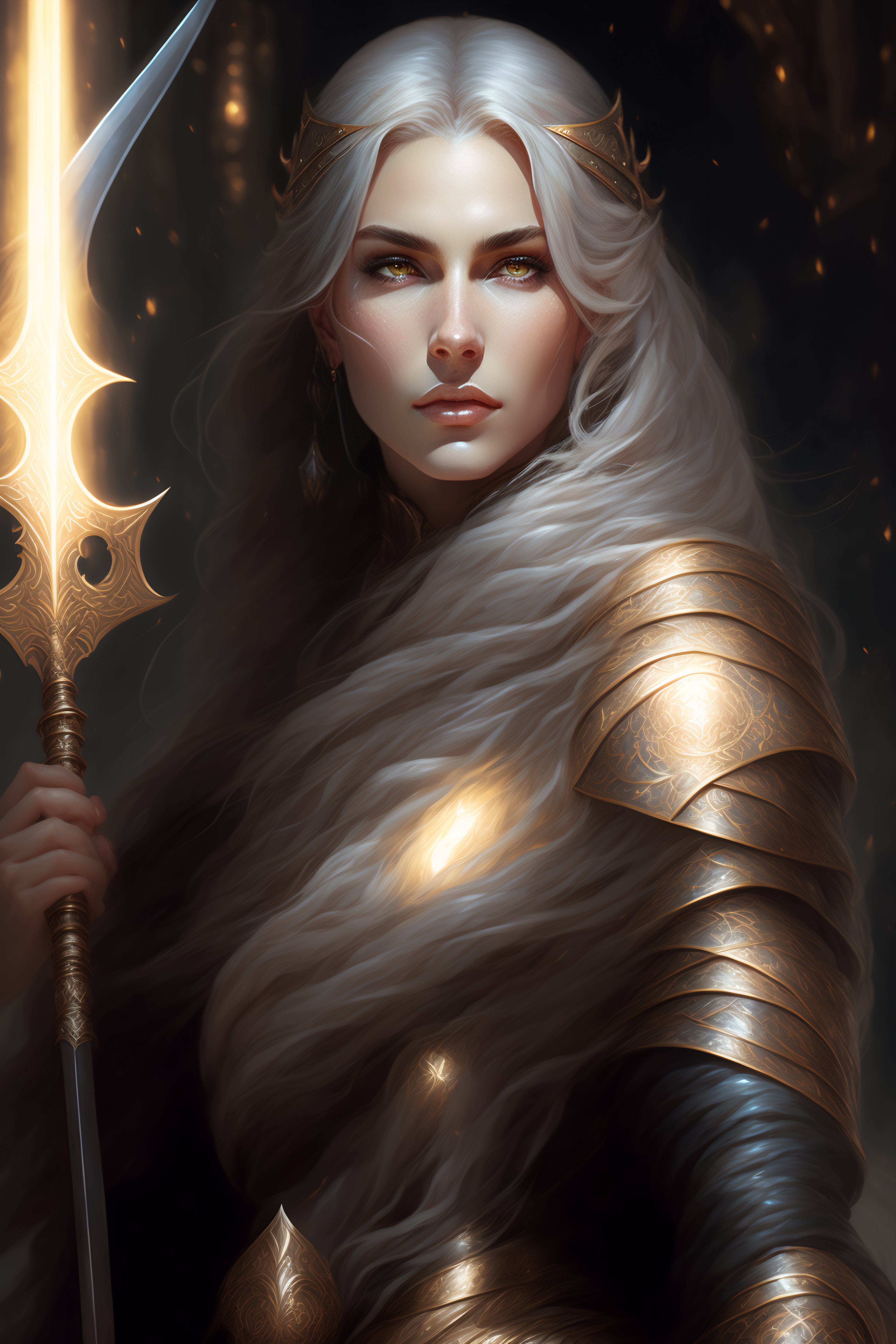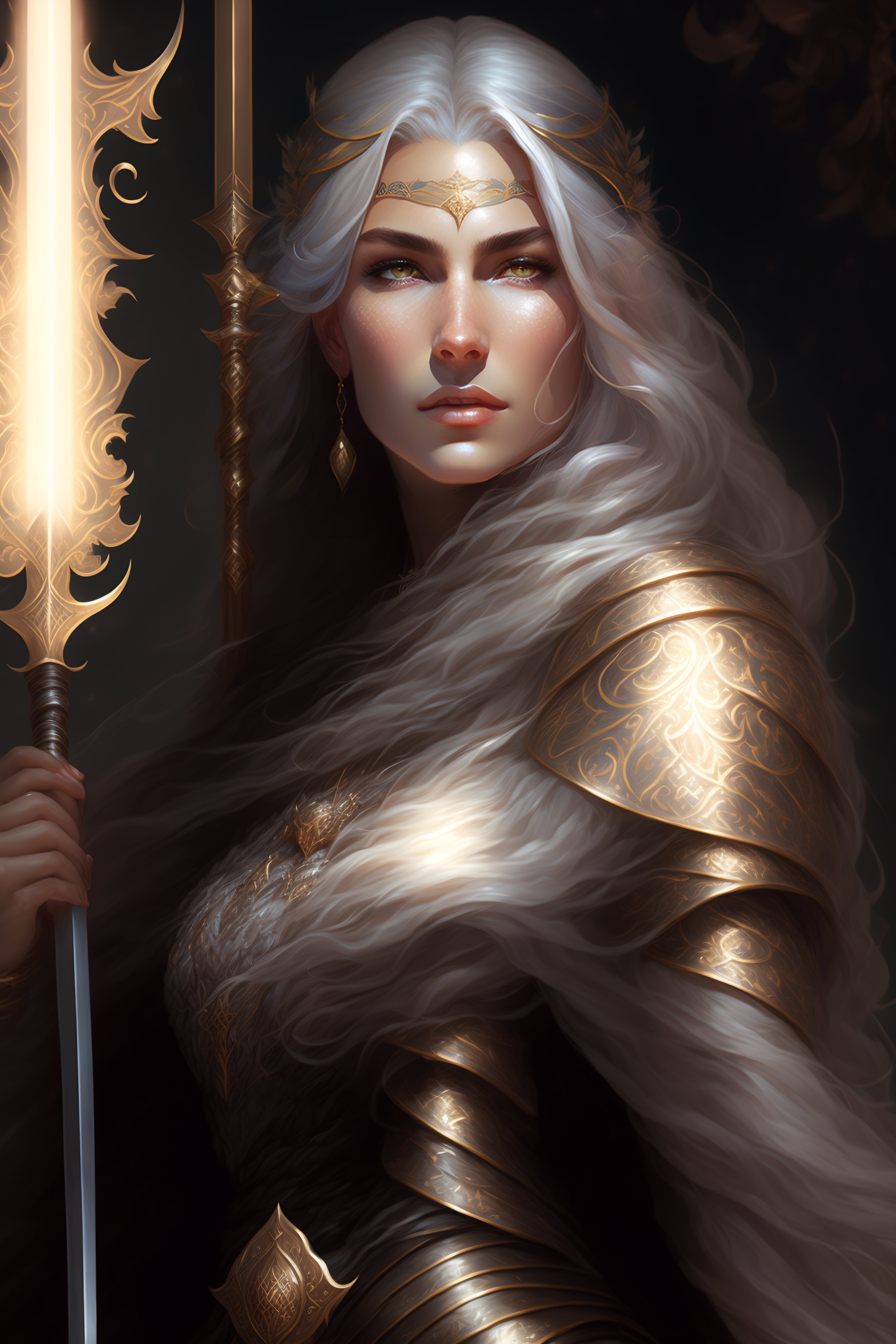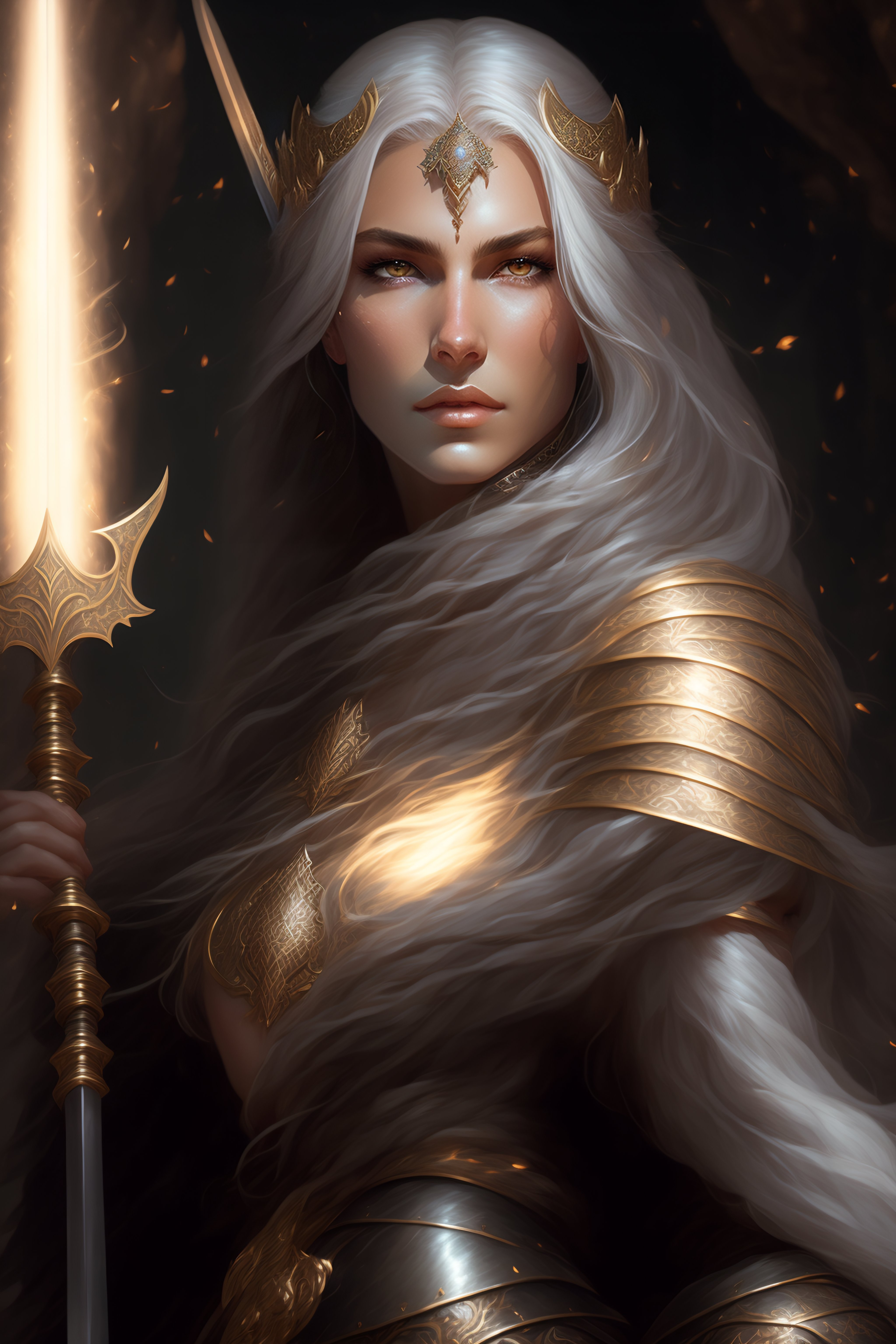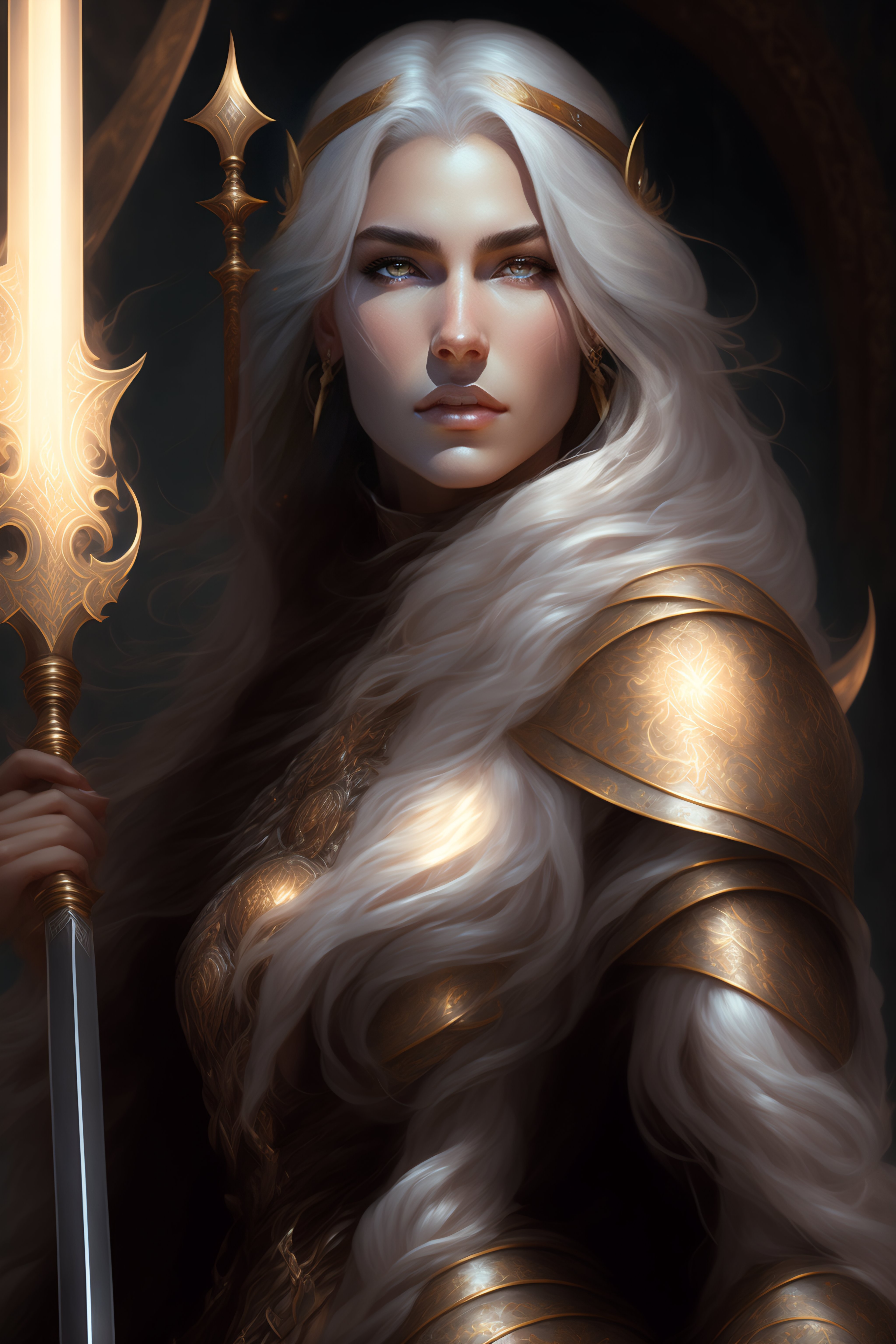 Female cleric in center, dnd, fantasy, gray hair, holding sword, dark light night, intricate, elegant, sharp focus, illustration, highly detailed, dark lighting, full body, digital painting, concept art, matte, art by wlop and artgerm and greg rutkowski and alphonse mucha, masterpiece