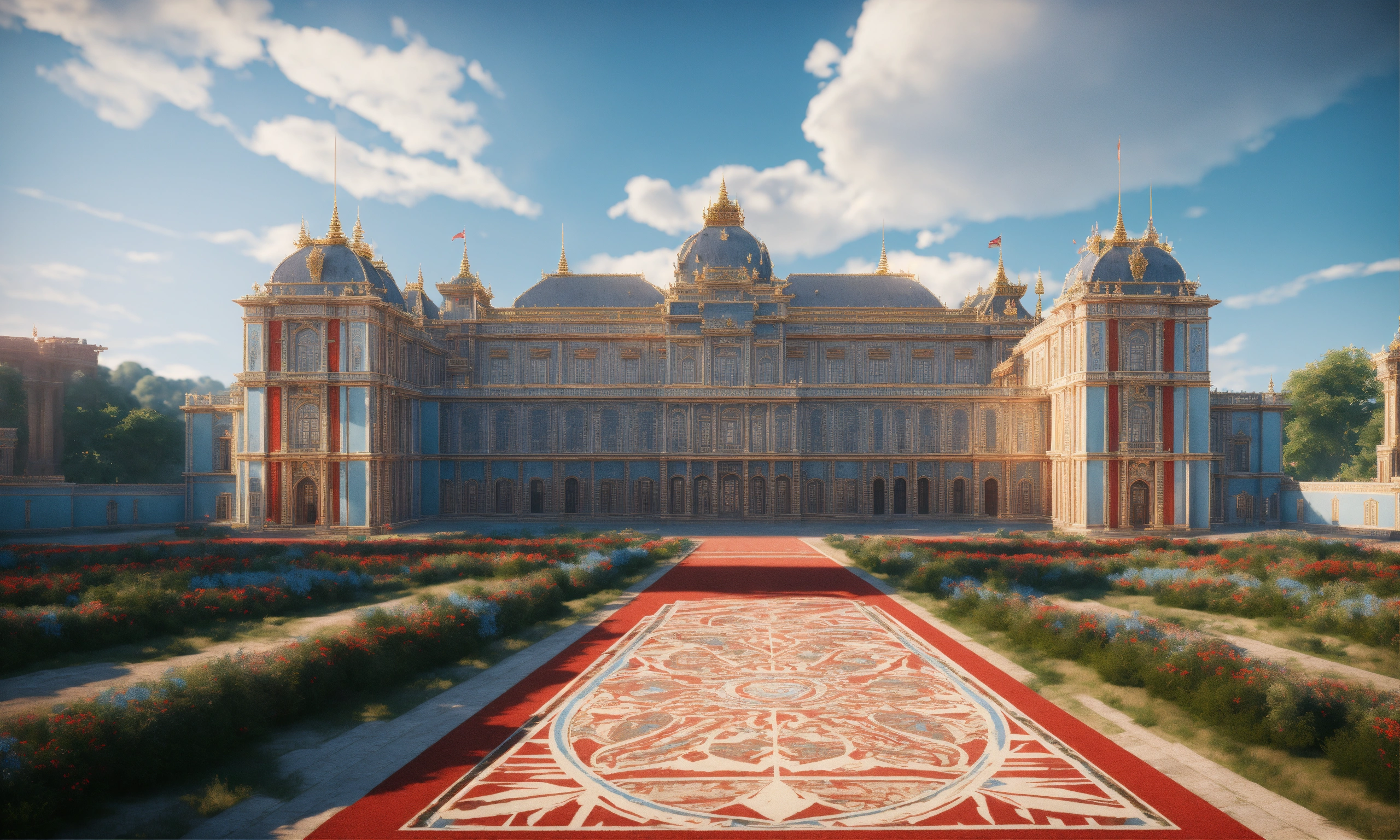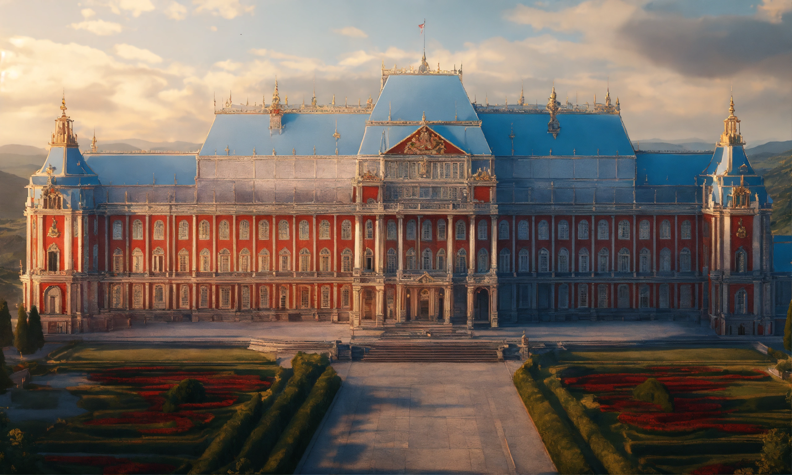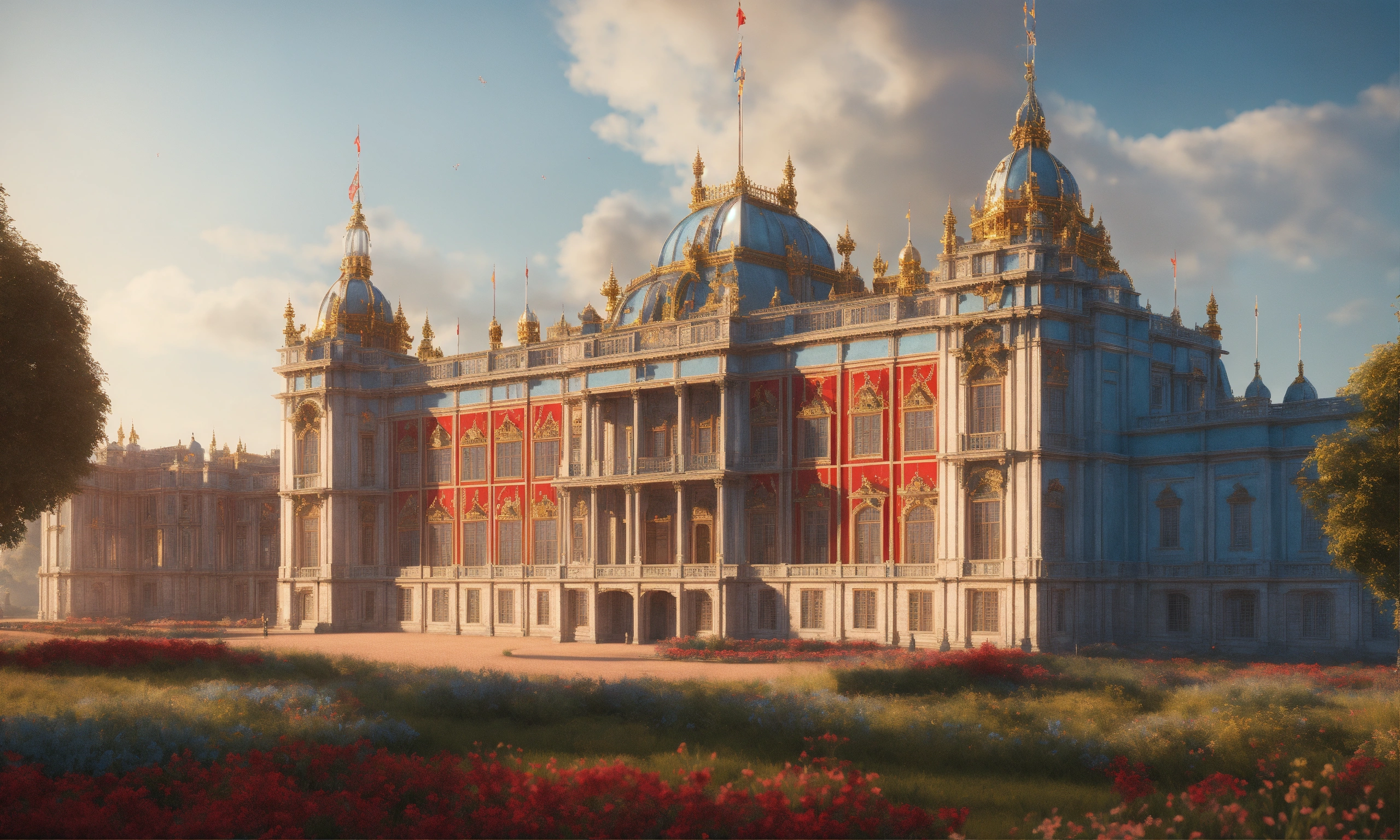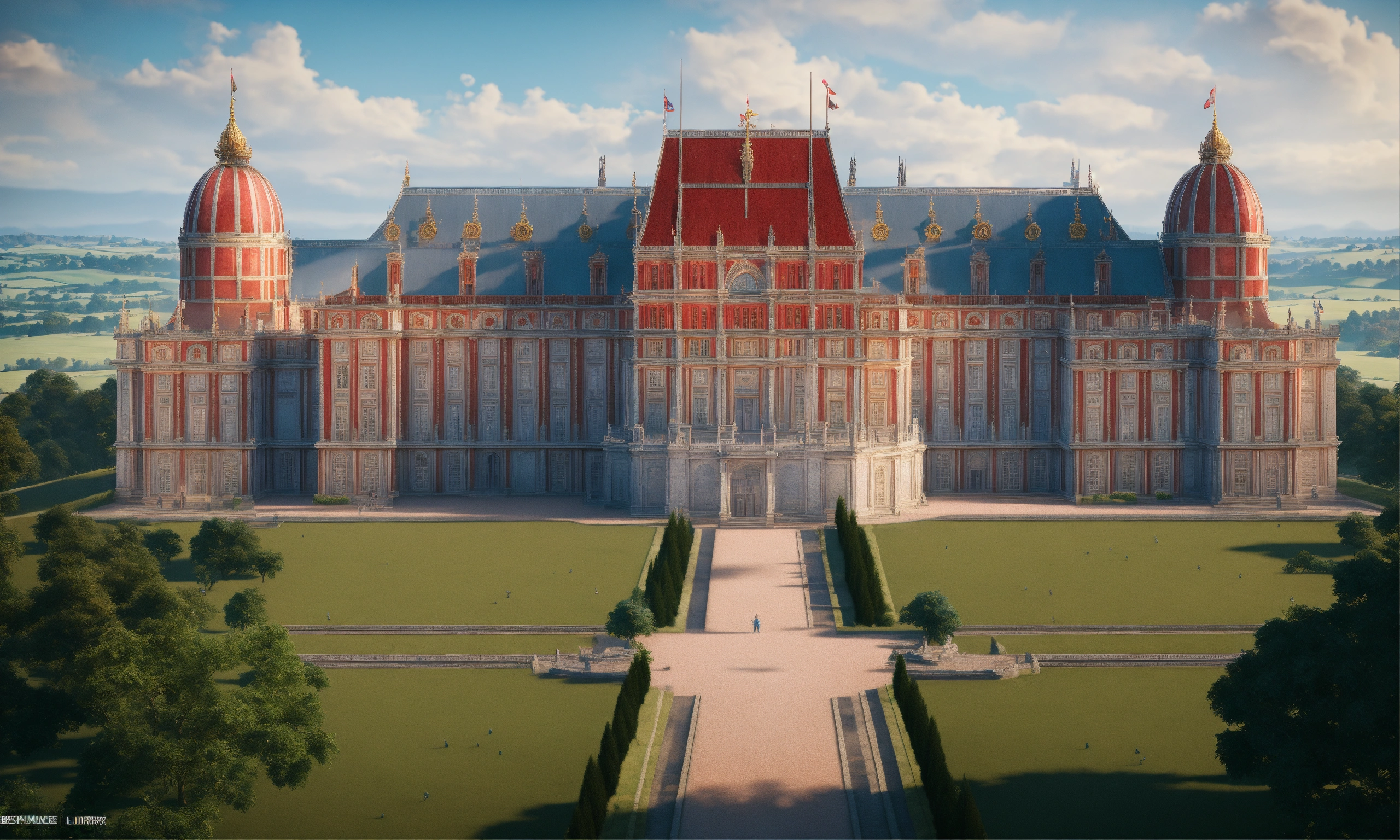 Full image of a massive royal palace with light blue and red designs, british architecture, overlooking the british countryside, symmetrical, highly detailed, unreal engine, 8d