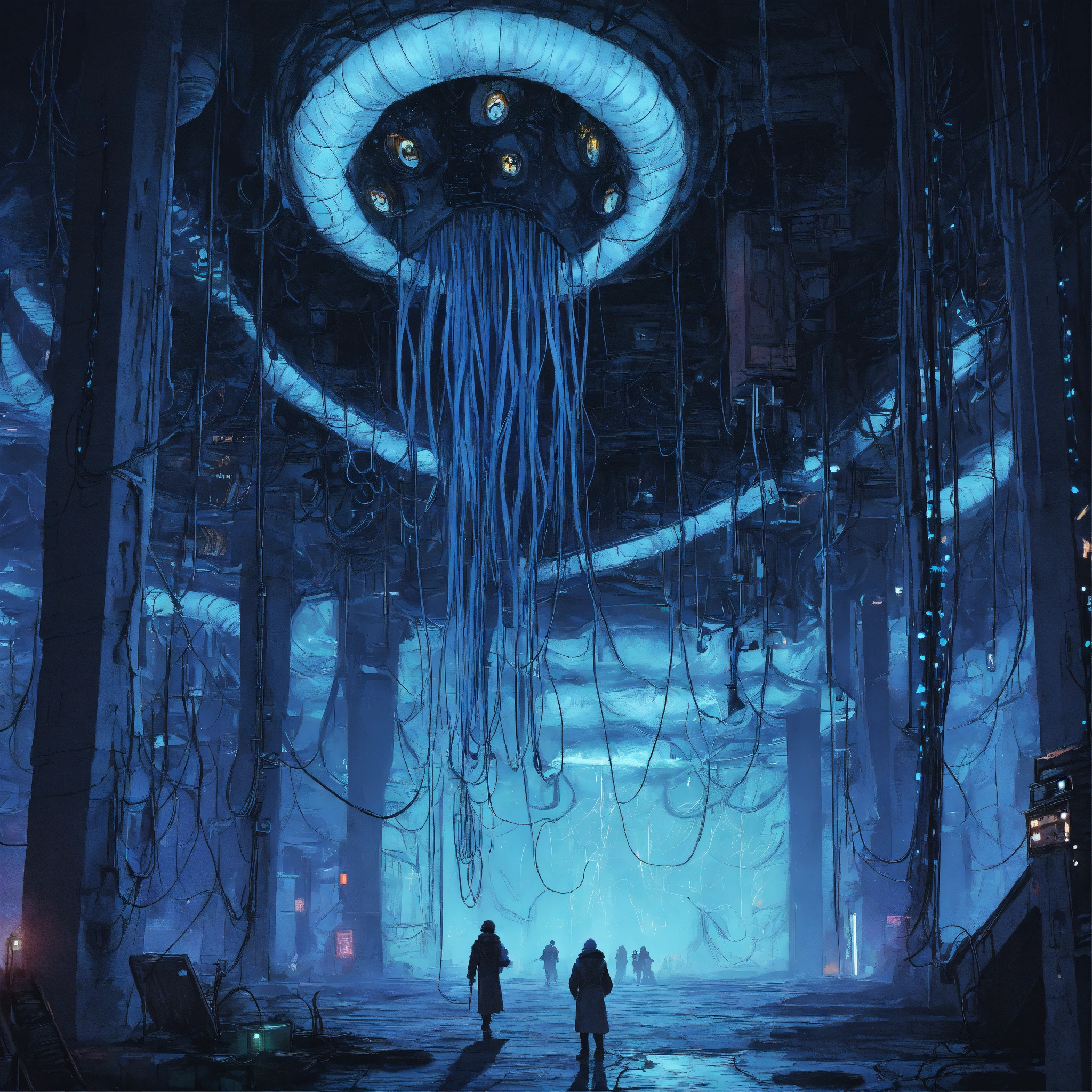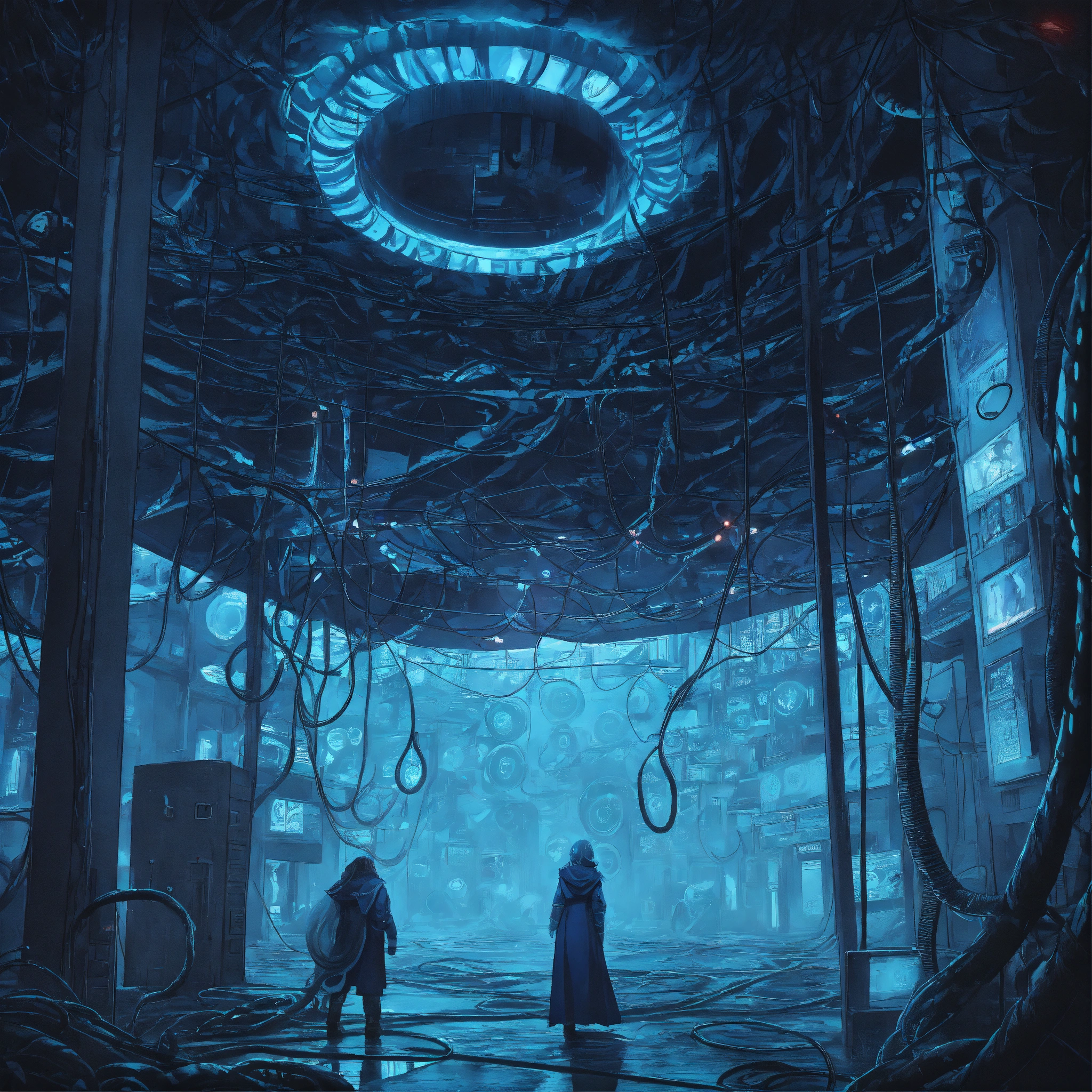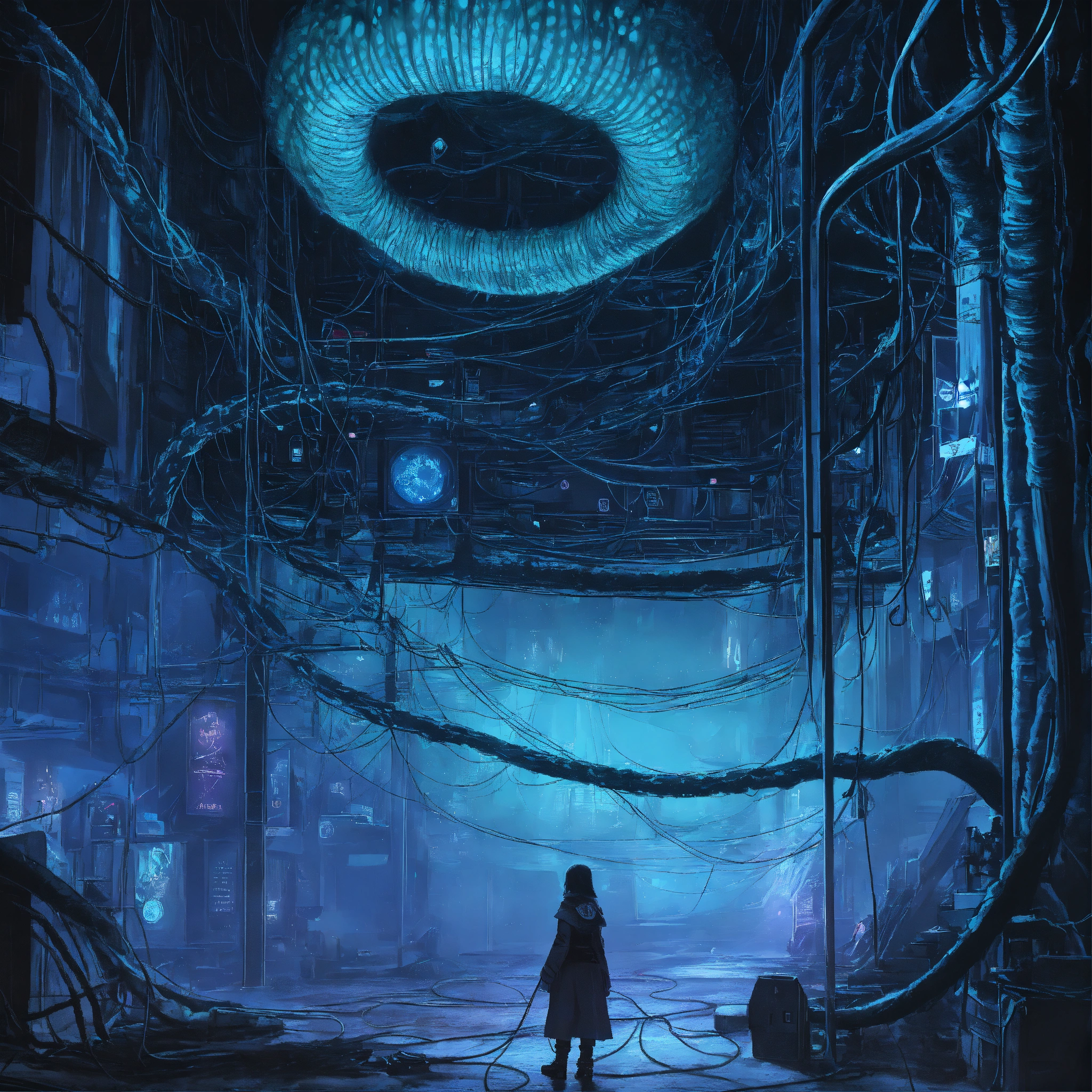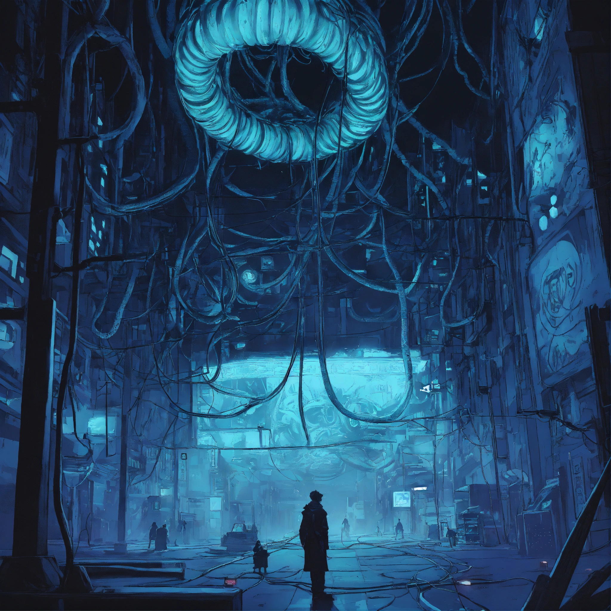 Craft an image for a dystopian comic where people are enthralled by a gargantuan screen, its tentacle-like cables coiling around them. their eyes are hollows radiating static blue light, and their mouths are agape in silent screams, frozen in terror. the overwhelming darkness around them is occasionally pierced by the stark blue light from the screen