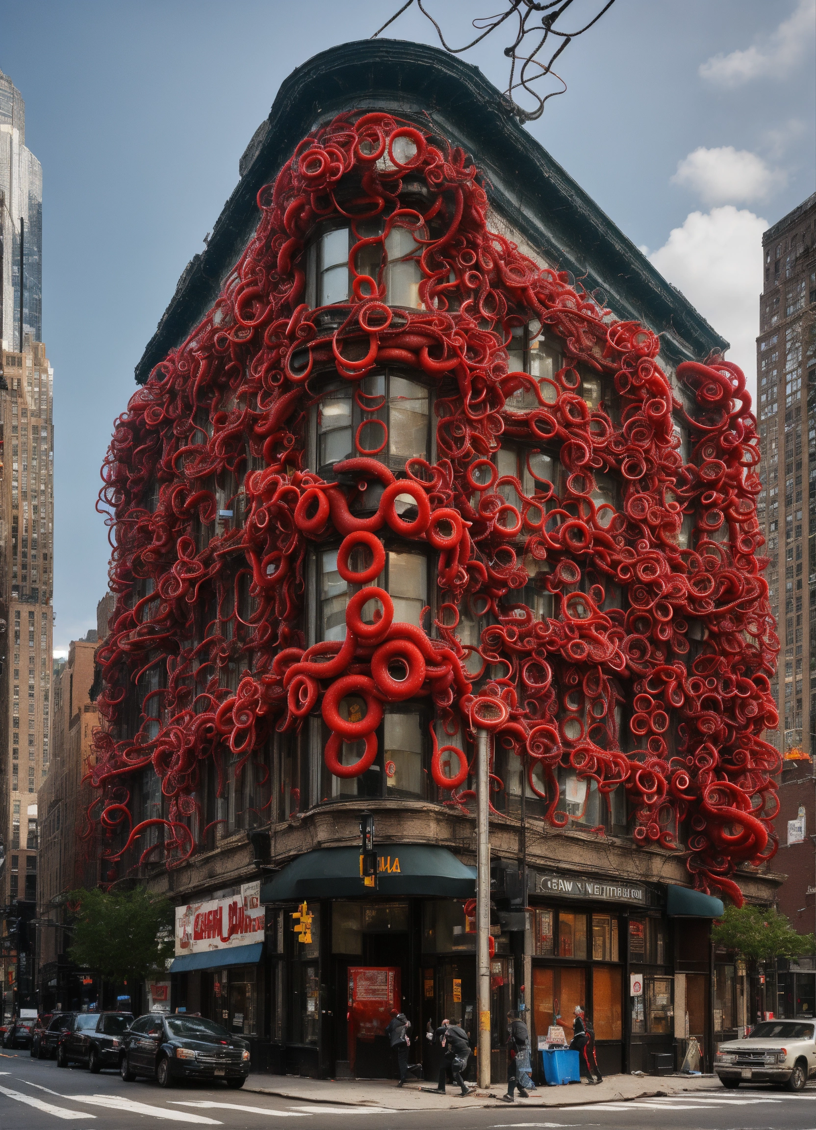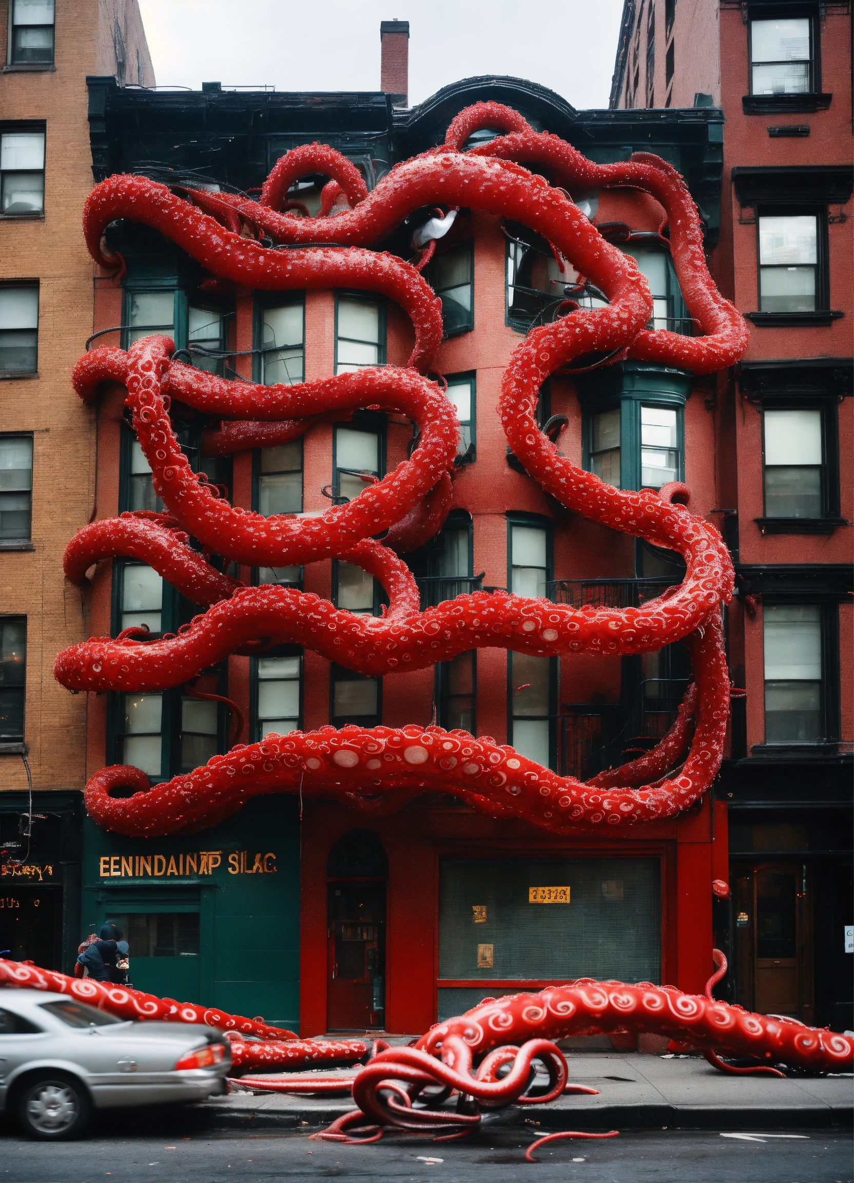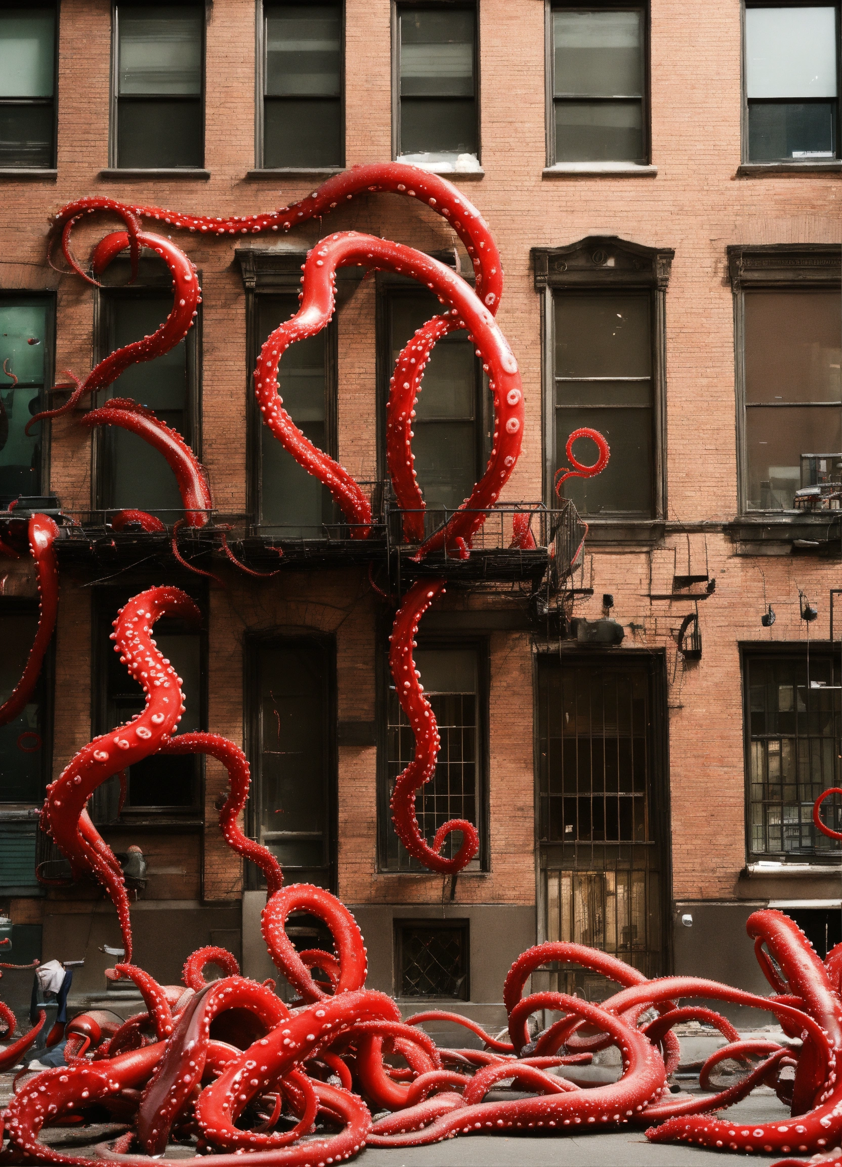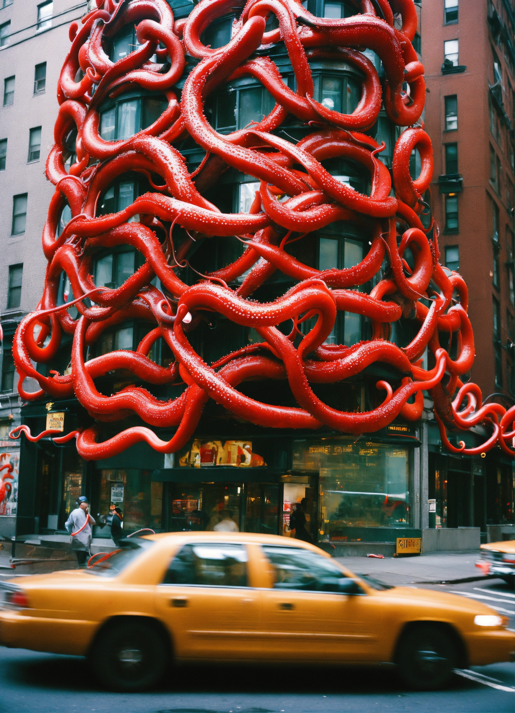 In this photograph taken in a street in new york, single building broke from the foundation and moving. it got multiple long, flexible tentacles or appendages extend from its body, each adorned with repeated patterns of red and black rings. these tentacles end in claw-like structures. the tentacles are trying to catch office workers. people screaming and runaway in panic.
