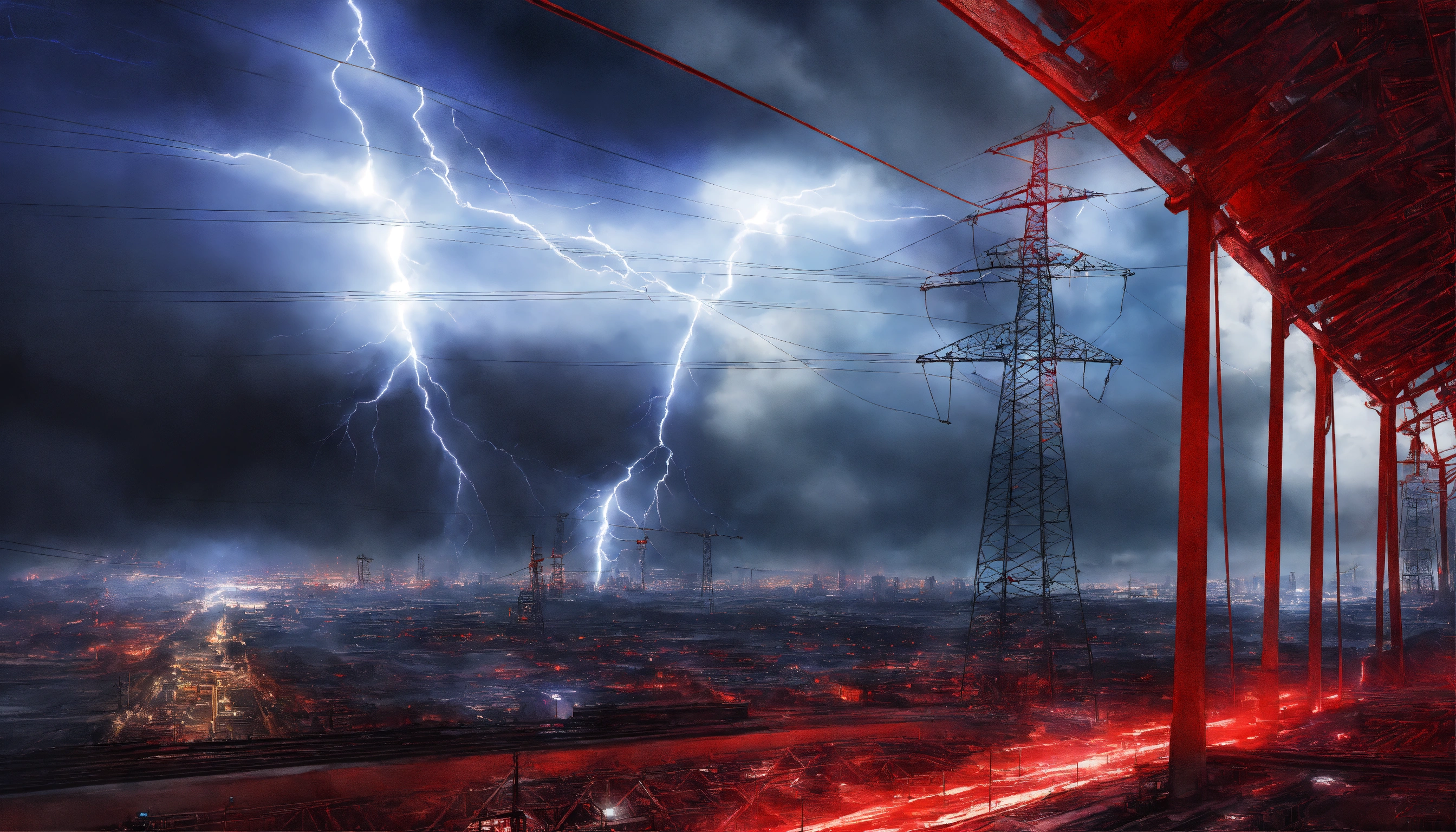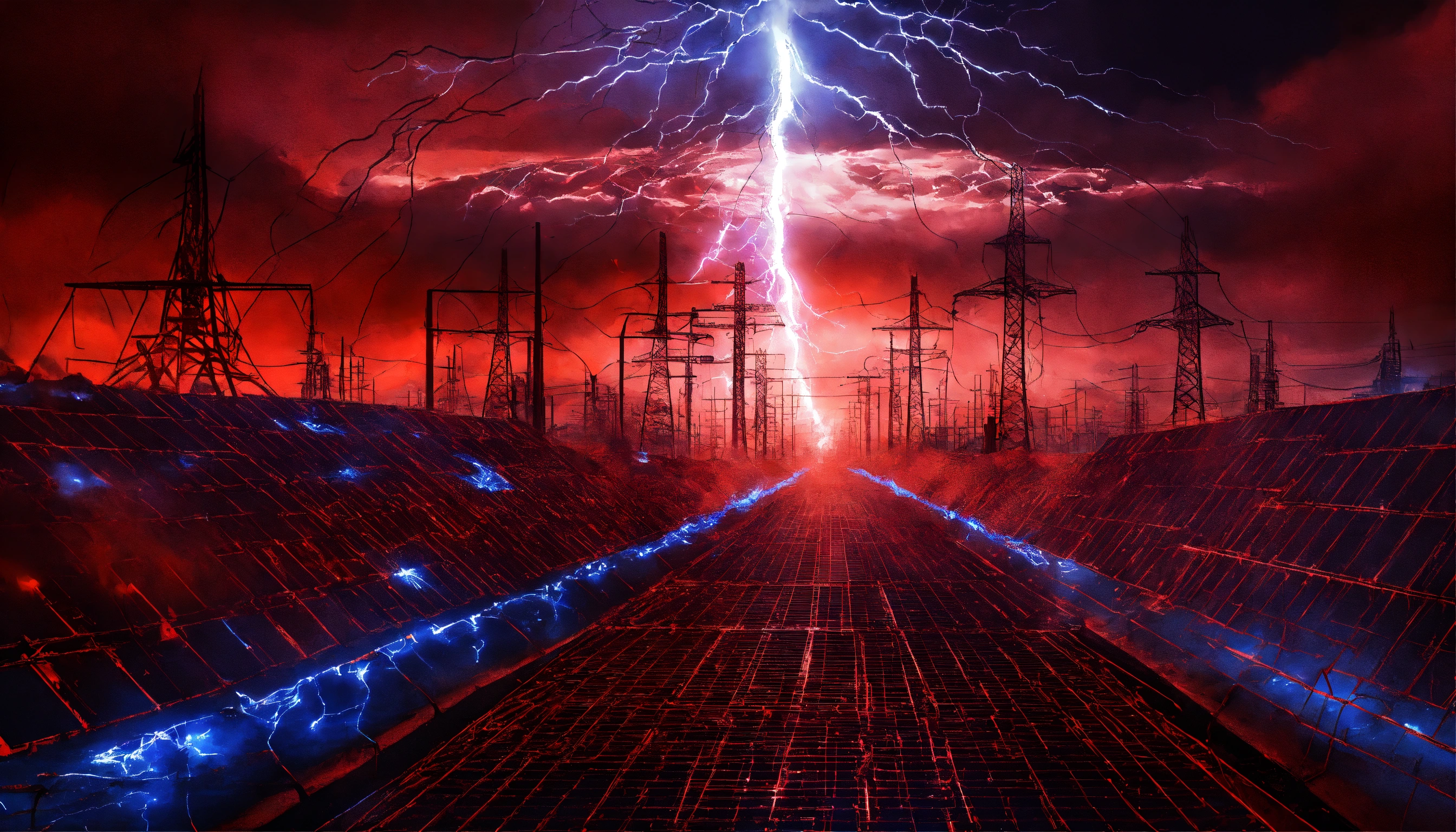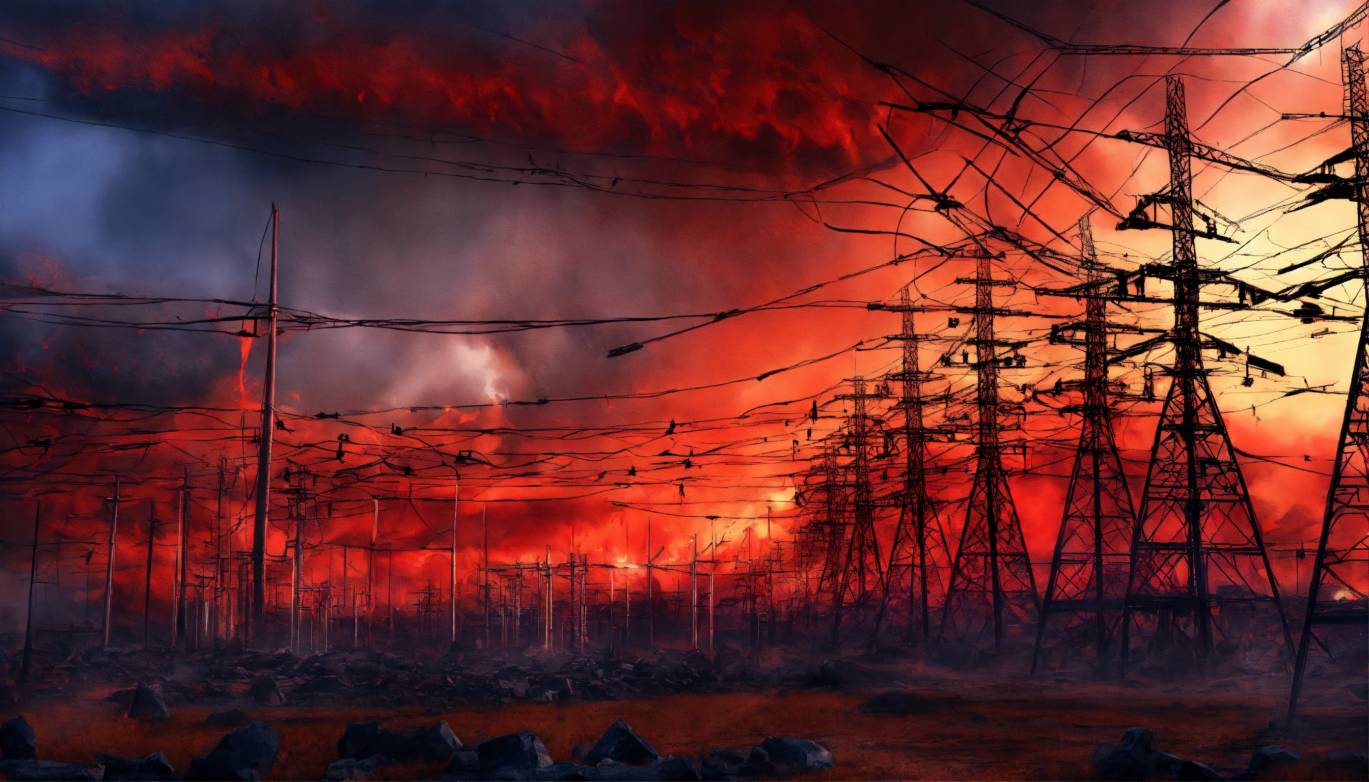 Evil demonic vision of the apocalypse attack on the energy grid, america has fallen, symbolic, visionary, creative and unique, extremely realistic and detailed, red white and blue, designed and created by apollyon, attacking the grid