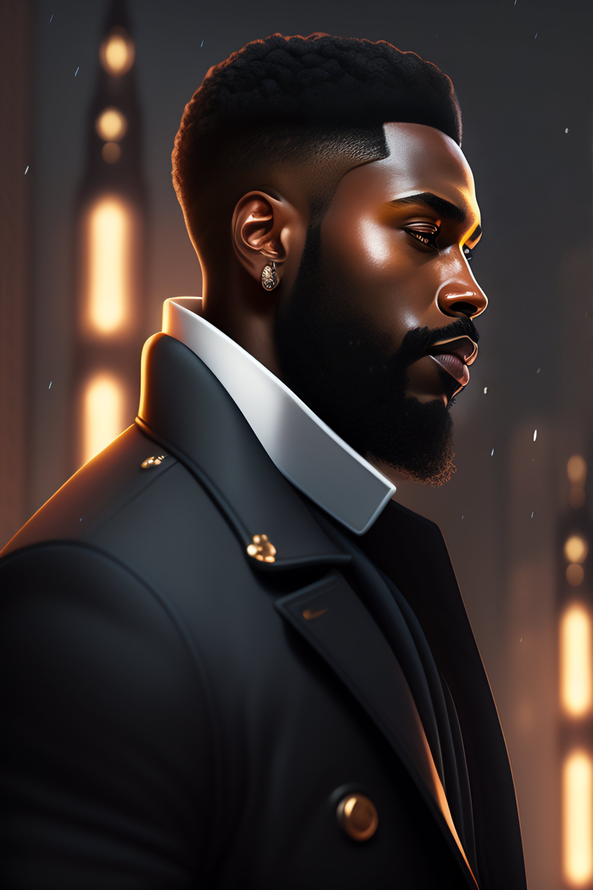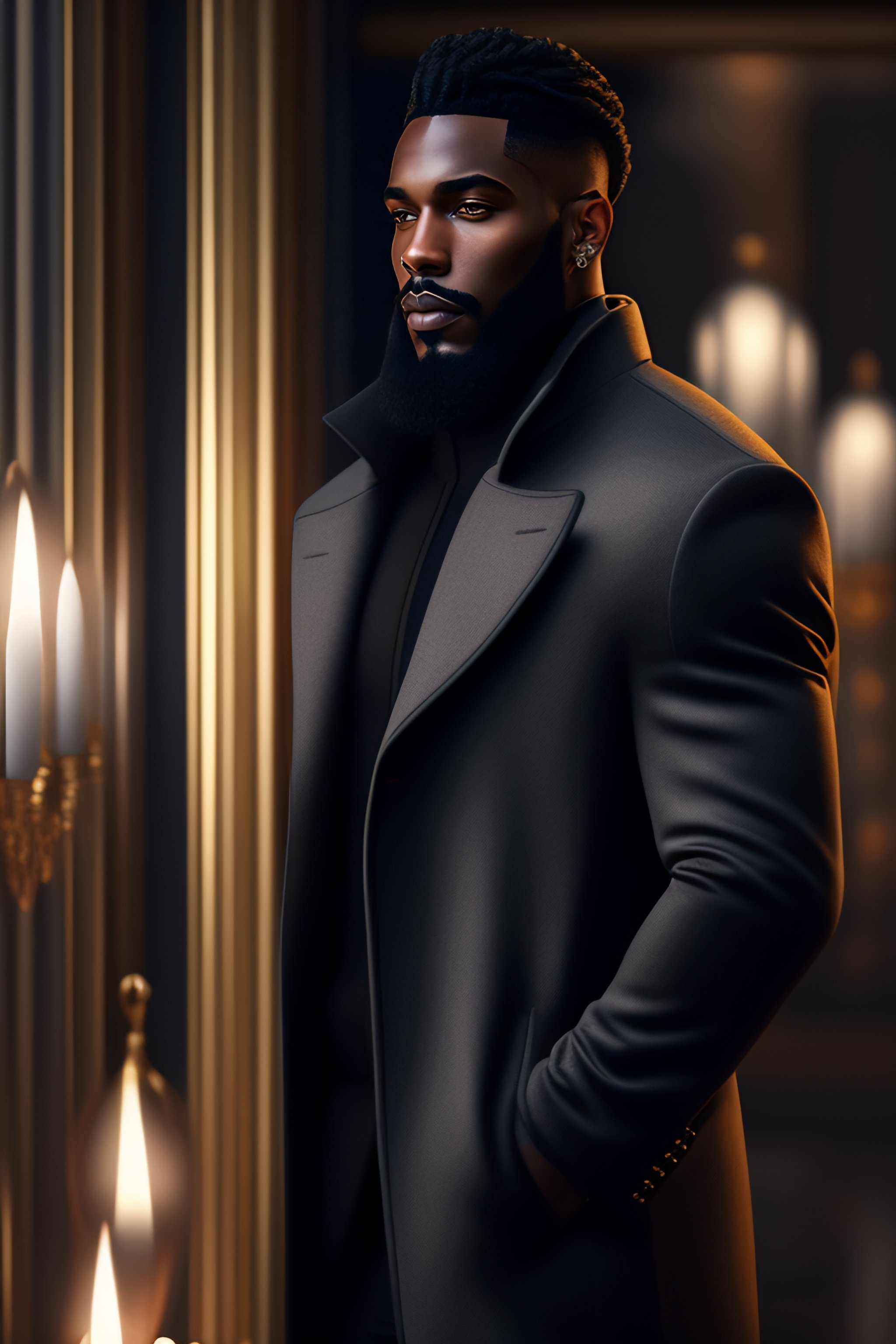 Portrait of handsome black man wearing grey peacoat, luxury townhome interior, beard, wealth and luxury, elegant atmosphere, glowing lights, highly detailed, digital painting, artstation, concept art, smooth, sharp focus, illustration, art by wlop, mars ravelo and greg rutkowski