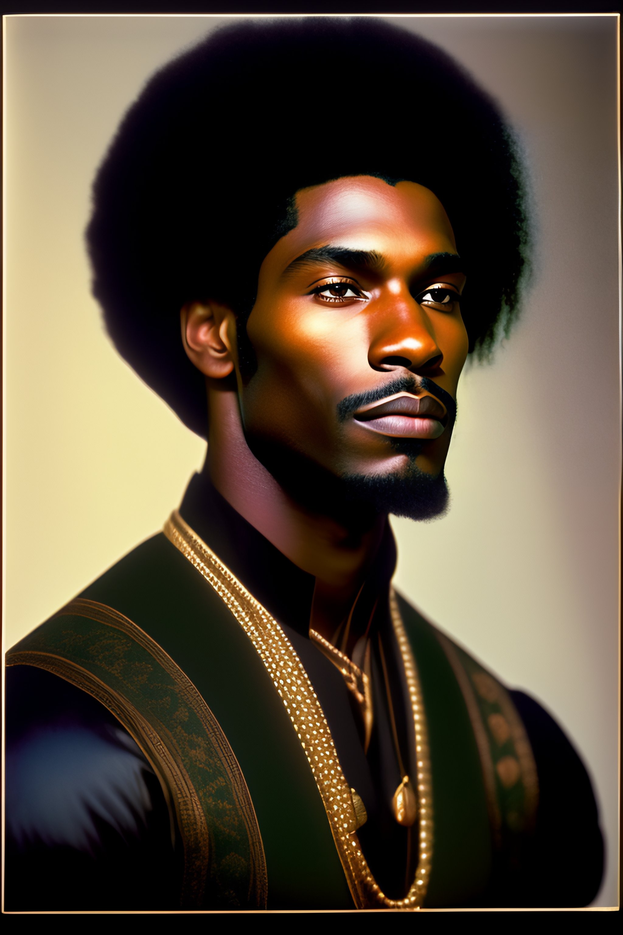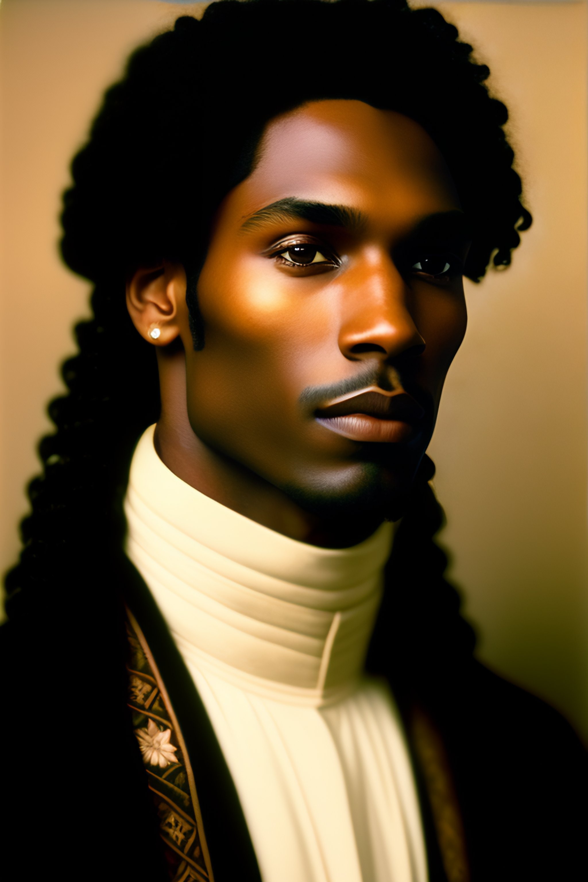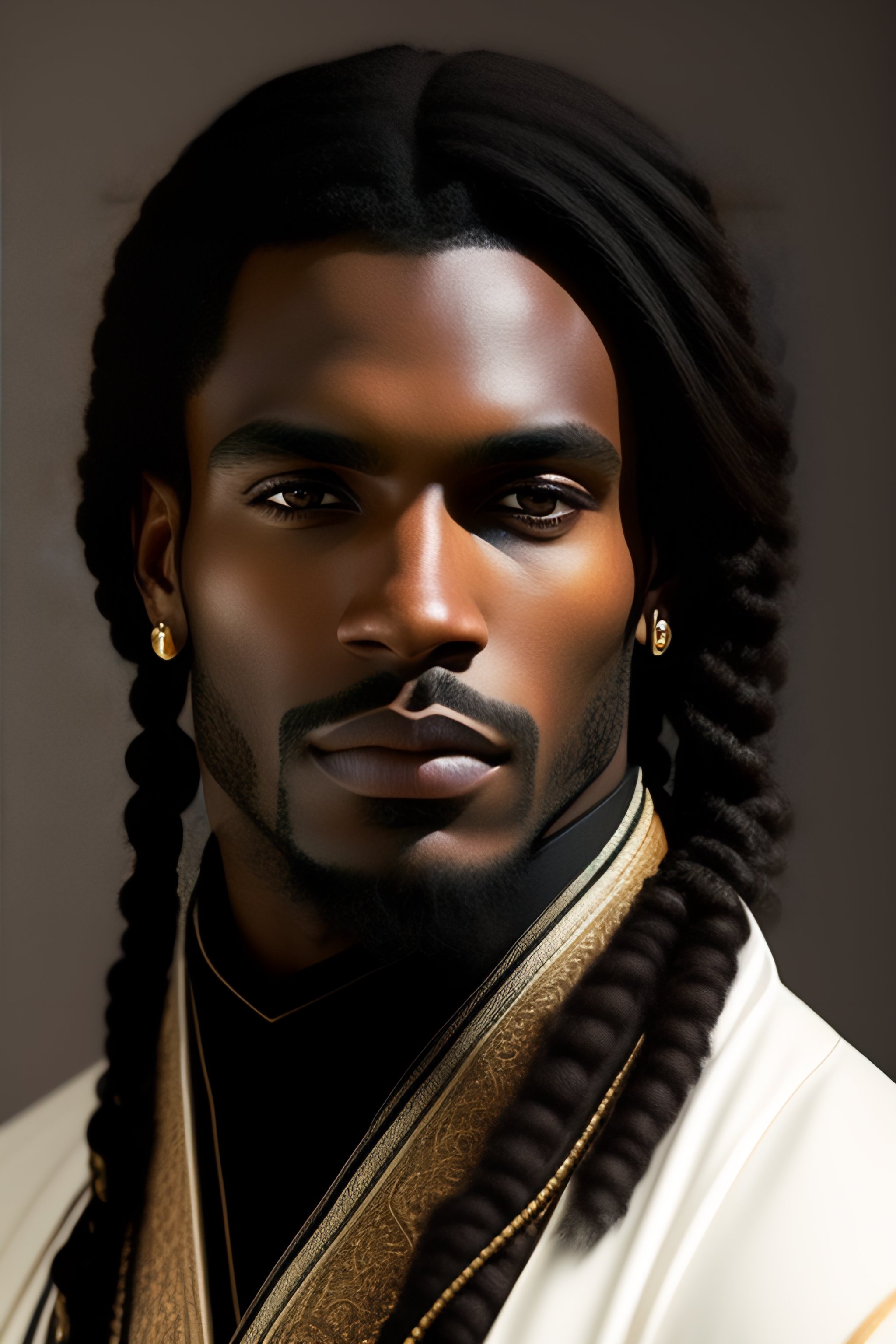 A portrait photo of a black metis with brown green eyes, curly half-long black hair, a scar above his right cheek, a mole on his left cheek, 28 years old, 1m73, thin, wearing a dark medieval tunic, white pants, futuristic boots, and wearing a short beard