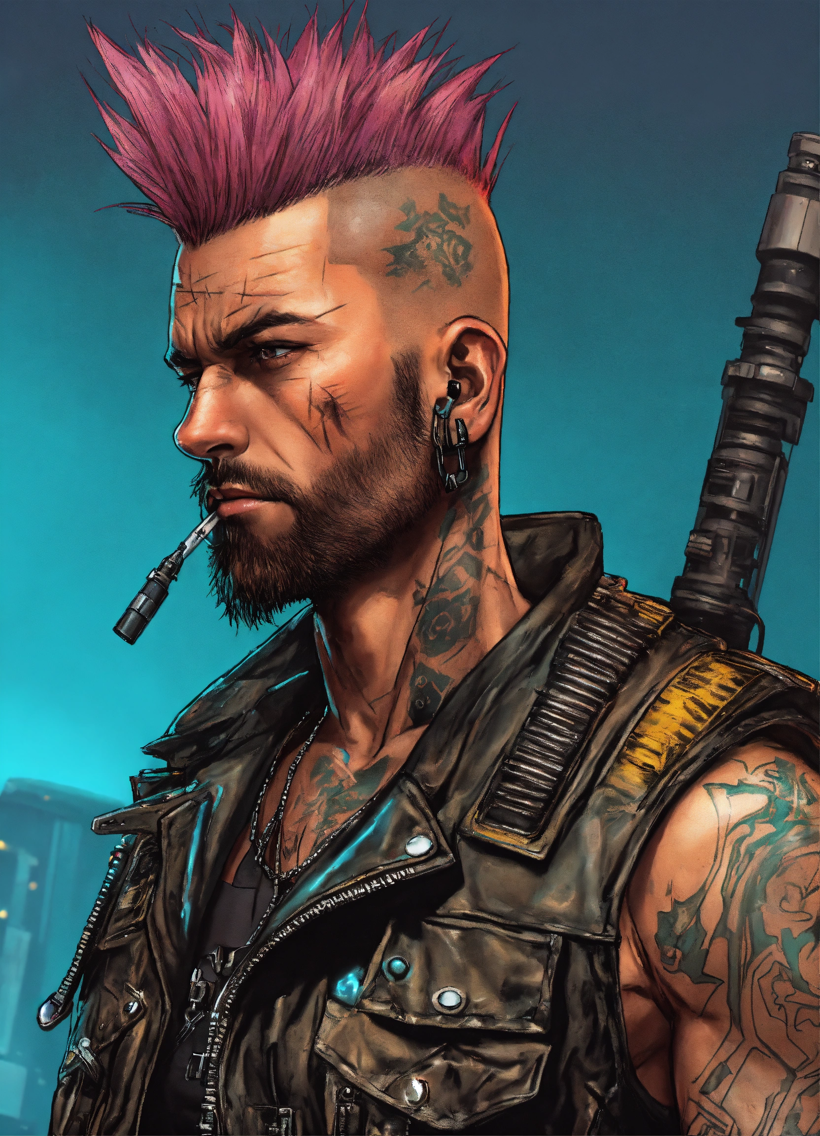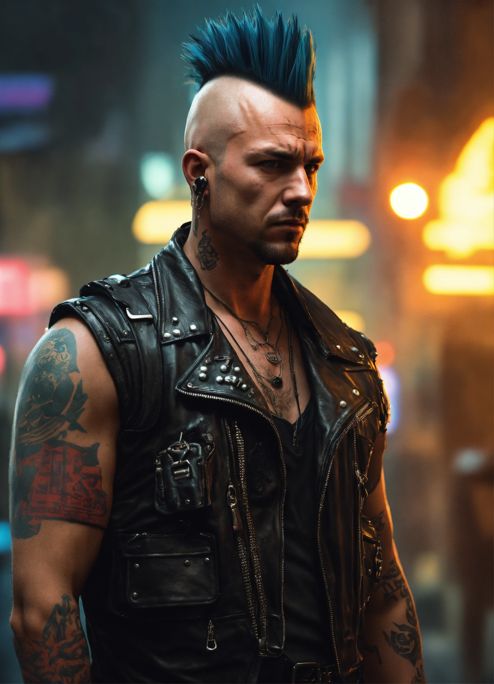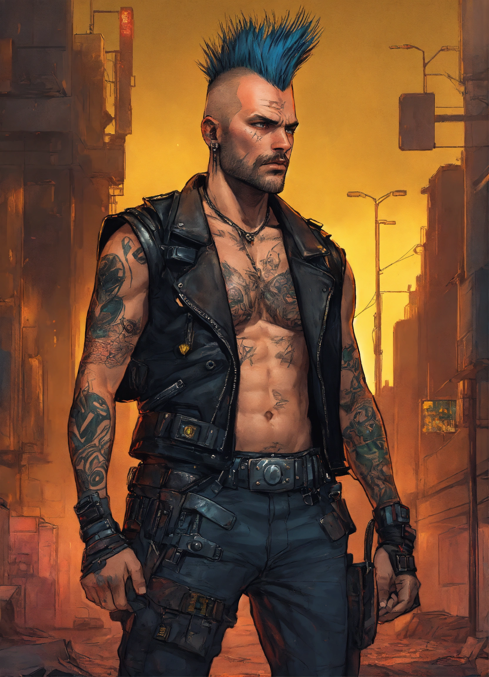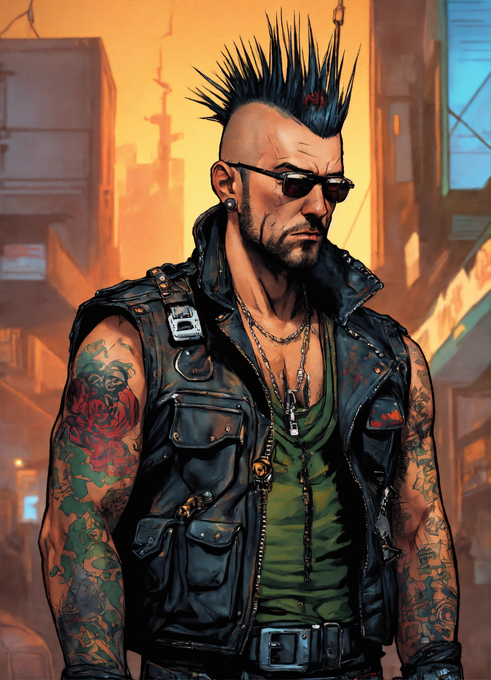 Cyberpunk 40 year old punk with mohawk, scars leather vest, mean and tough . gritty realistic comic book style.