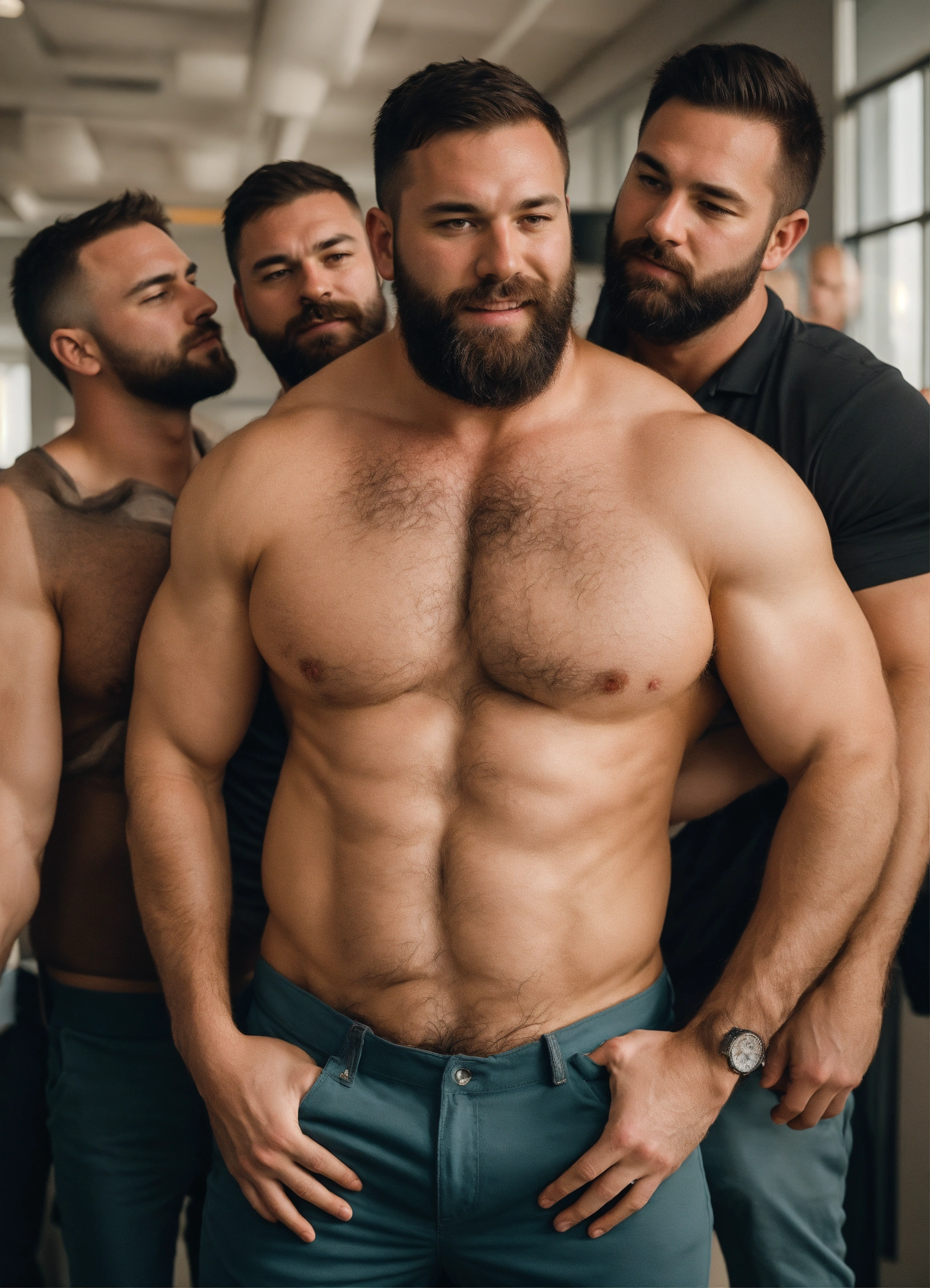 Group of hairy dadbod husky married men ogling each other's bodies in an office, dad energy, epic, hairy backs and hairy armpits, size difference, photography, high resolution, very detailed, smooth, clear, clean 4k