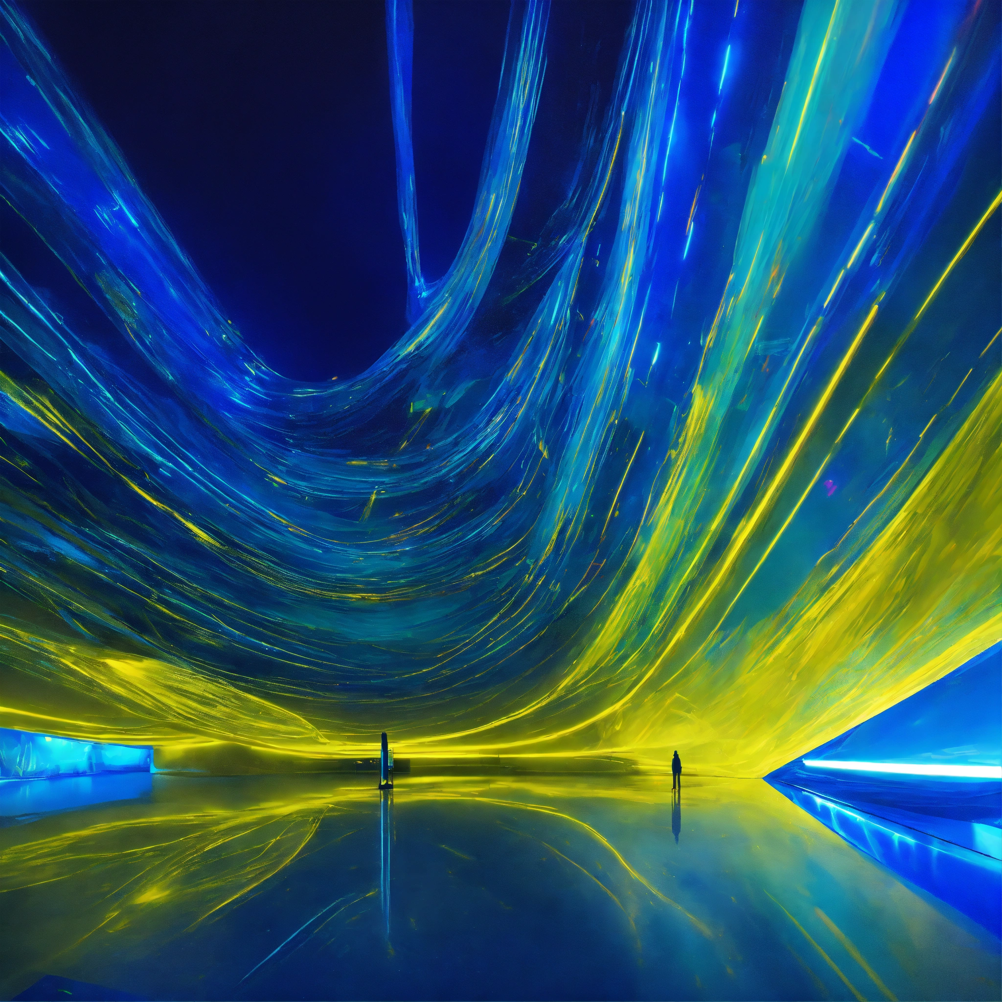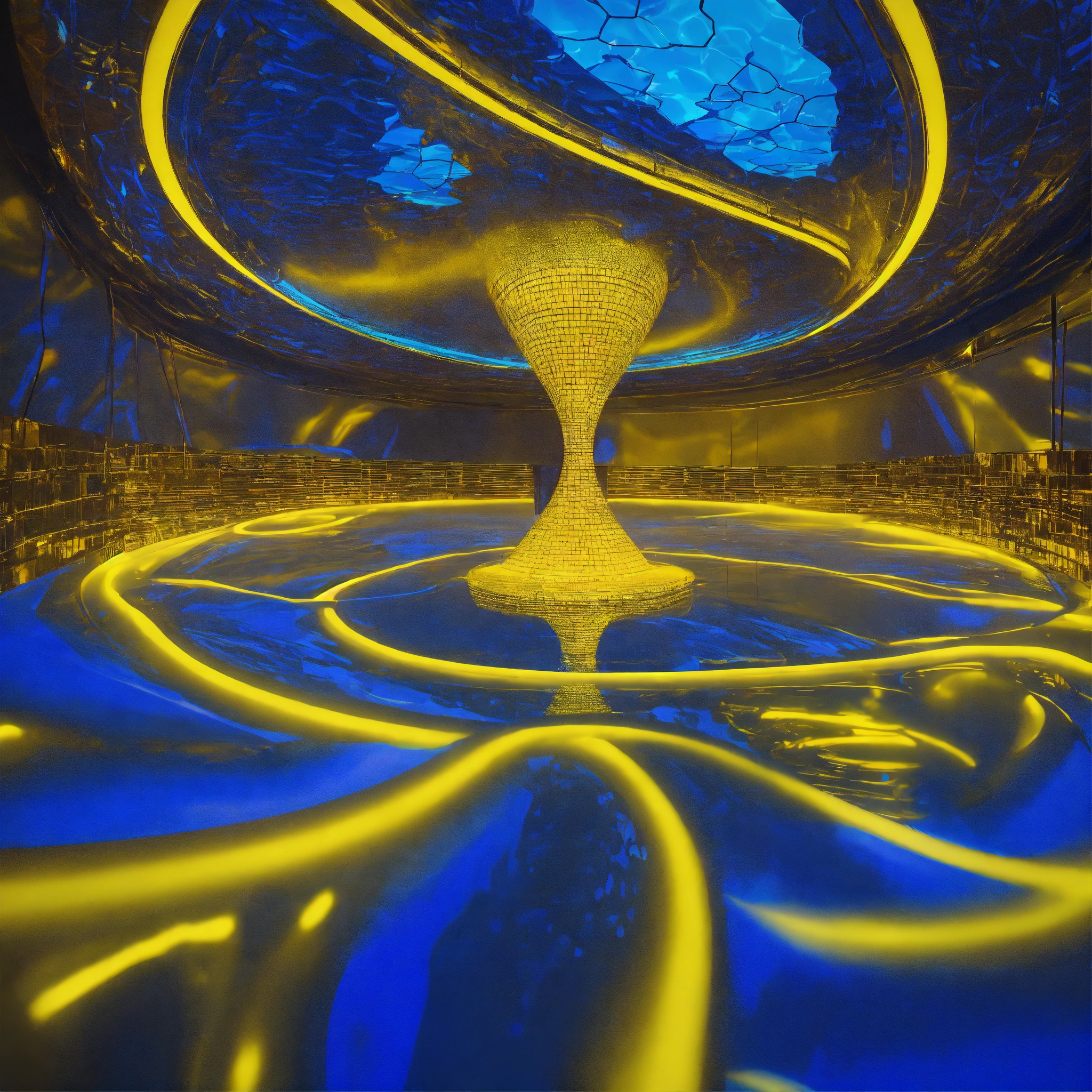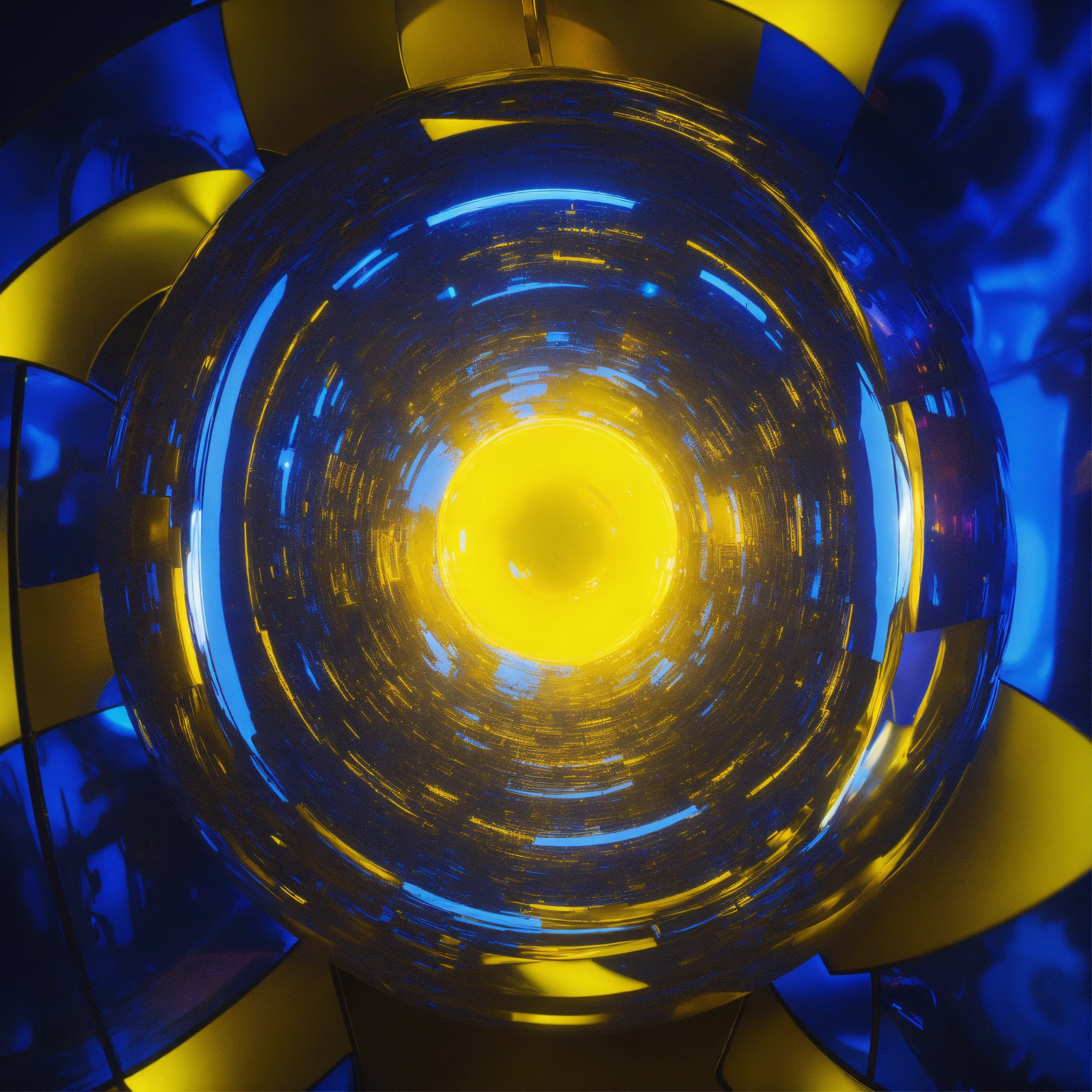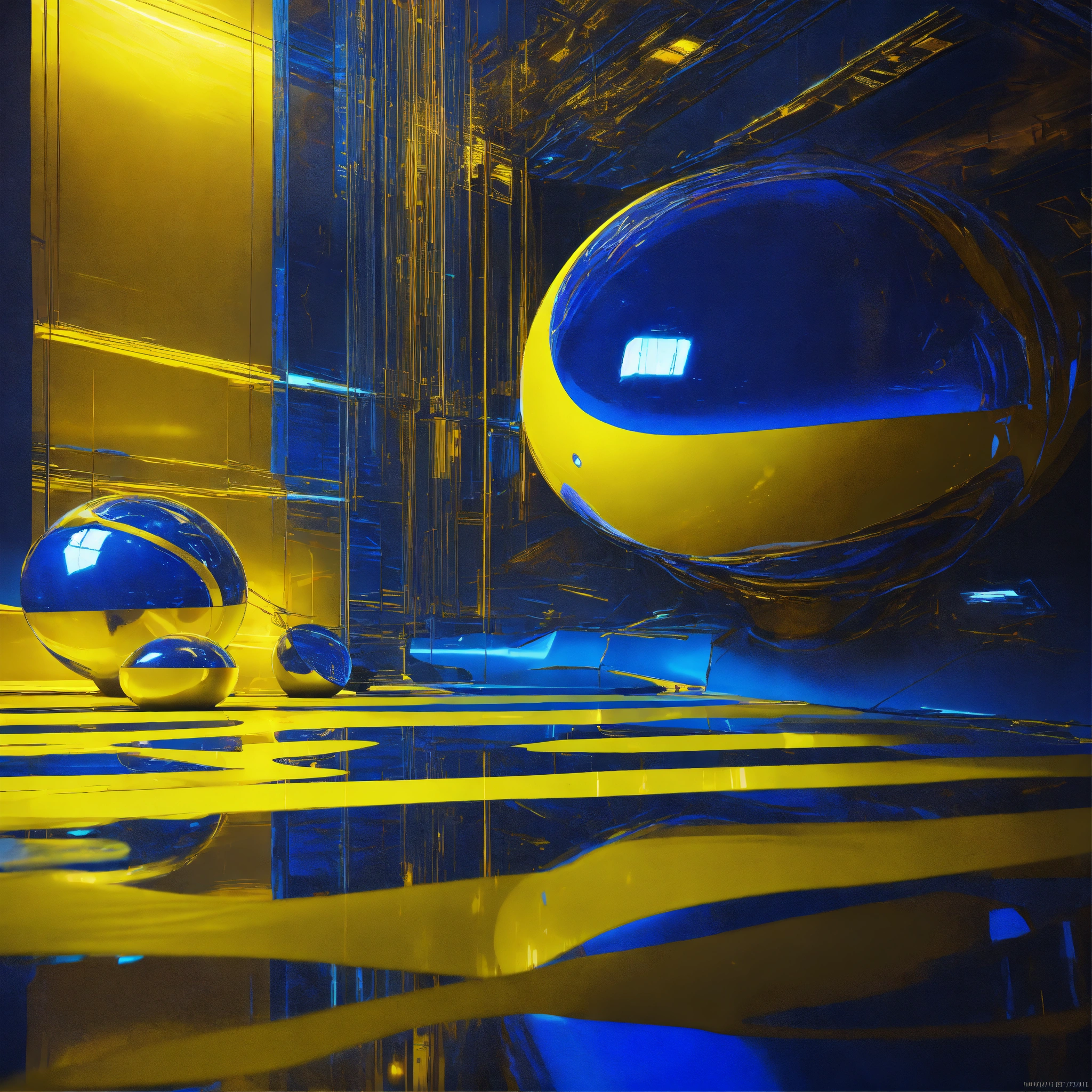 Metallic and glassy surface, vivid tones of blue and yellow, surreal futuristic art installation, ethereal glow and hazy neon light, an enormous mass that defies perception. one abstract representative object floating --ar 169 --s 1000 --c 15