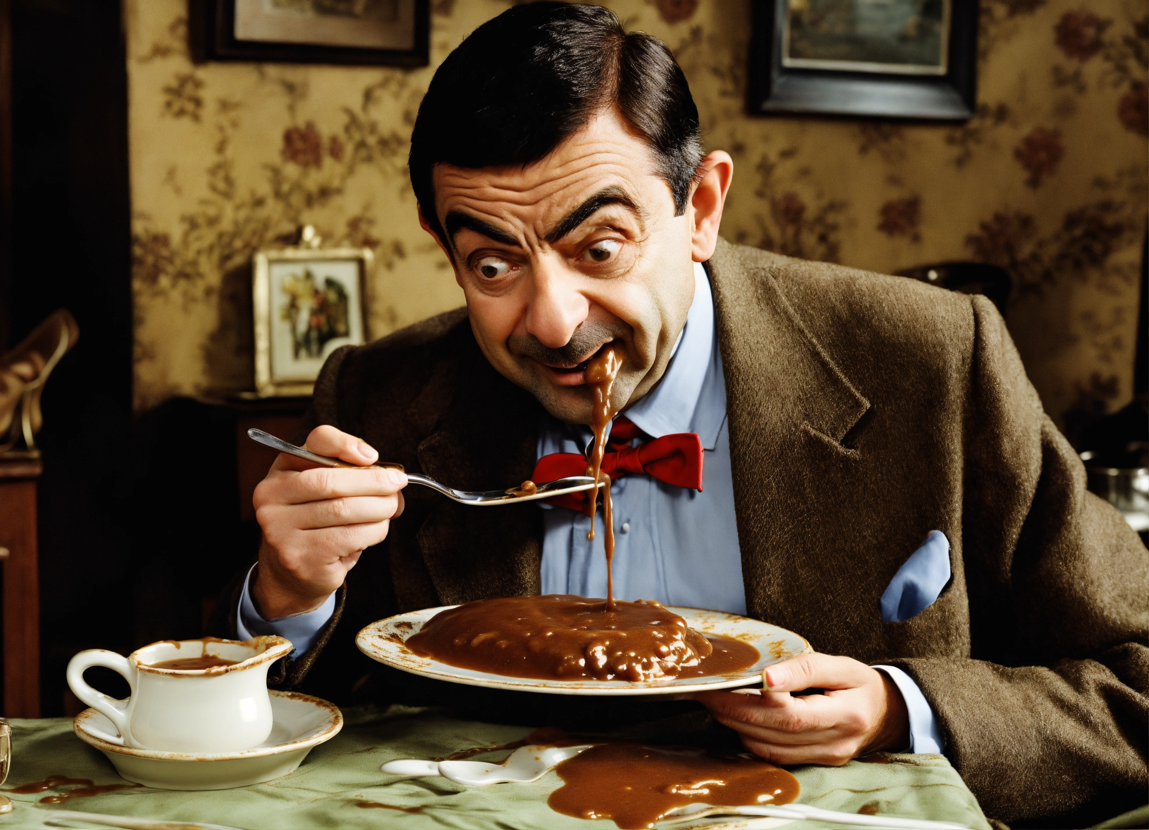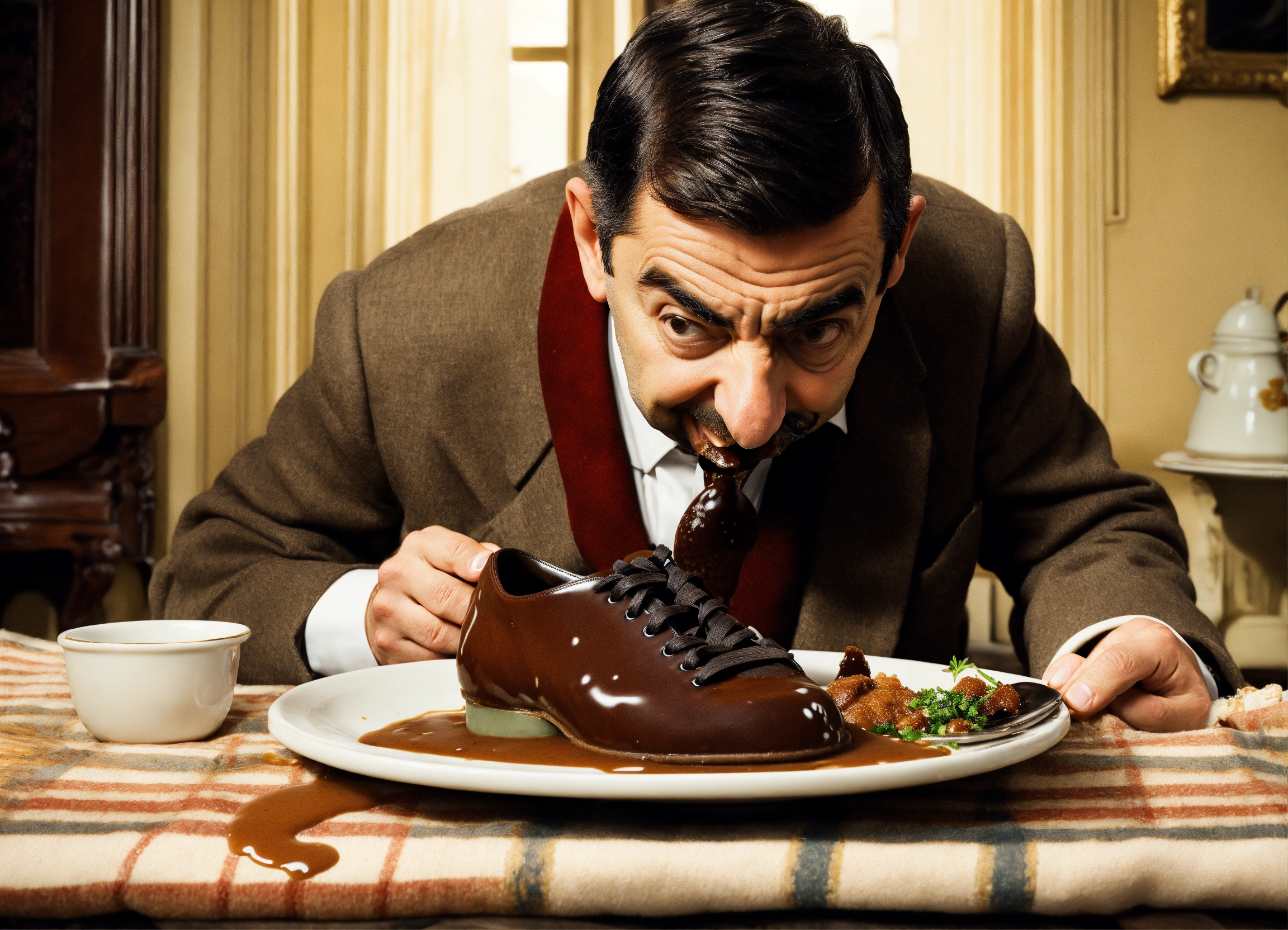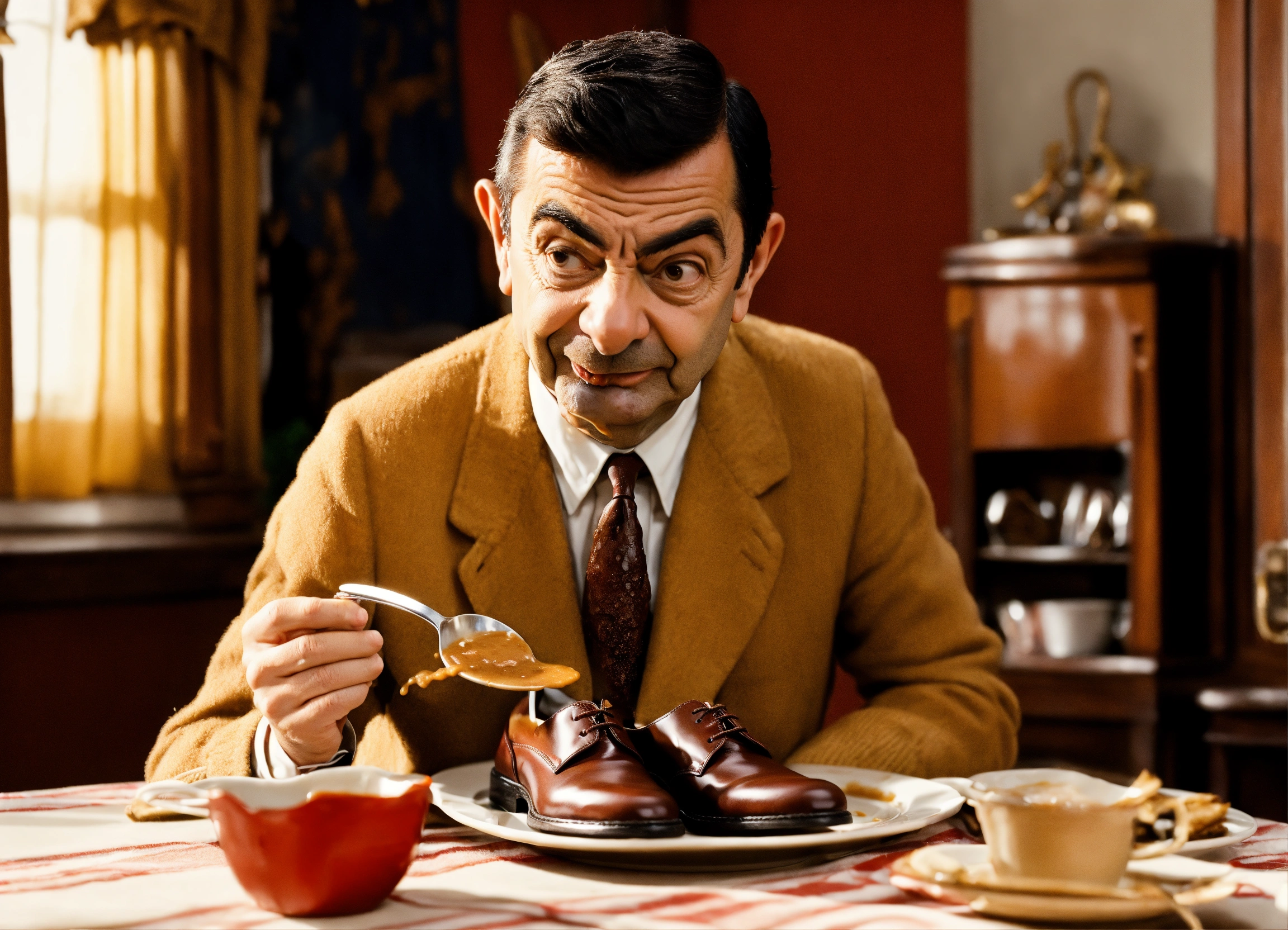 Mr bean eating a shoes with gravy on a plate