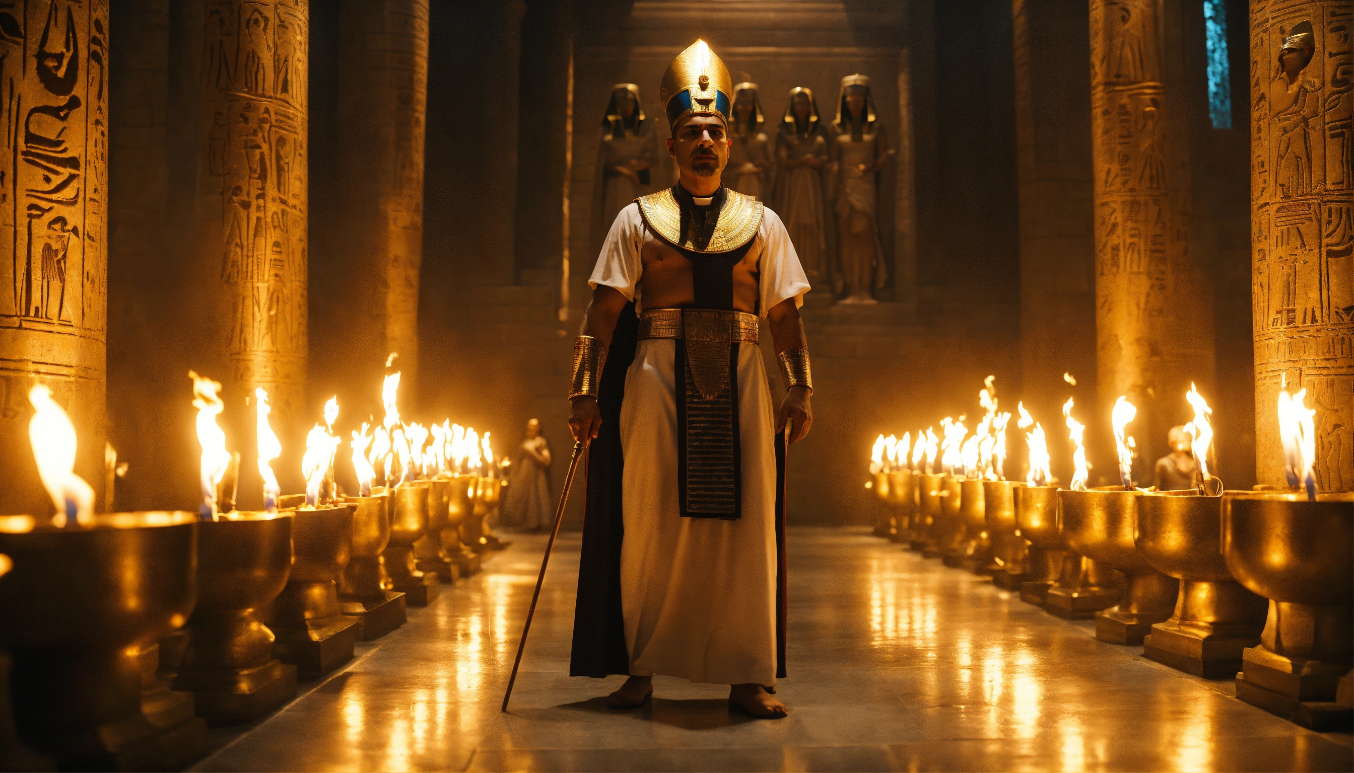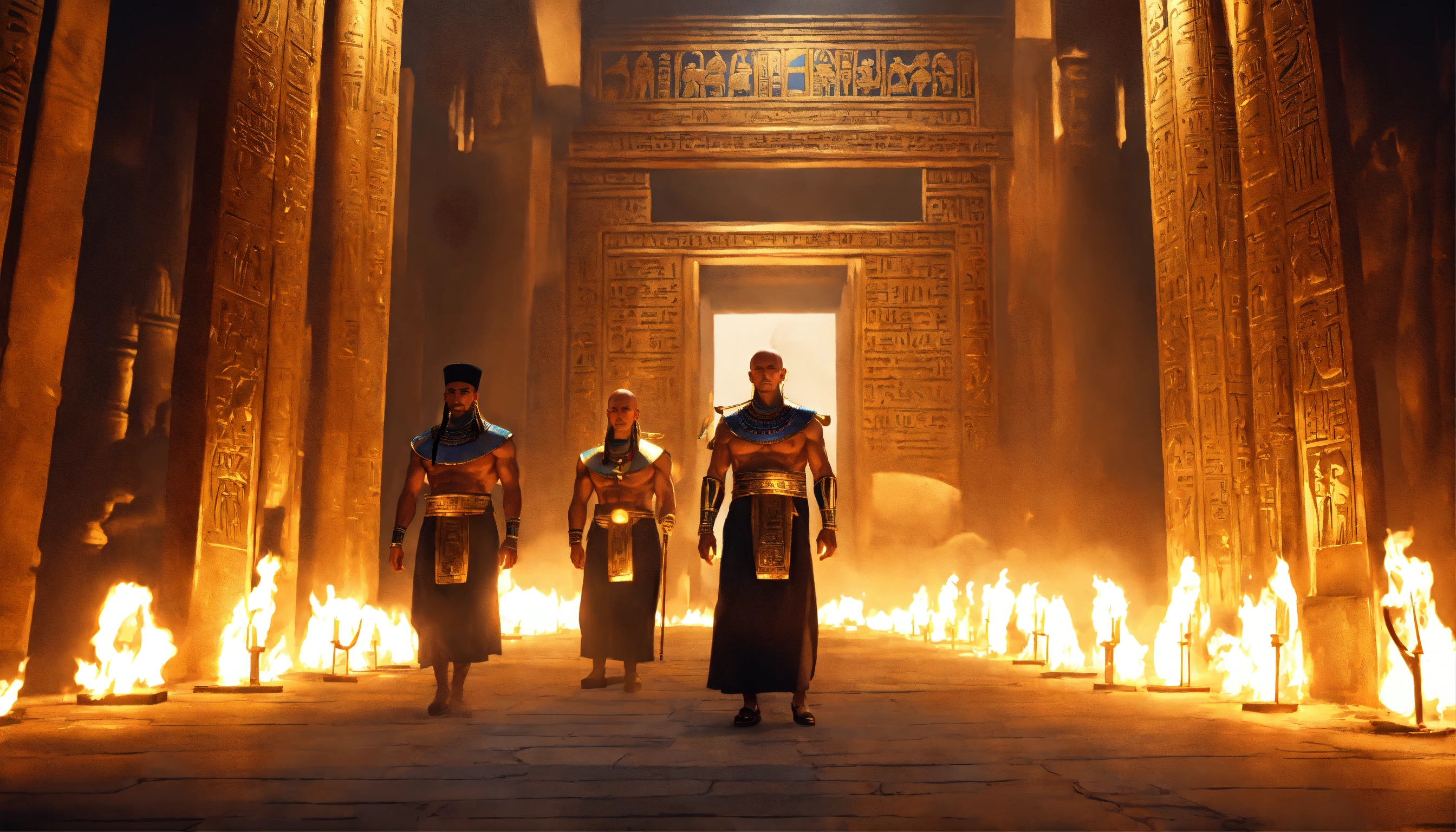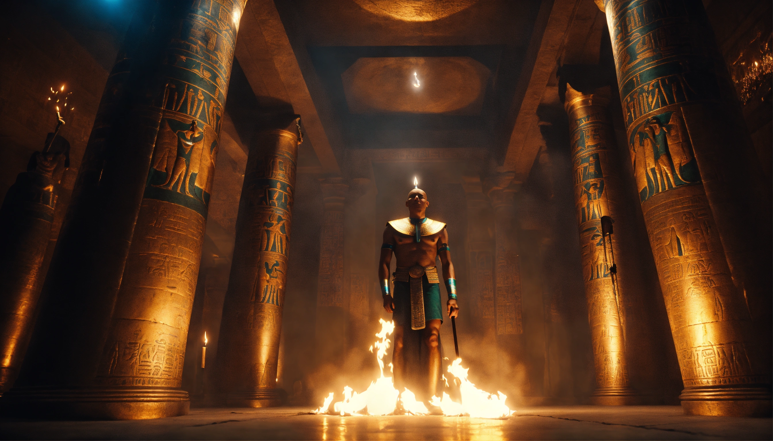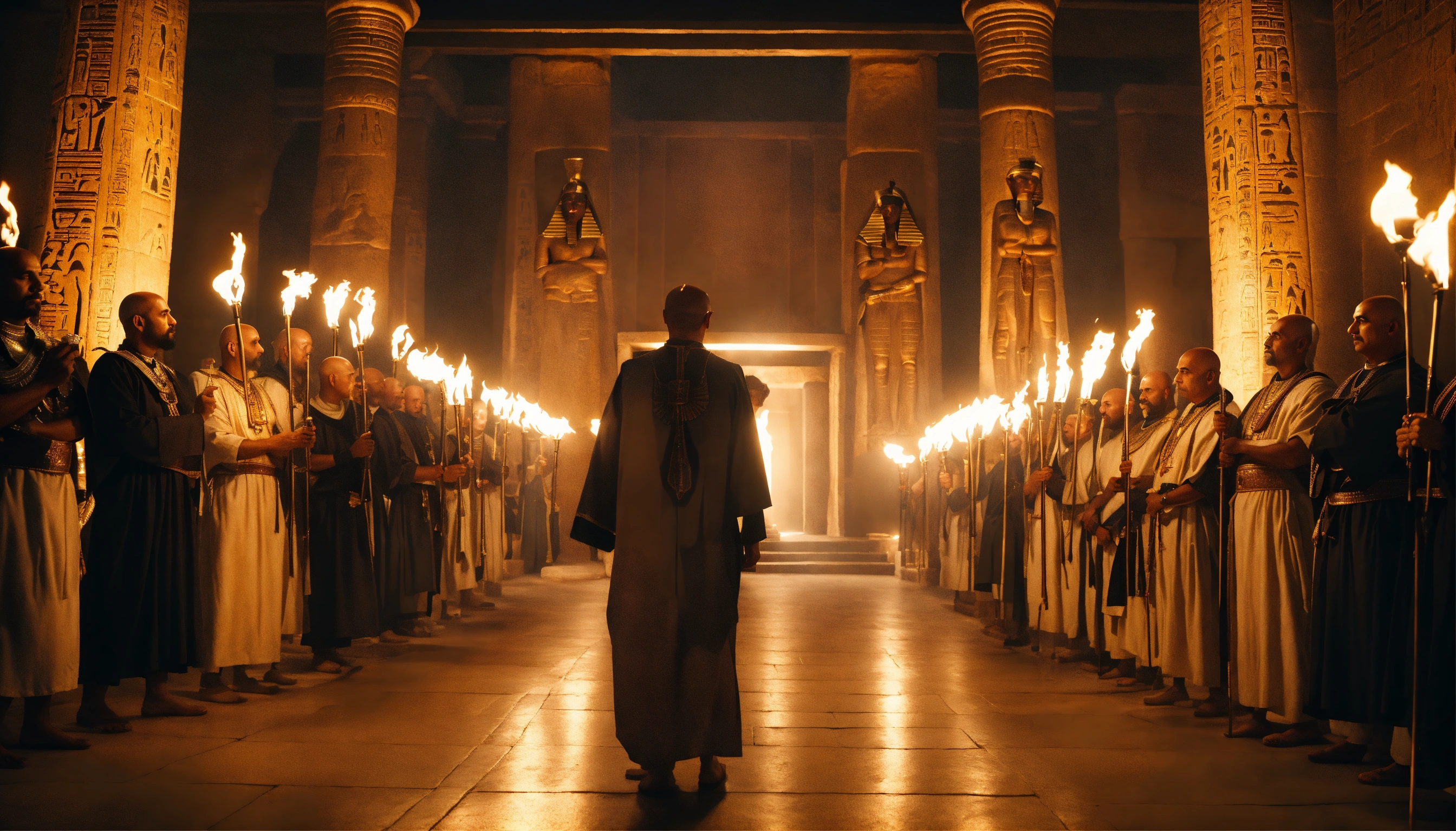 Egyptian bald priests are with the god amon-ra in the temple, they worship with torches in the dark hall, cinematic, 8k