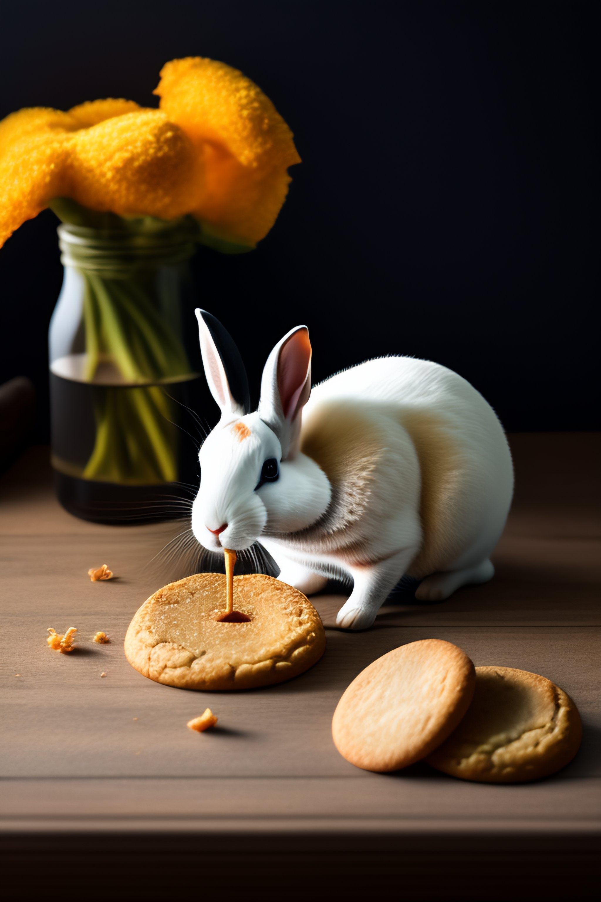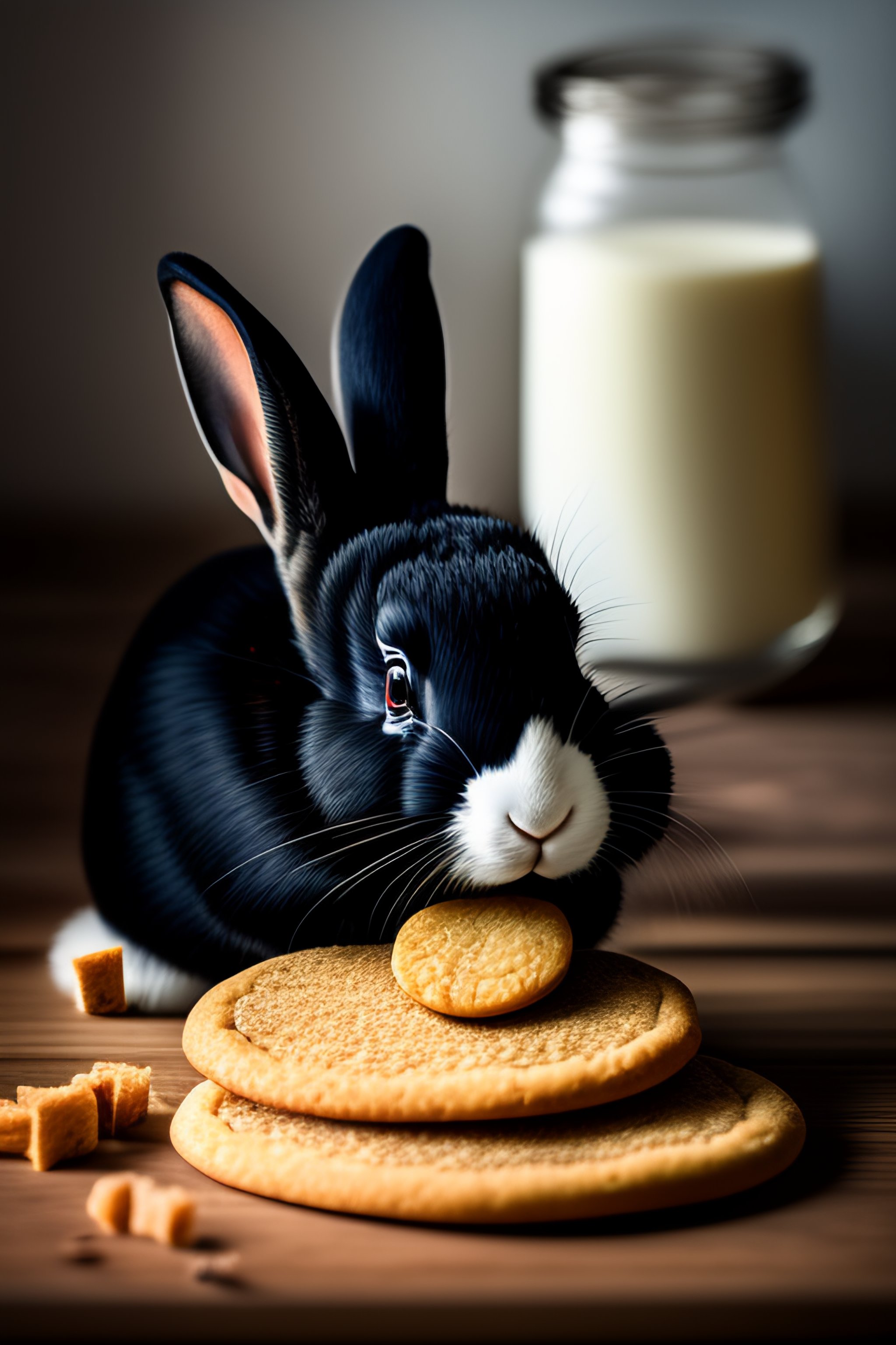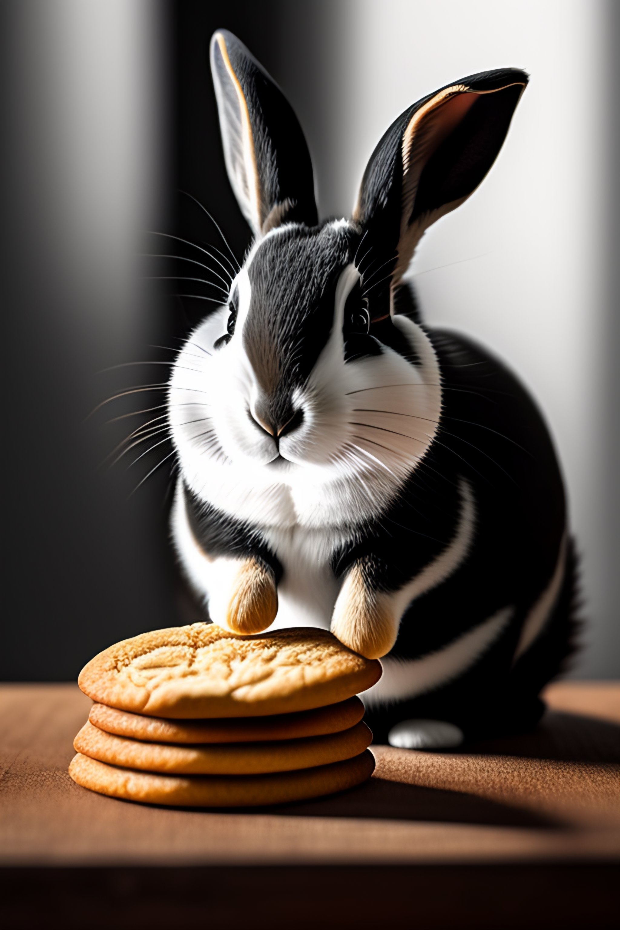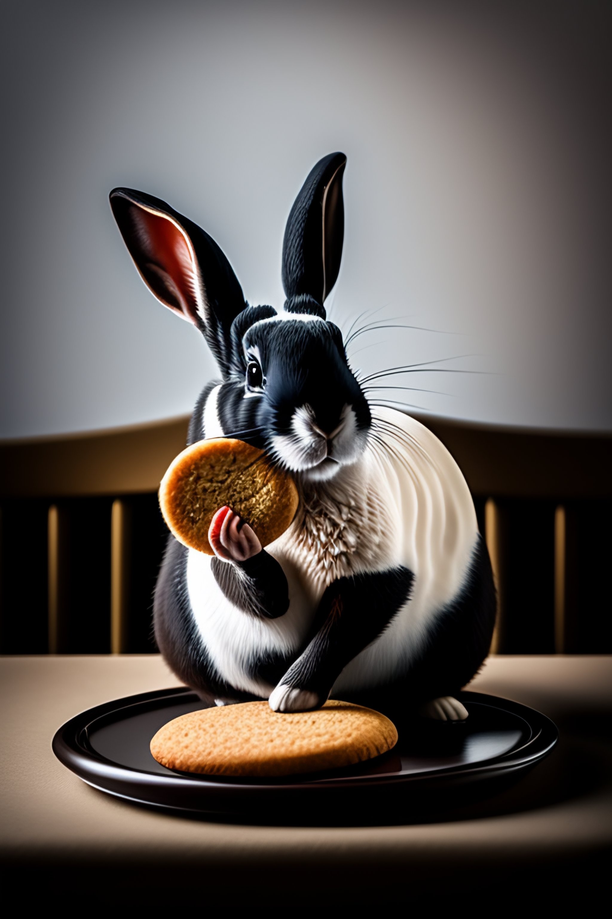 Black and white rabbit eating a ginger cookie on a table