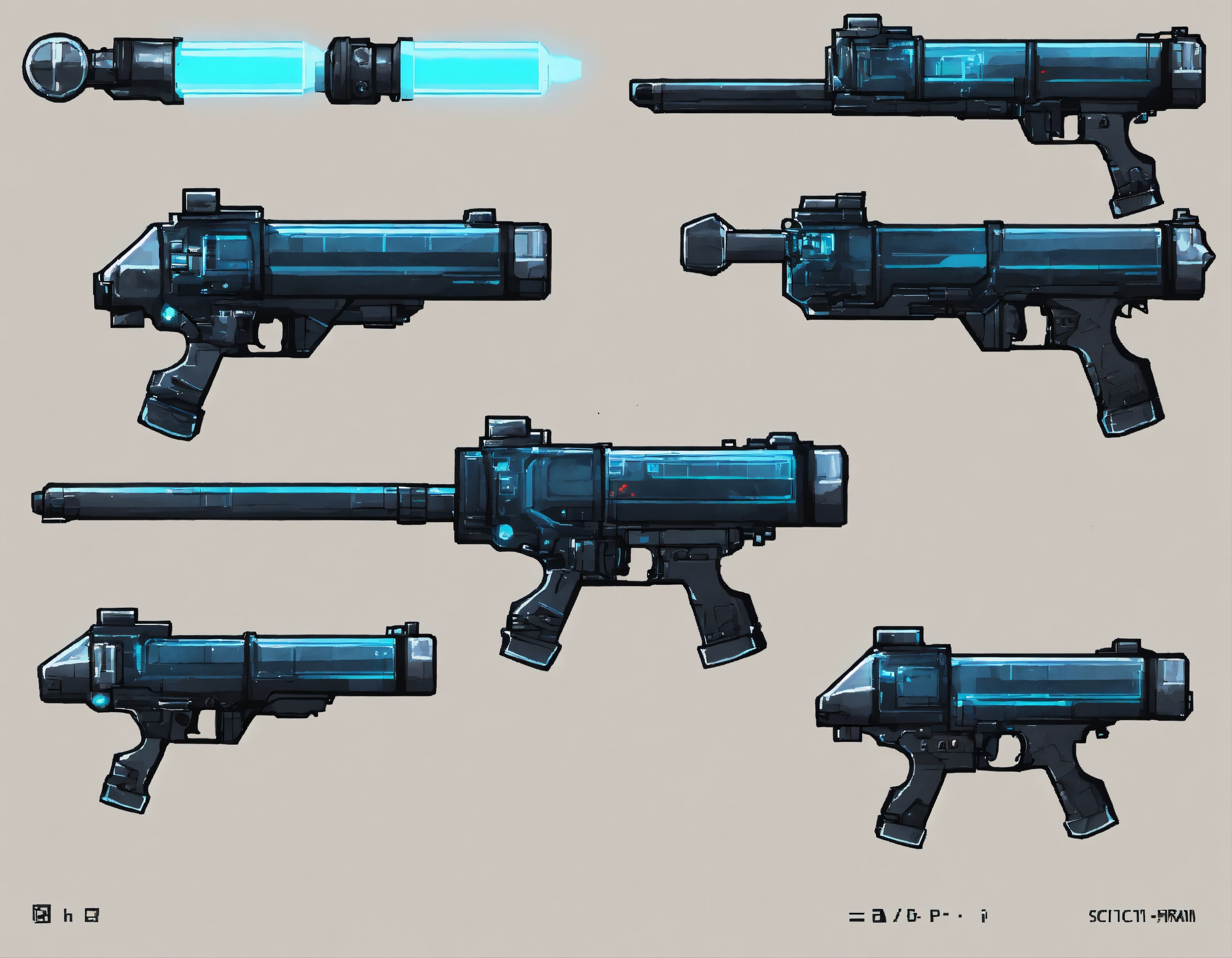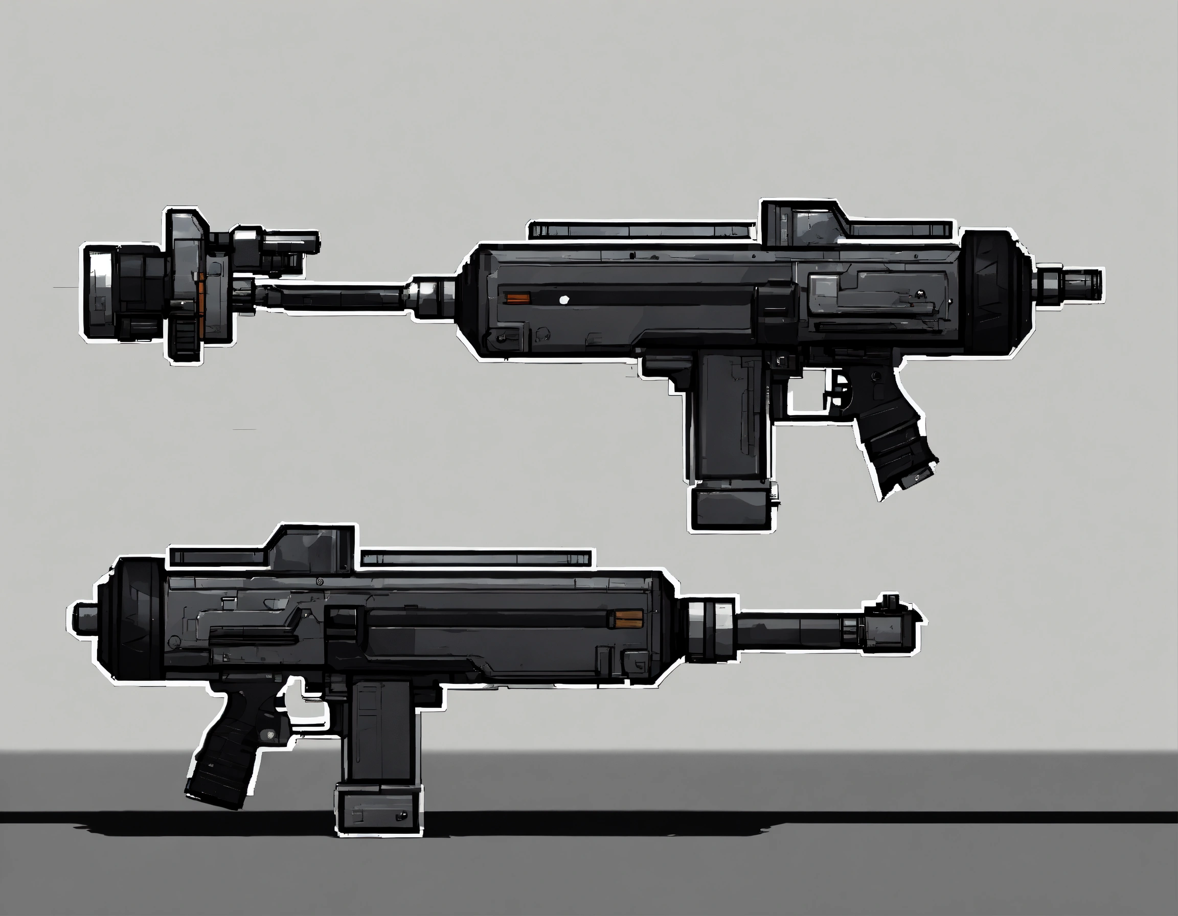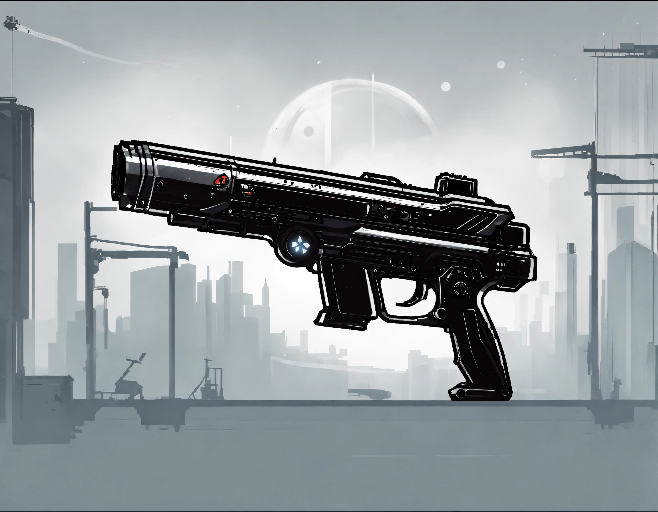 A 2d gun for a sci-fi platformer game, black and white, transparent background, stickman theme. right side view