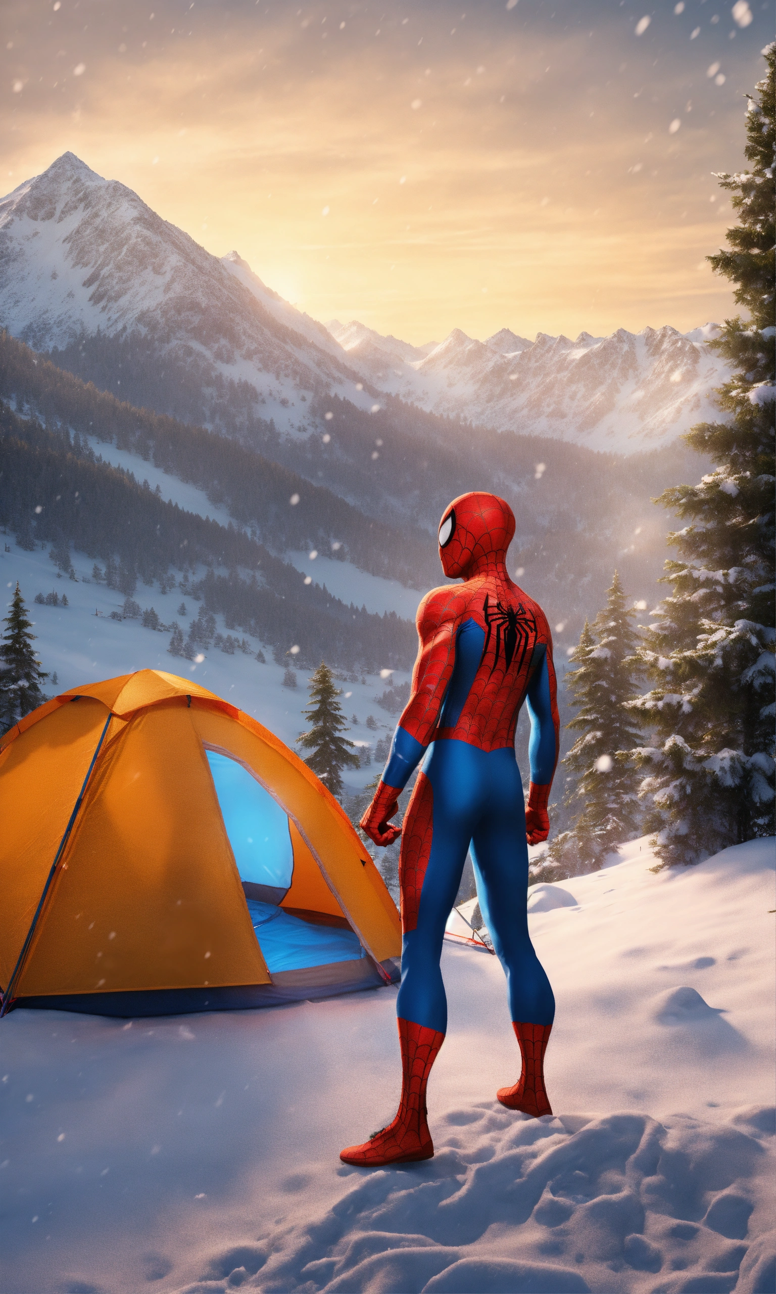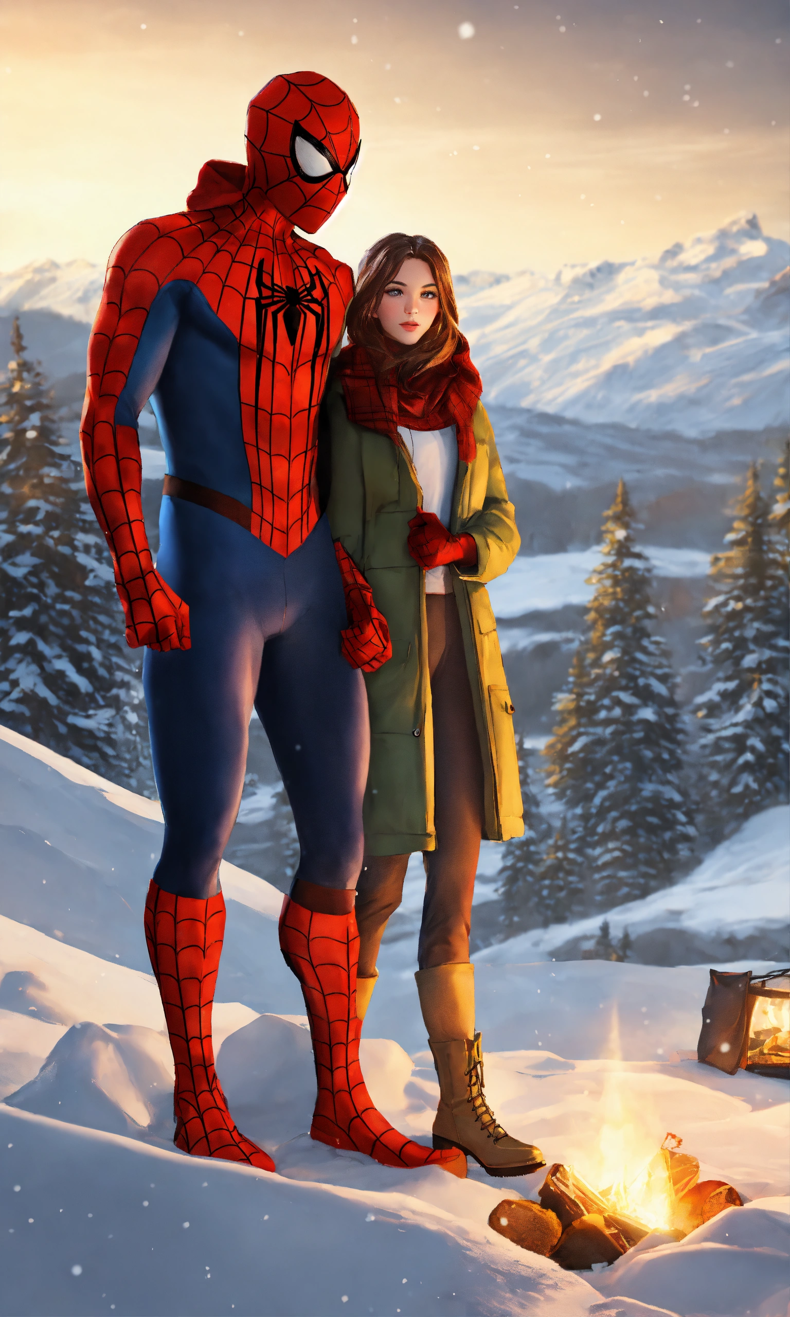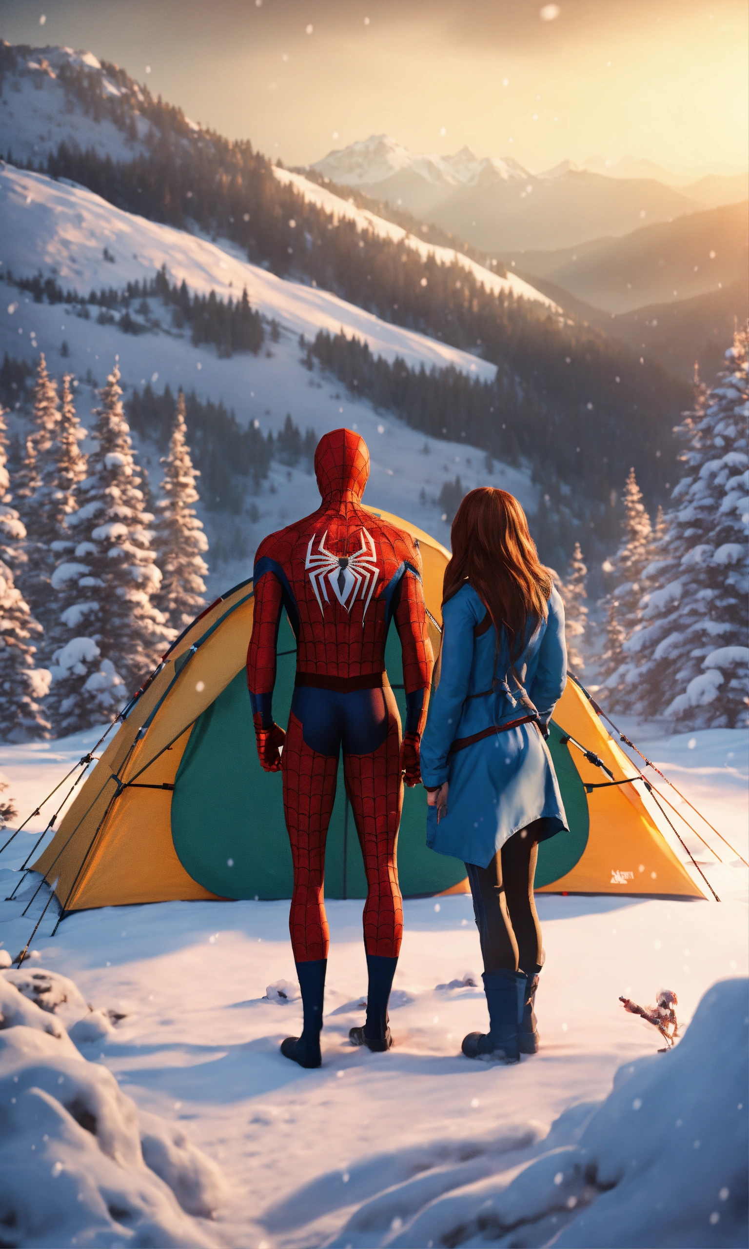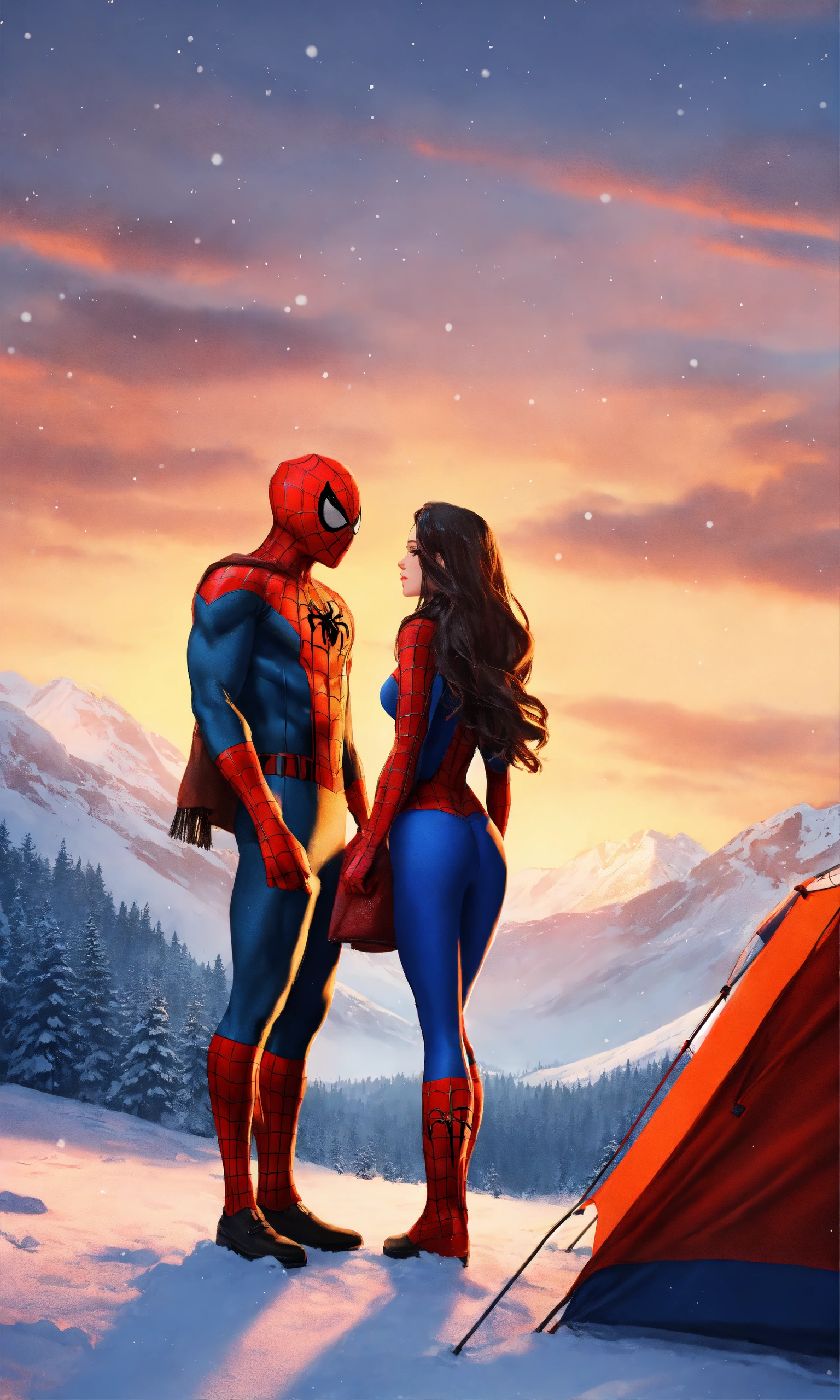 Spiderman with his beautiful wife with long hair camping on hills, 2d render, full-body view, snow background
