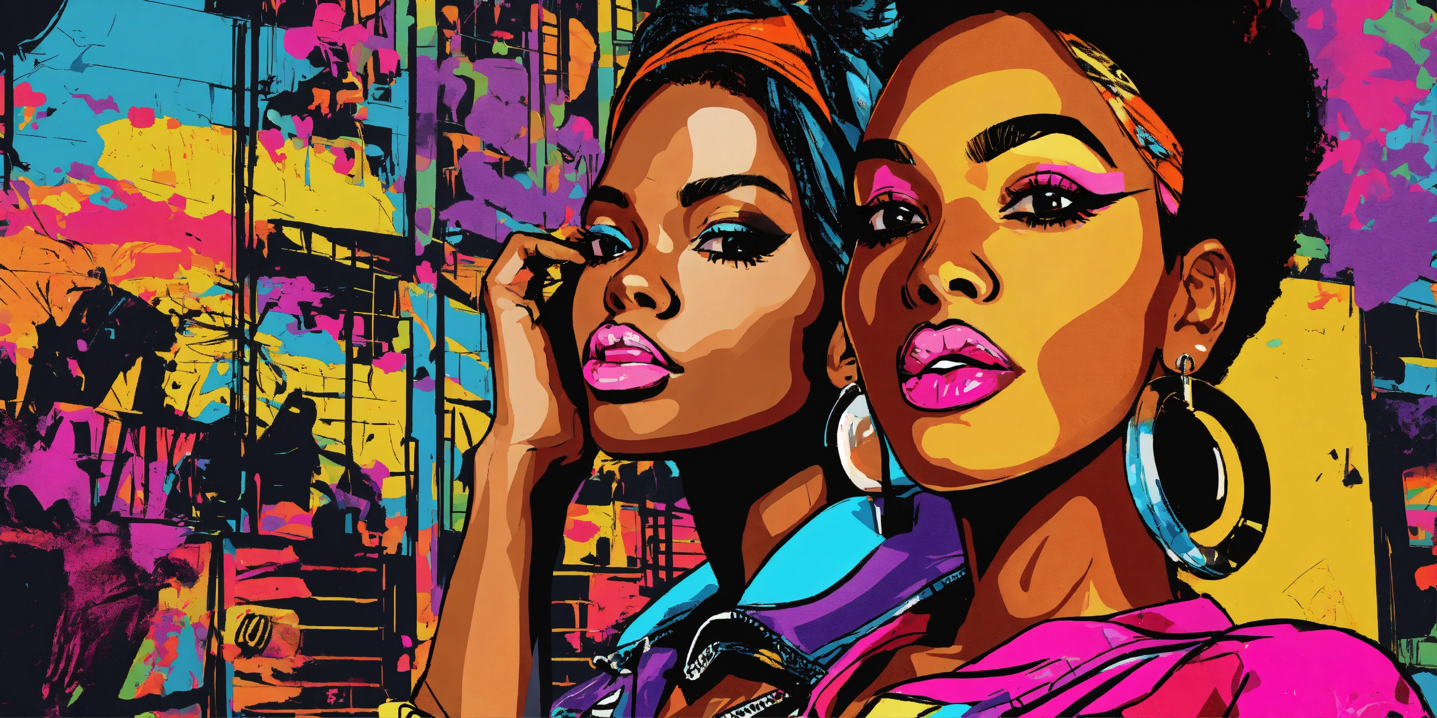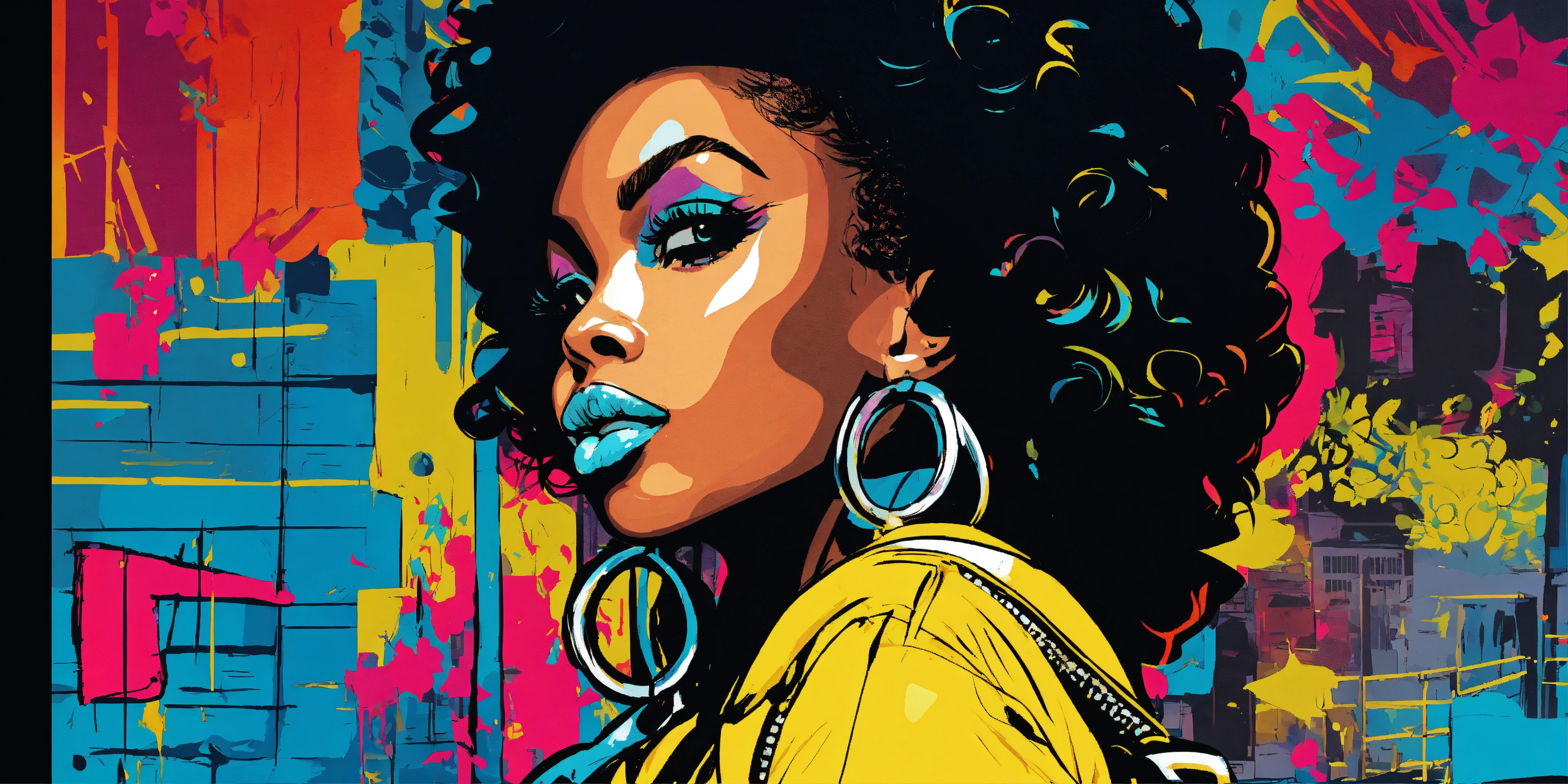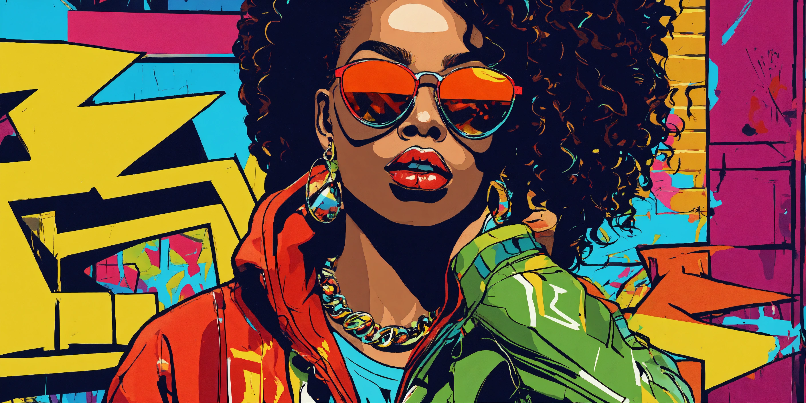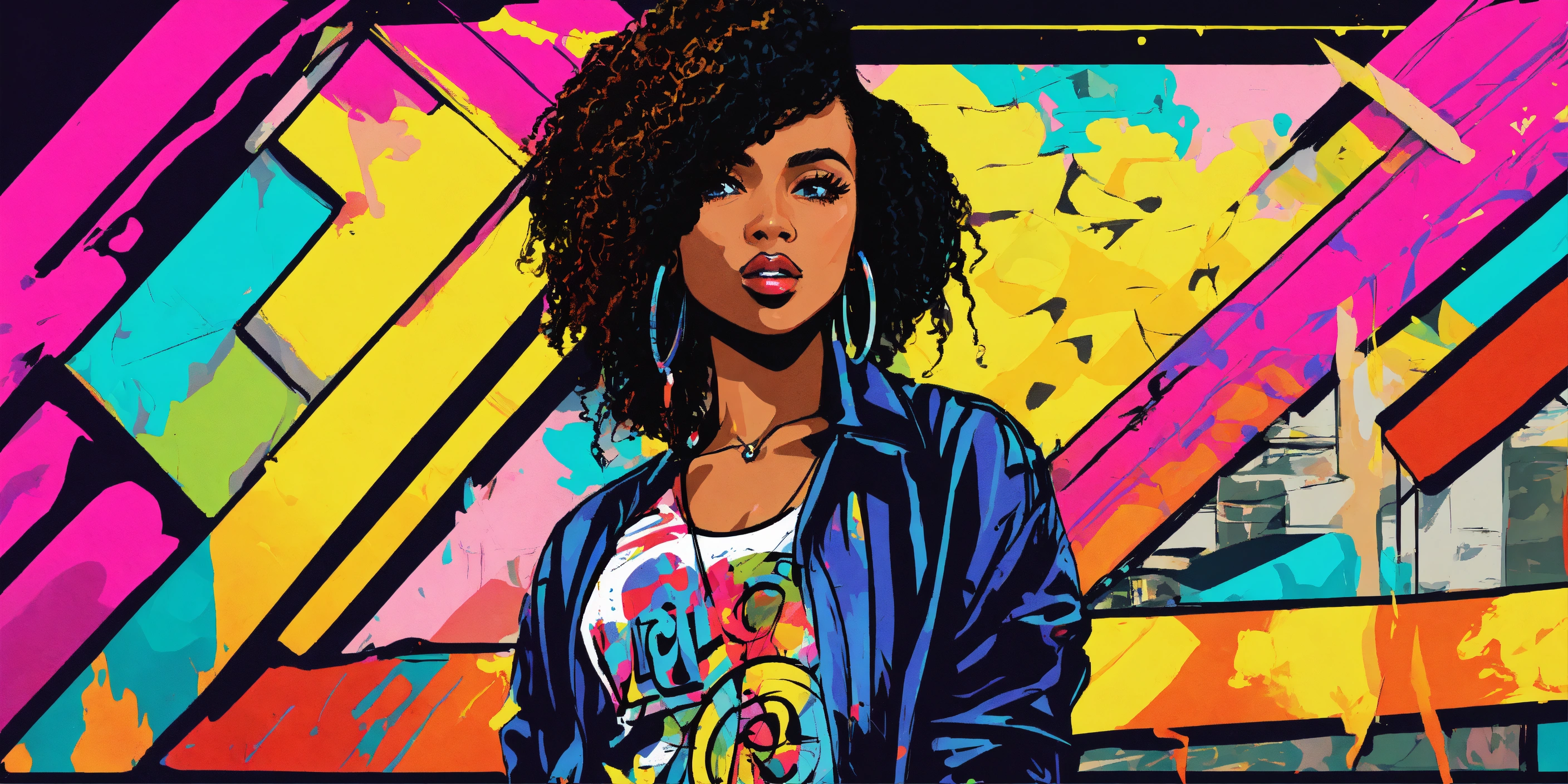 Pop art street style black woman in urban pop art clothing, striking a pose against a graffitifilled pop art street — t-shirt design graphic, vector, contour, black background.