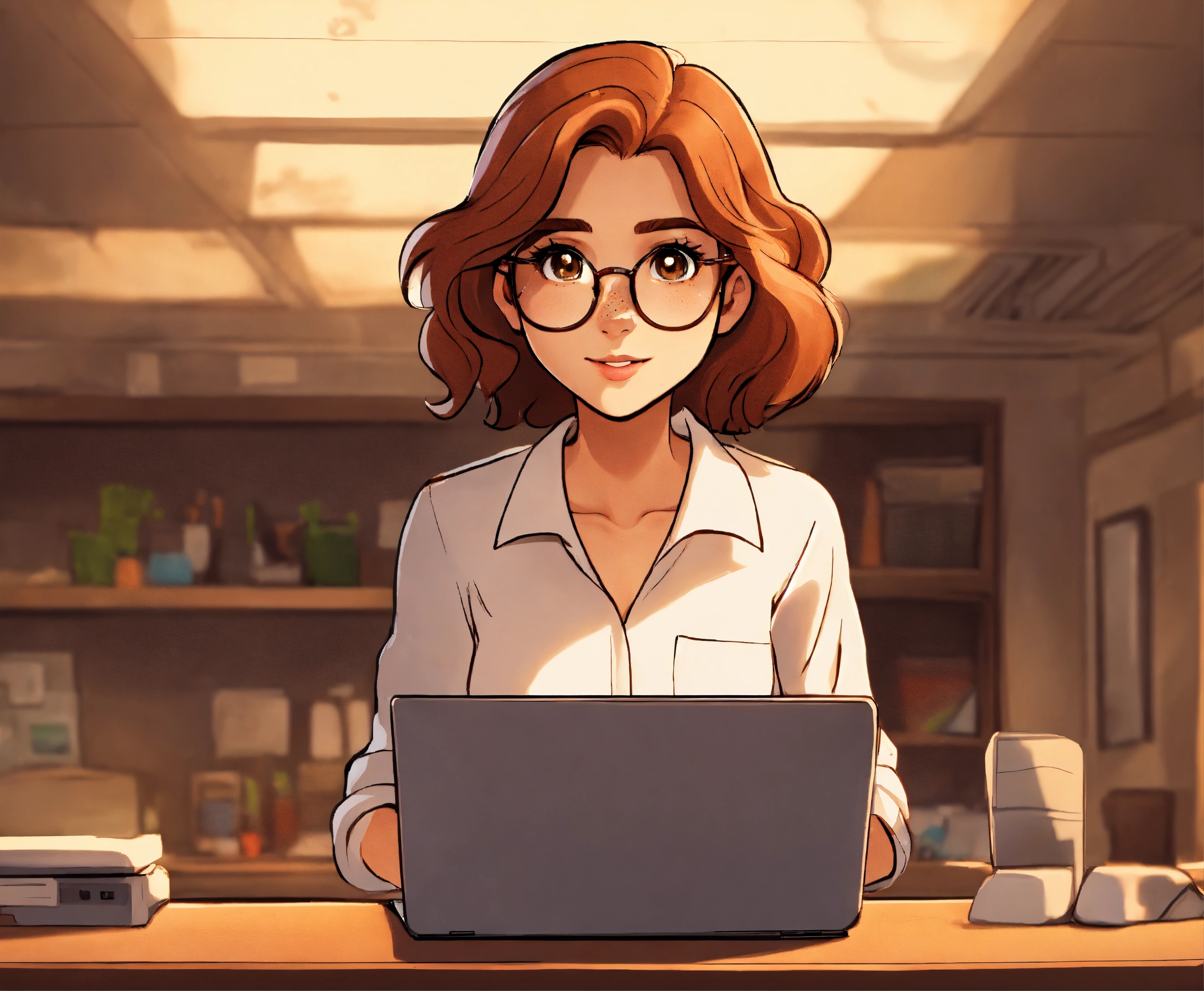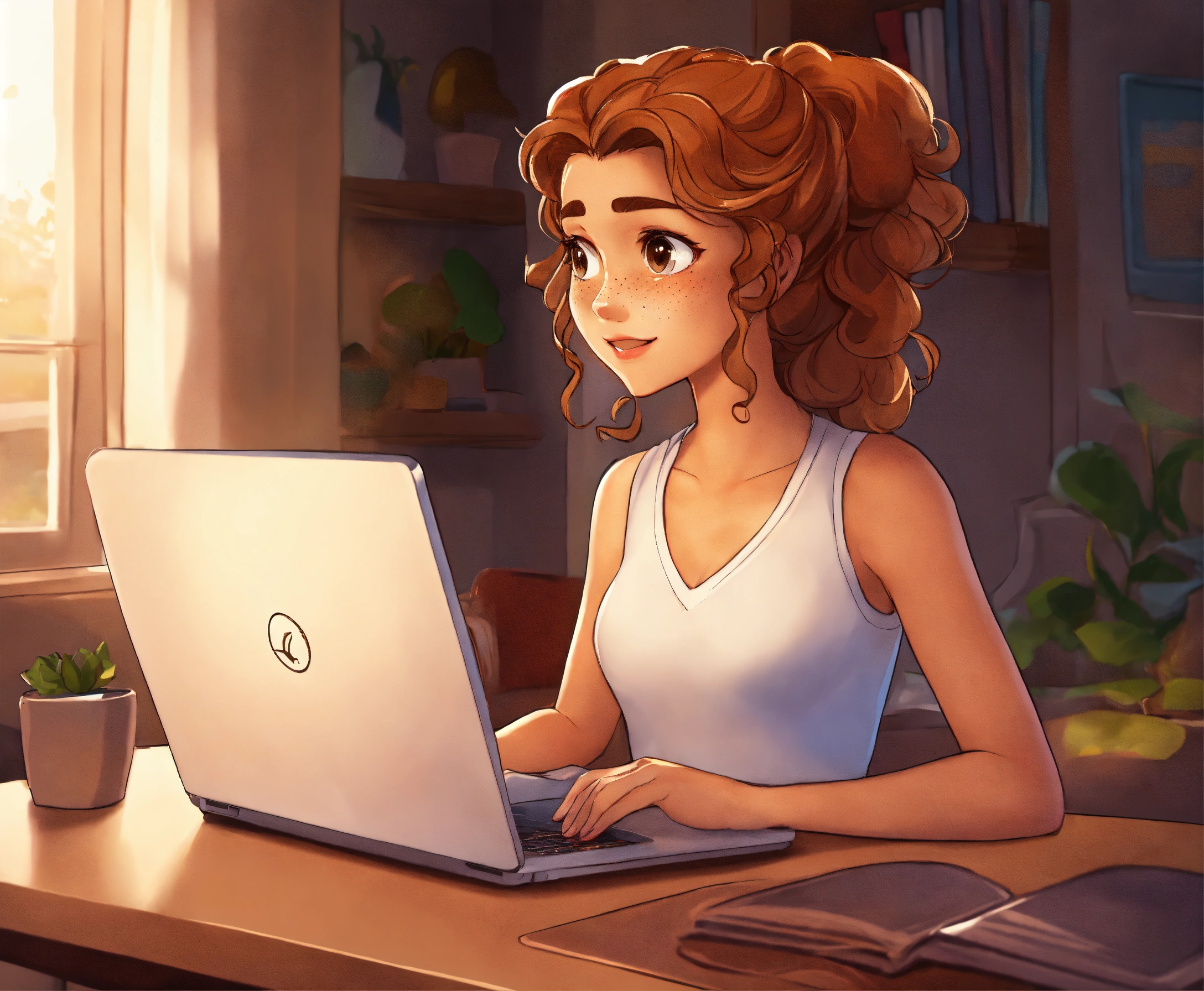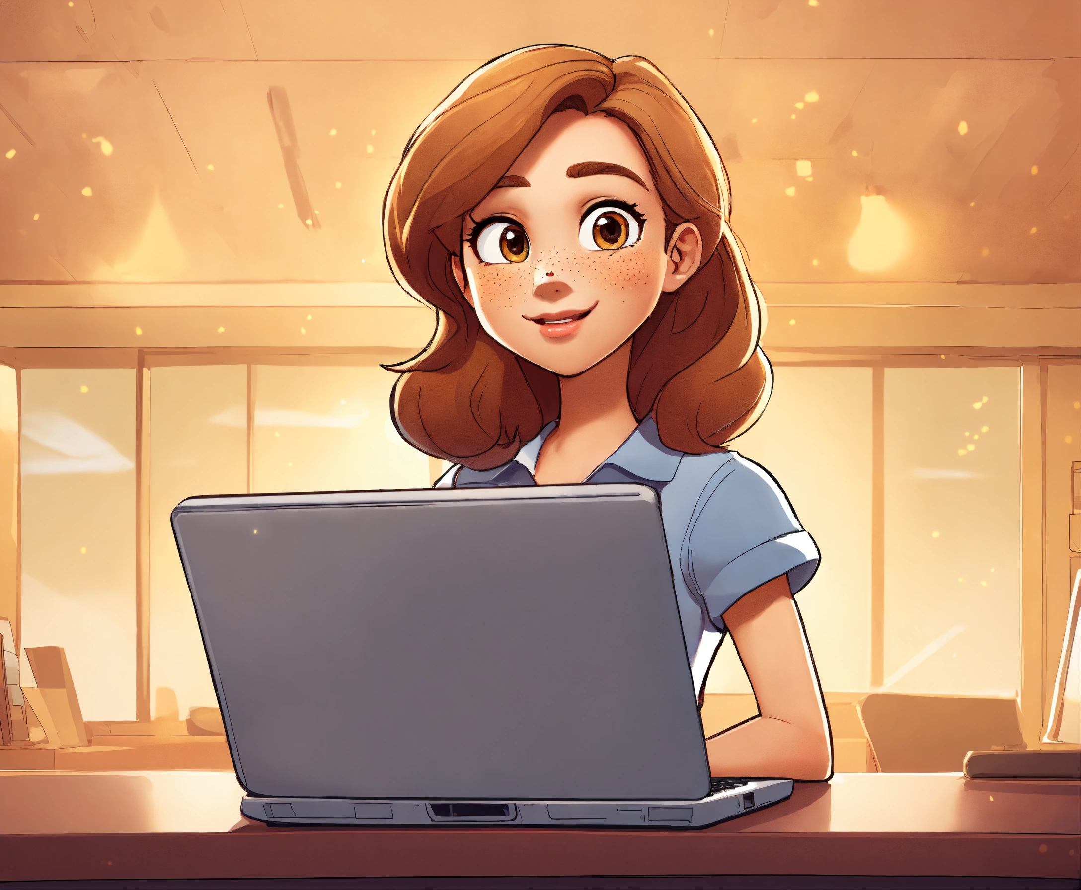 A white intelligent, attractive female cartoon character. she is standing up while holding and looking at an open laptop. she has light brown hair, brown eyes, and freckles