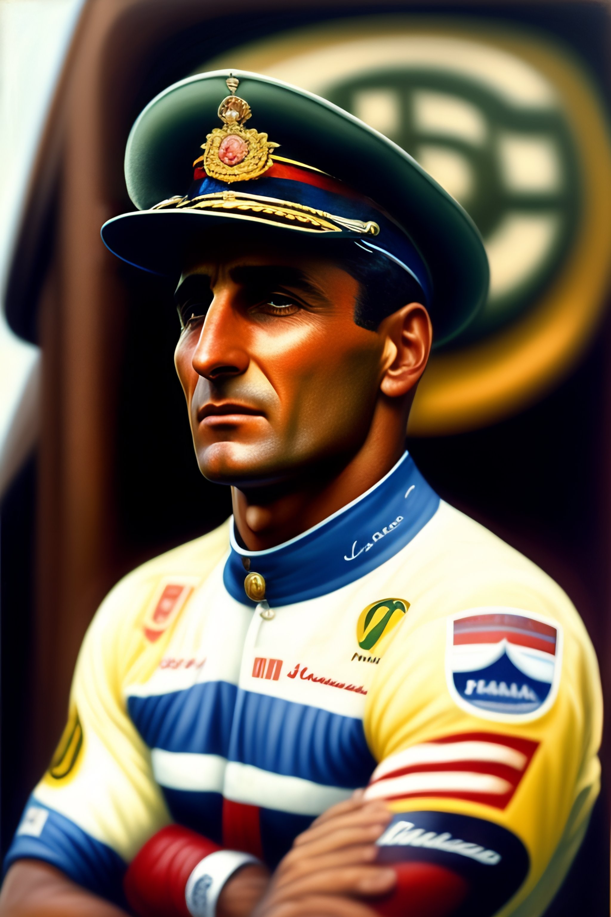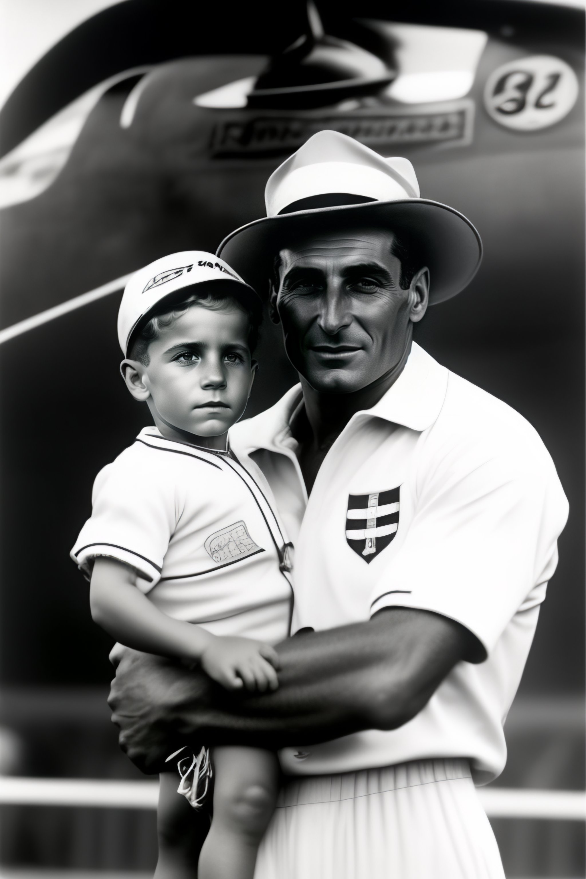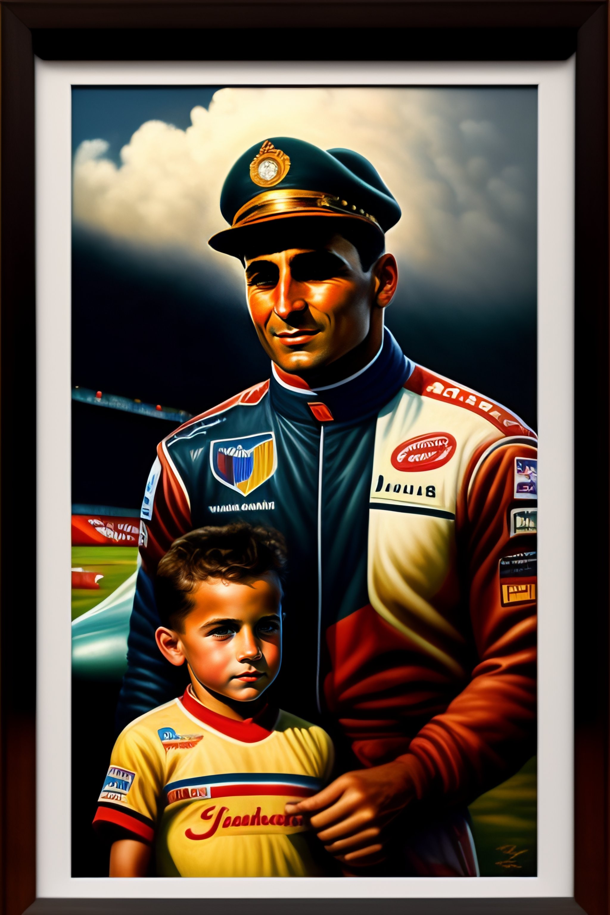 Juan manuel fangio con su hijo cacho fangio campeón de fórmula uno como si fuera pintado por el artista picasso con su aguila