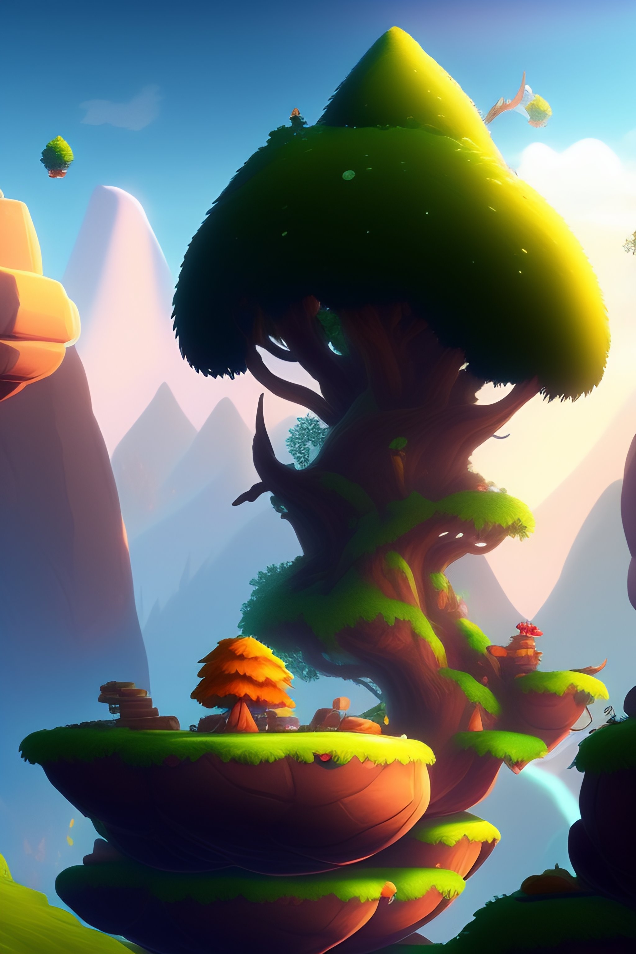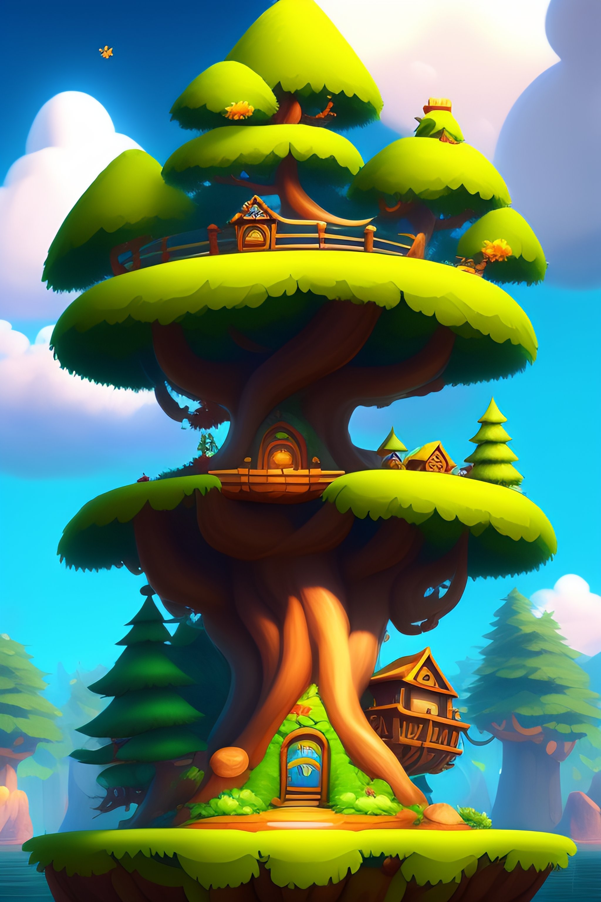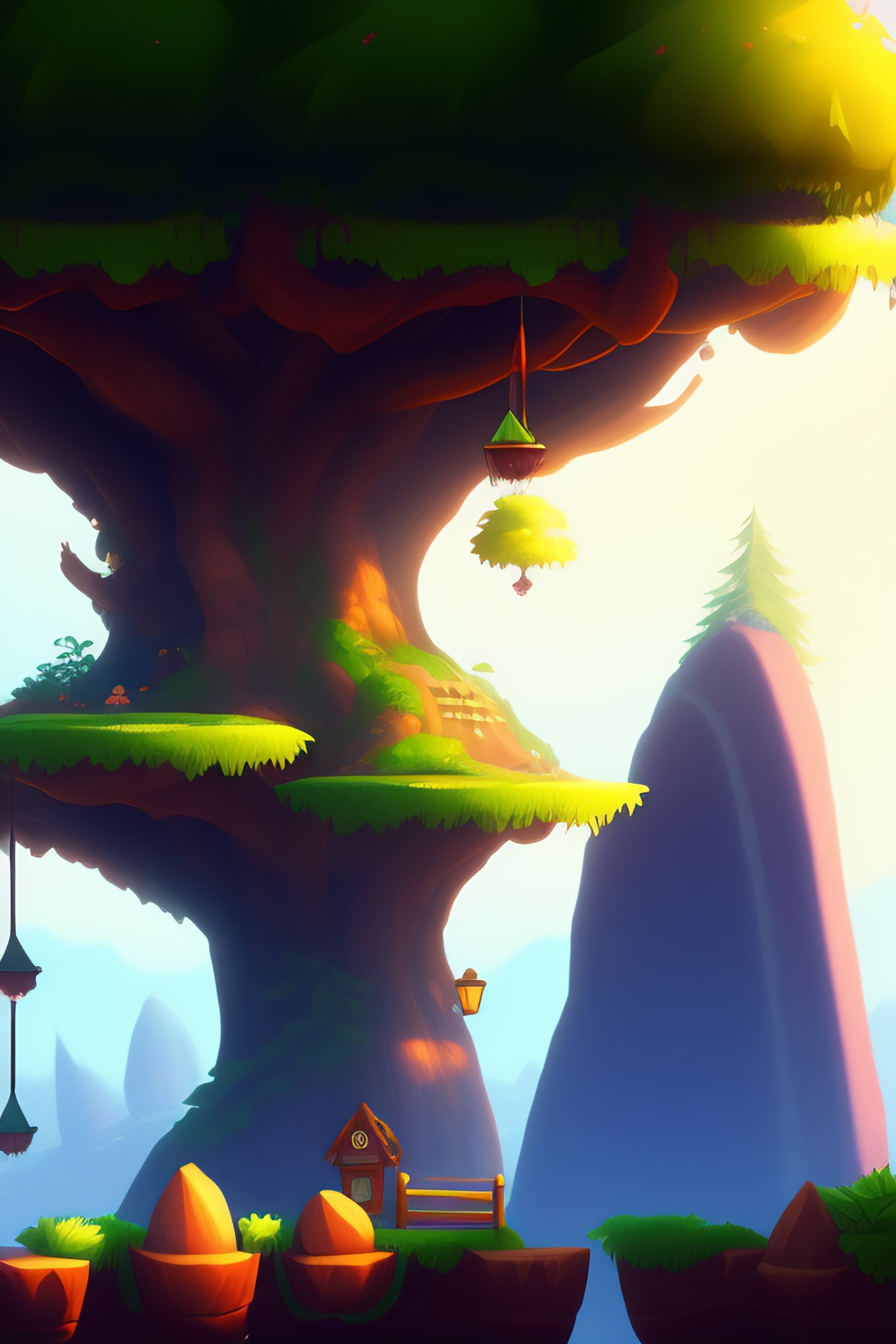 2d asset of a large tree for a platform game, in the rayman game, in digital painting where brushstrokes are apparent, artstation