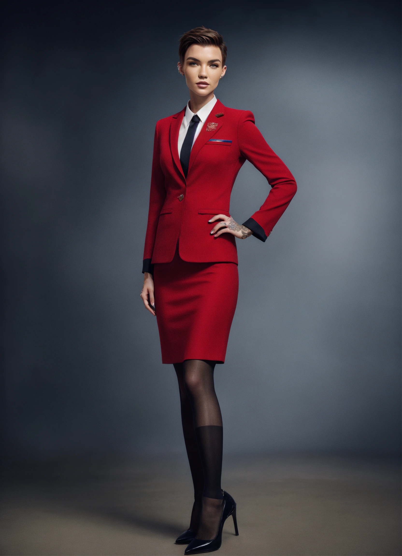 Studio portrait of ruby rose as a flight attendant in skirt suit uniform, tights and high heels, full body, 100% real, natural light, studio background, fashion magazine, hyper realistic, ultra-detailed, no filter, depth of field, fashion, iso 400, photorealistic, 8k