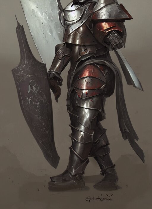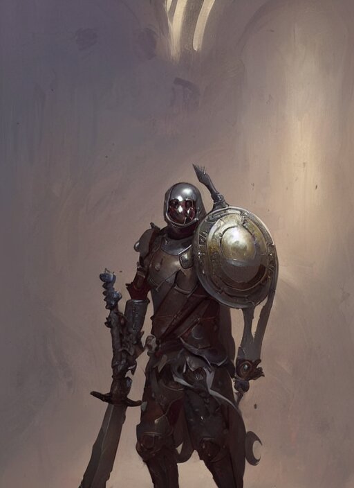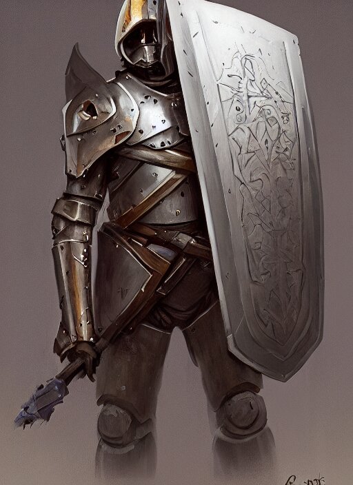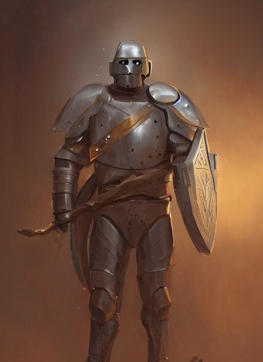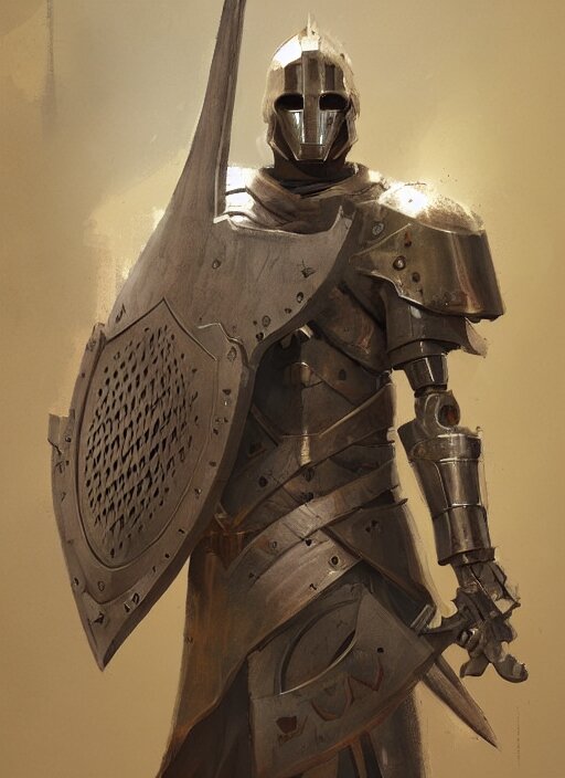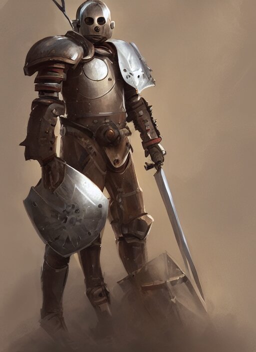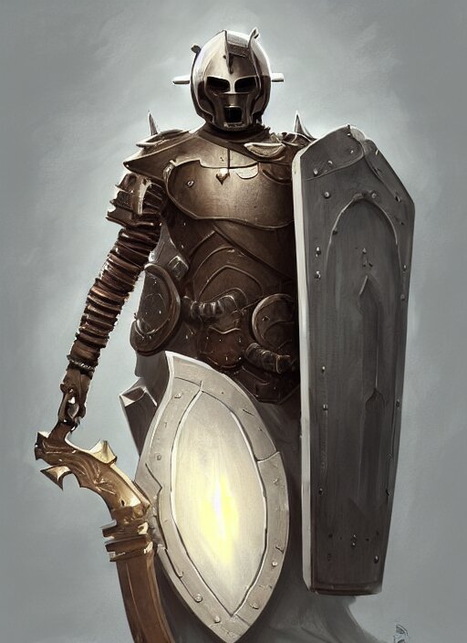 Portrait of a warforged character holding a paladin engraved longsword and carrying a big shield, concept art, by greg rutkowski