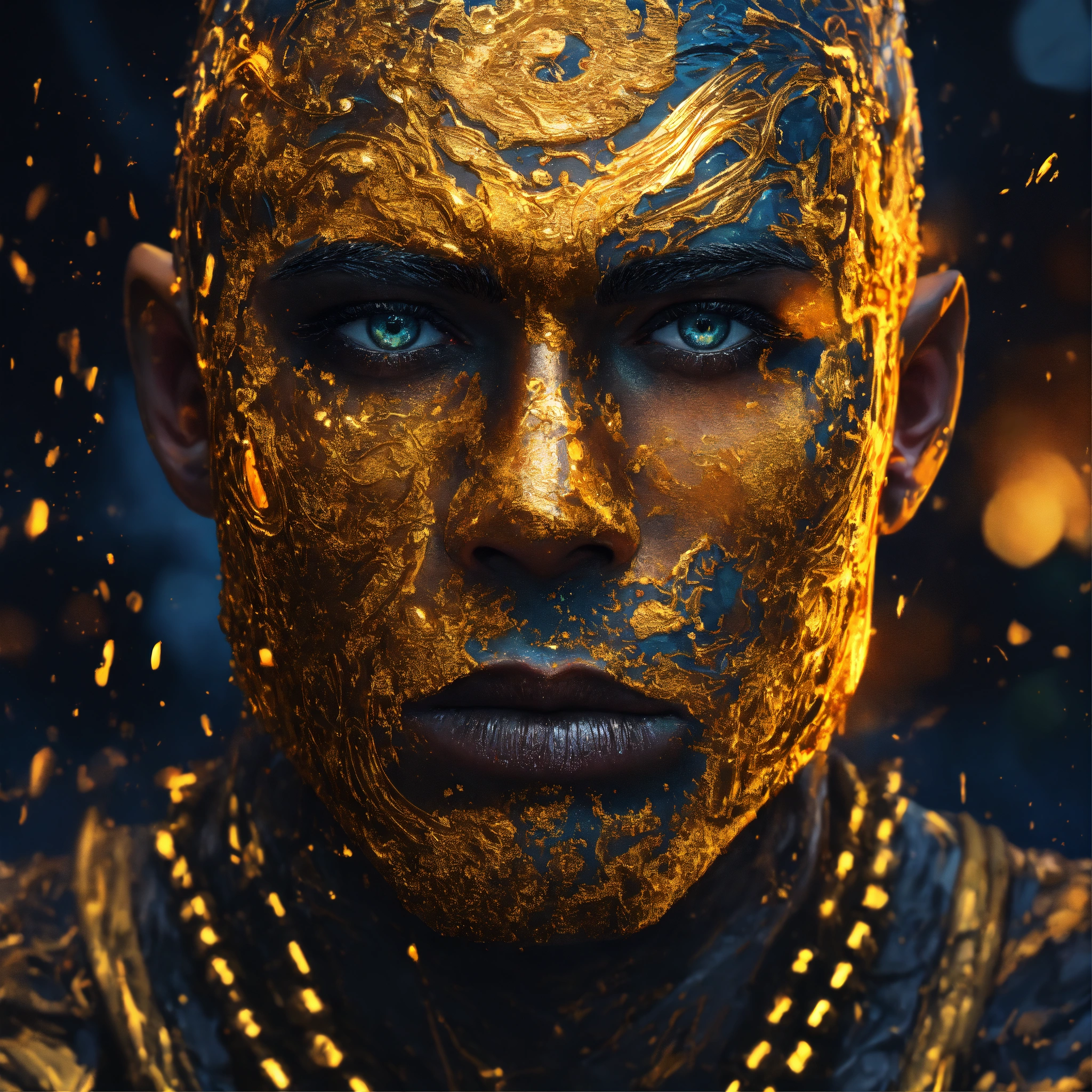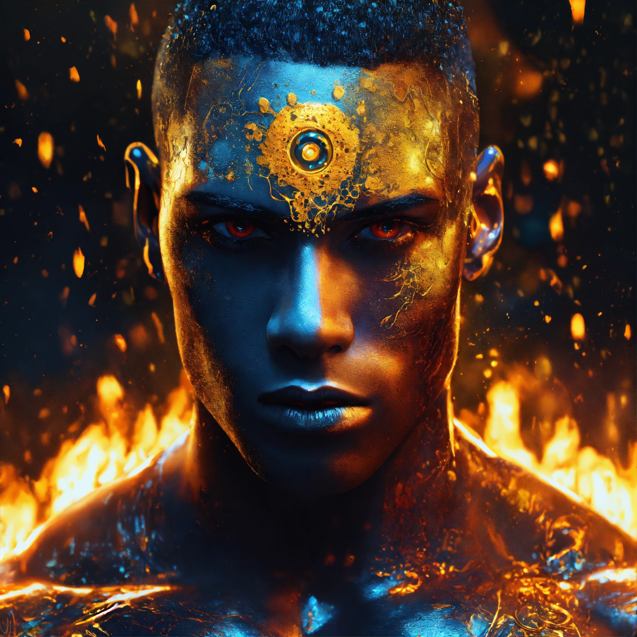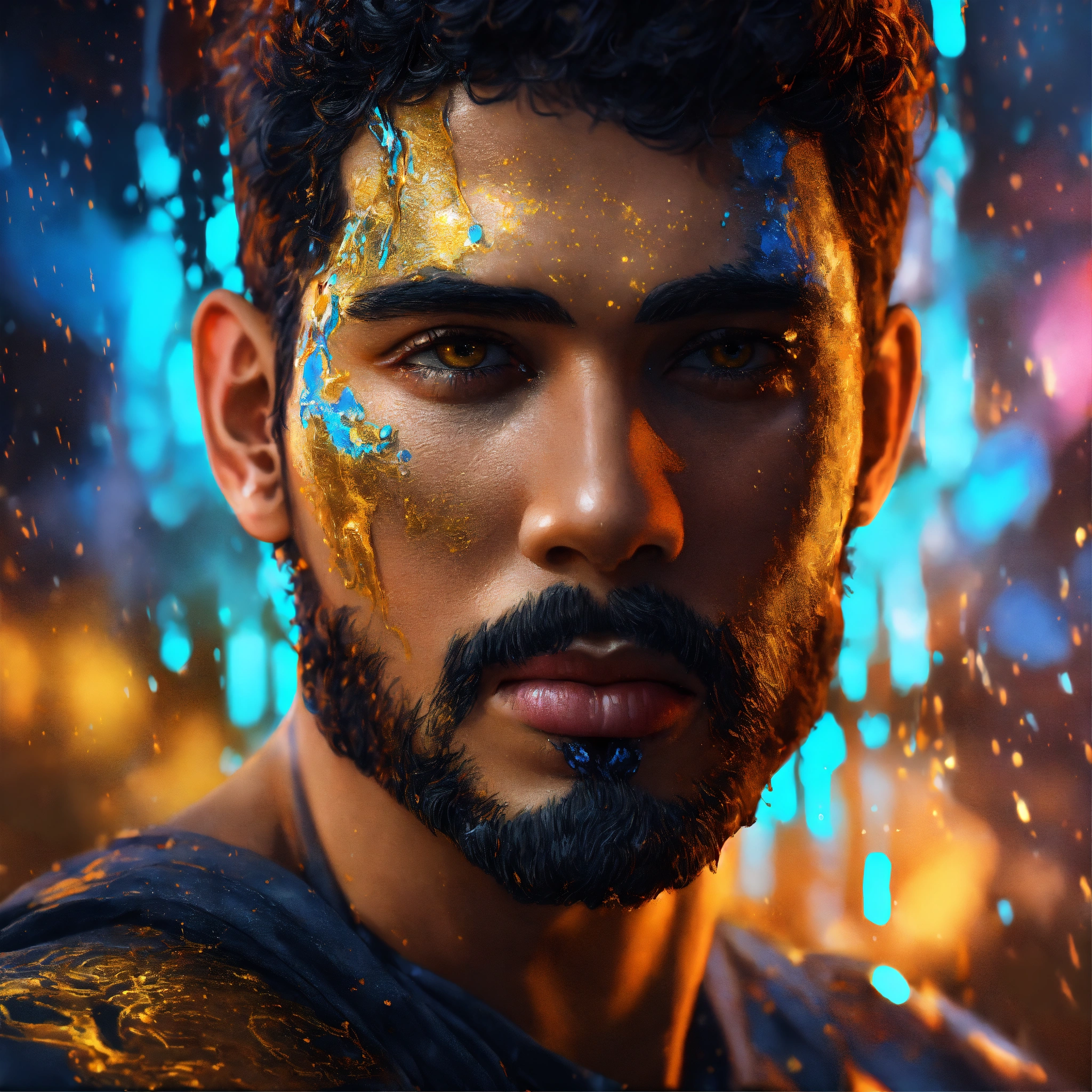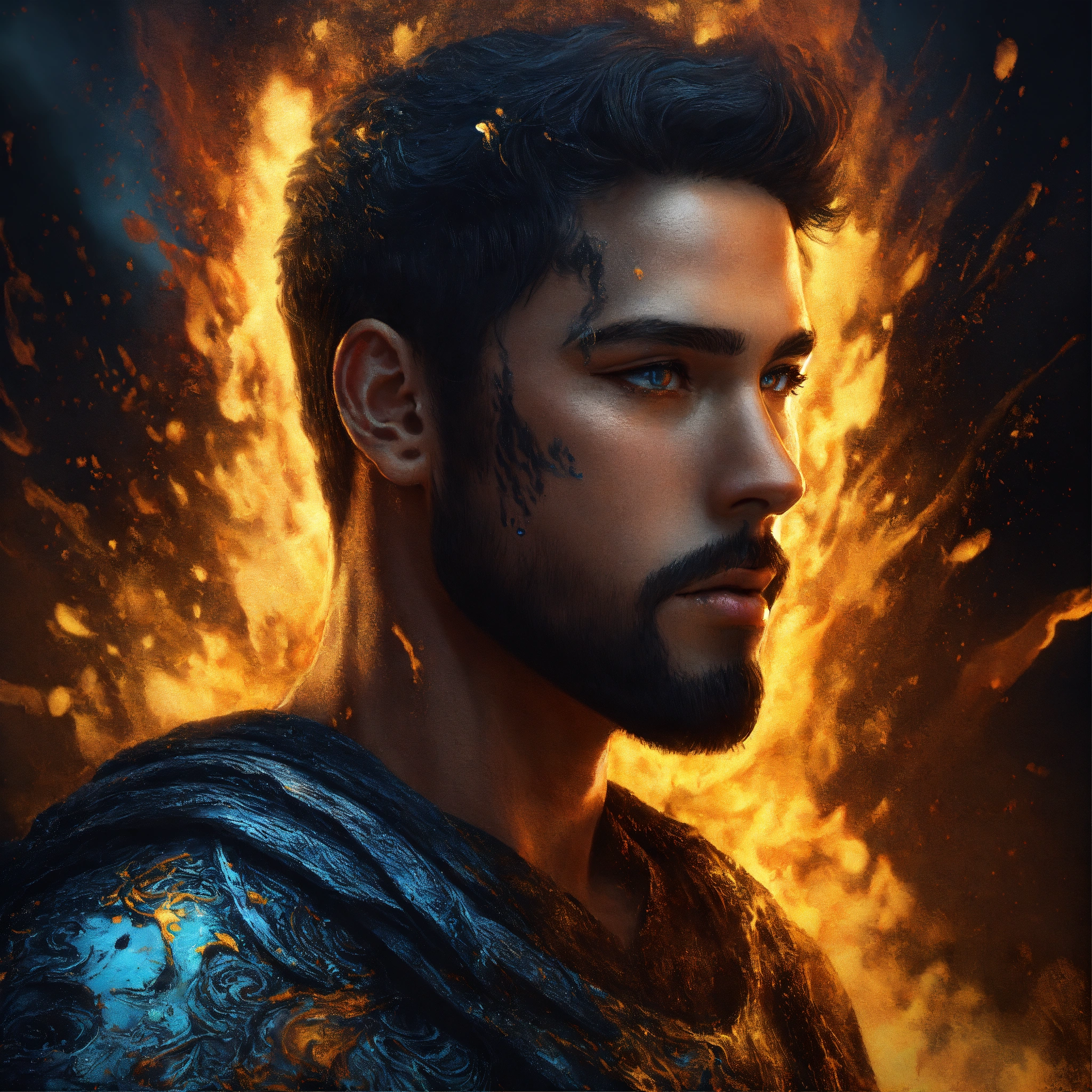A handsome well-built man, hyperdetailed eyes, tee-shirt design, line art, black background, ultra detailed artistic, detailed gorgeous face, natural skin, water splash, colour splash art, fire and ice, splatter, black ink, liquid melting, dreamy, glowing, glamour, glimmer, shadows, oil on canvas, brush strokes, smooth, ultra high definition, 8k, unreal engine 5, ultra sharp focus, intricate artwork masterpiece, ominous, golden ratio, highly detailed, vibrant, production cinematic character render, ultra high quality model