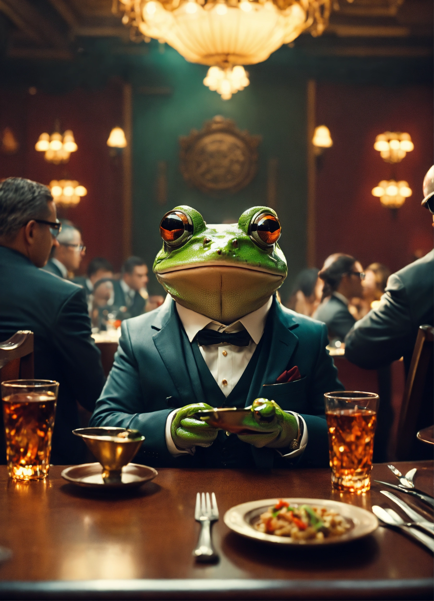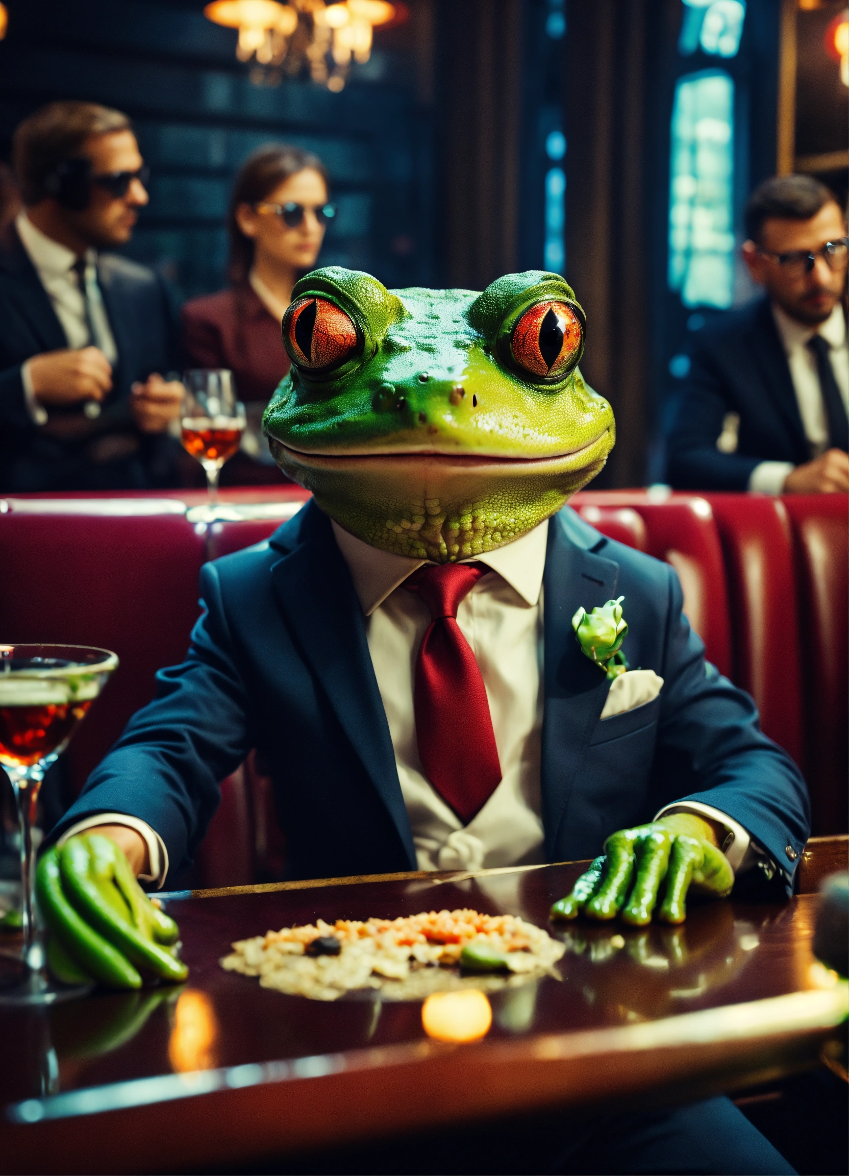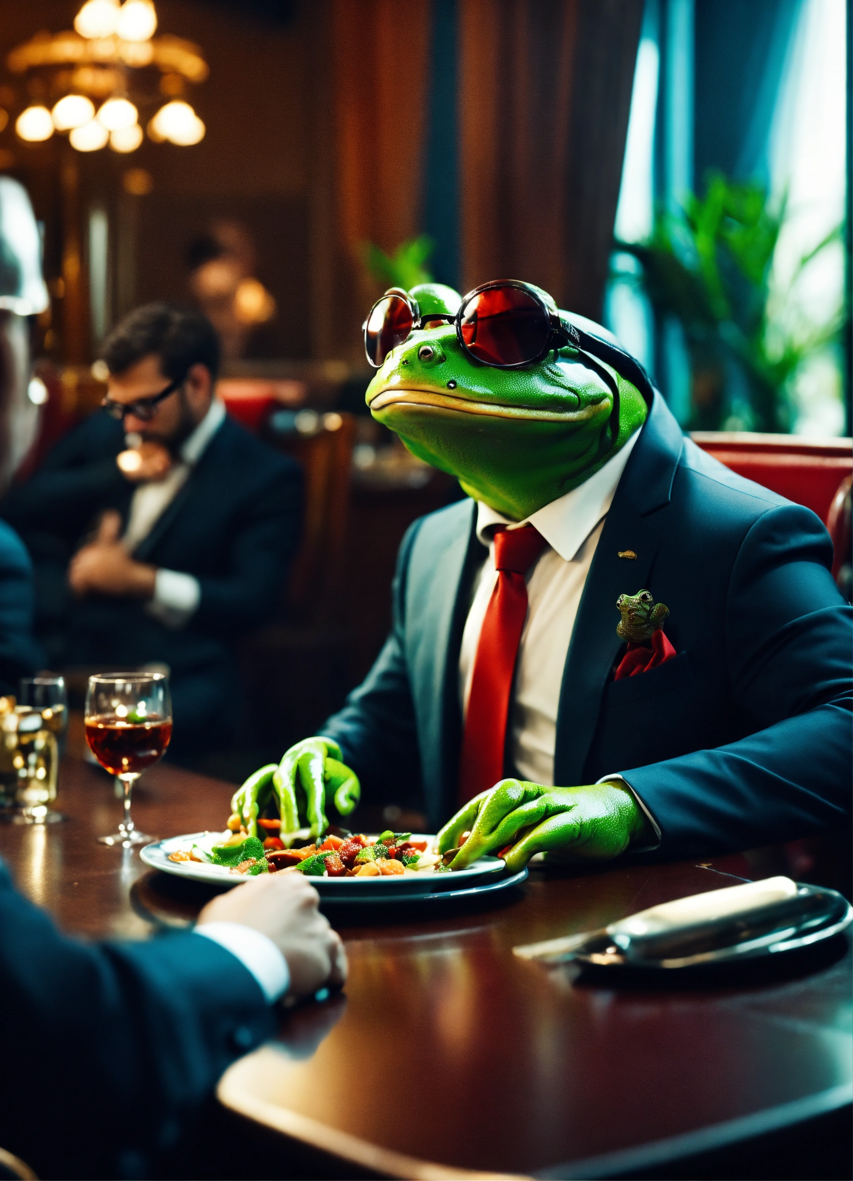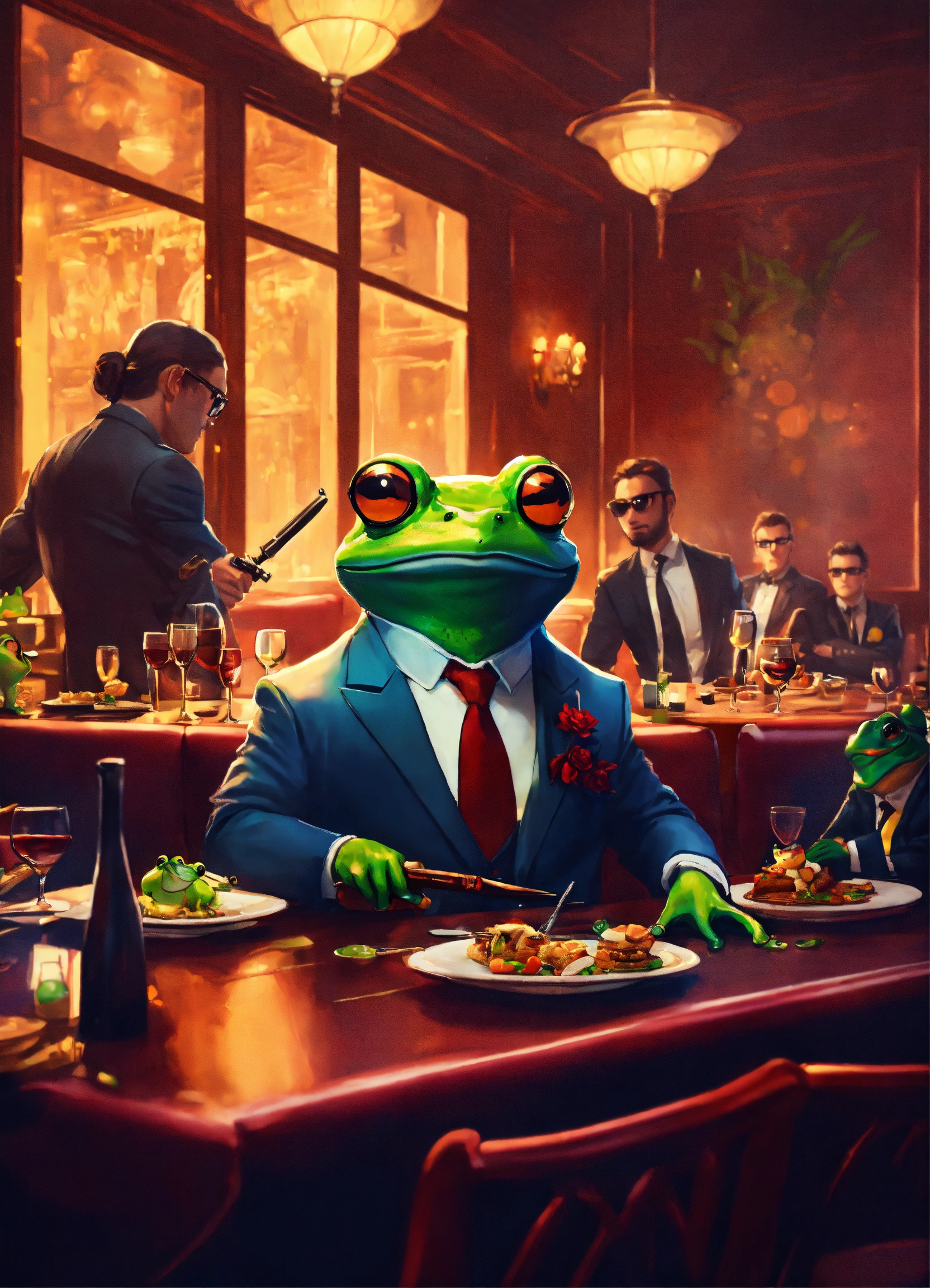 Cute frog in suit and glasses in in rich colour restaurant sitting at the table with mafia boss with weapons and humans surrounded by security and police and ladies in cinematic environment
