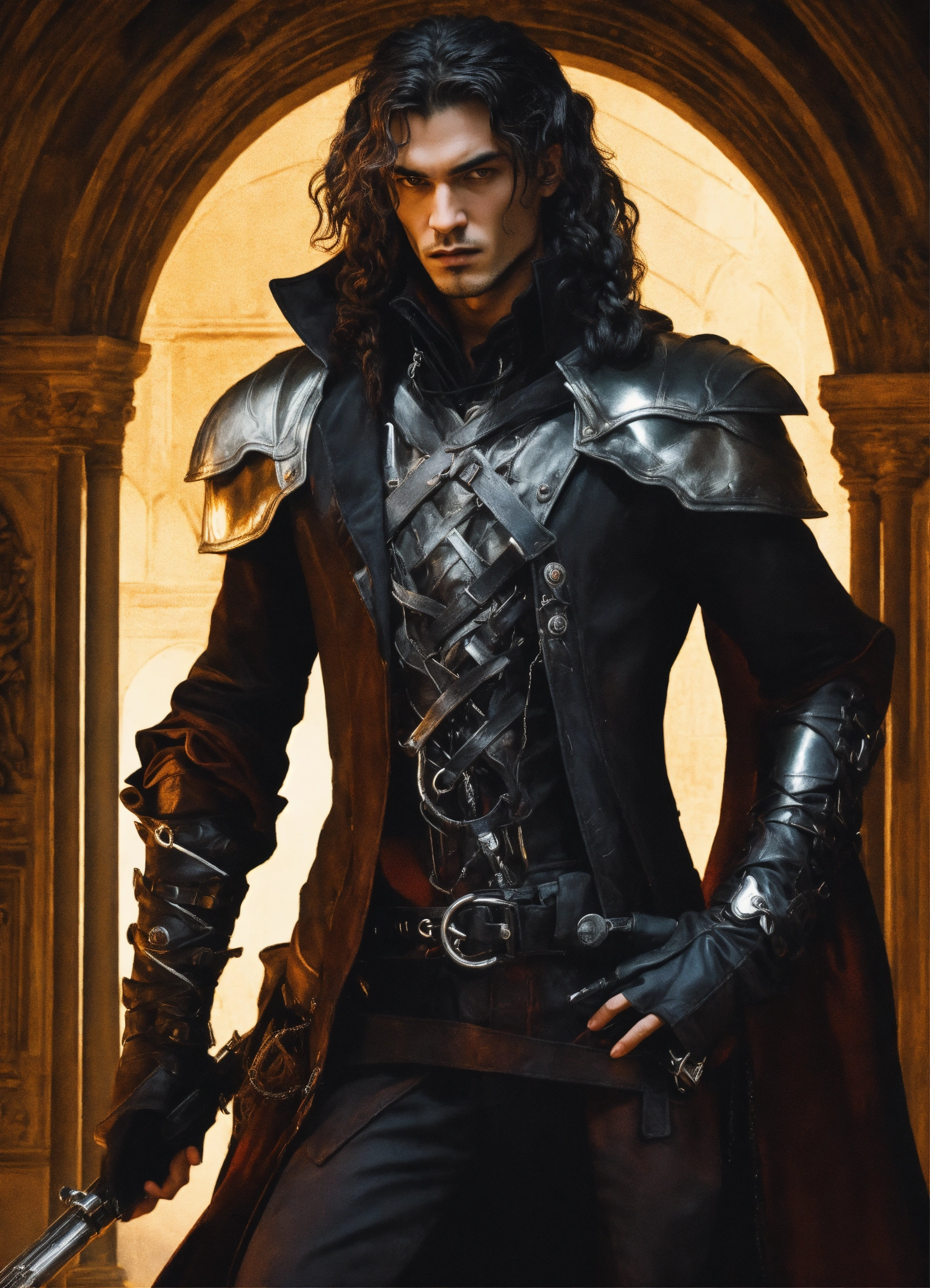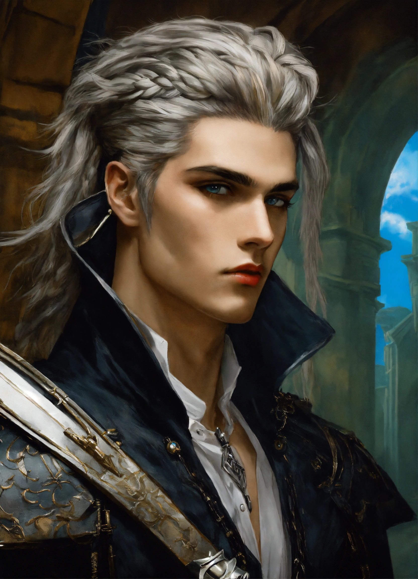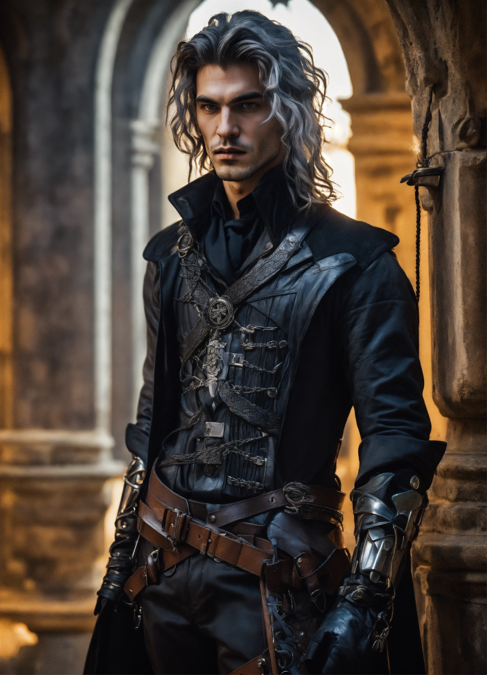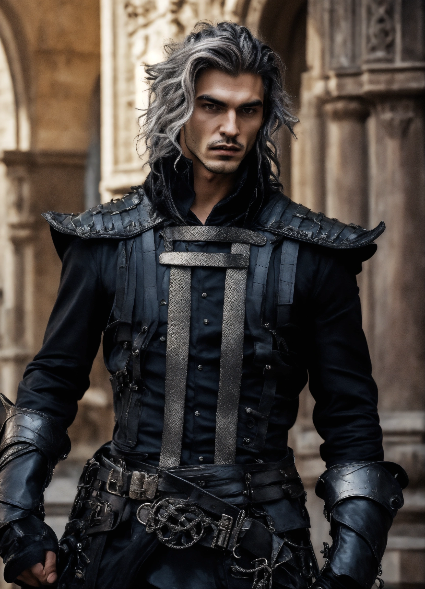 Futuristic vampire hunter, young male with black, silver-streaked braided locks, gothic fortress, michelangelo, rosetti