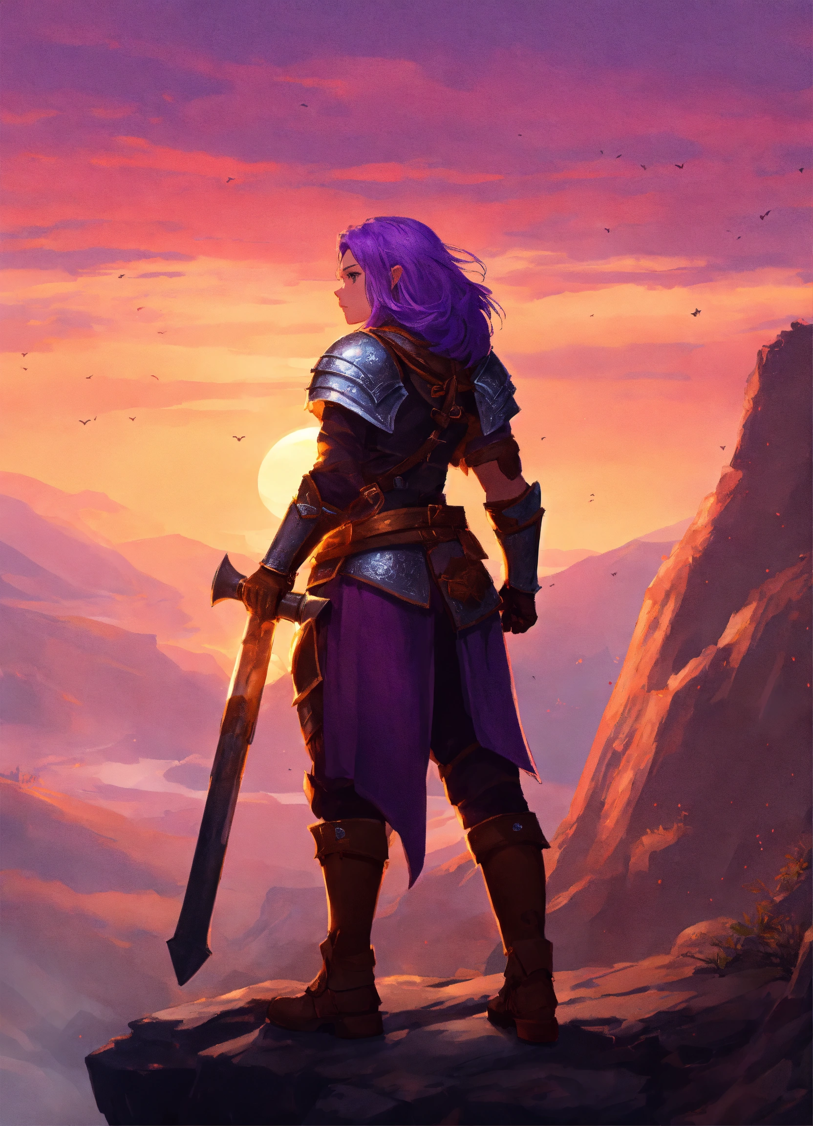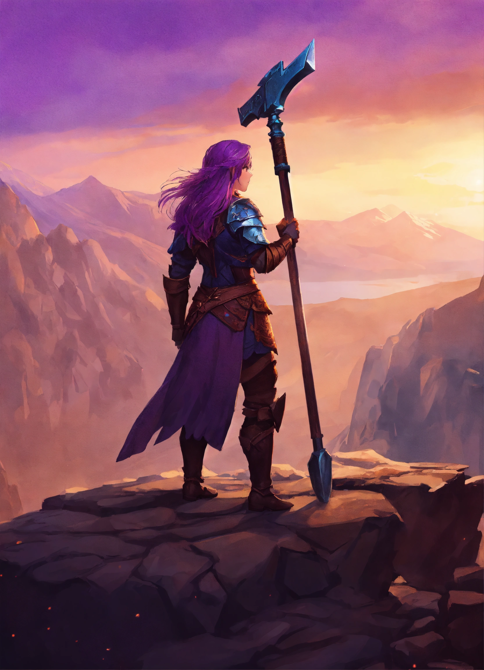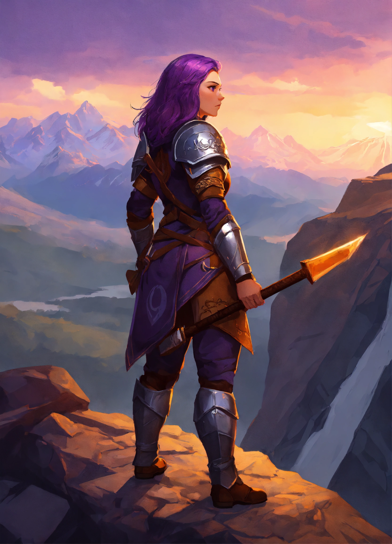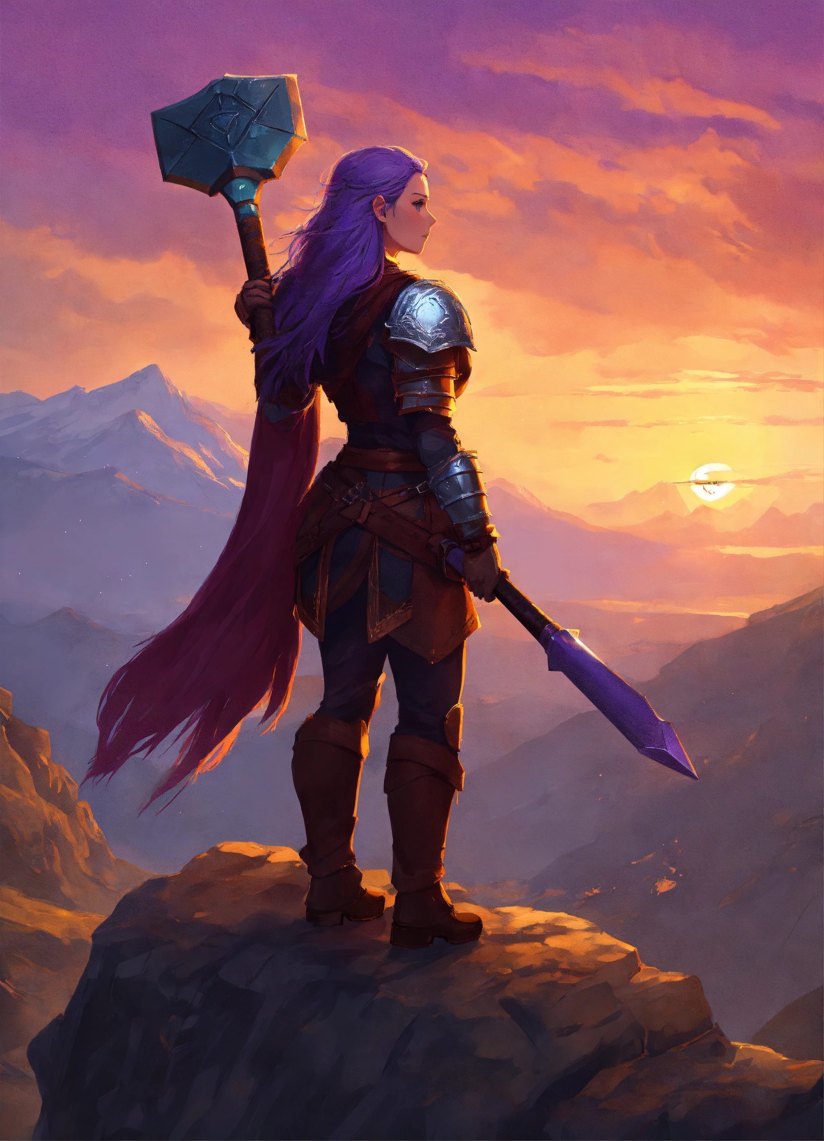 Female sturdy stout dwarven cleric, with purple hair, wearing armor, wielding a hammer heroic stance, standing on a cliff, watching the sunrise, large mountainous background, digital art