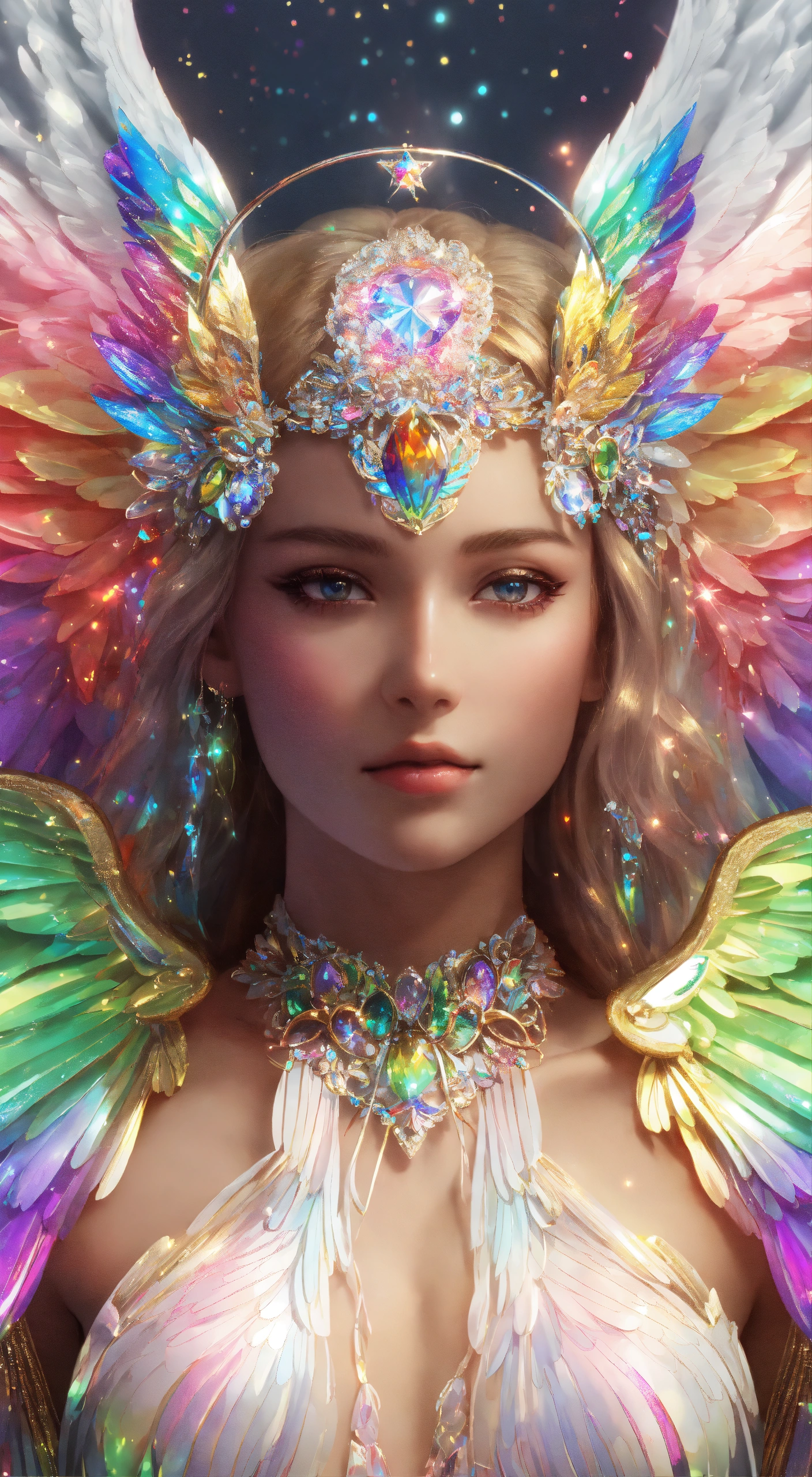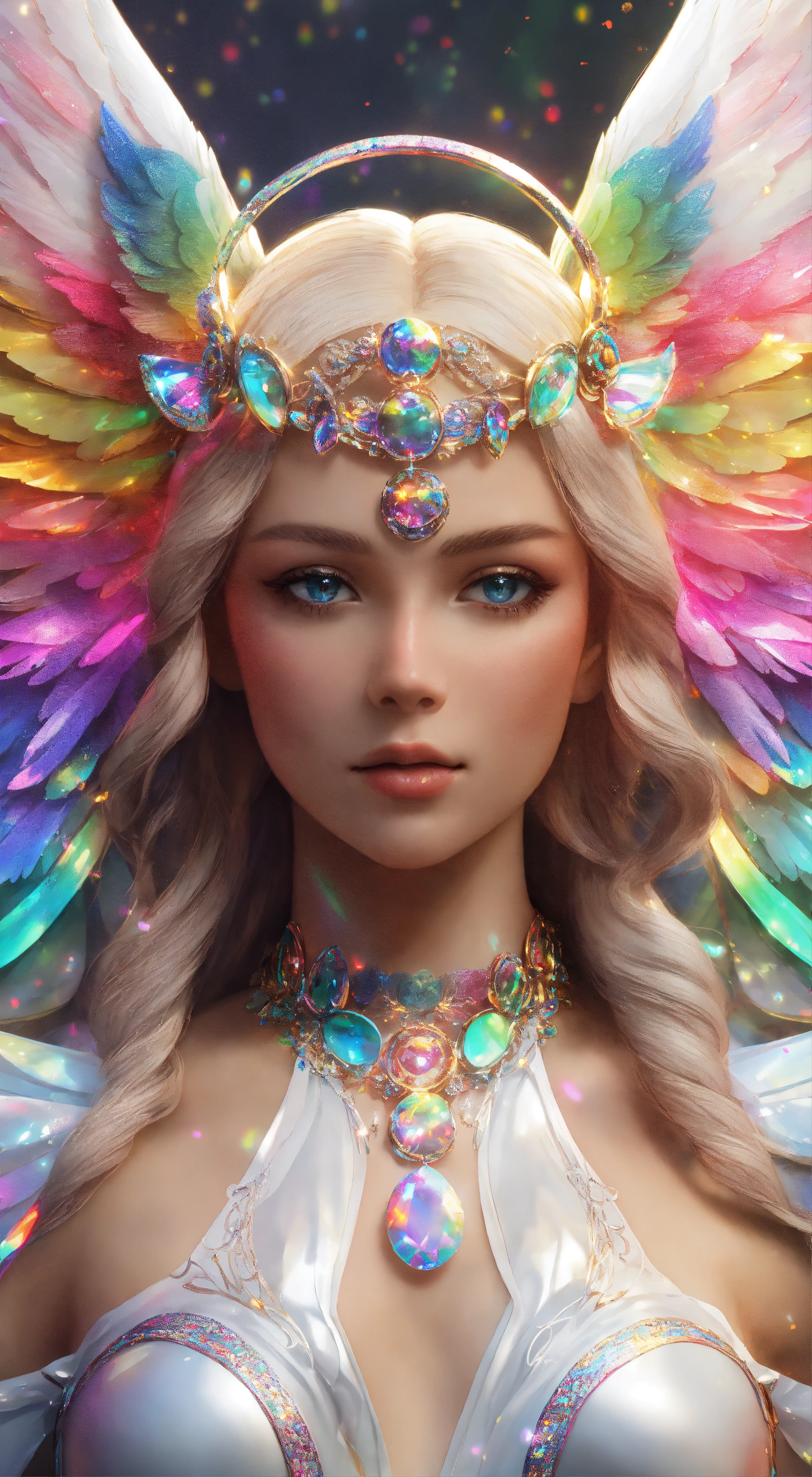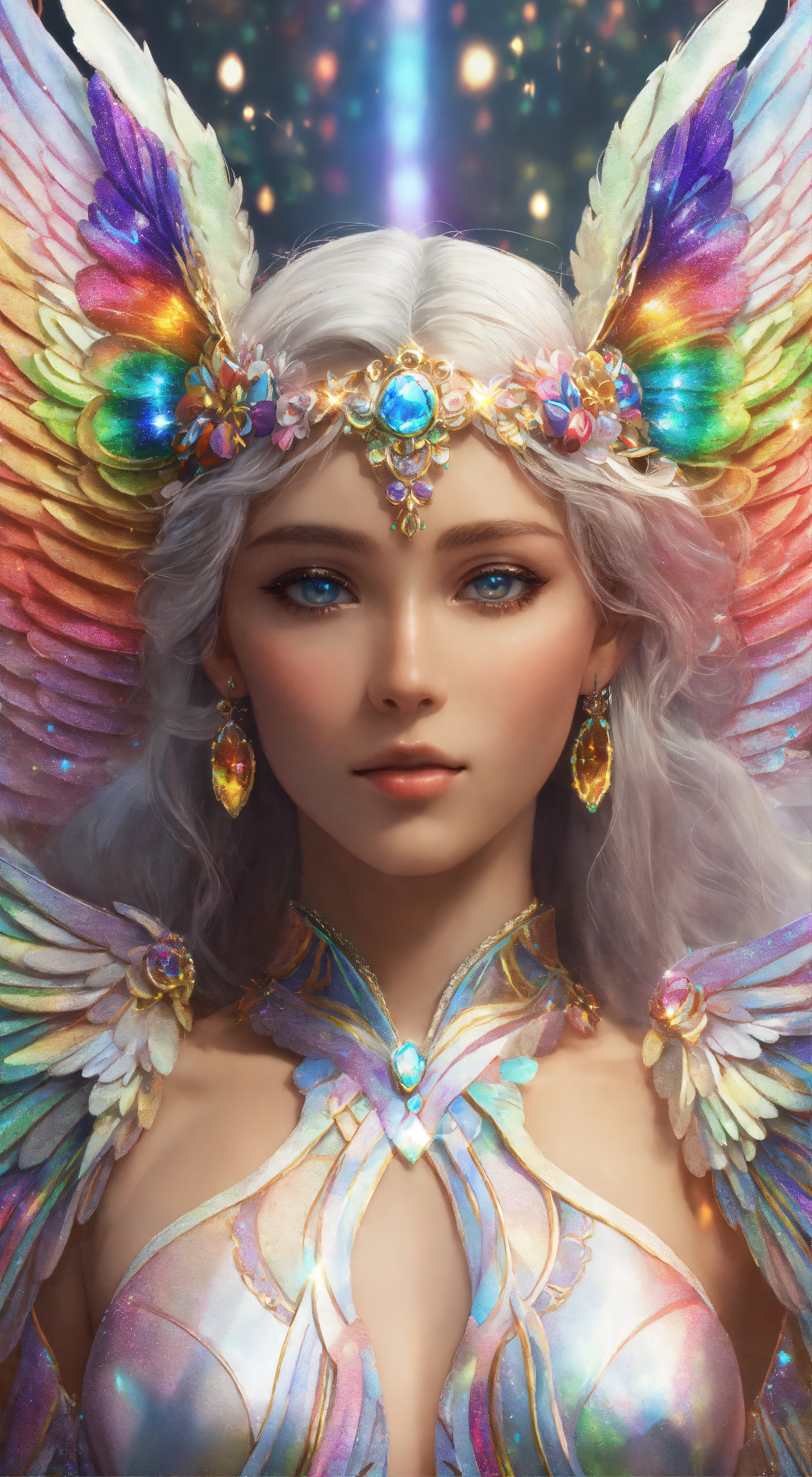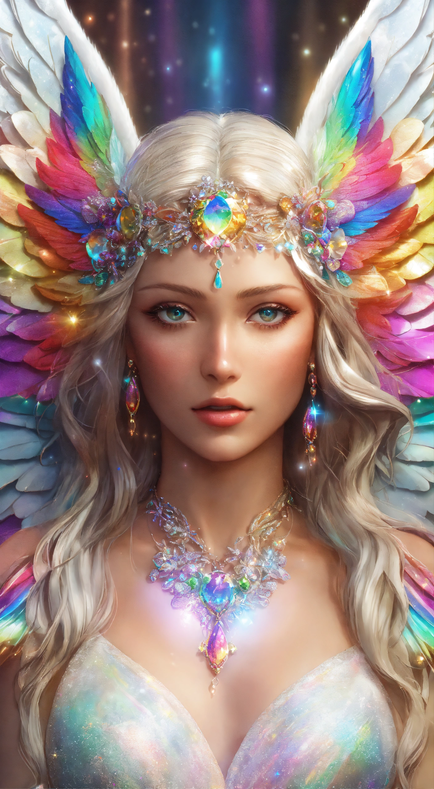 Cinematographic illustration, holographic illustration, angel beautiful and perfect woman with rainbow colored angel wings with luminous sparkles. detailed and defined rainbow colored angel wings. full and large angel wings. beautiful and divine angel with big wings and body complete. beautiful and detailed face. very clear eyes with a deep, penetrating, frontal look. celestial white tunic-type dress with many rainbow-colored details with lots of light. she has beautiful rainbow colored jewelry. 3d, hyper-detailed, hyper-realistic, masterpiece. digital art, realism. hd. high quality. high resolution. 8k