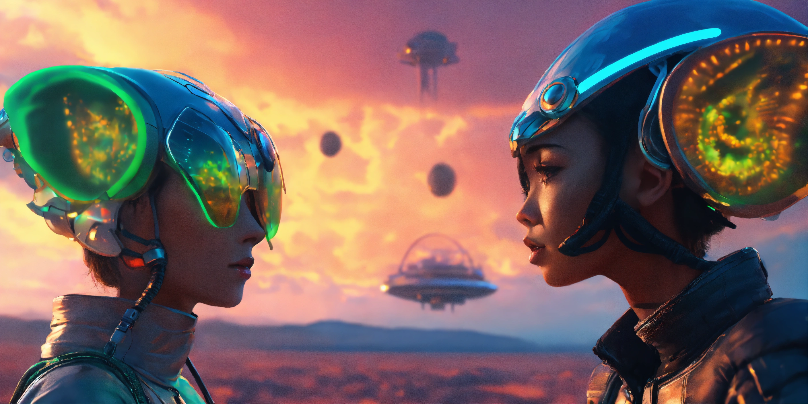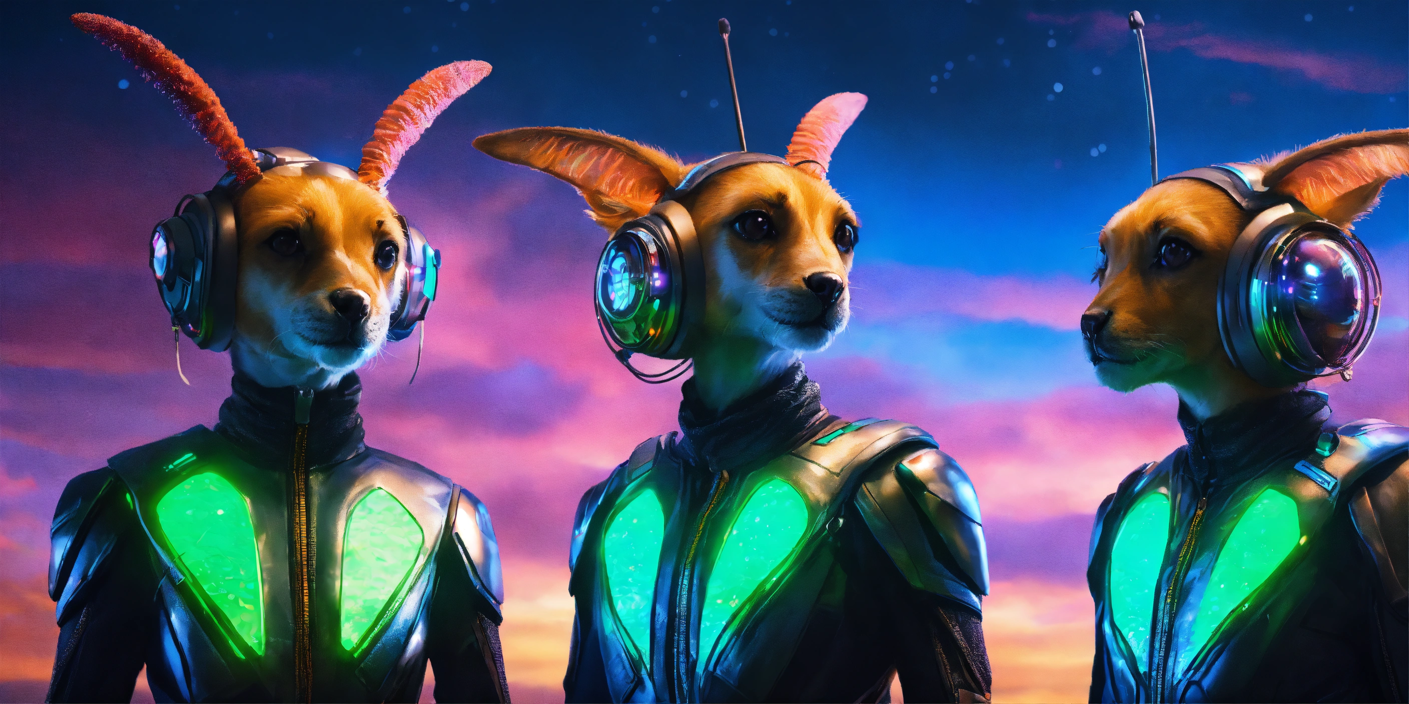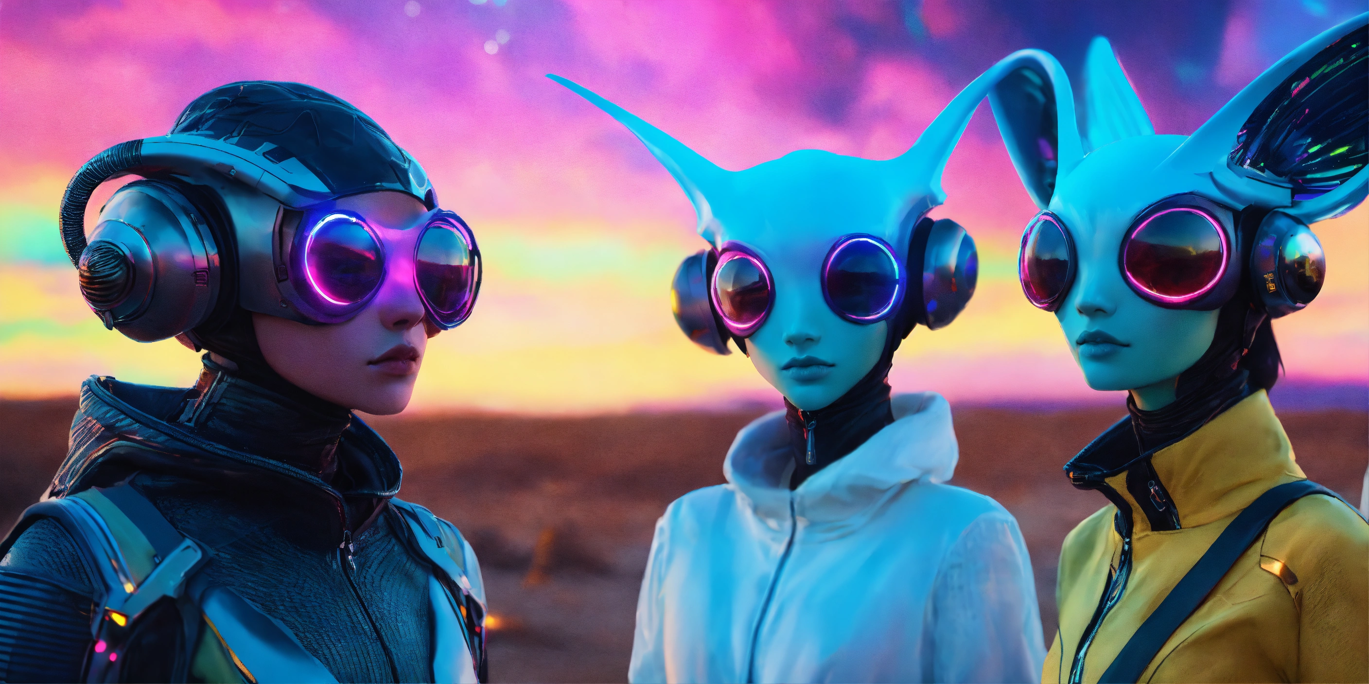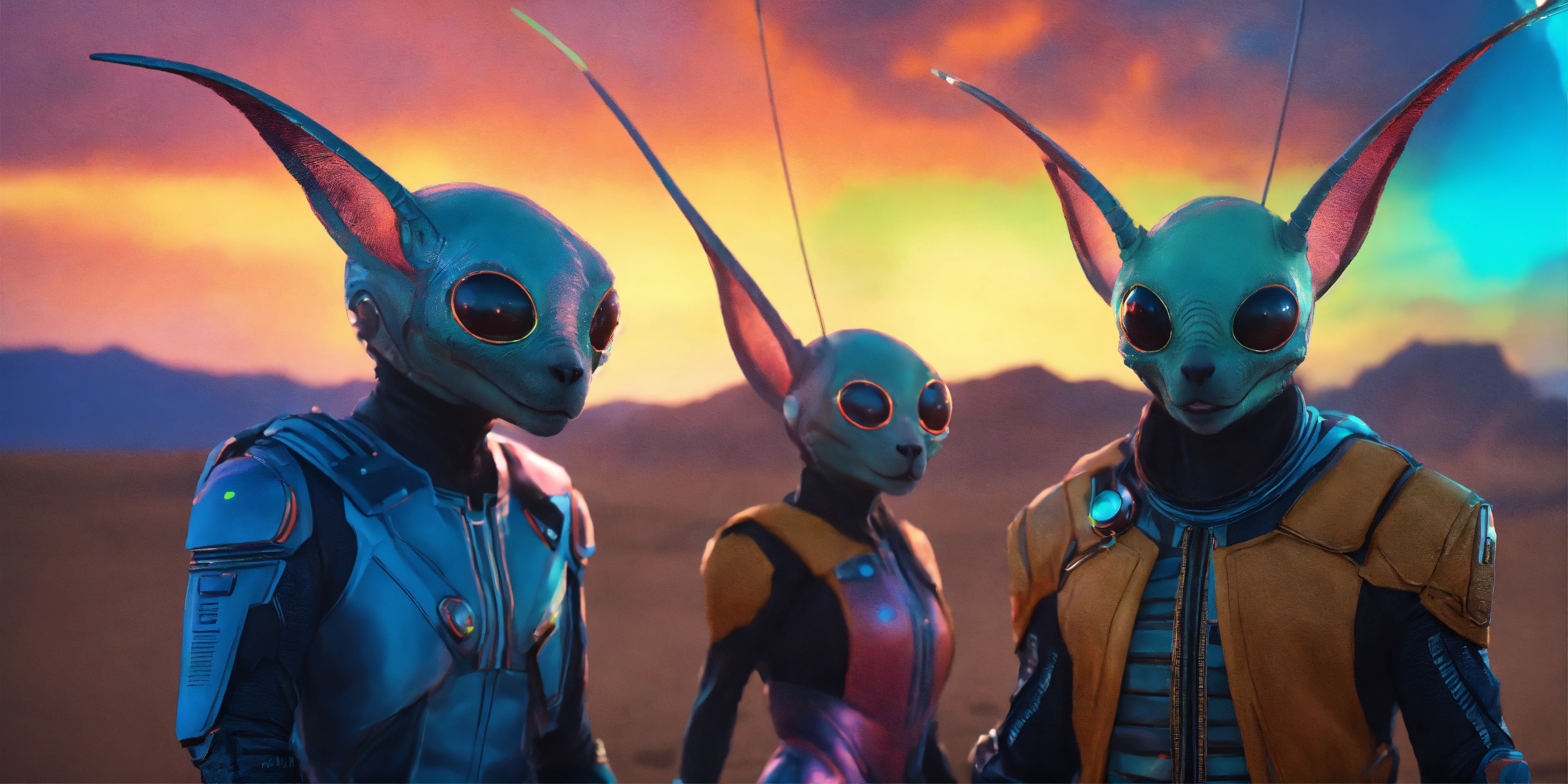 Zoom out of 4 lovable creatures wearing detailed alien ear antennas with futuristic clothing, colorful sky, futuristic, sci-fi, realistic, 8k