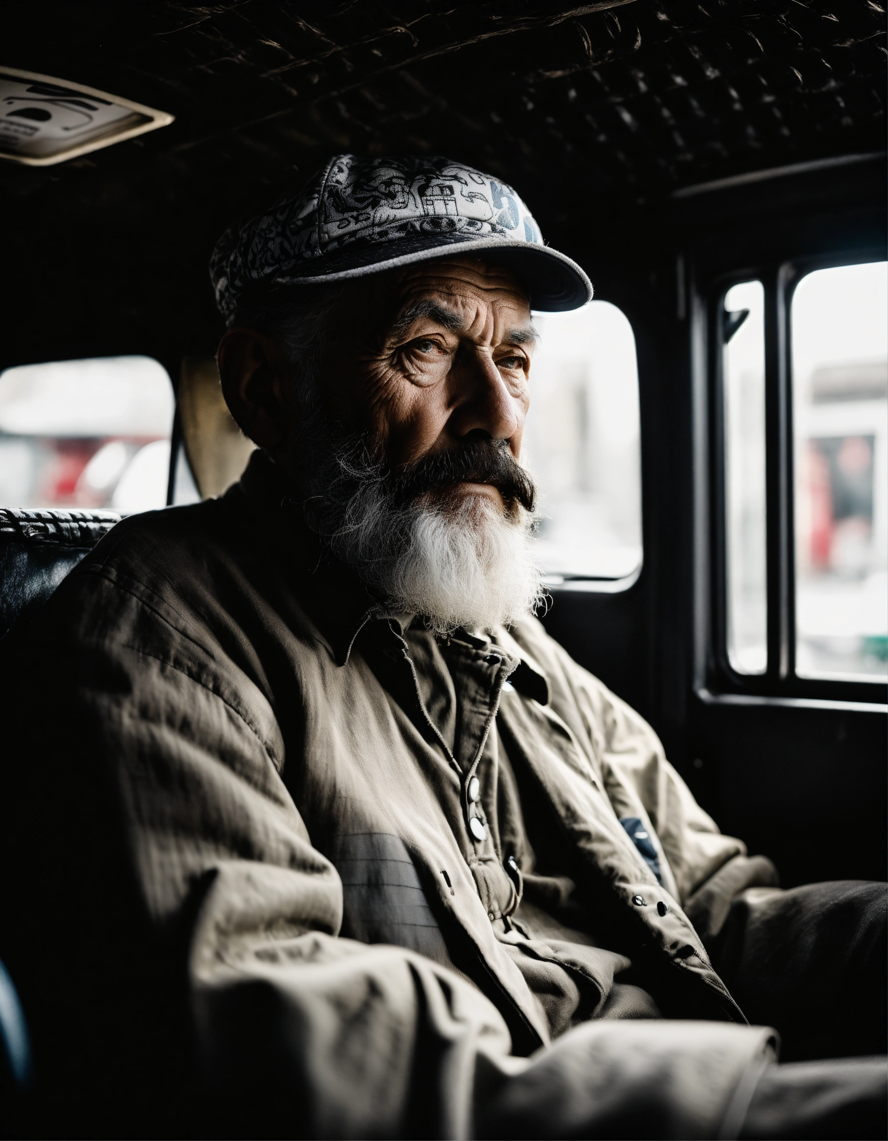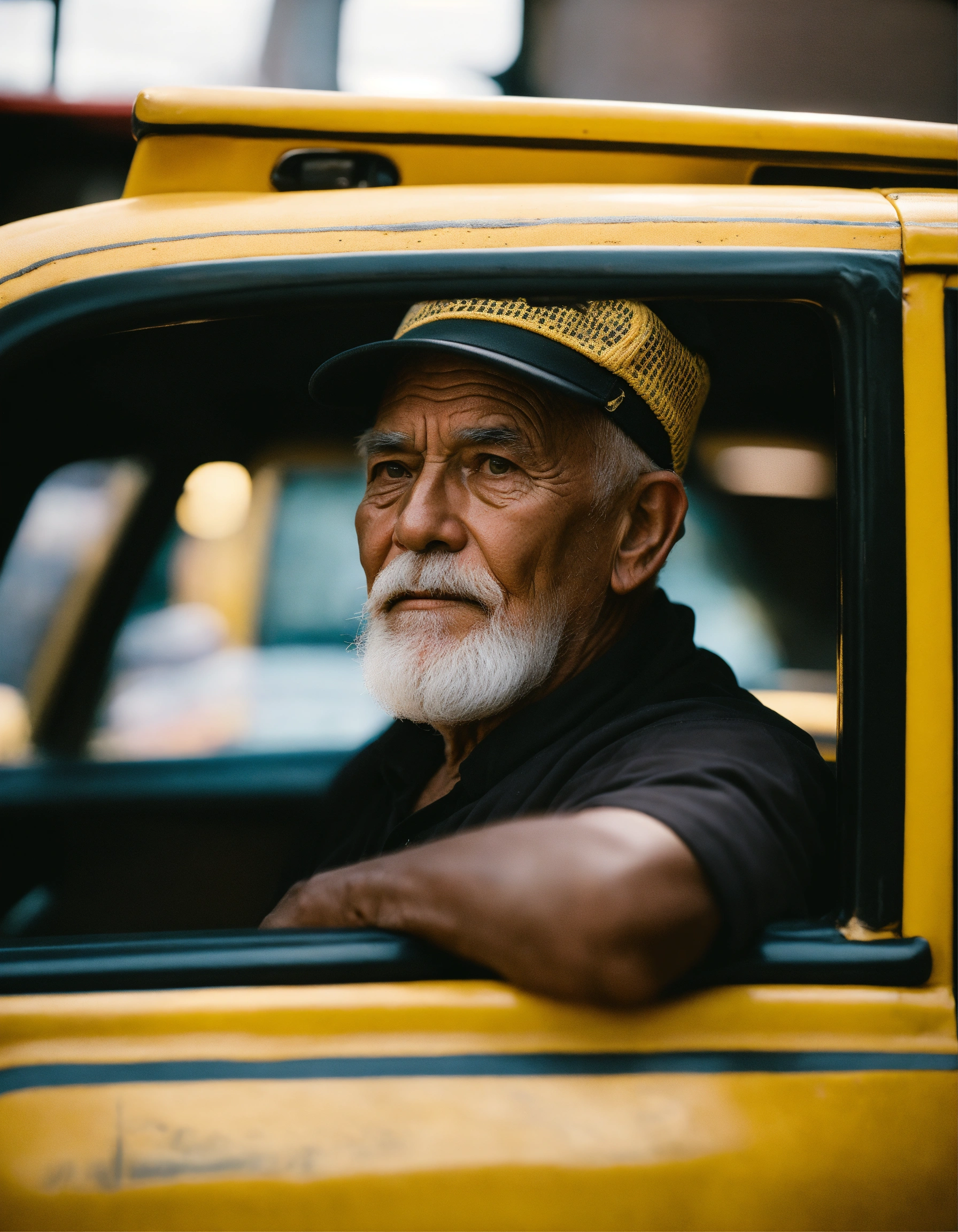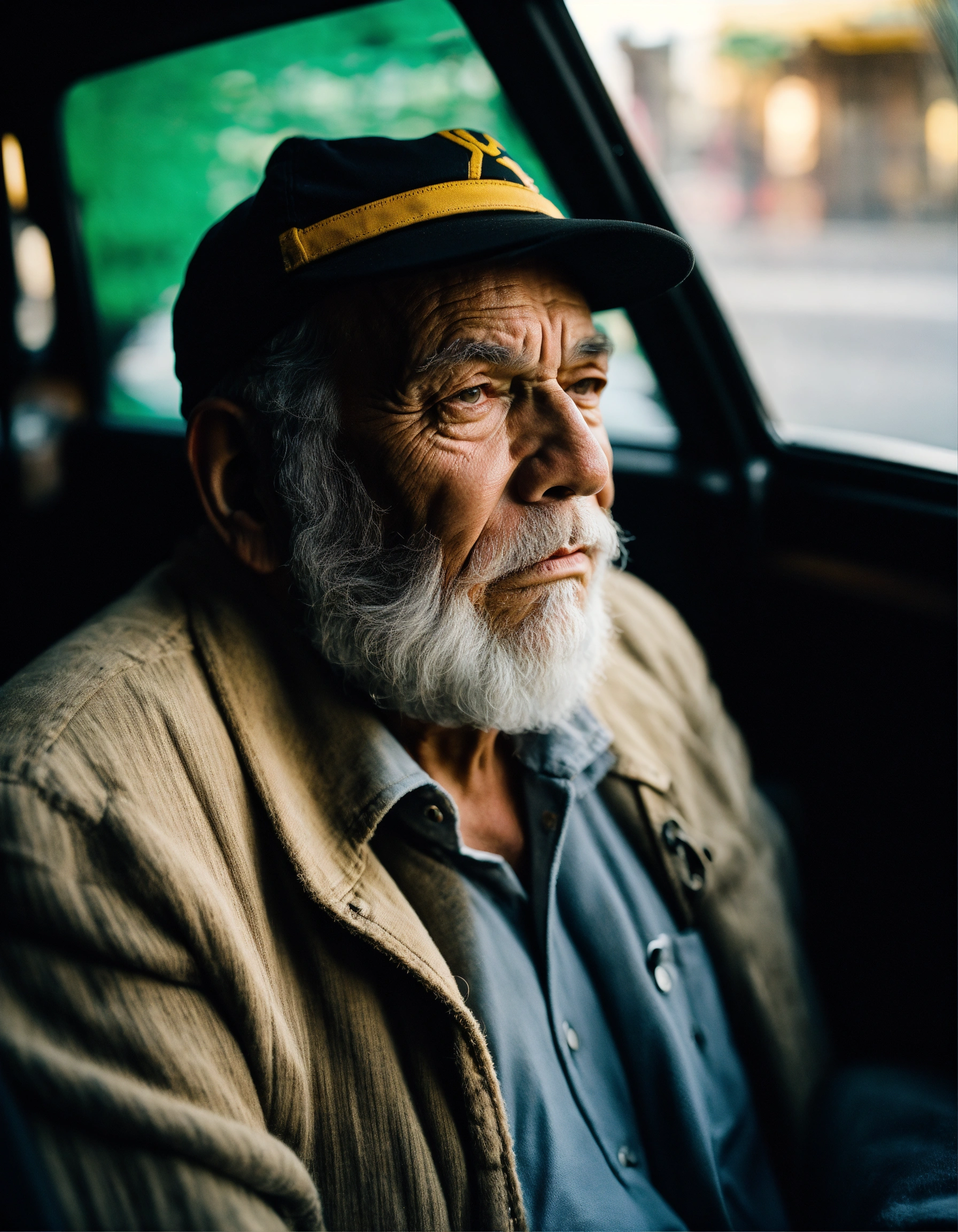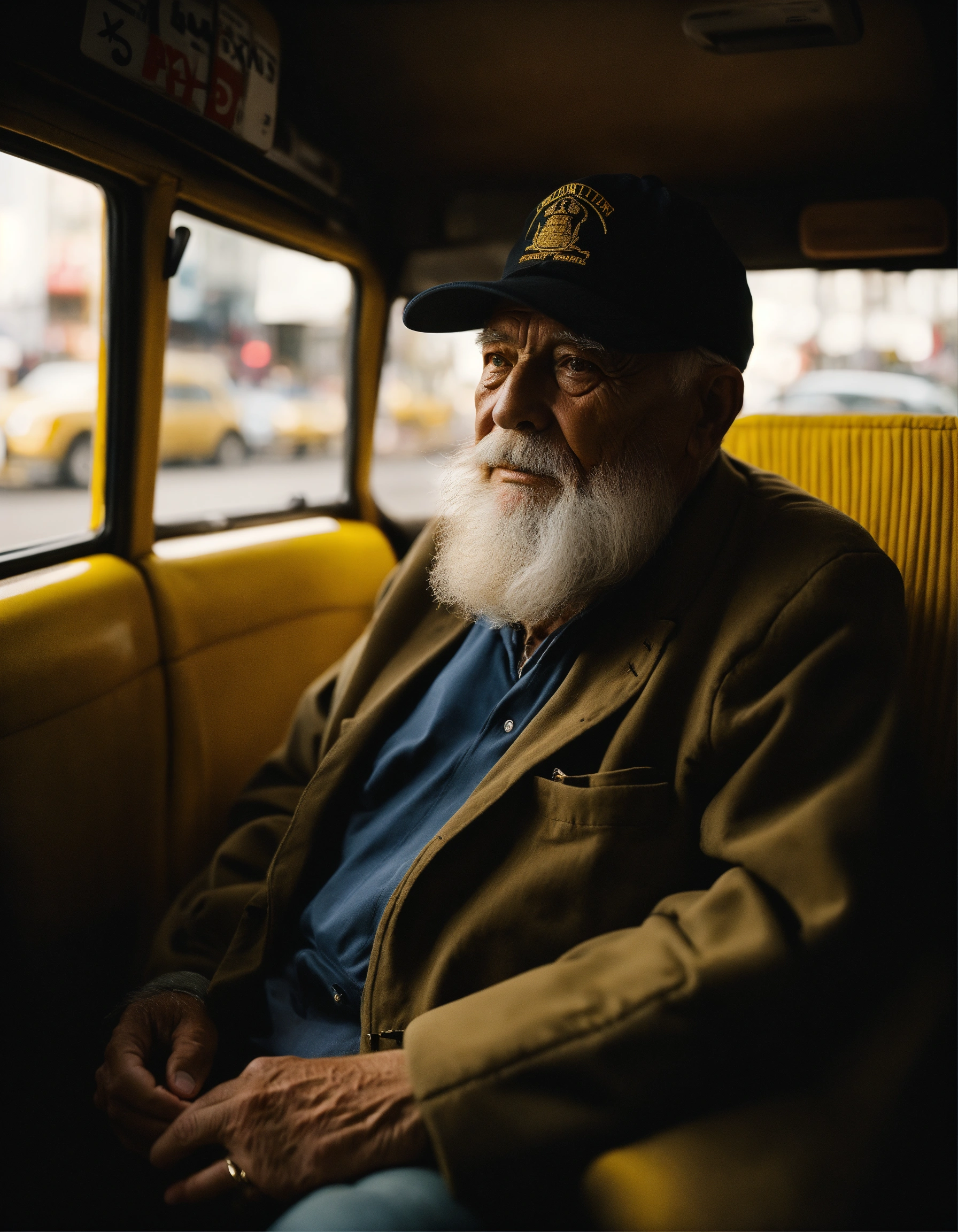 A wise old man with black beard and baseball cap in a taxi cab, sitting on a straw chair, shot on hasselblad, shadowplay