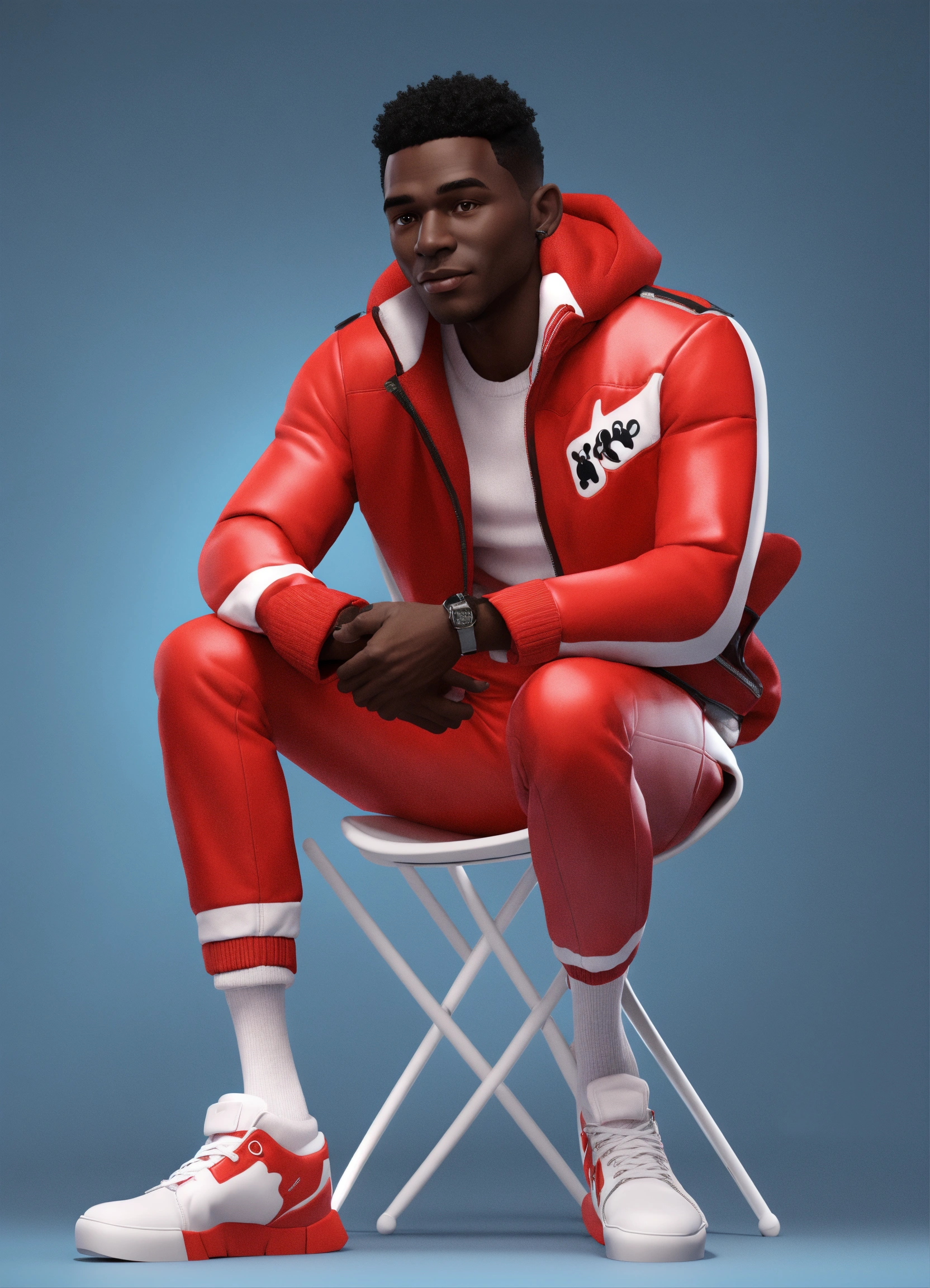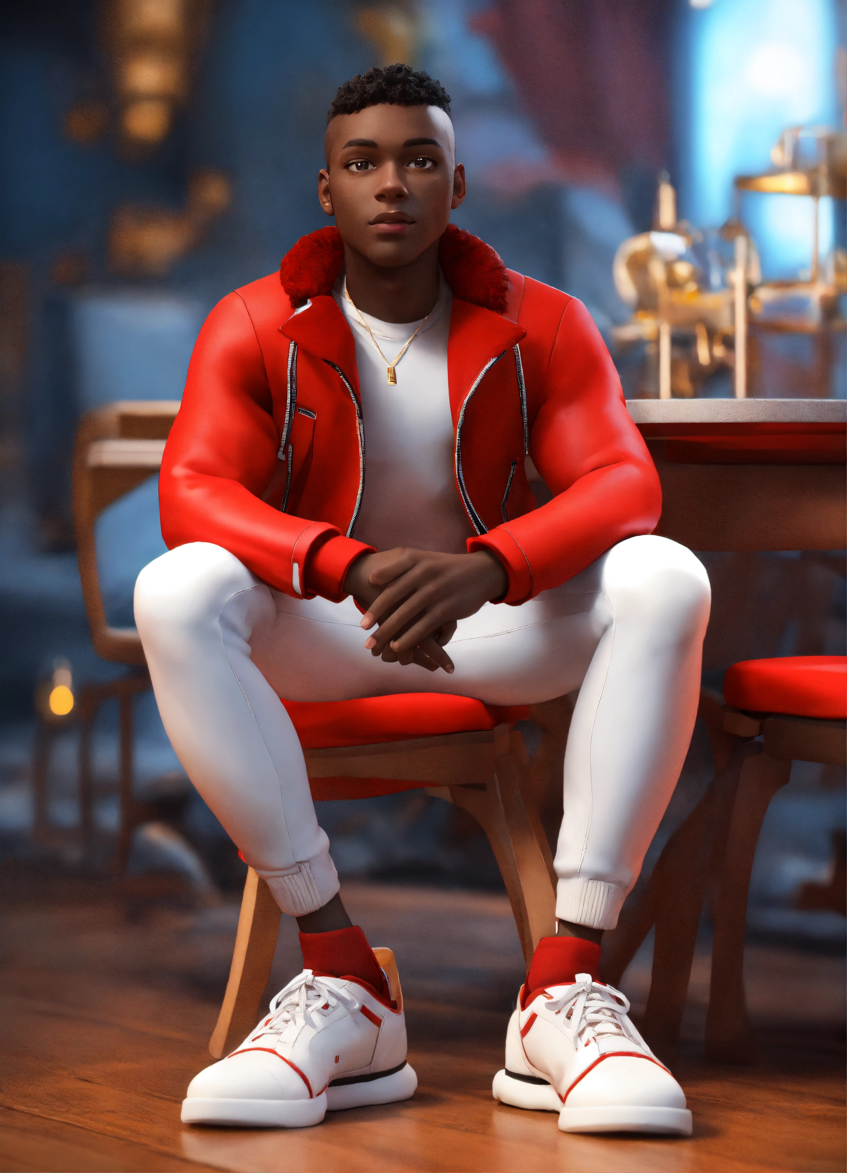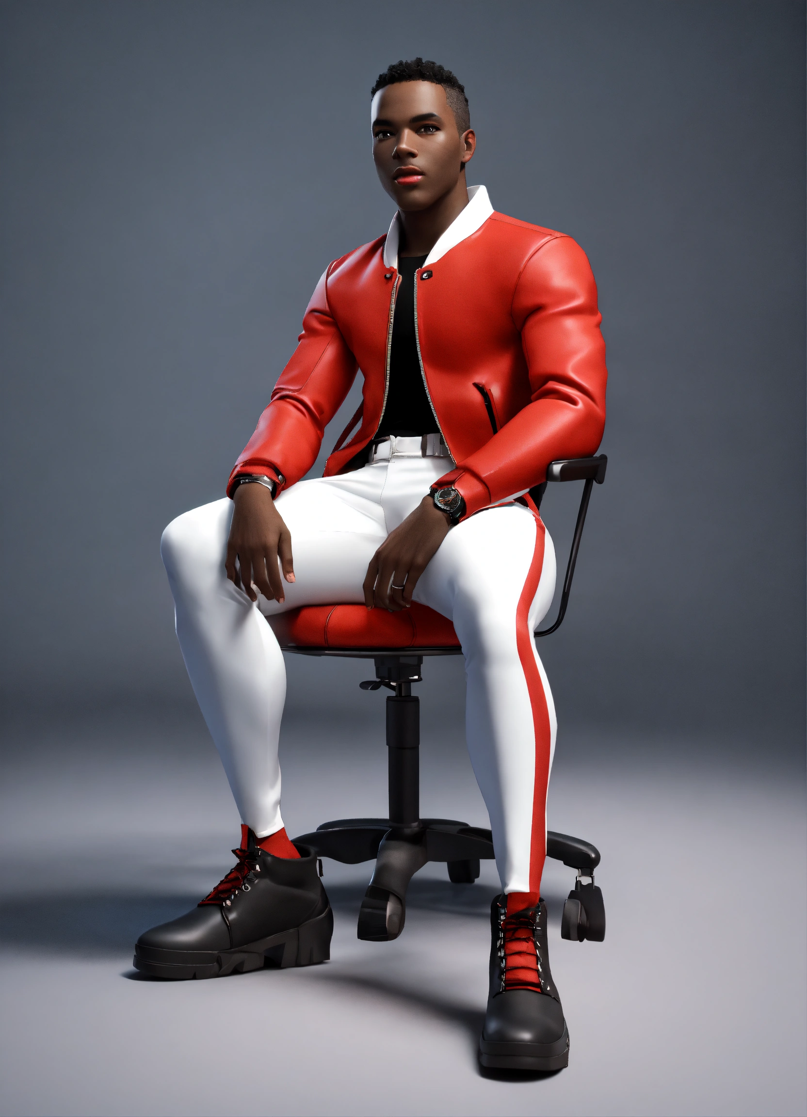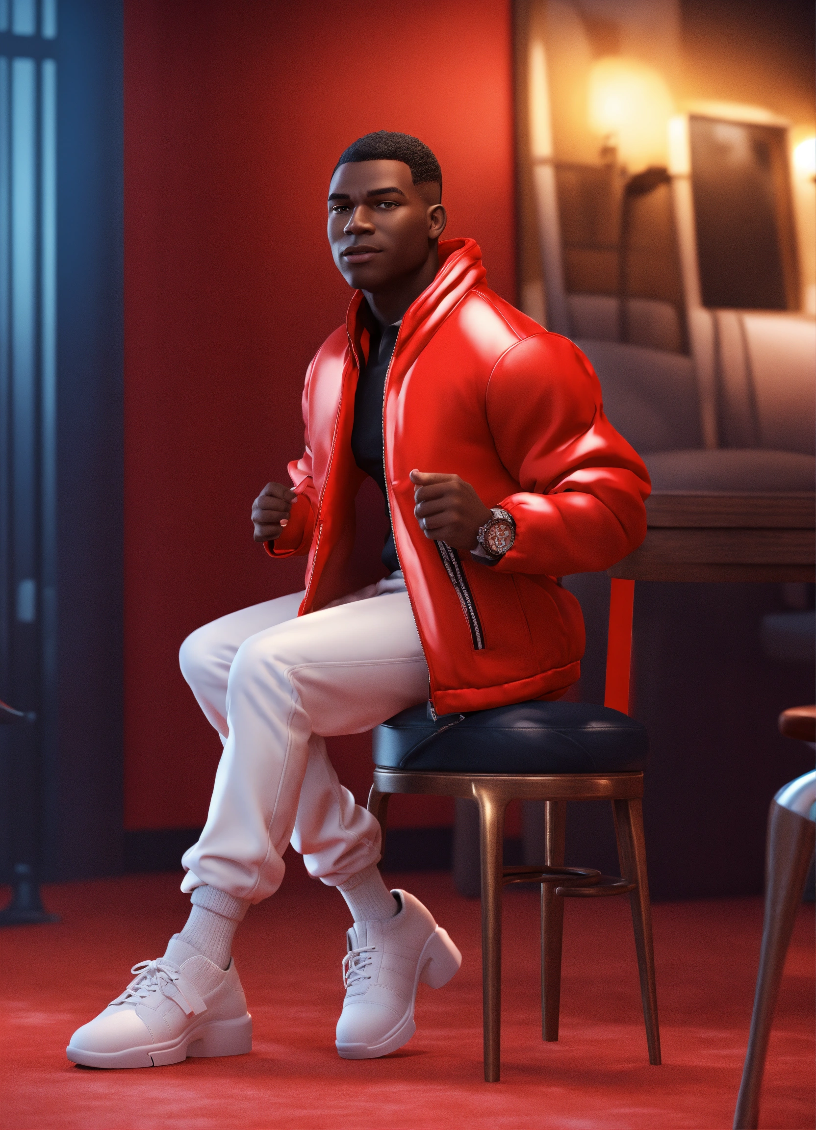 Cartoon black skin man in red jacket and white pants sitting on chair, leg on leg, disney style, 3d render