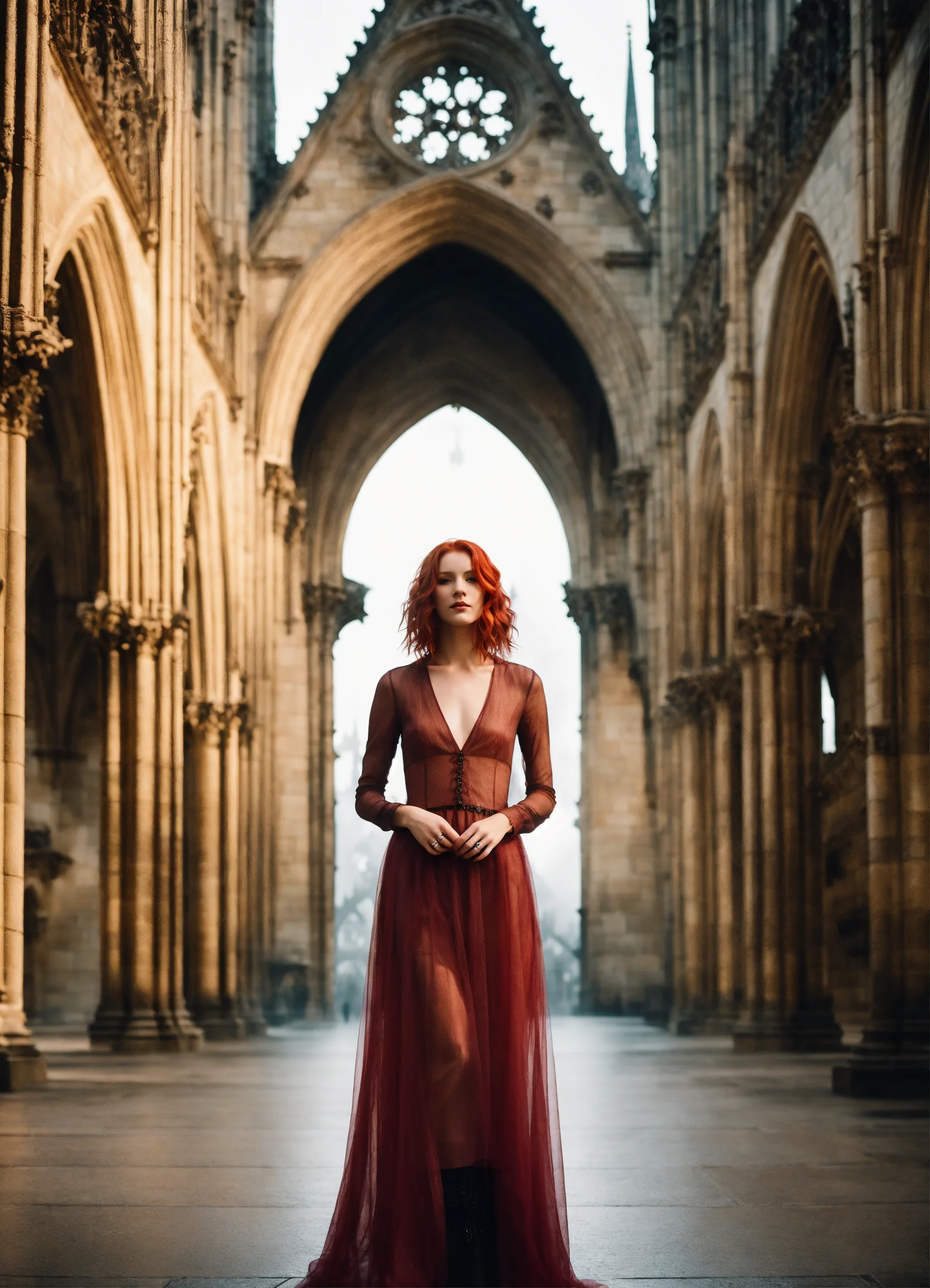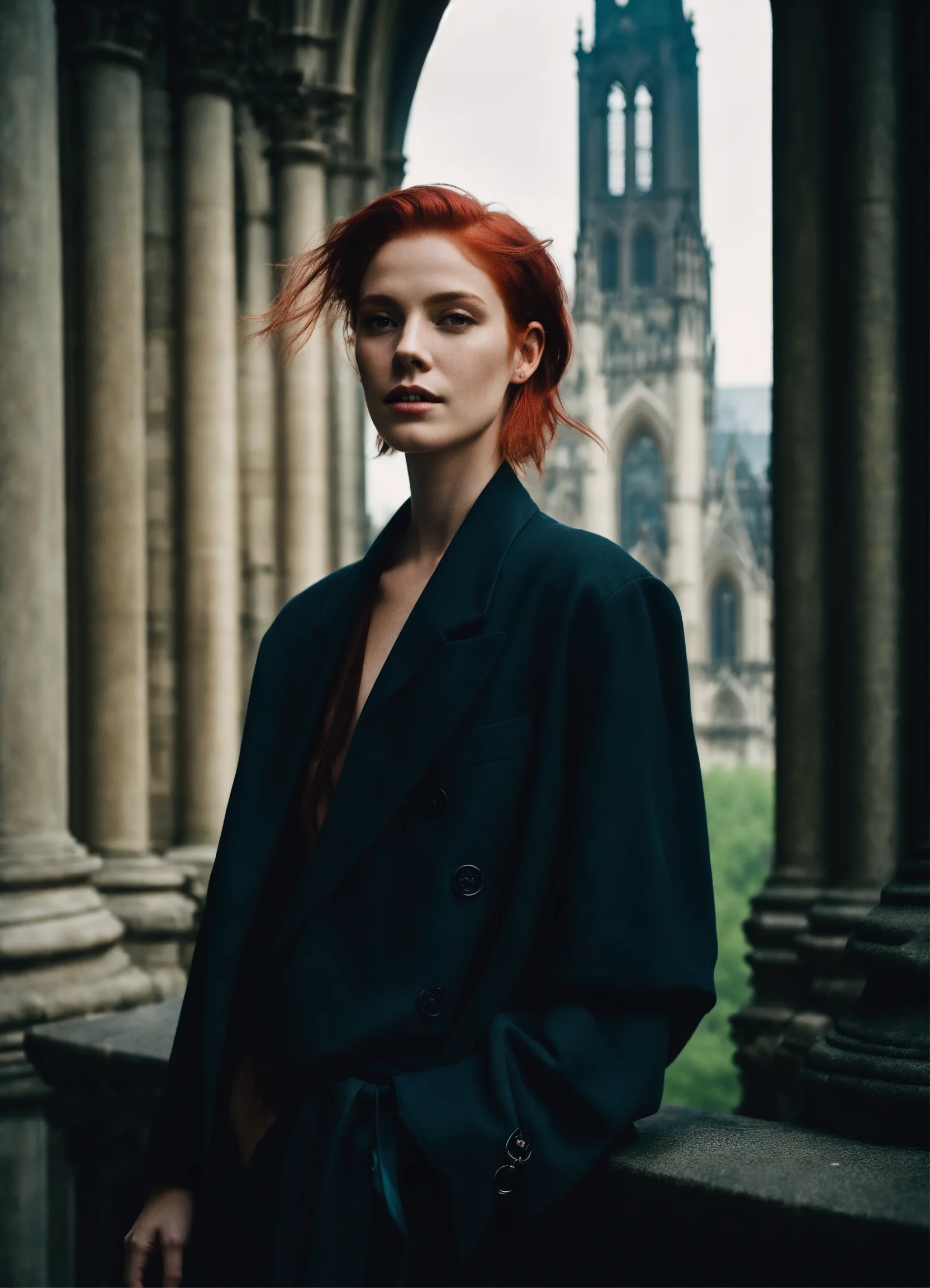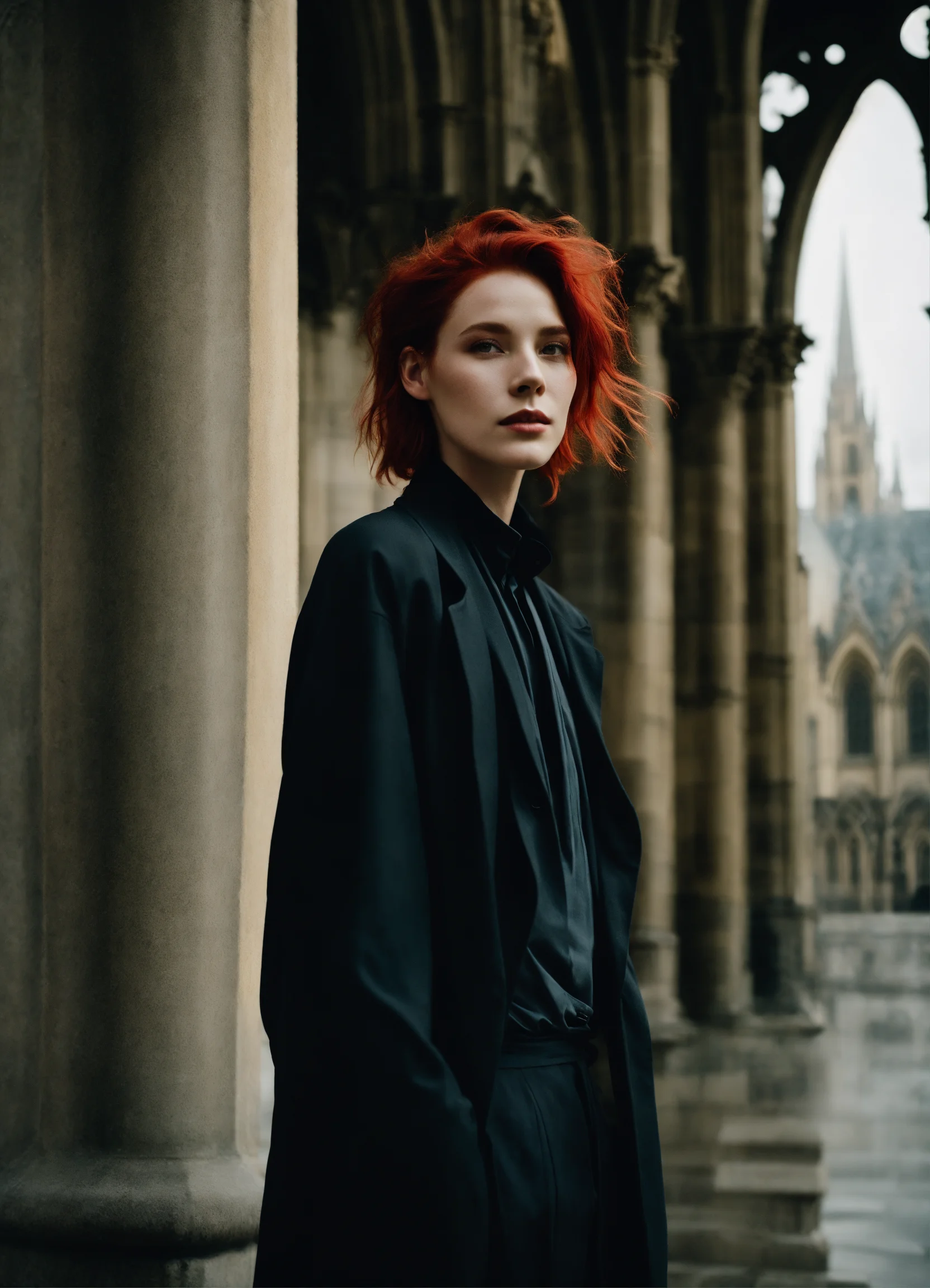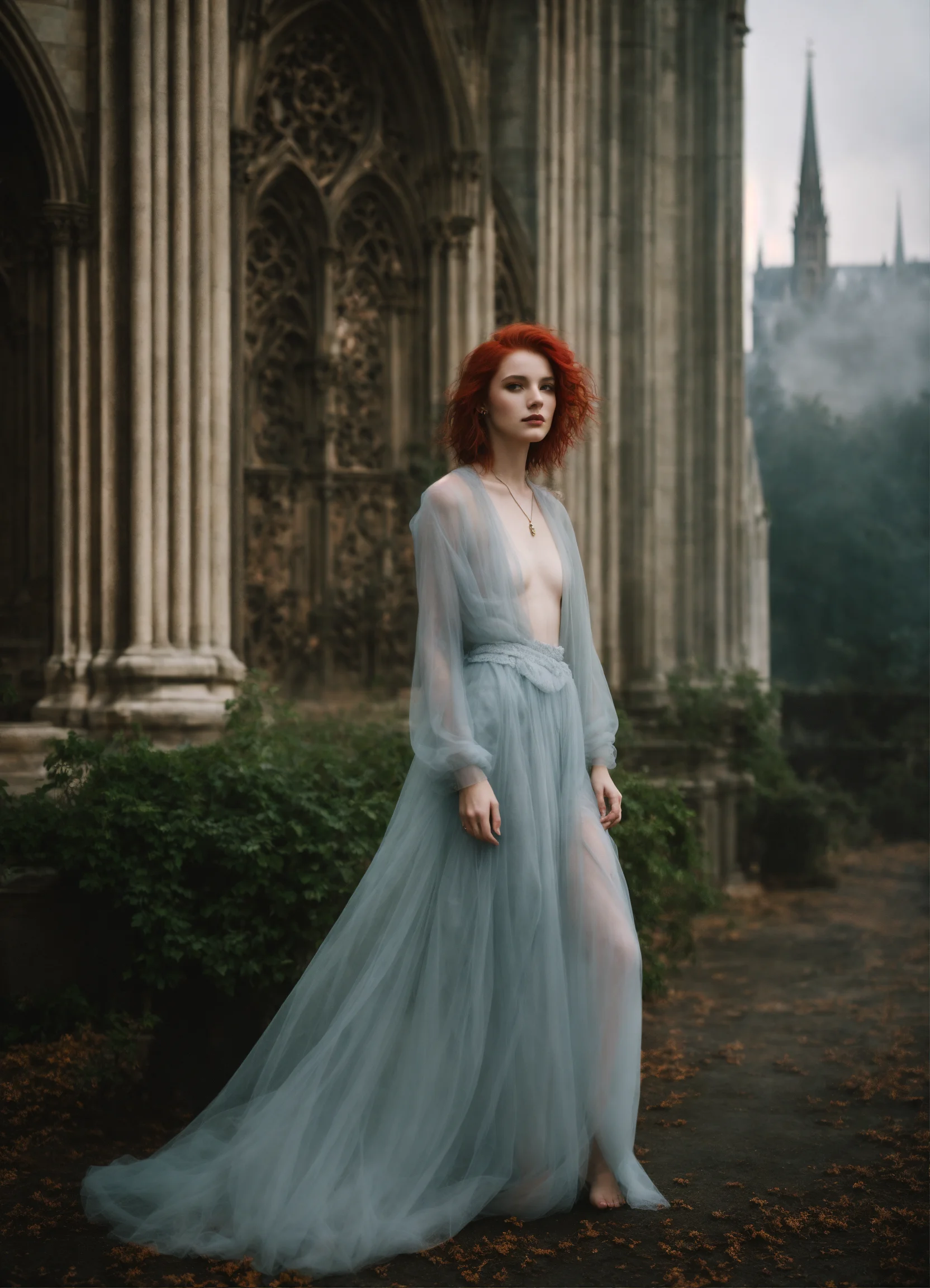 Portrait of androgynous non-binary model with pale red hair, ethereal dreamy foggy, photoshoot by annie leibovitz, editorial fashion magazine photoshoot, fashion poses, in front of gothic cathedral architecture. kinfolk magazine. film grain. a soft smile