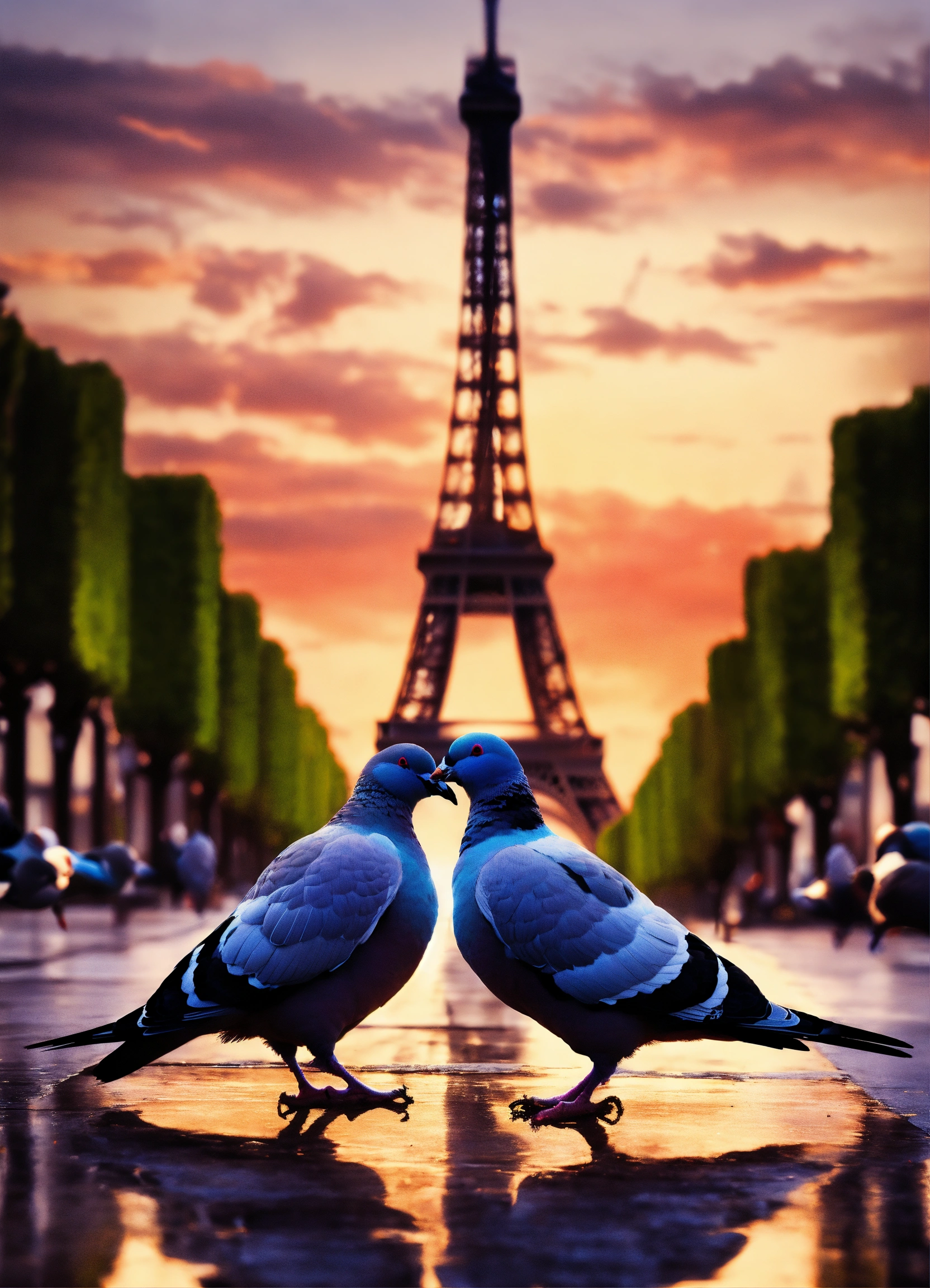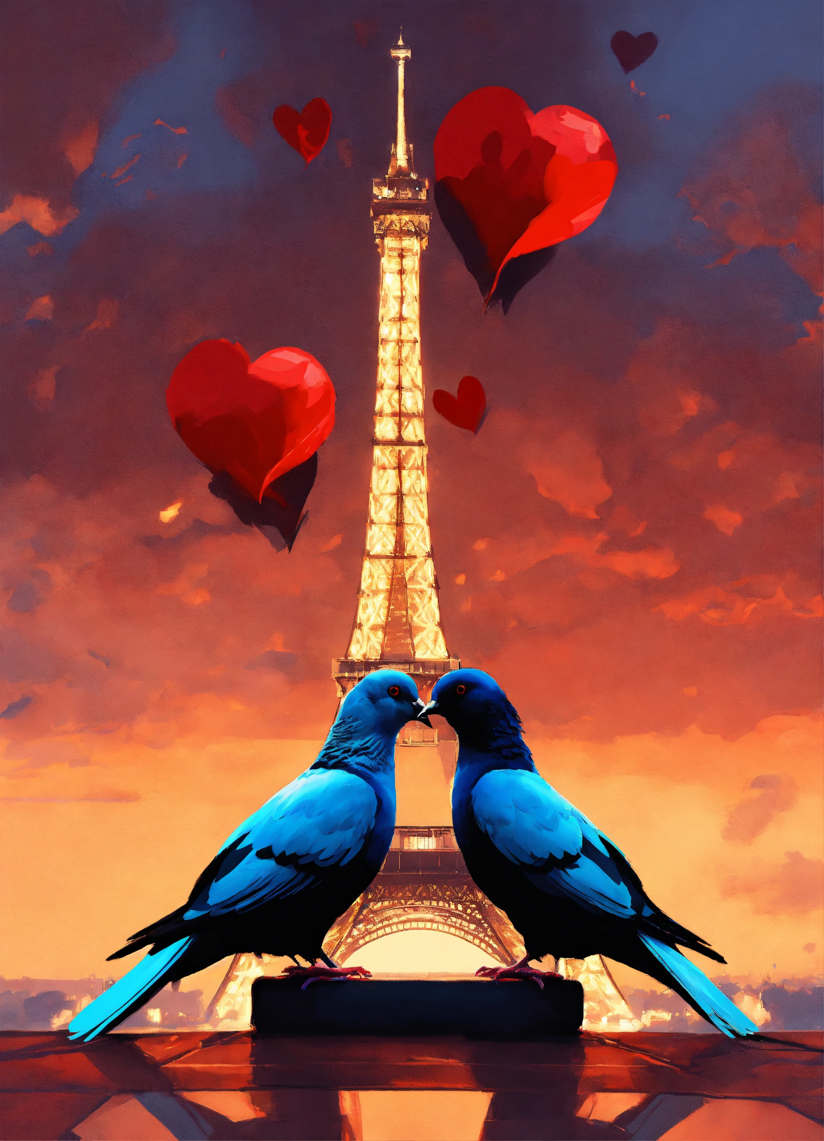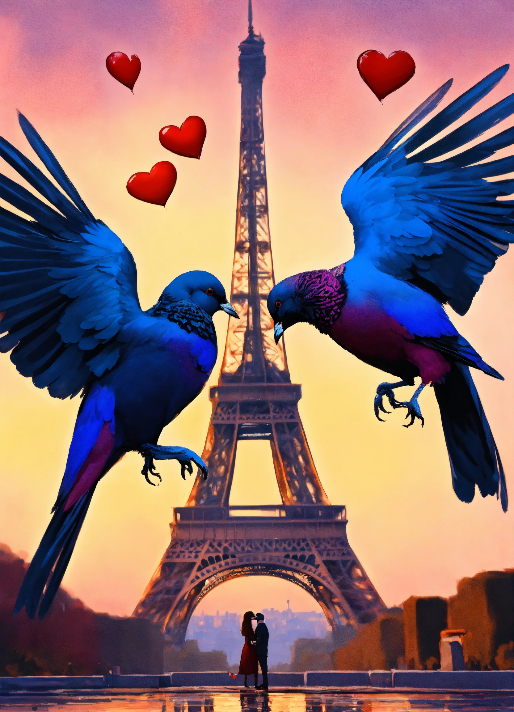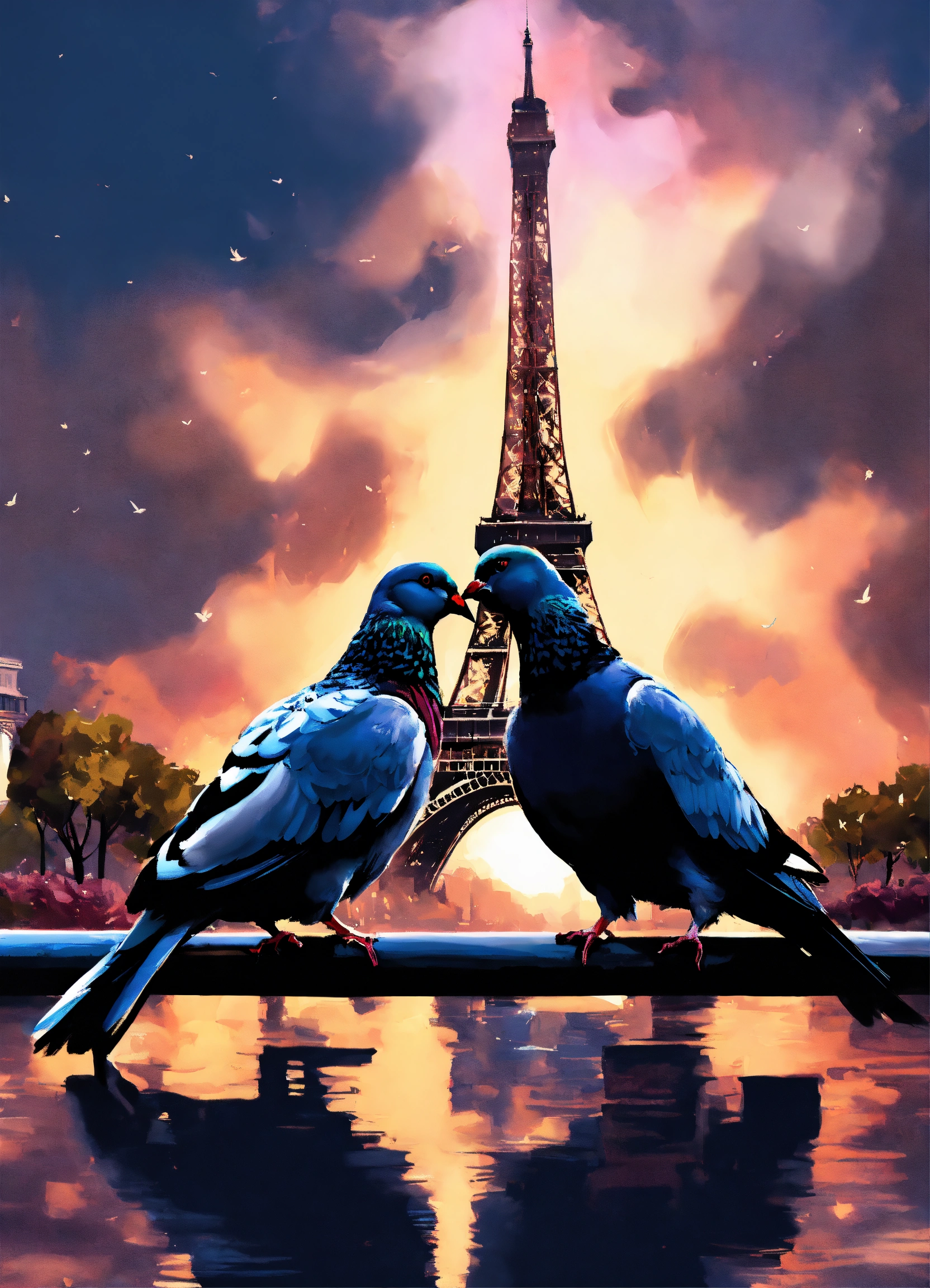 2 pigeons kiss each other forming a heart in front of the eiffel tower, digital art painting by greg rutkowski