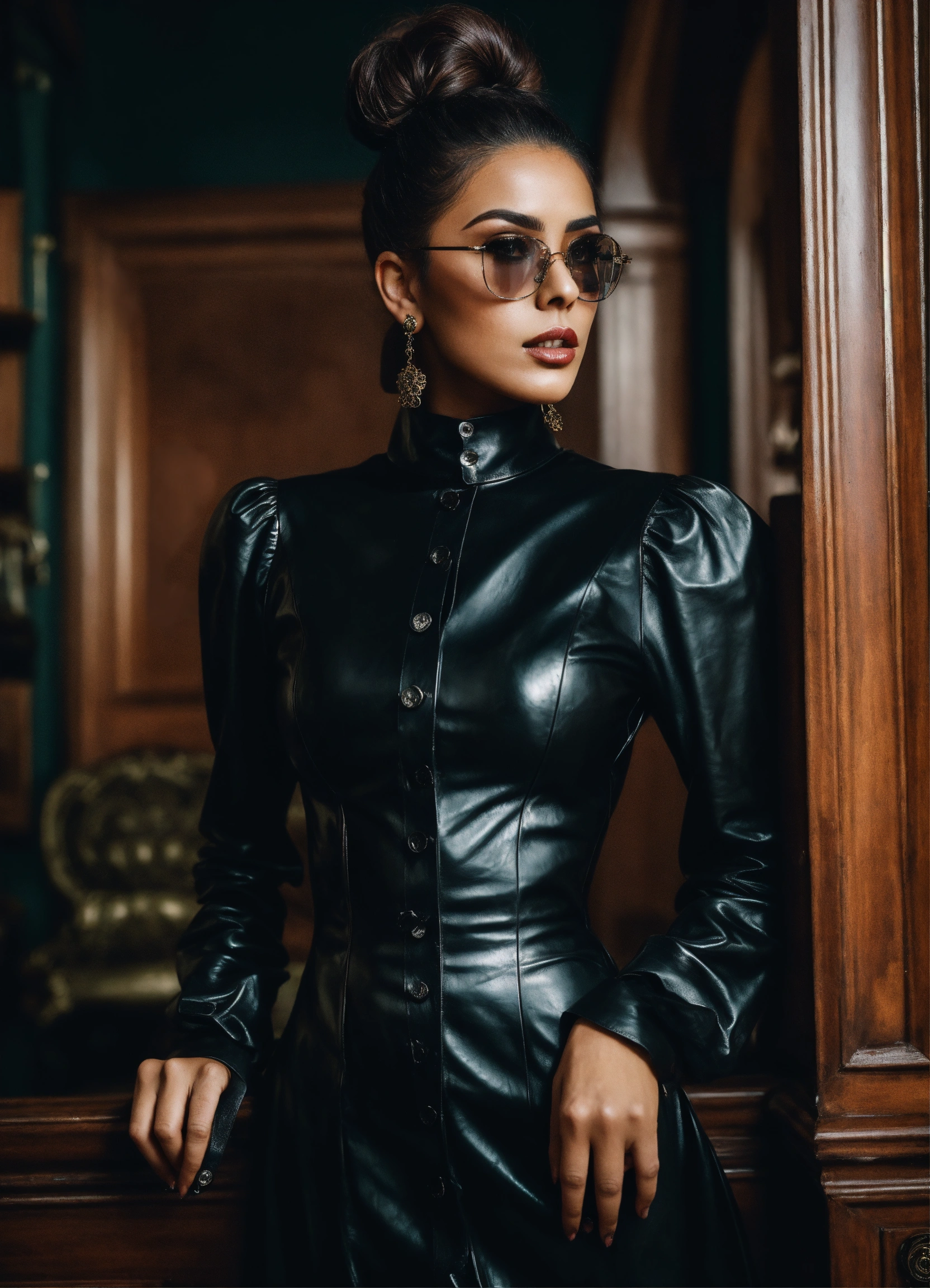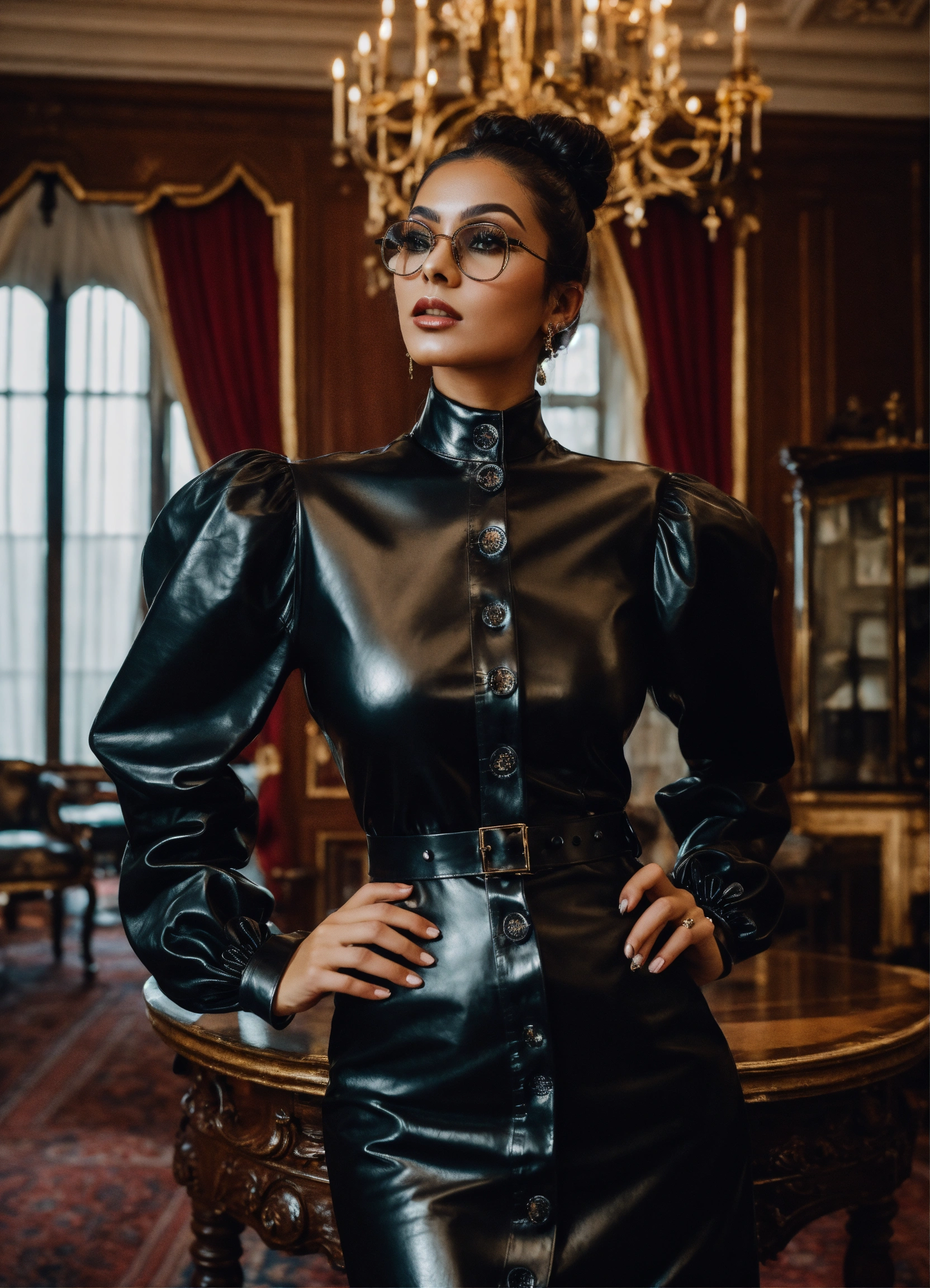 Worm's eye view, stunning female arab model, strict looking, glasses, hair bun, black victorian governess shiny leather dress with big buttons, big long puff sleeves, shirt collar, mansion room