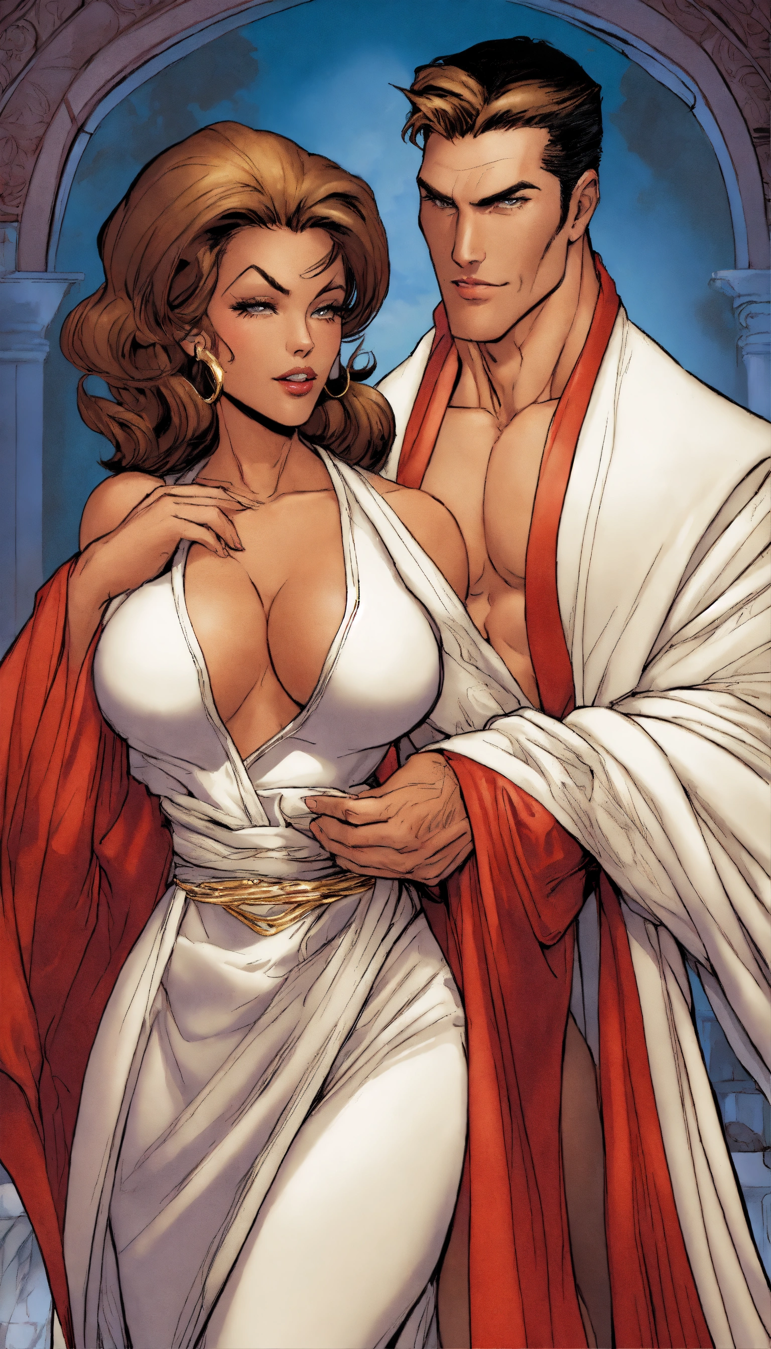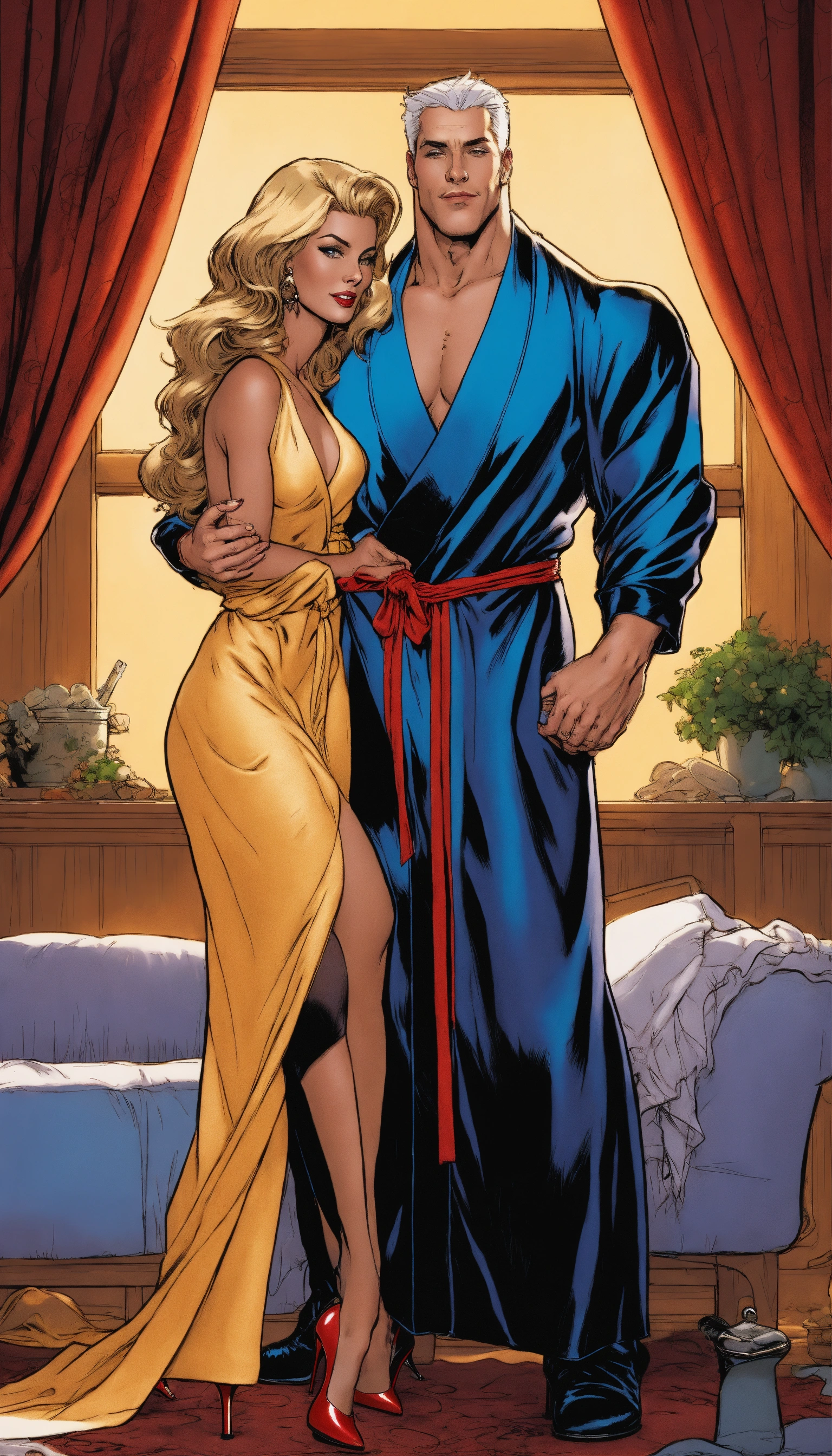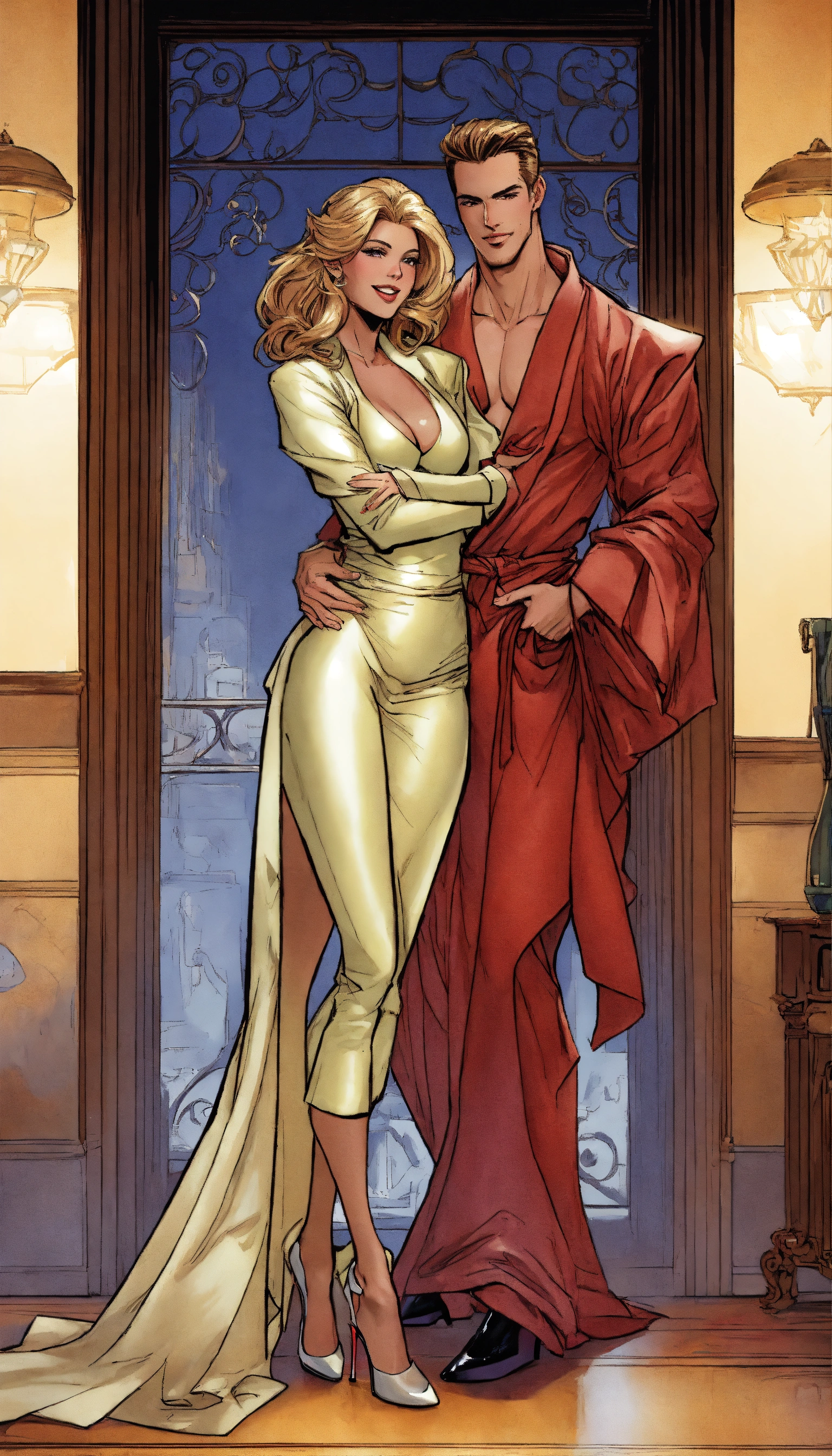 Older angela as a housewife, wearing a silk robe and louboutin stiletto high heels, hugged from behind by her handsome son, art by j. scott campbell, art by todd mcfarlane