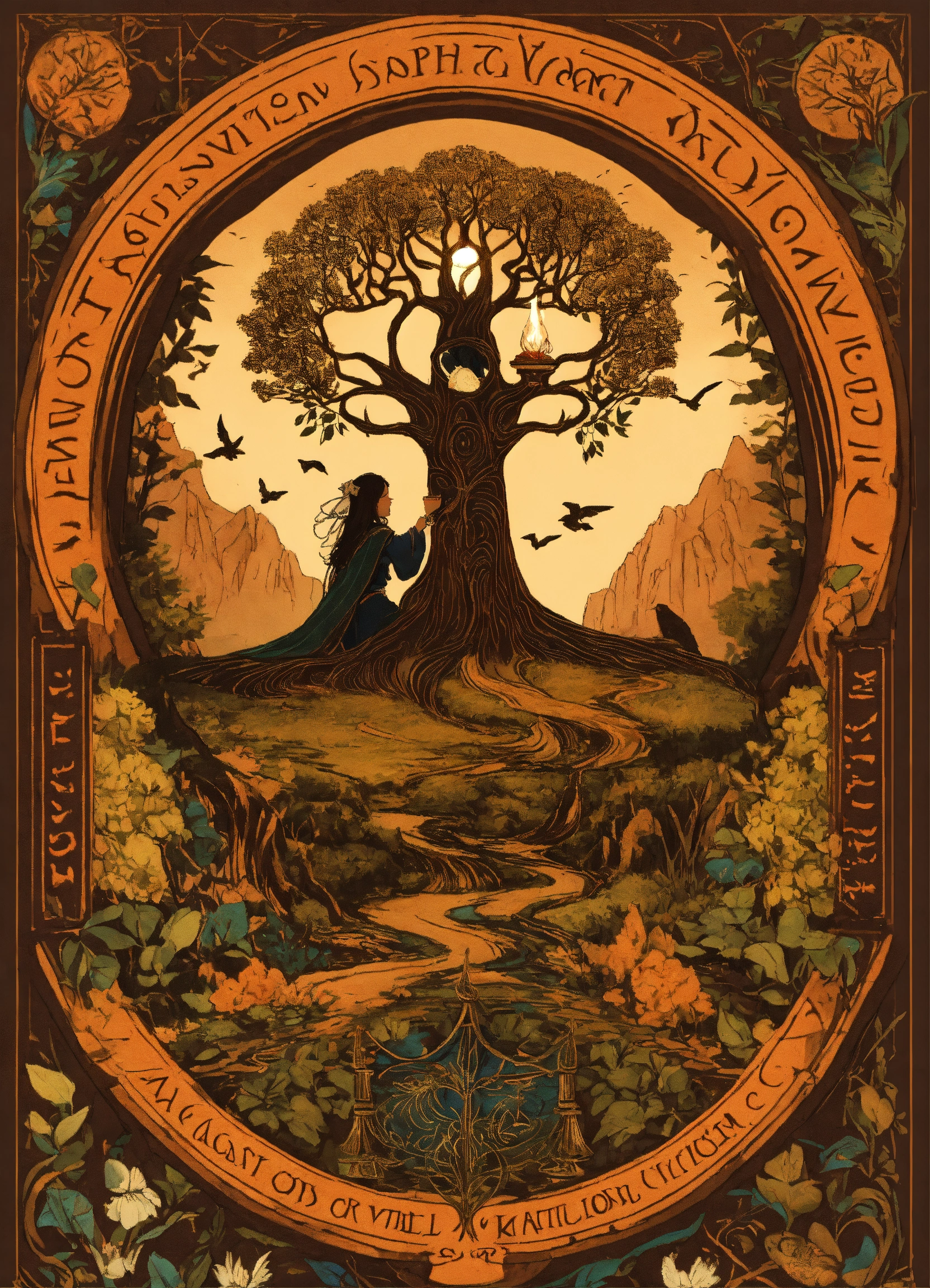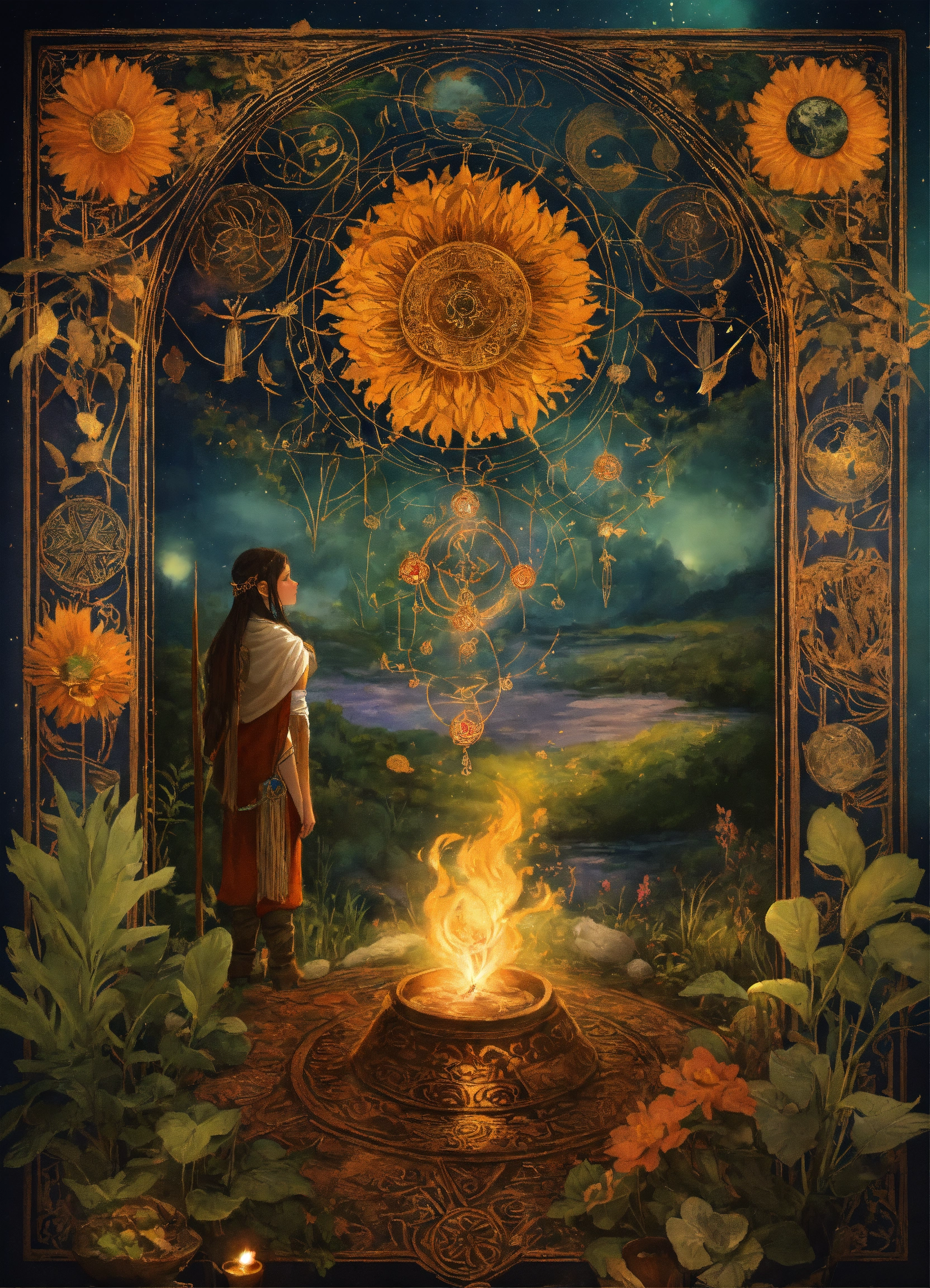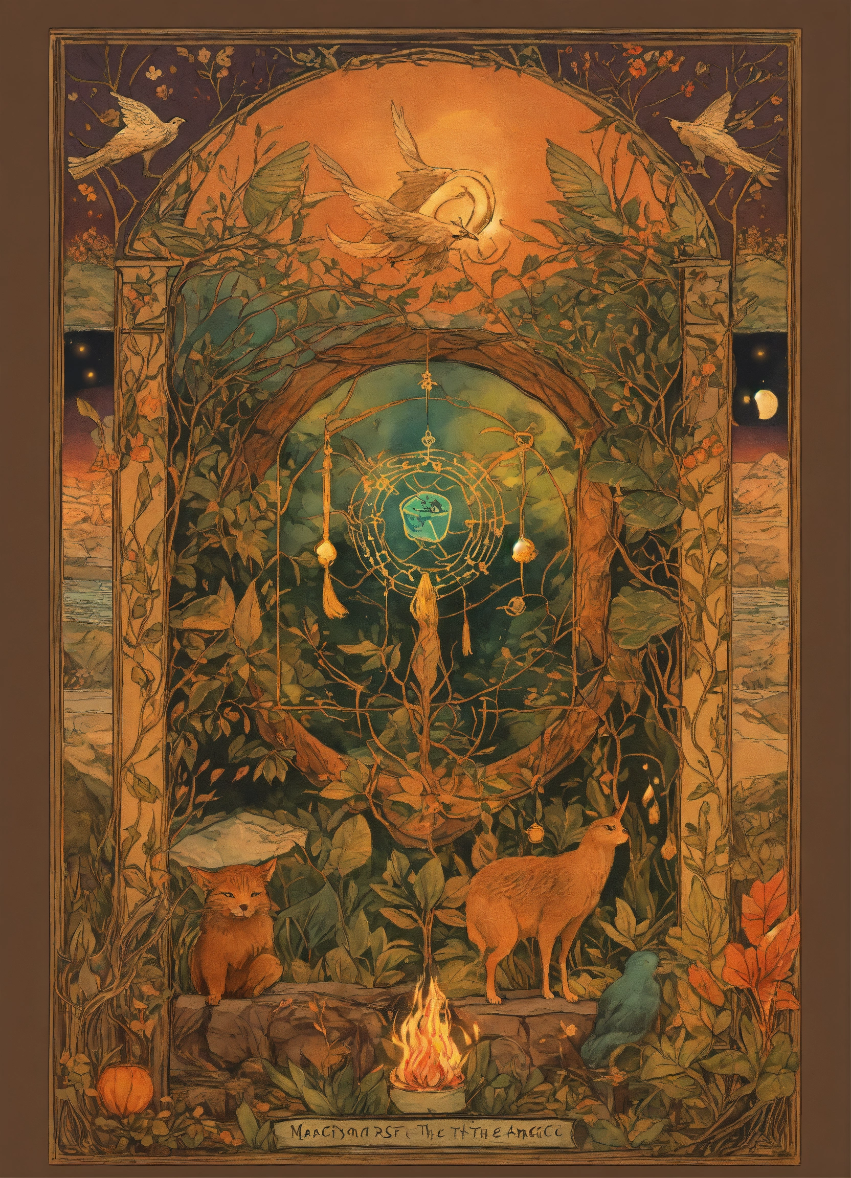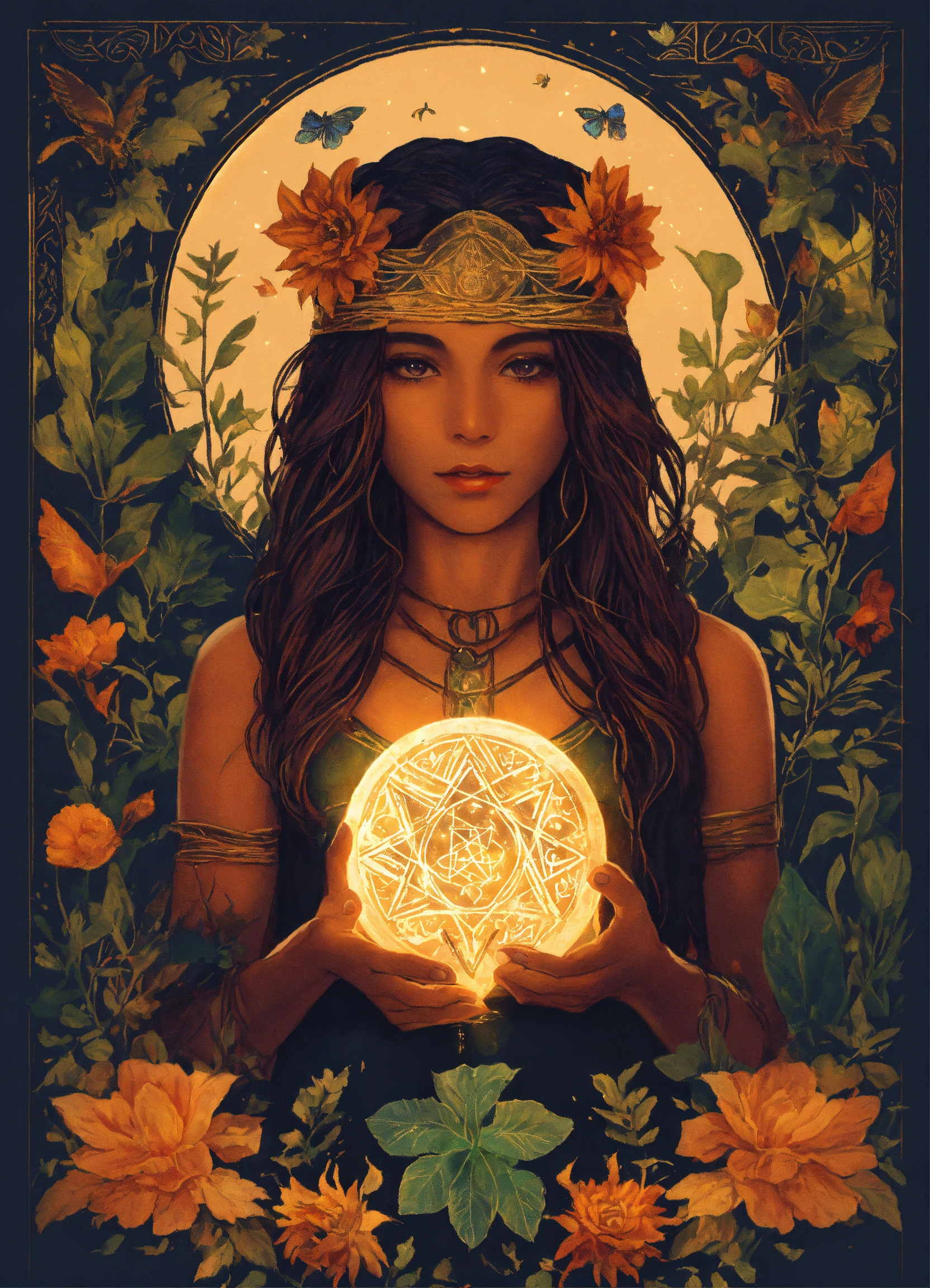 "design an image that captures the essence of 'the path of ancestral magic and folk witchcraft.' incorporate elements of ancient wisdom, mystical arts, and the connection with nature and the spirit world. use symbolism and imagery that evoke a sense of magic, empowerment, and spiritual evolution. remember to keep the design visually appealing and engaging."