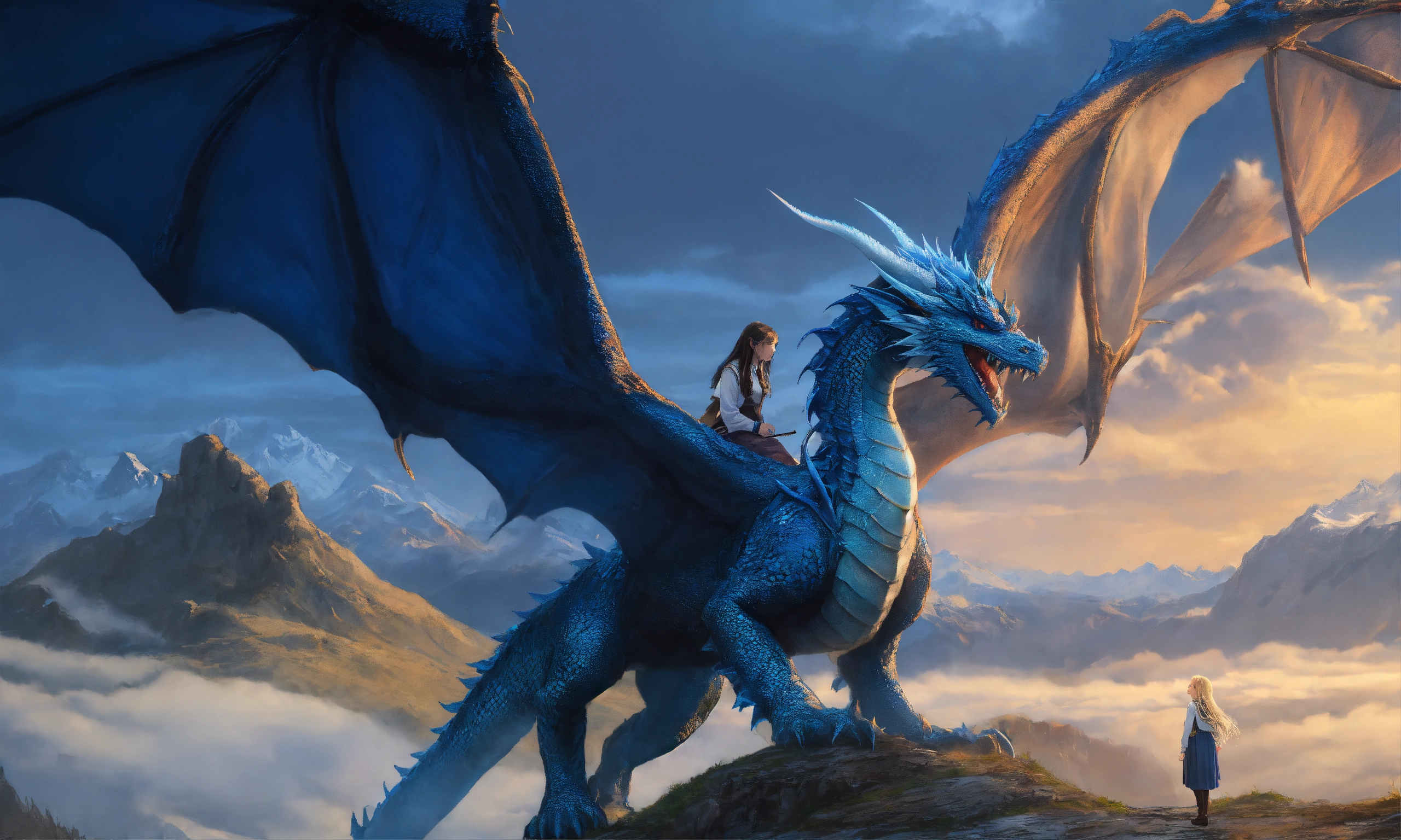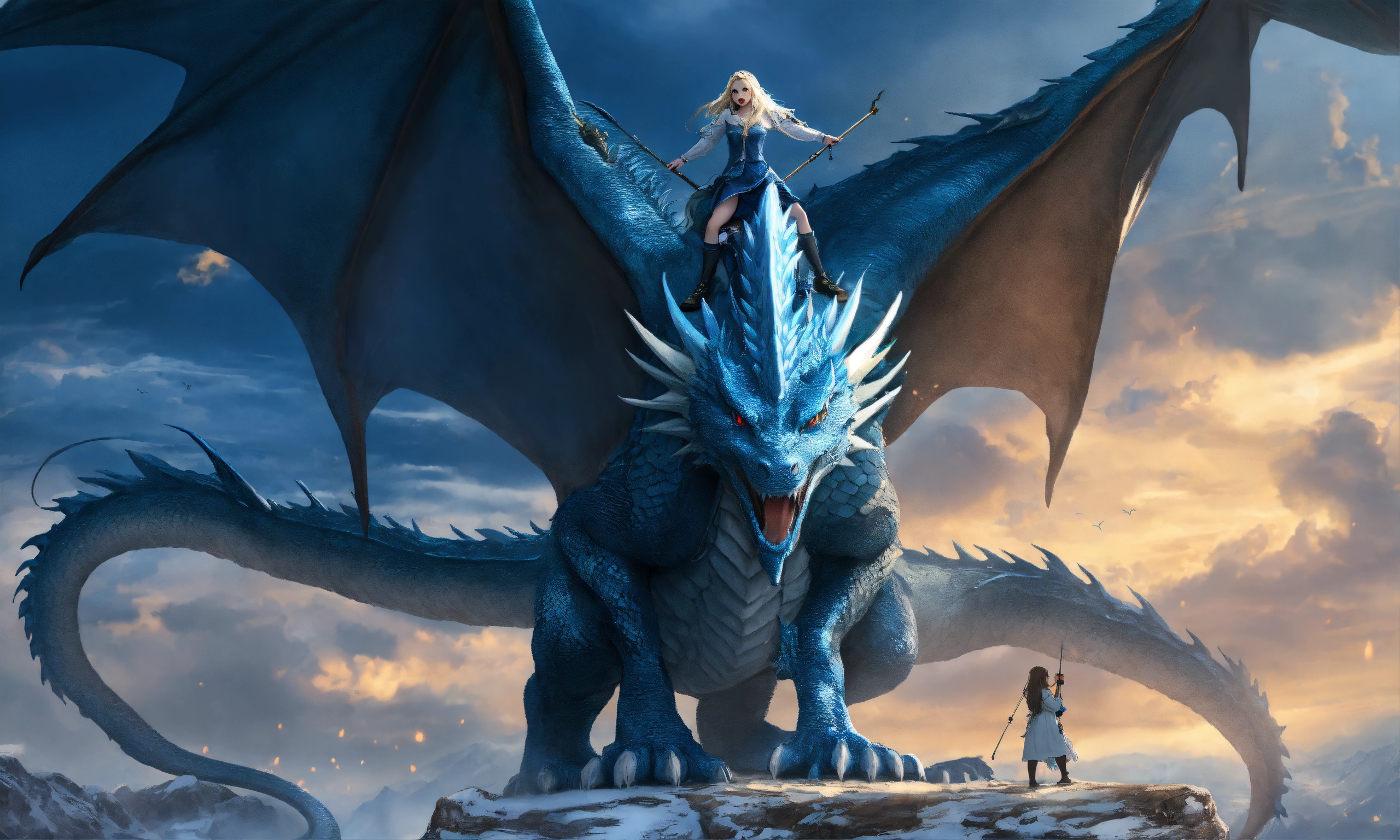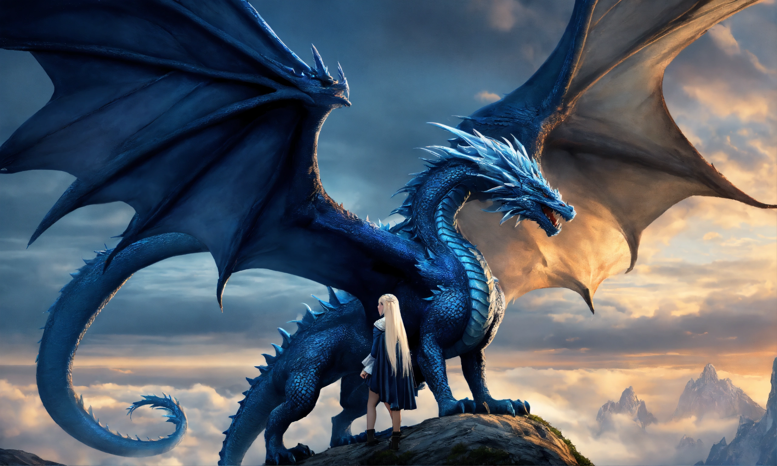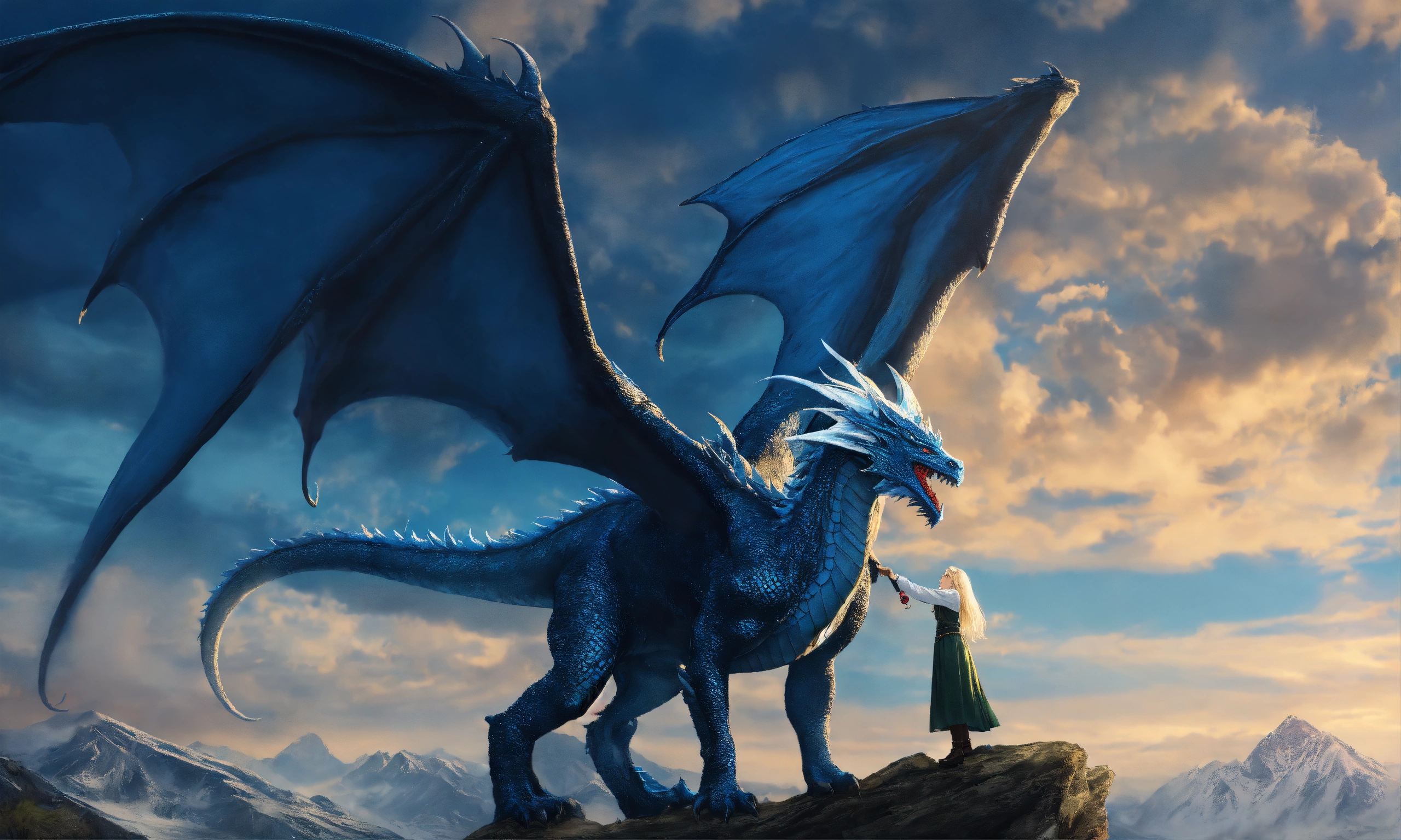 Terrifying giant blue dragon with a beautiful 15 year old whiteblond elvish girl which is hugging the dragons head, the dragon's head is as big as the entire girl, innocent, ultra detailled, ultra realistic, medieval setting