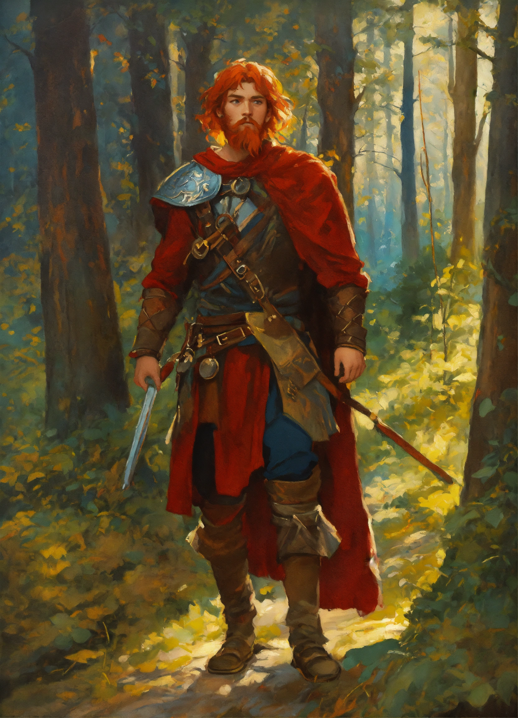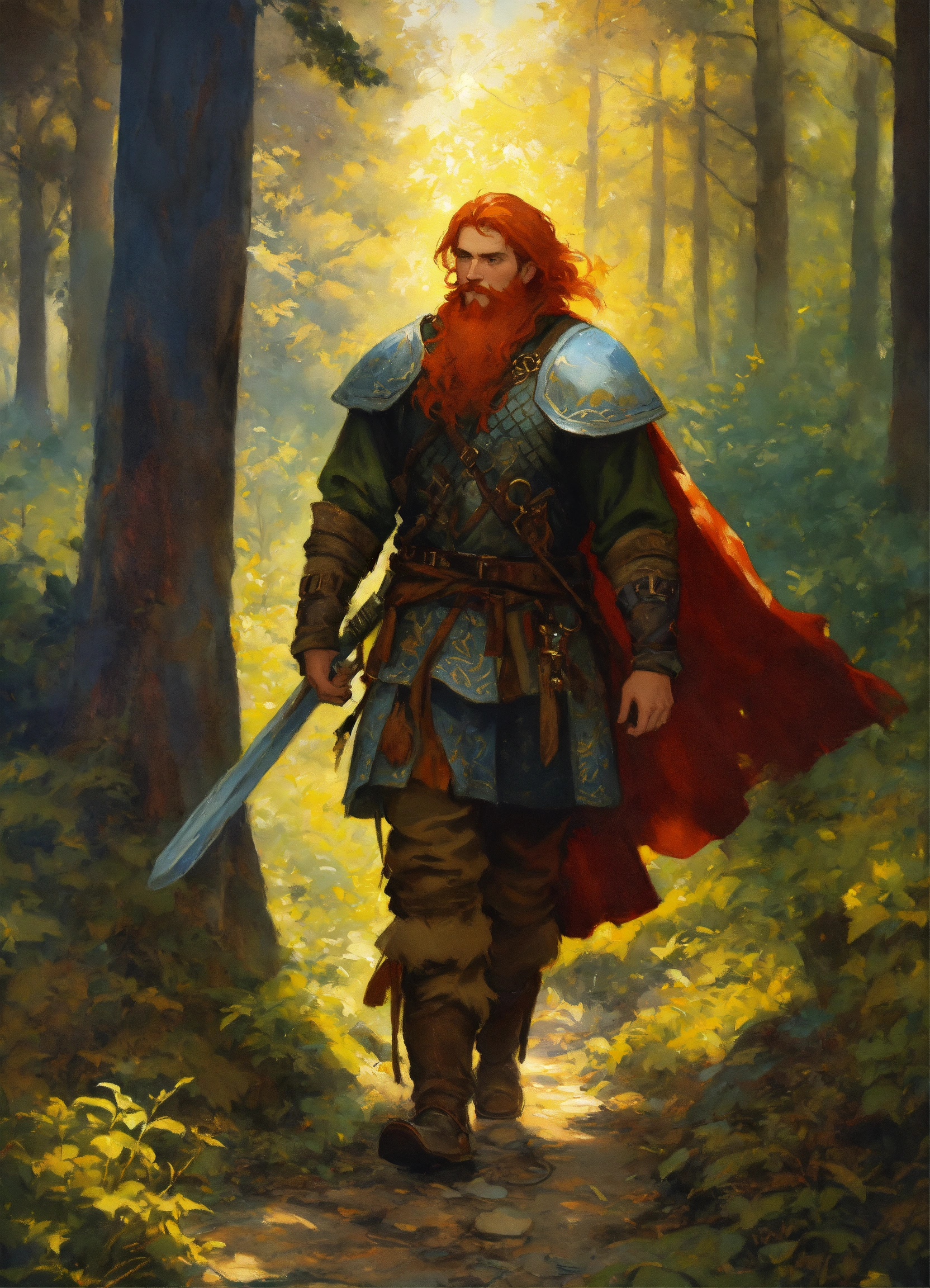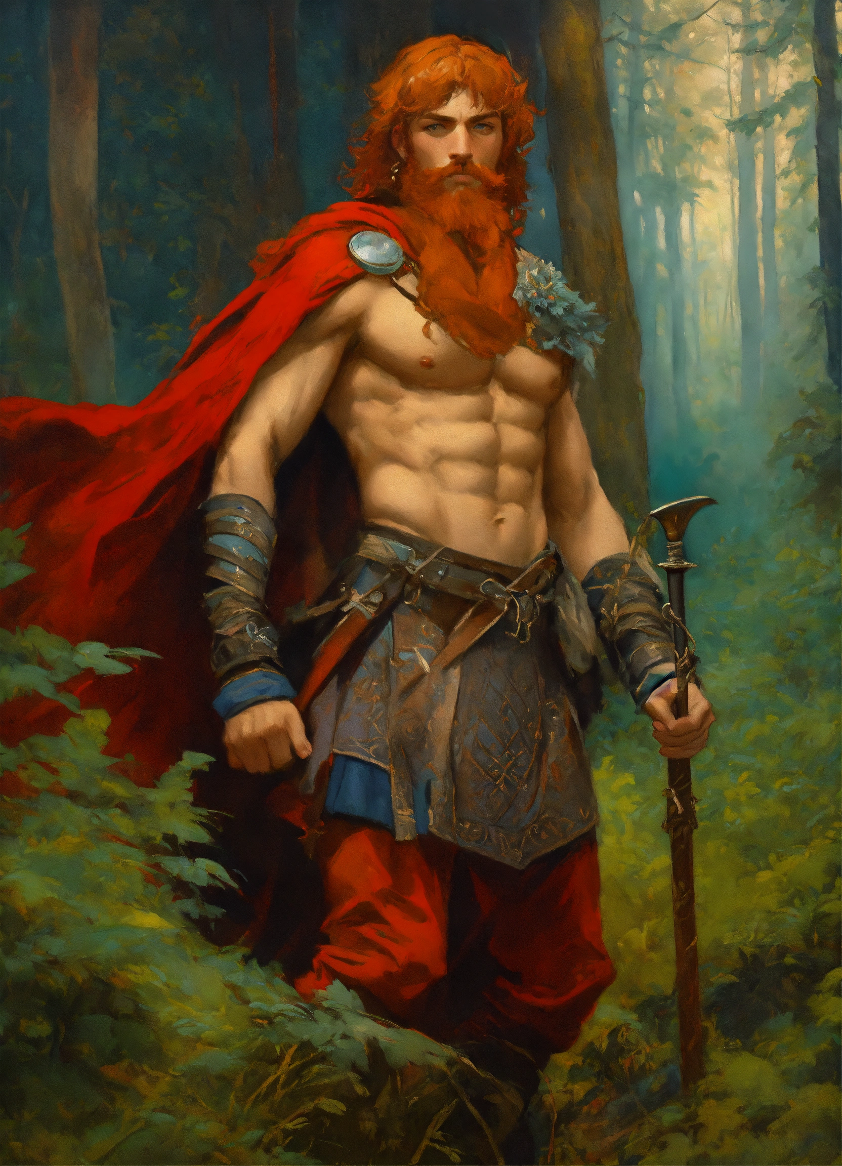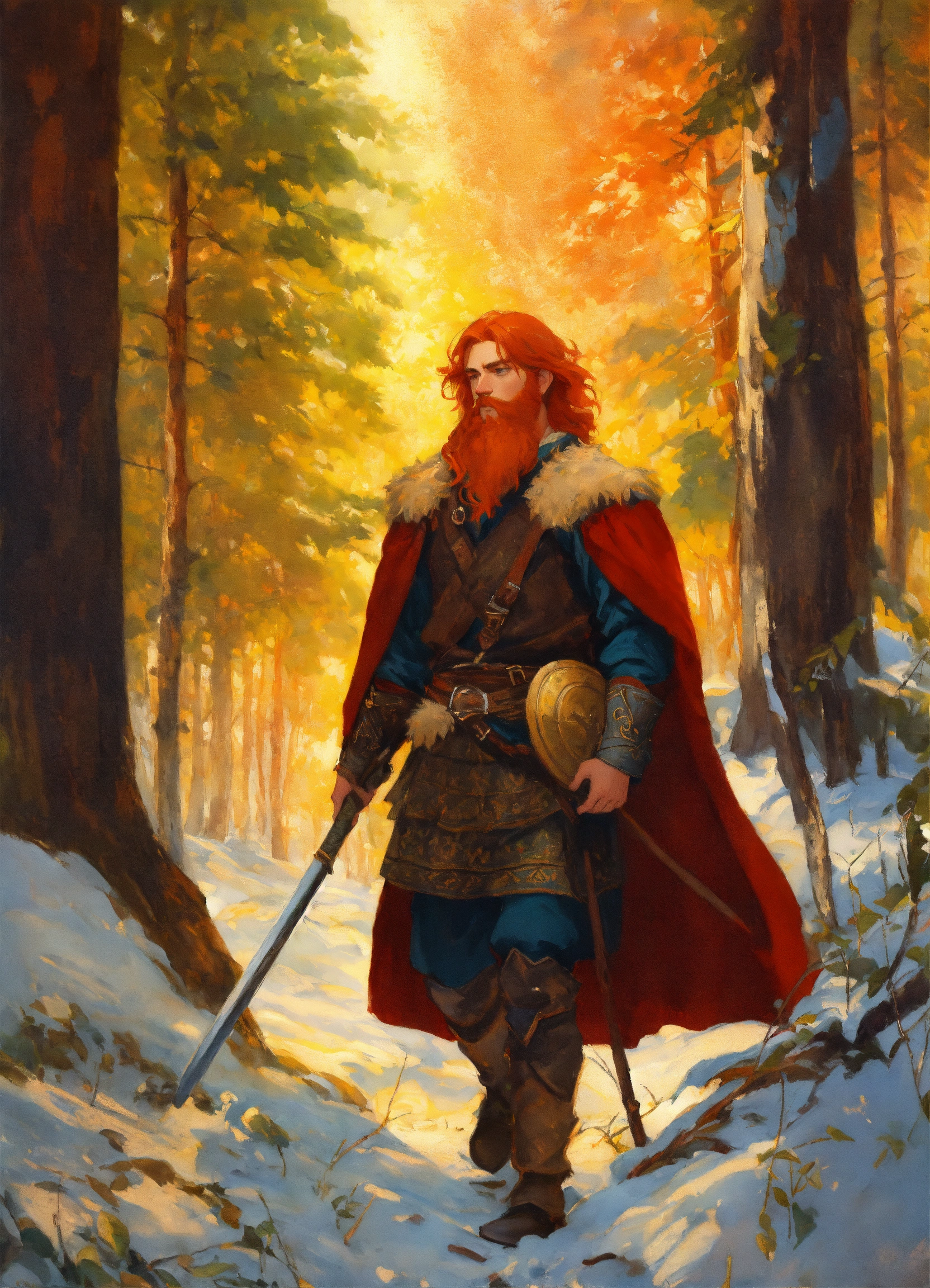 Warrior red head man, woolen torso in viking clothes, walking in the forest, oil painting, magic lights, painting by viktor vasnetsov, concept art, painting by ivan shishkin, hyperborea, beautiful, high resolution, trending on artstation