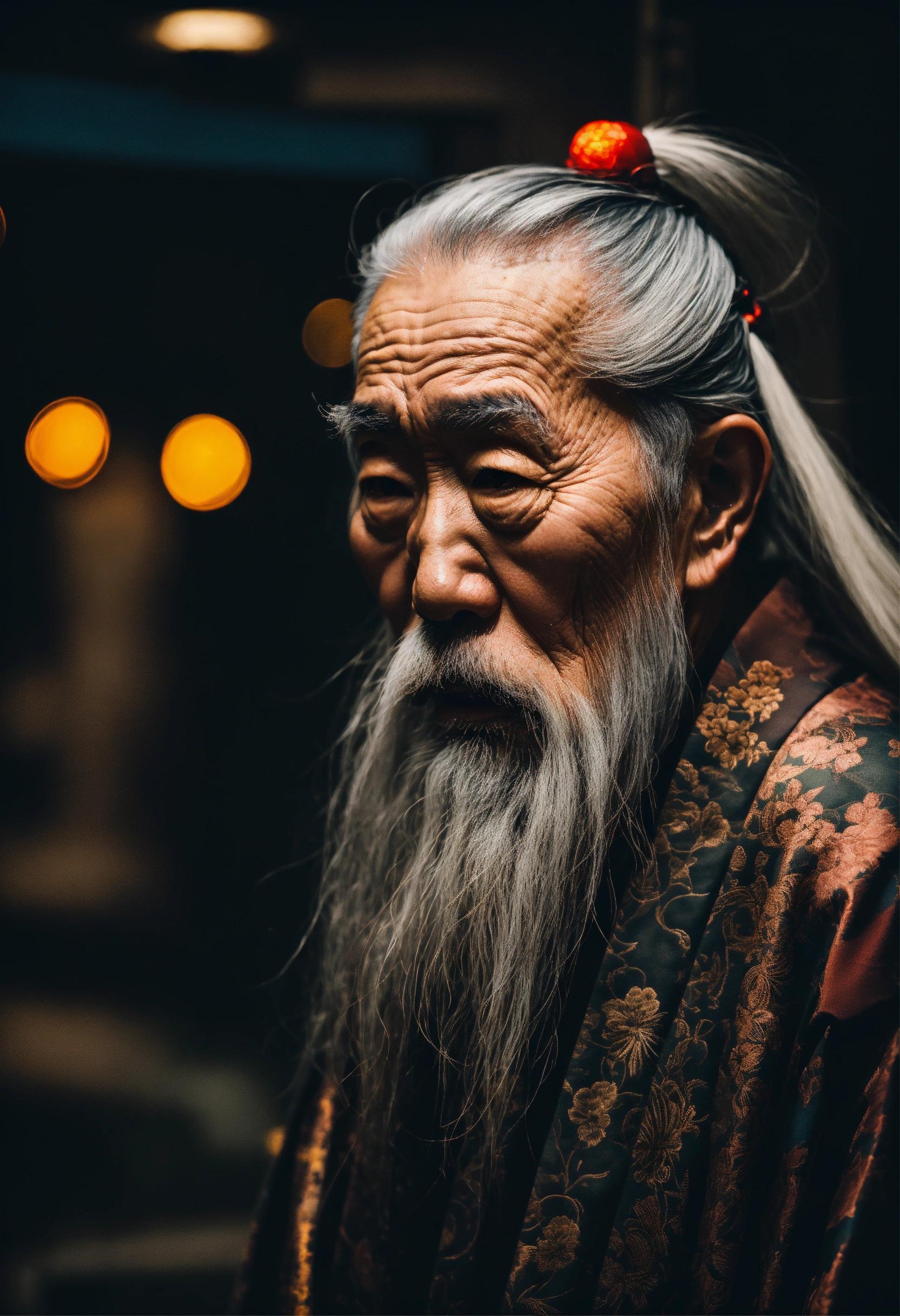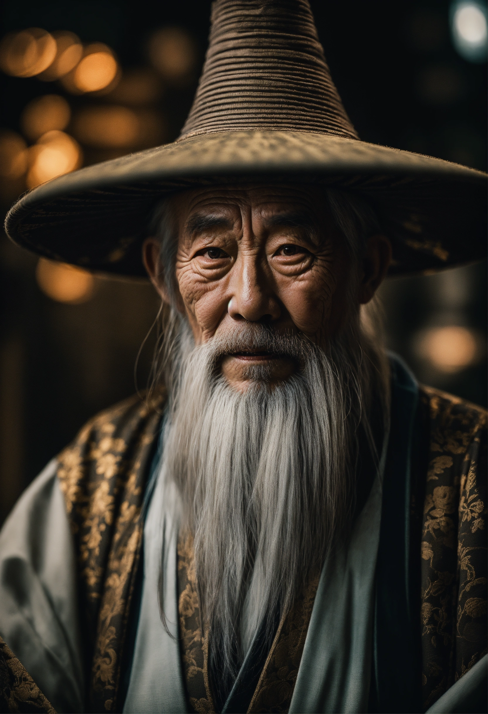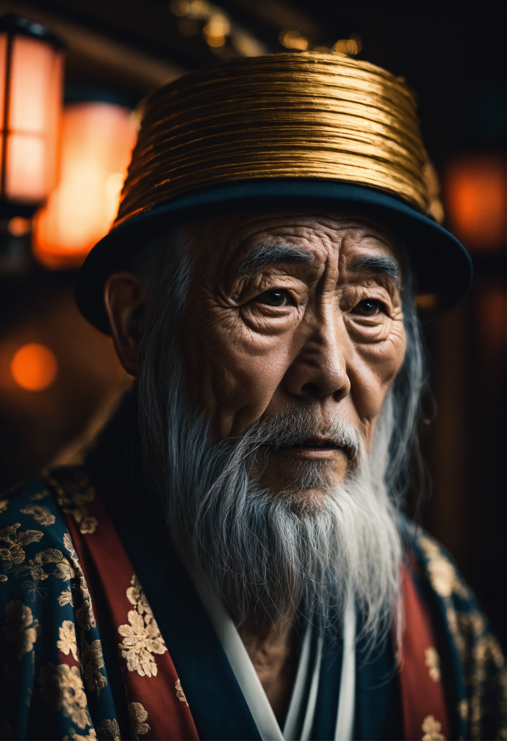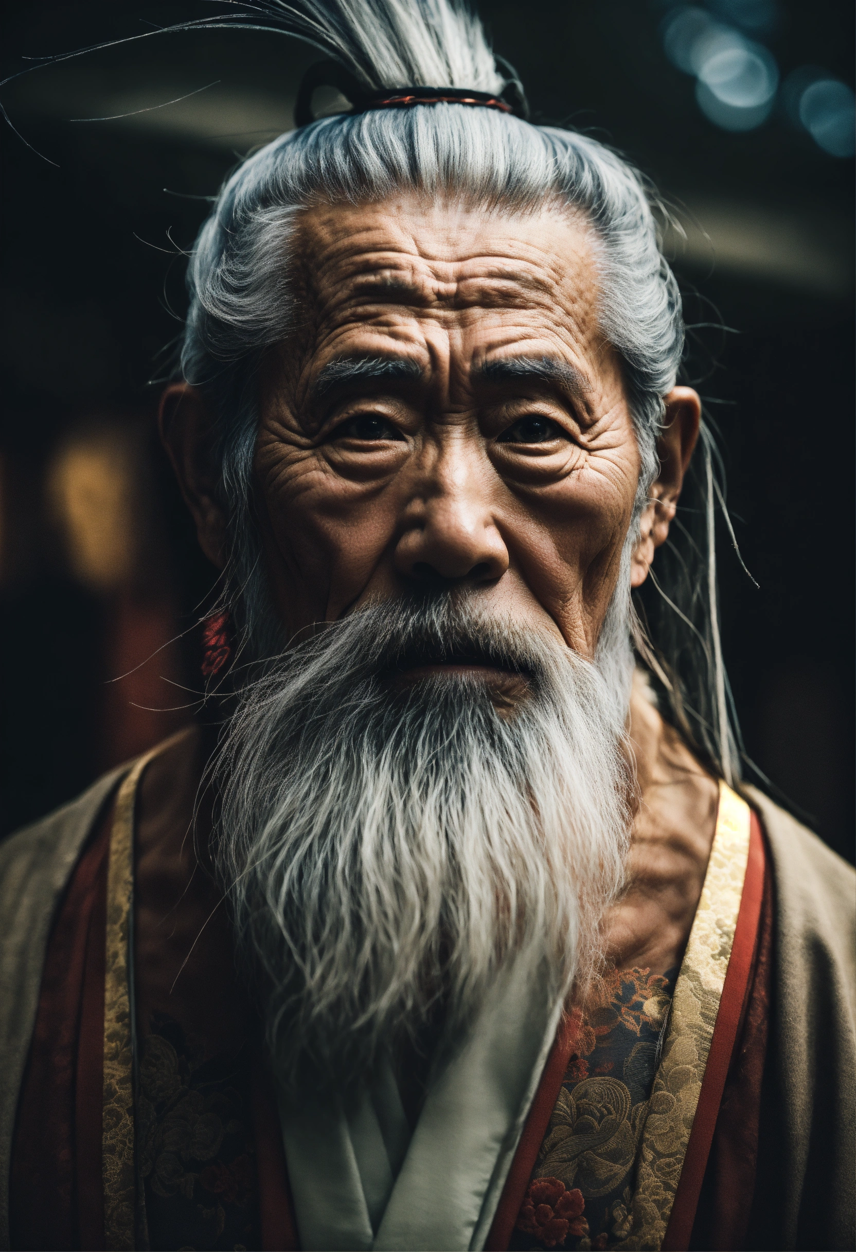 Wise old japanese man from tokyo with a long white beard, intricate, sharp focus, fantasy, cinematic lighting, other worldy, surreal 8k photo, dark moody aesthetic