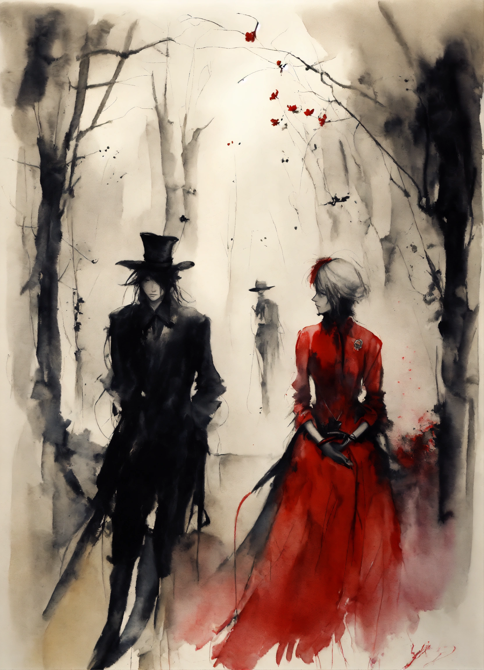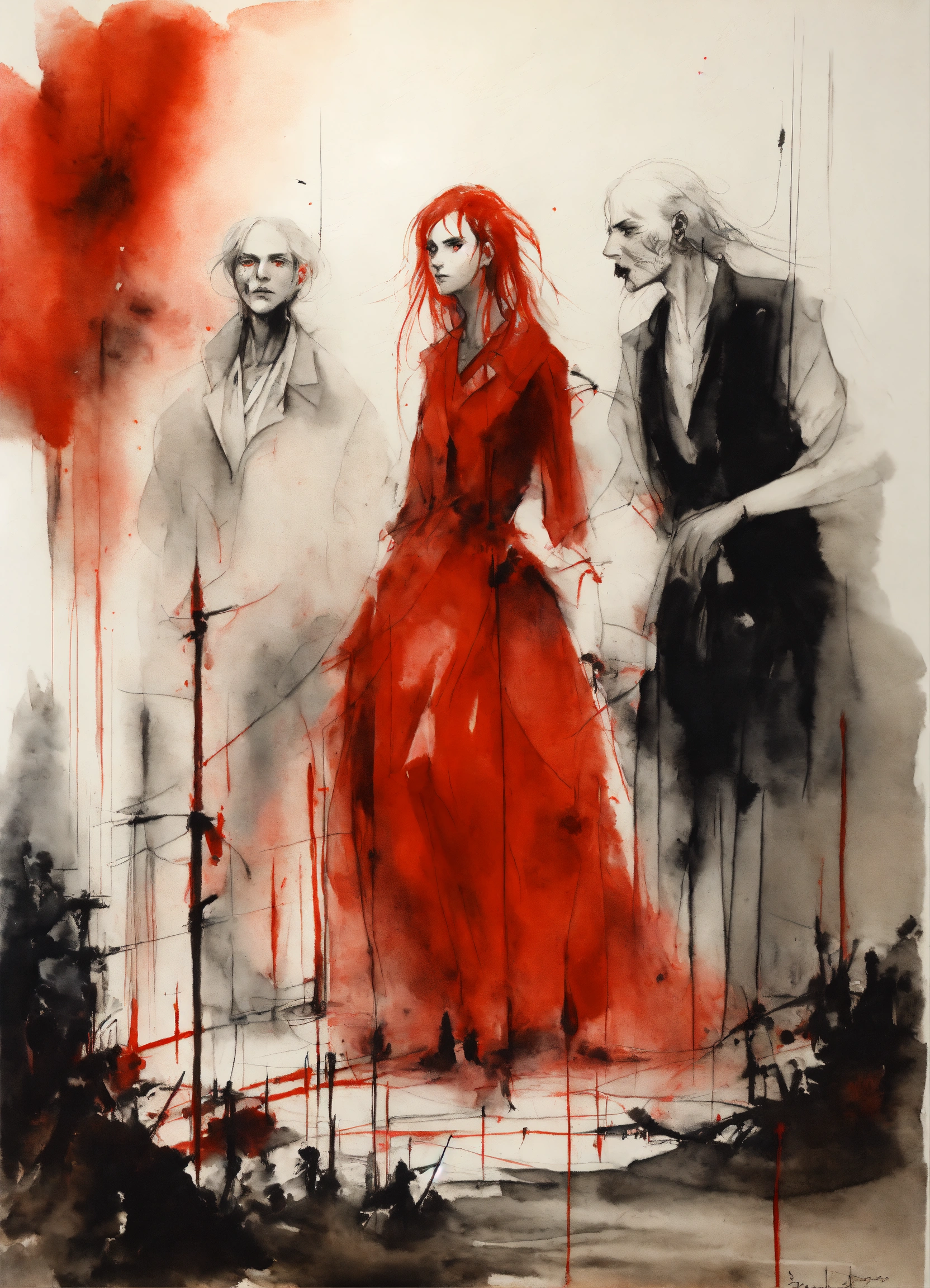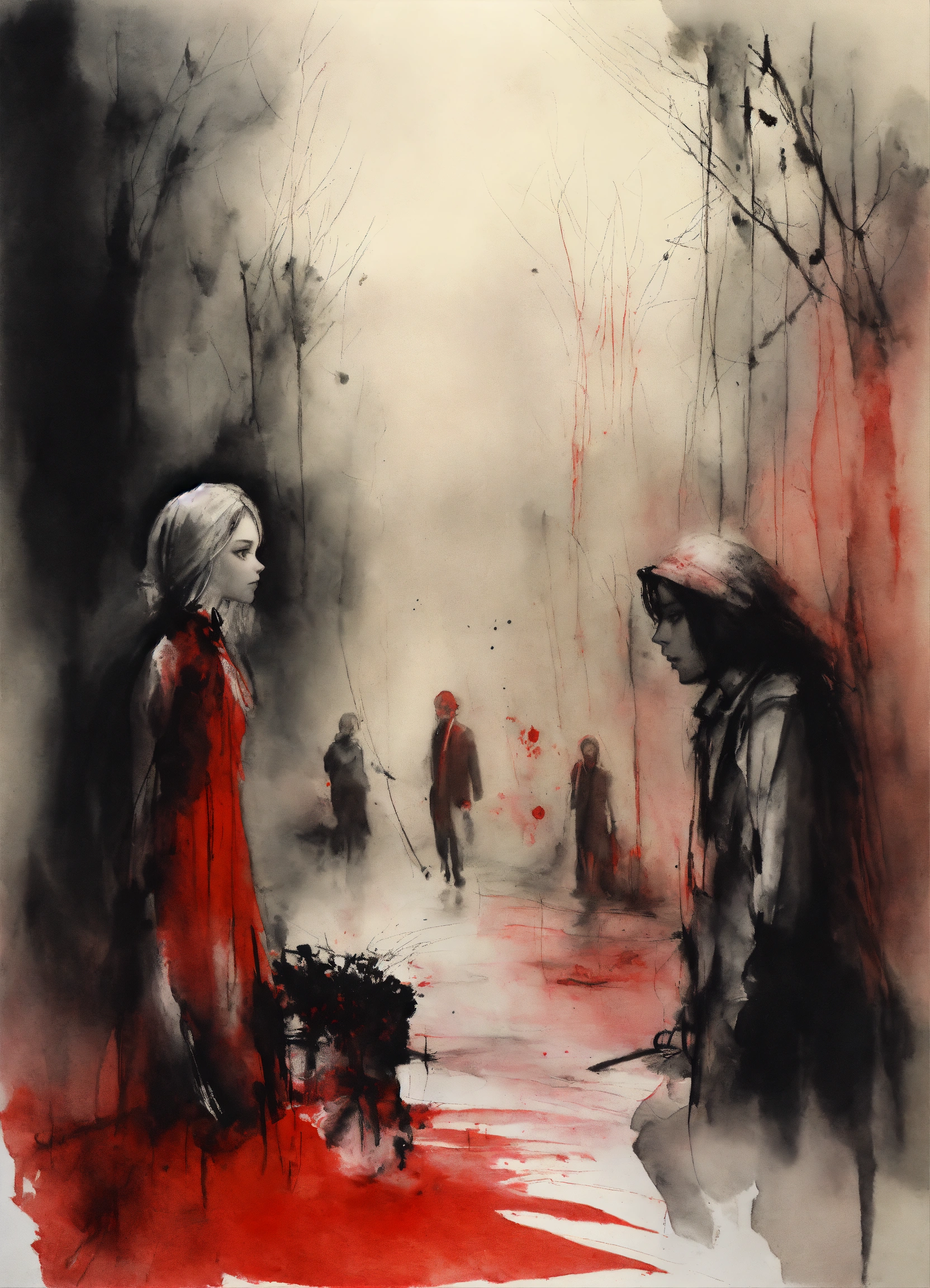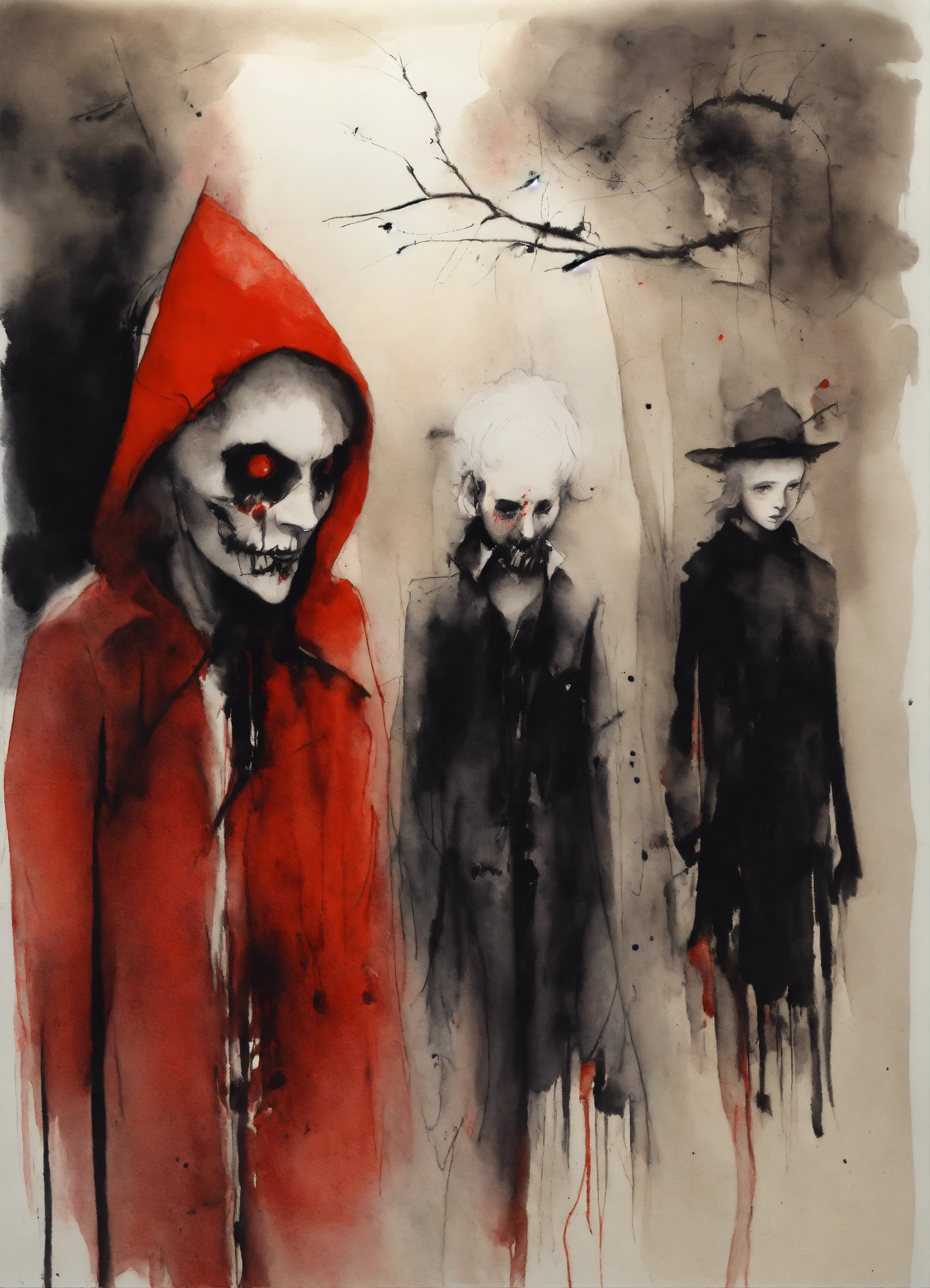 Stephen gammell style, dessin, aquarelle, aquarelles, noir et blanc et rouge, de marais, de sombres créatures, dégoulinant, three characters discussing