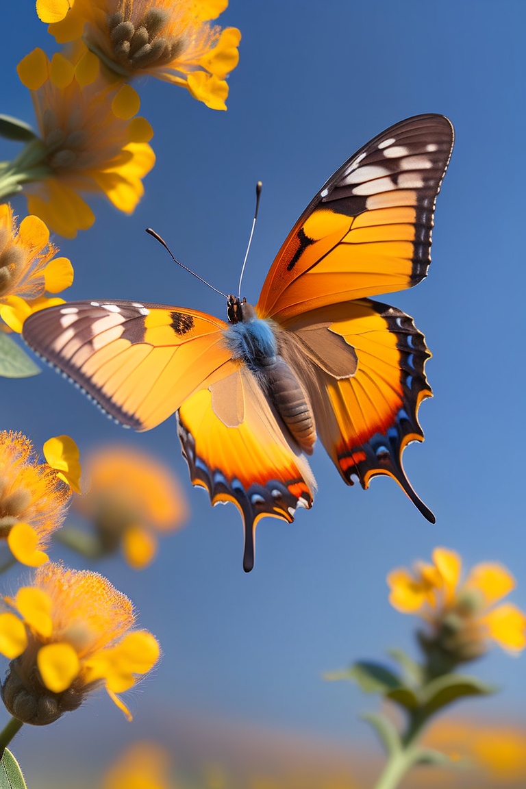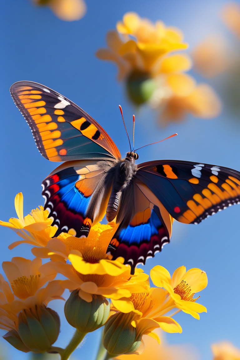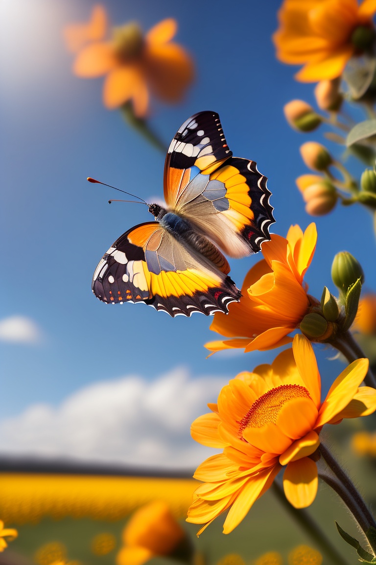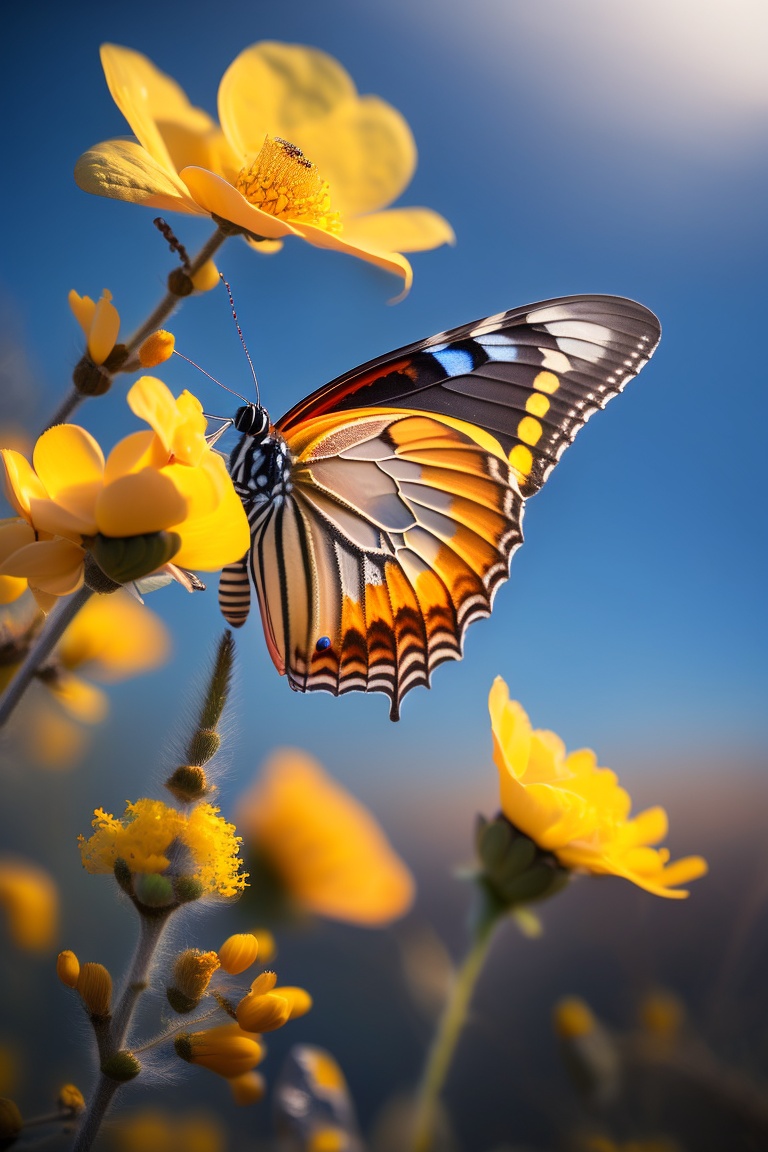 Butterfly on rapeseed flowers, macro image, wide-angle lens, blue sky, orange yellow, fuji gfx100s, 4k, details