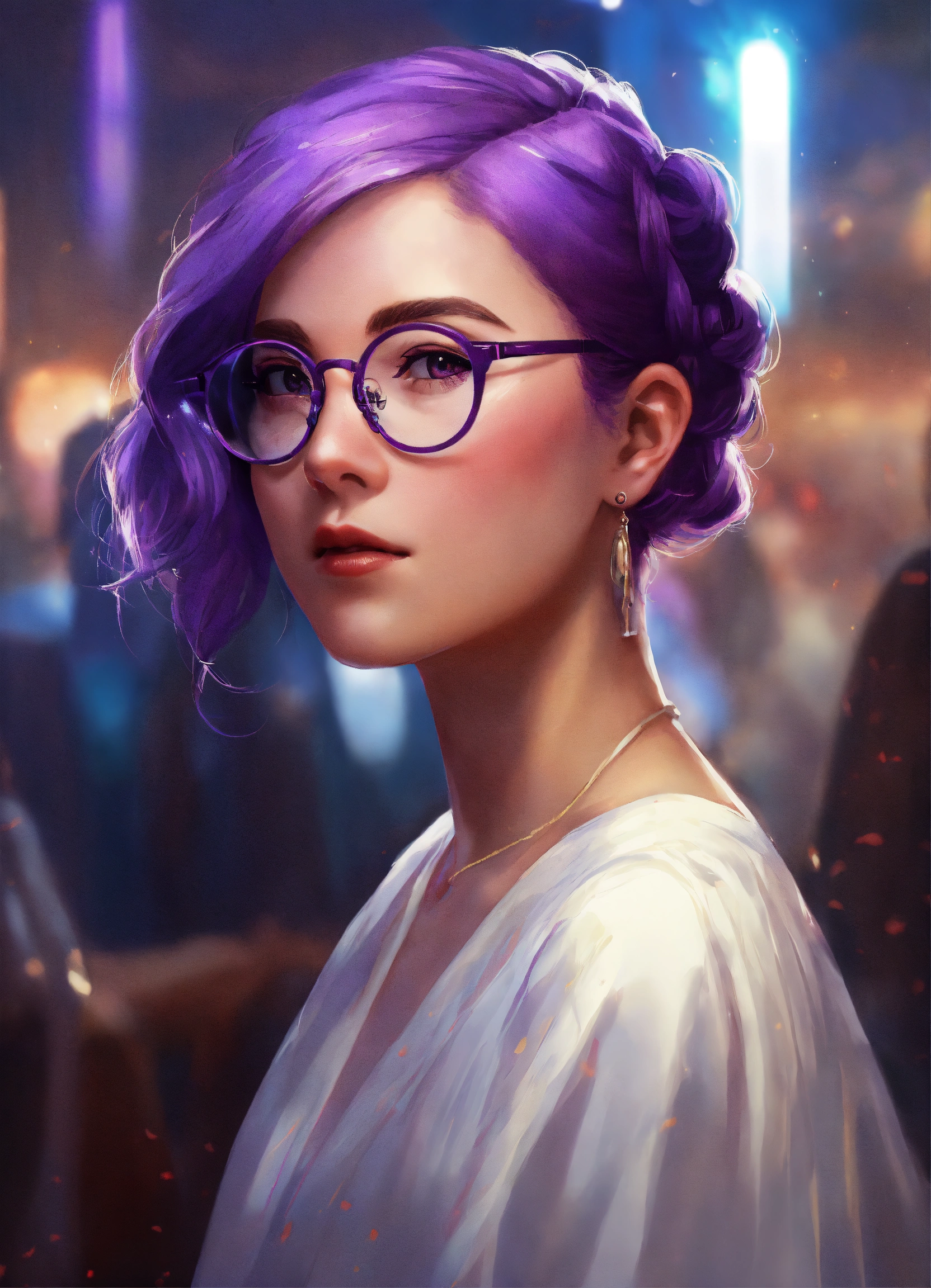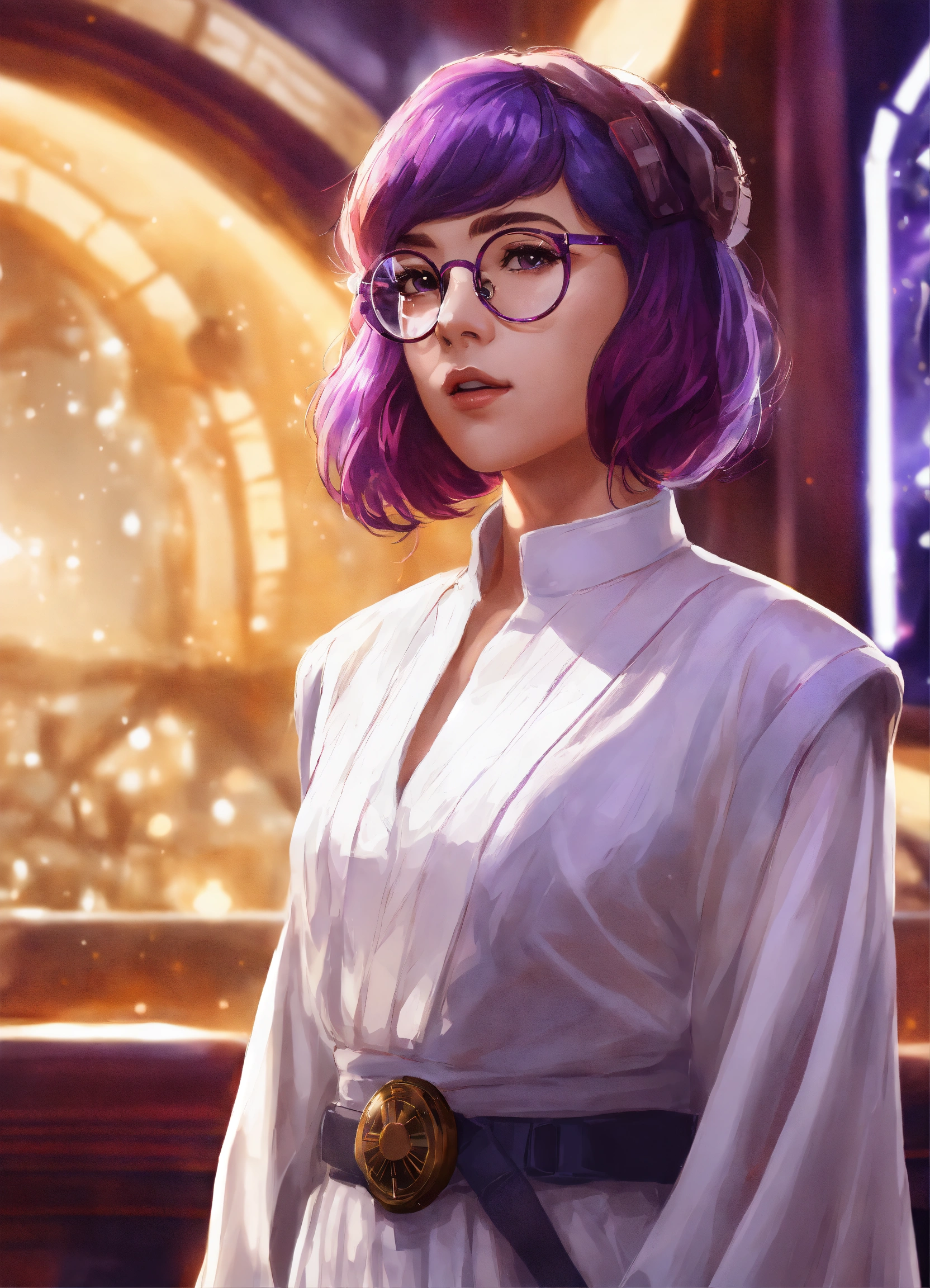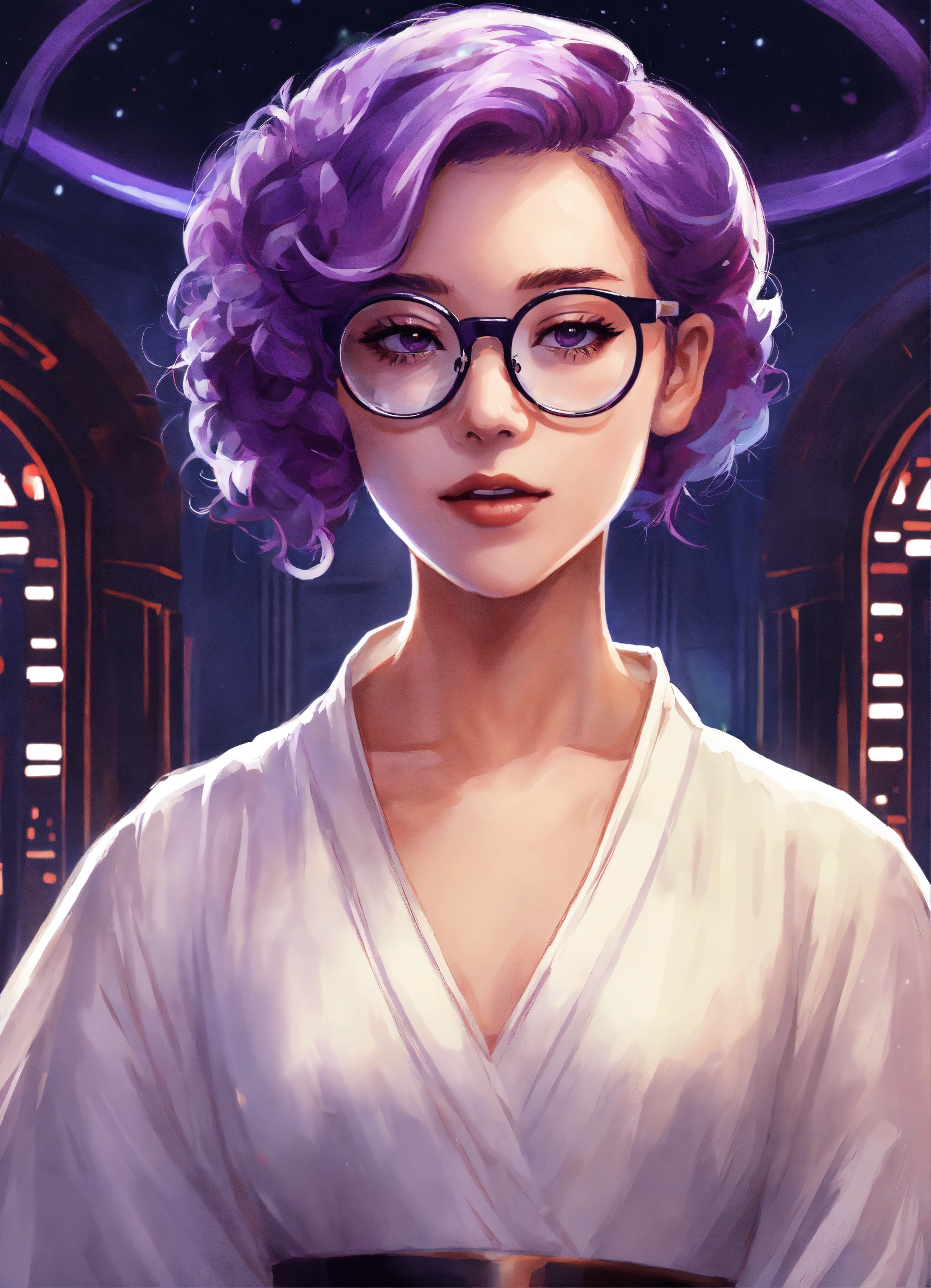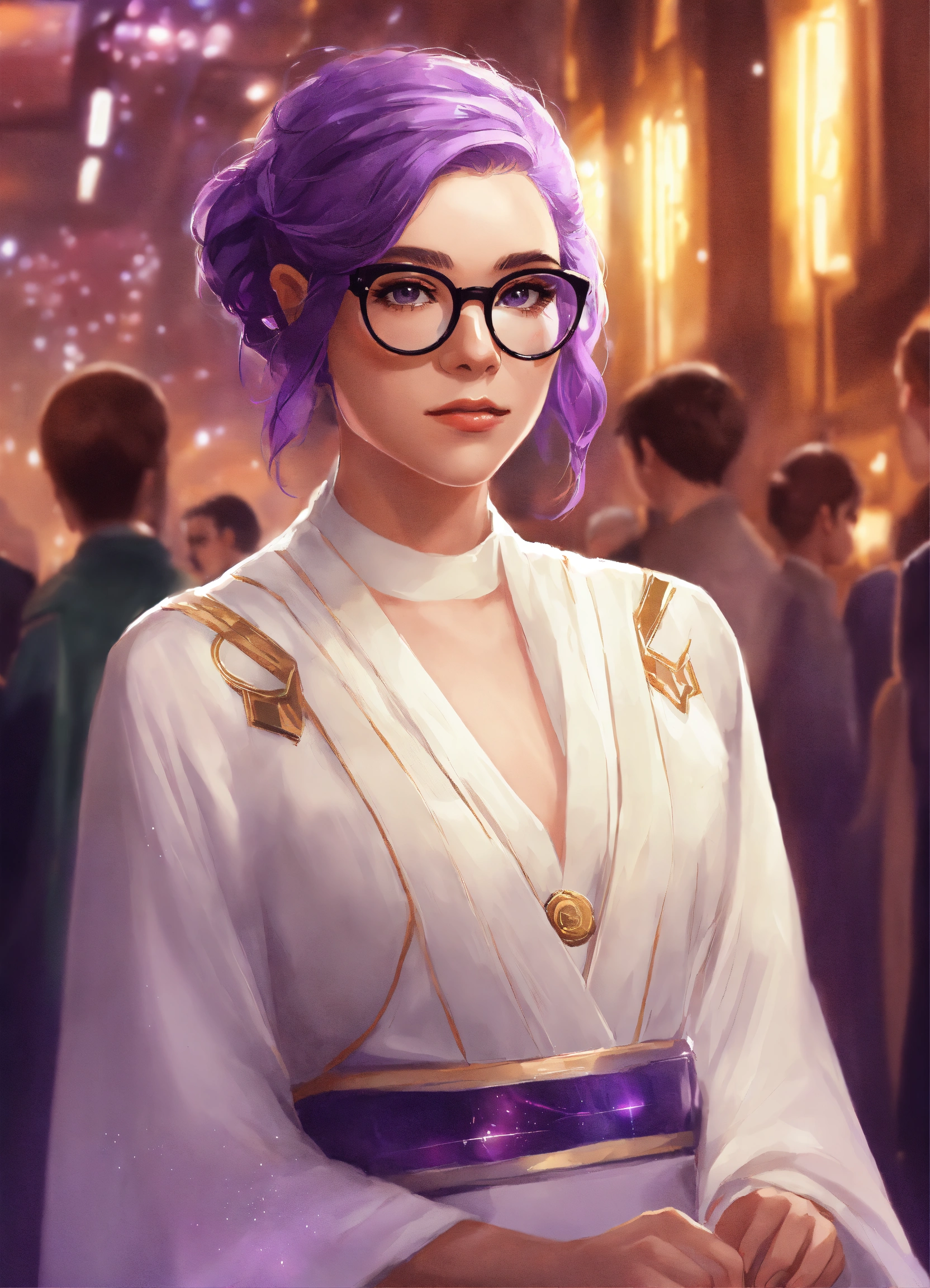Digital art of a young star wars senator with round-frame glasses, and purple hair, wearing a white dress at a gala.