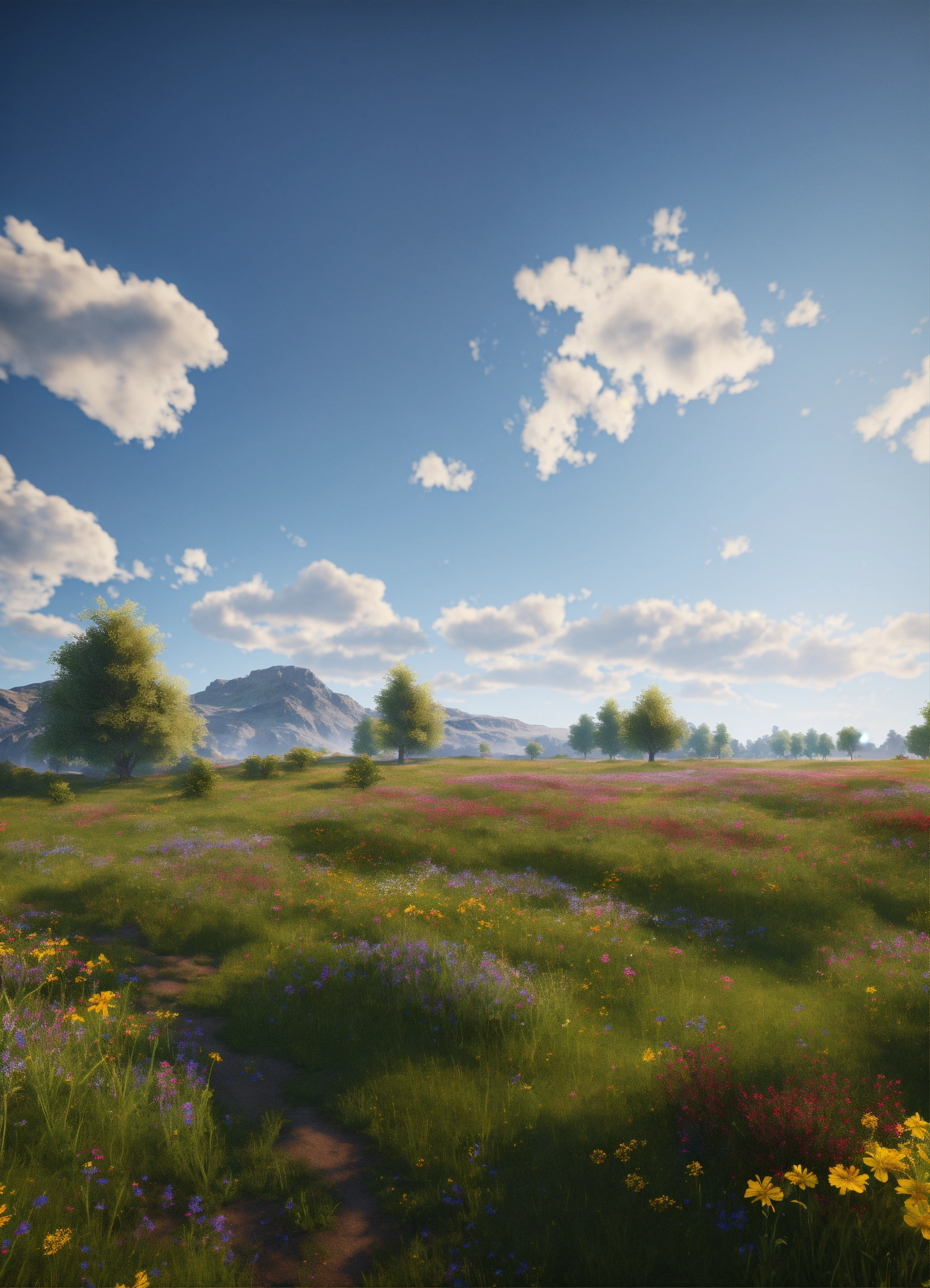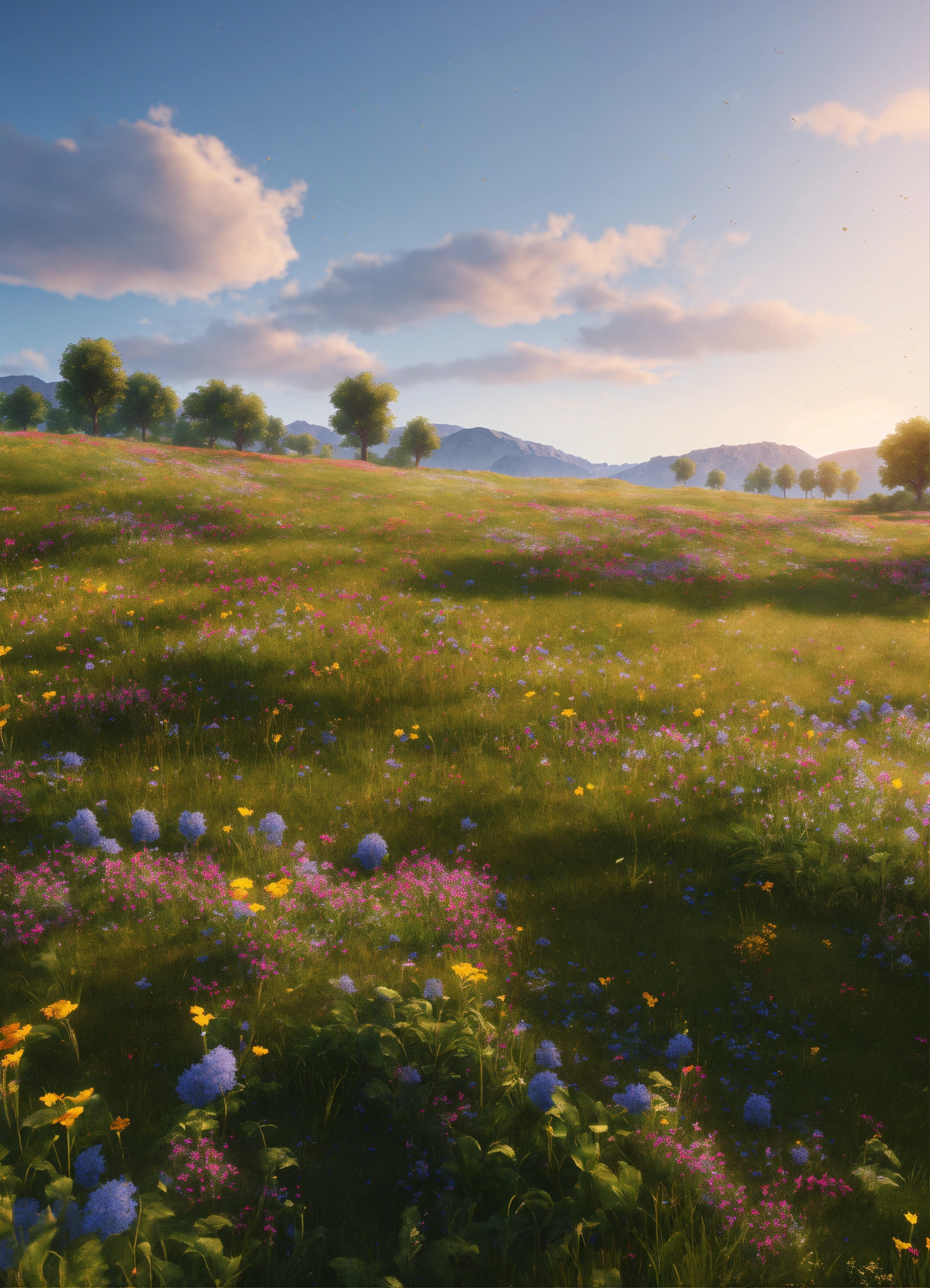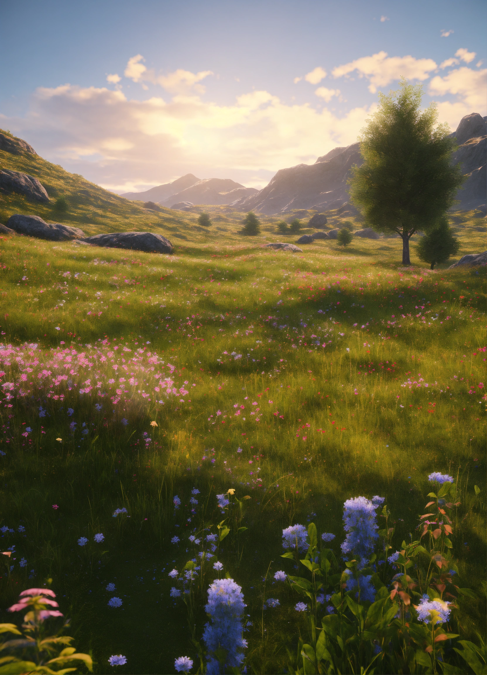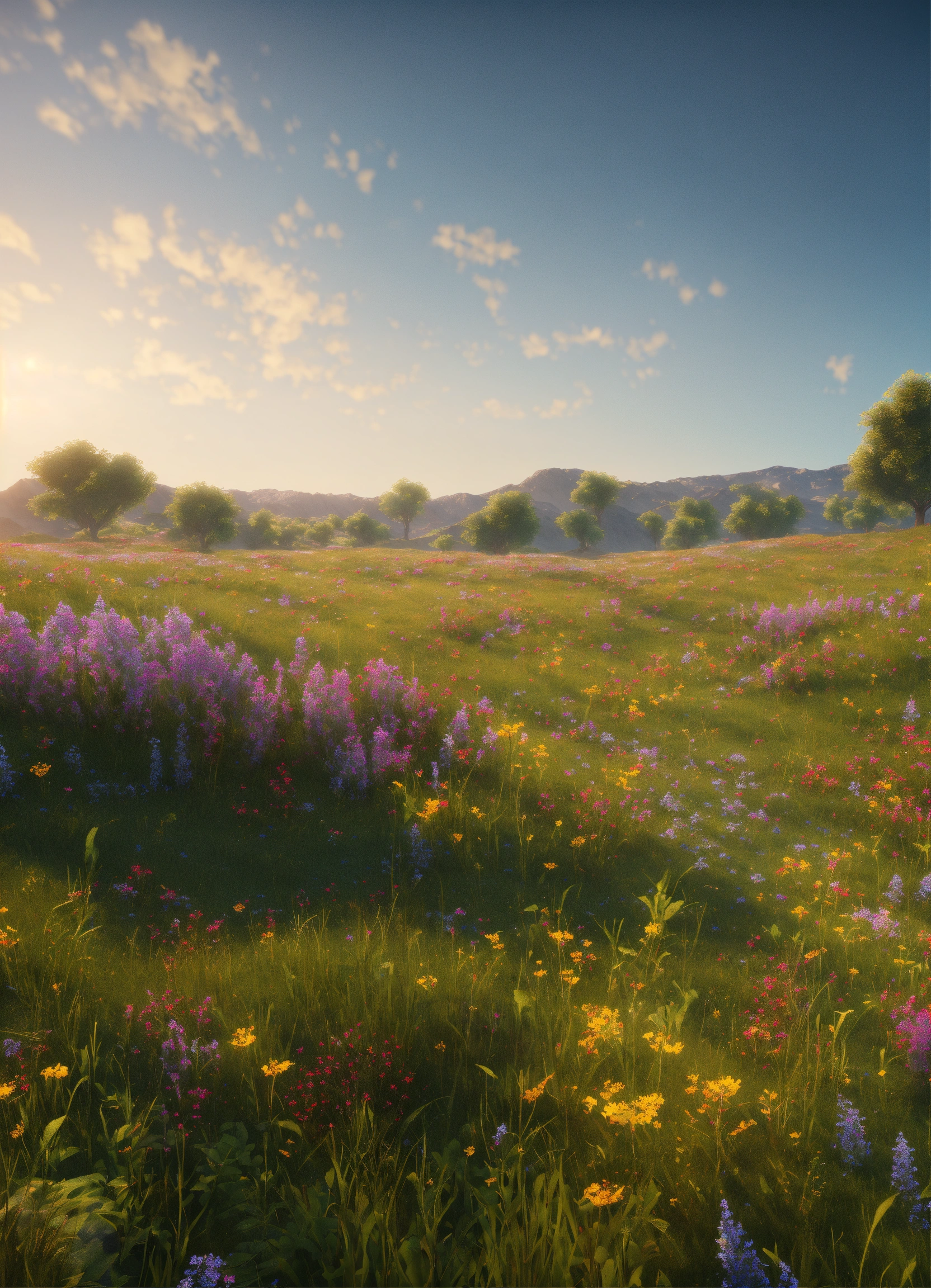 Large open field, lush grass, wildflowers, cright clear sky, realistic, highly detailed, unreal engine, 8k