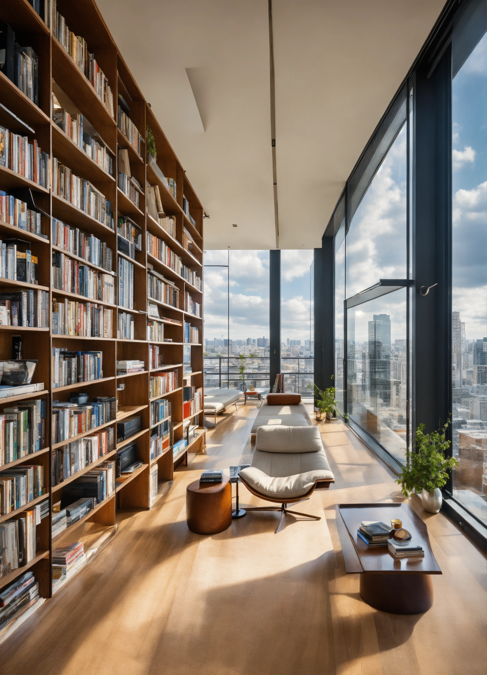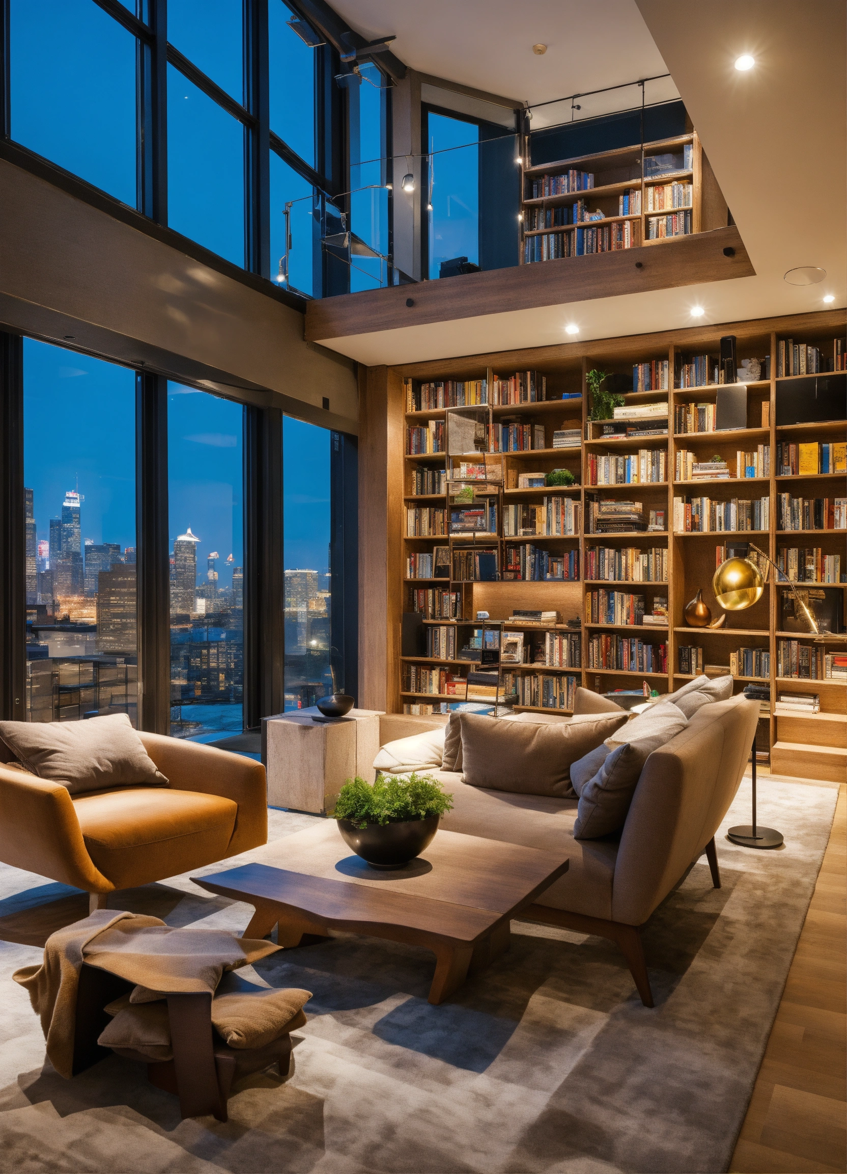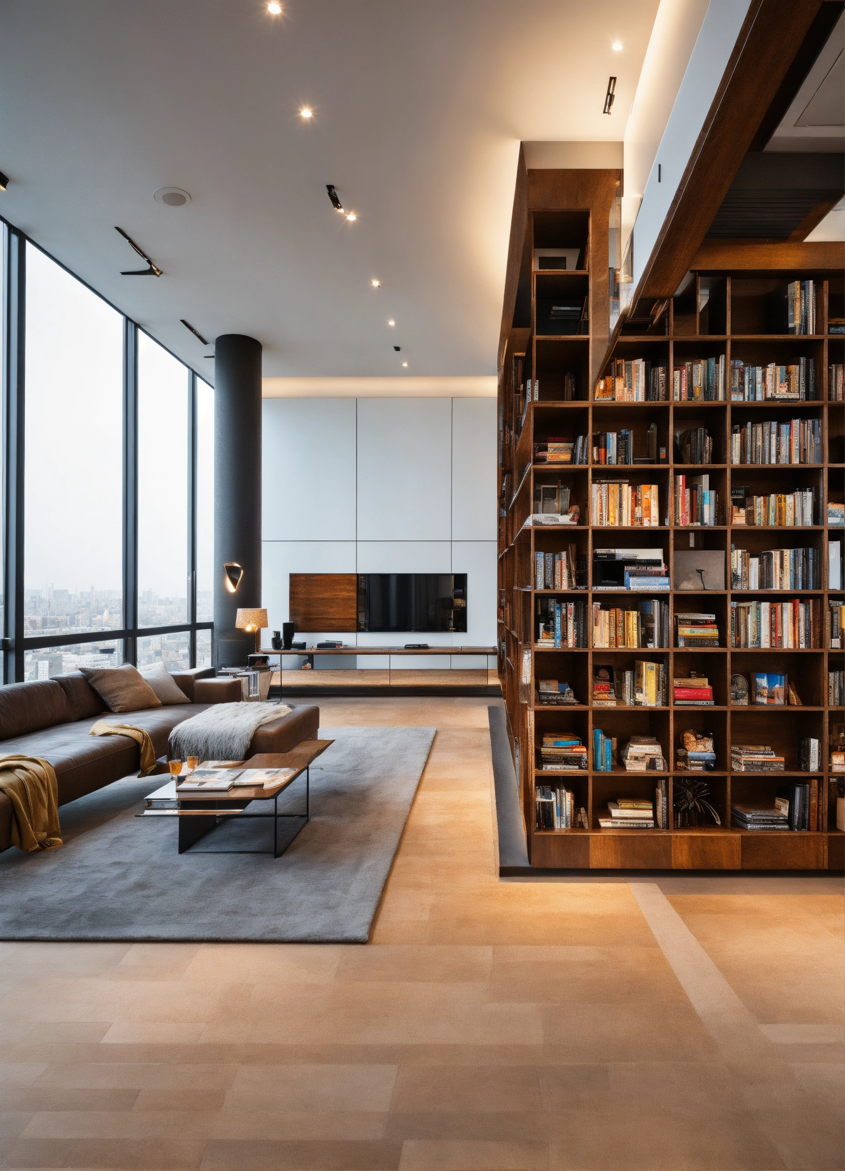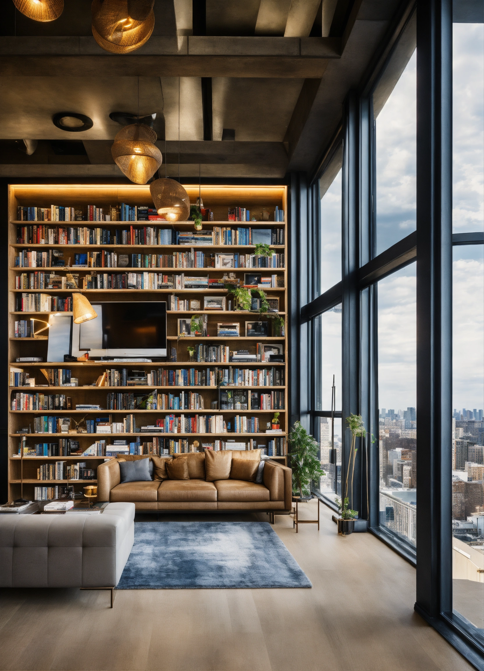 Modern luxury penthouse with contemporary bookshelf in an urban center