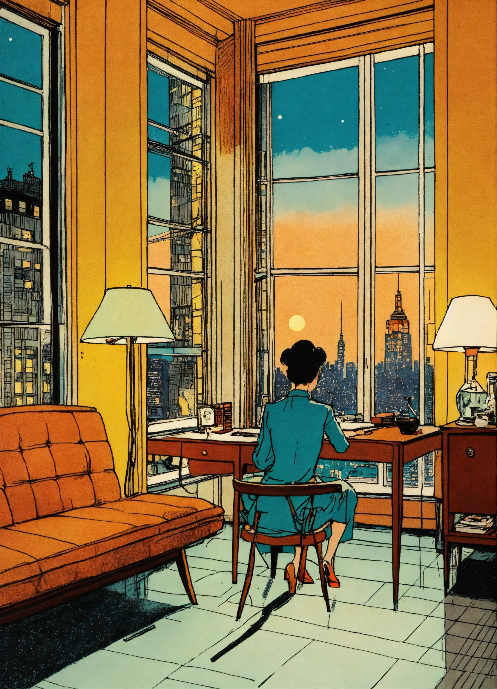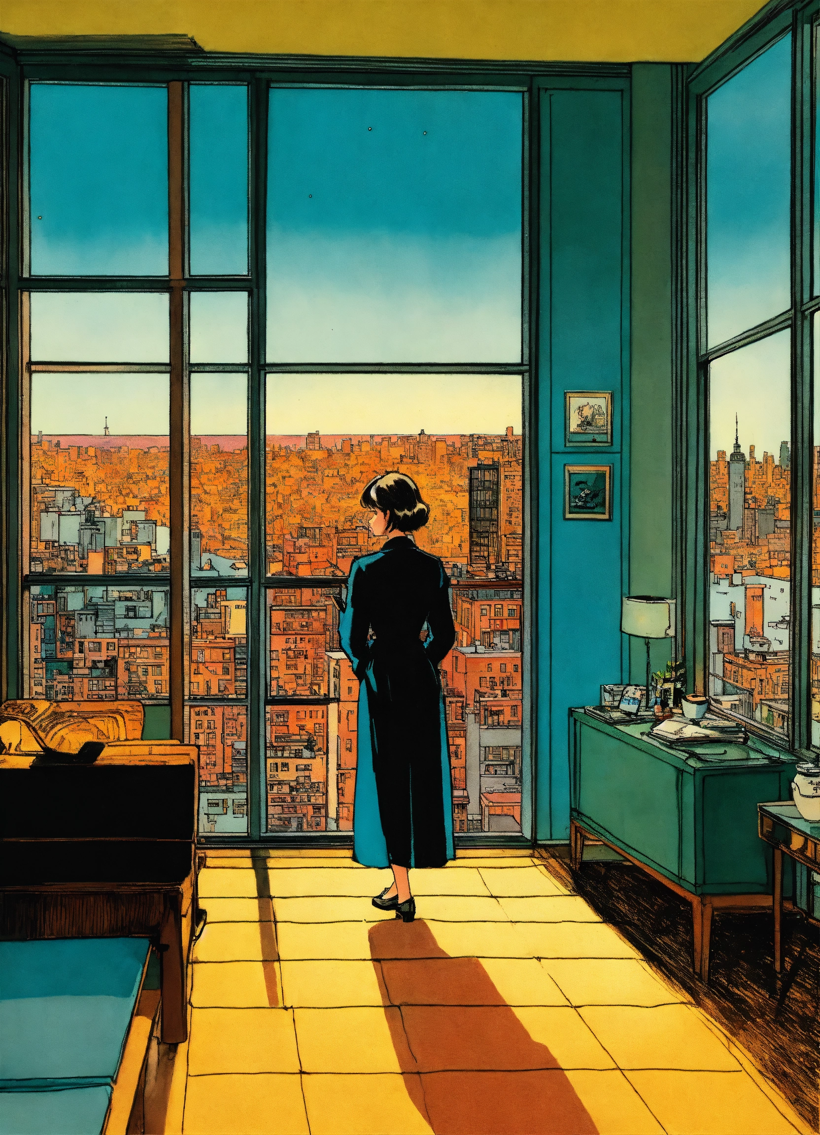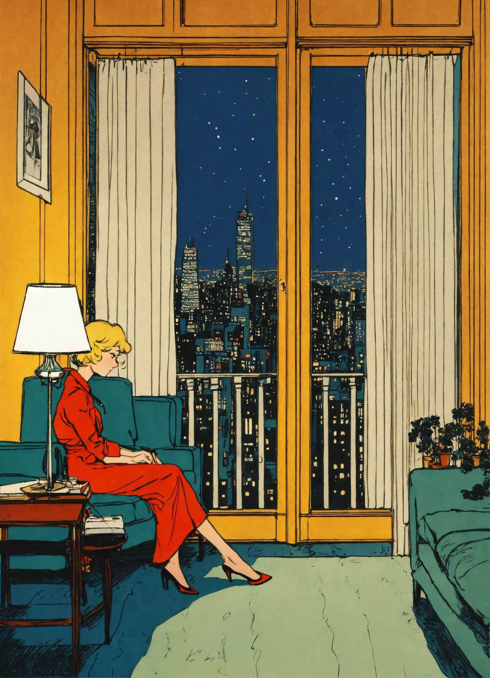 Pen and ink, illustrated by hergé, a lonely woman inside her beautiful mid century modern nyc apartment with big windows overlooking the city at night. sadness, stunning color scheme, masterpiece