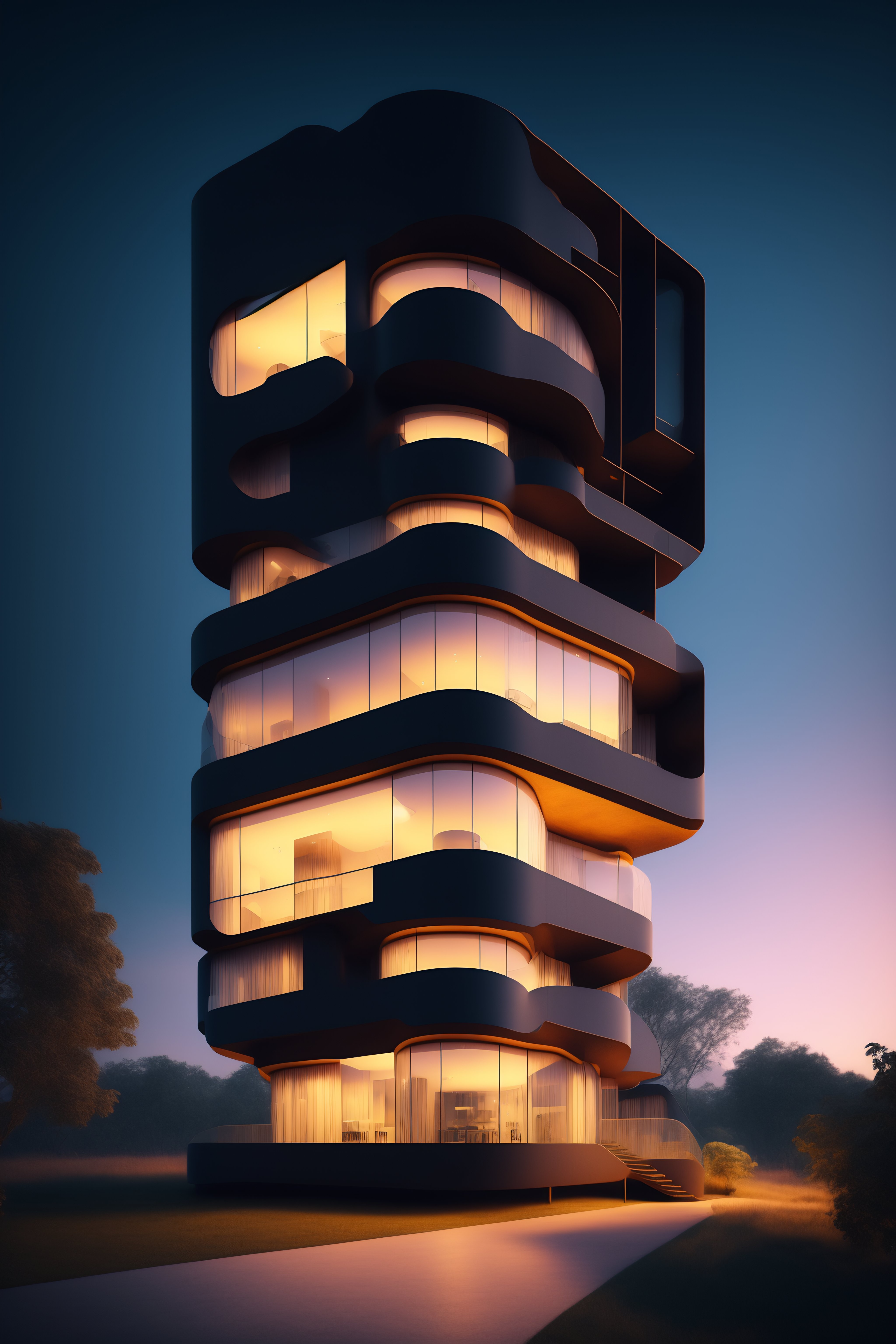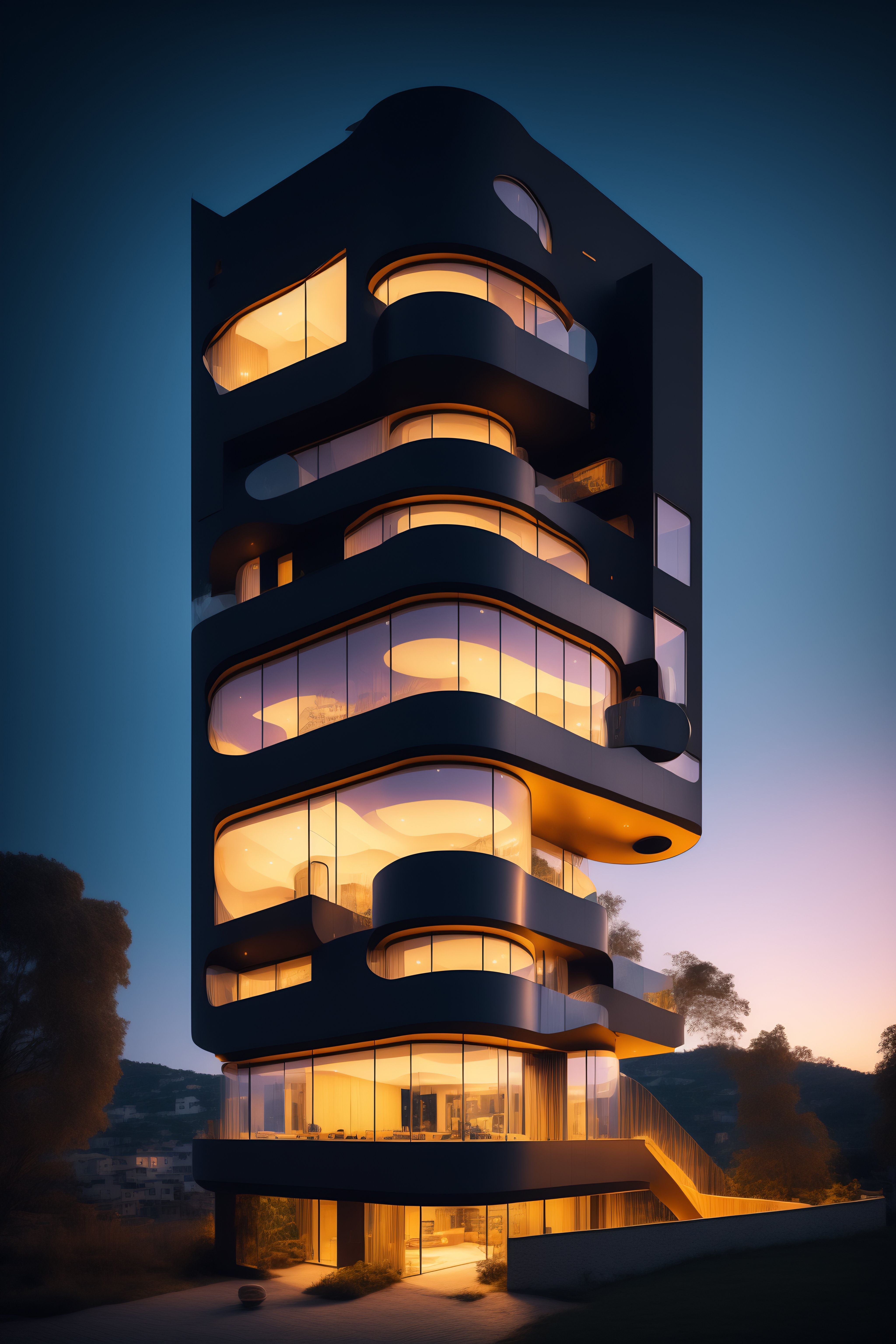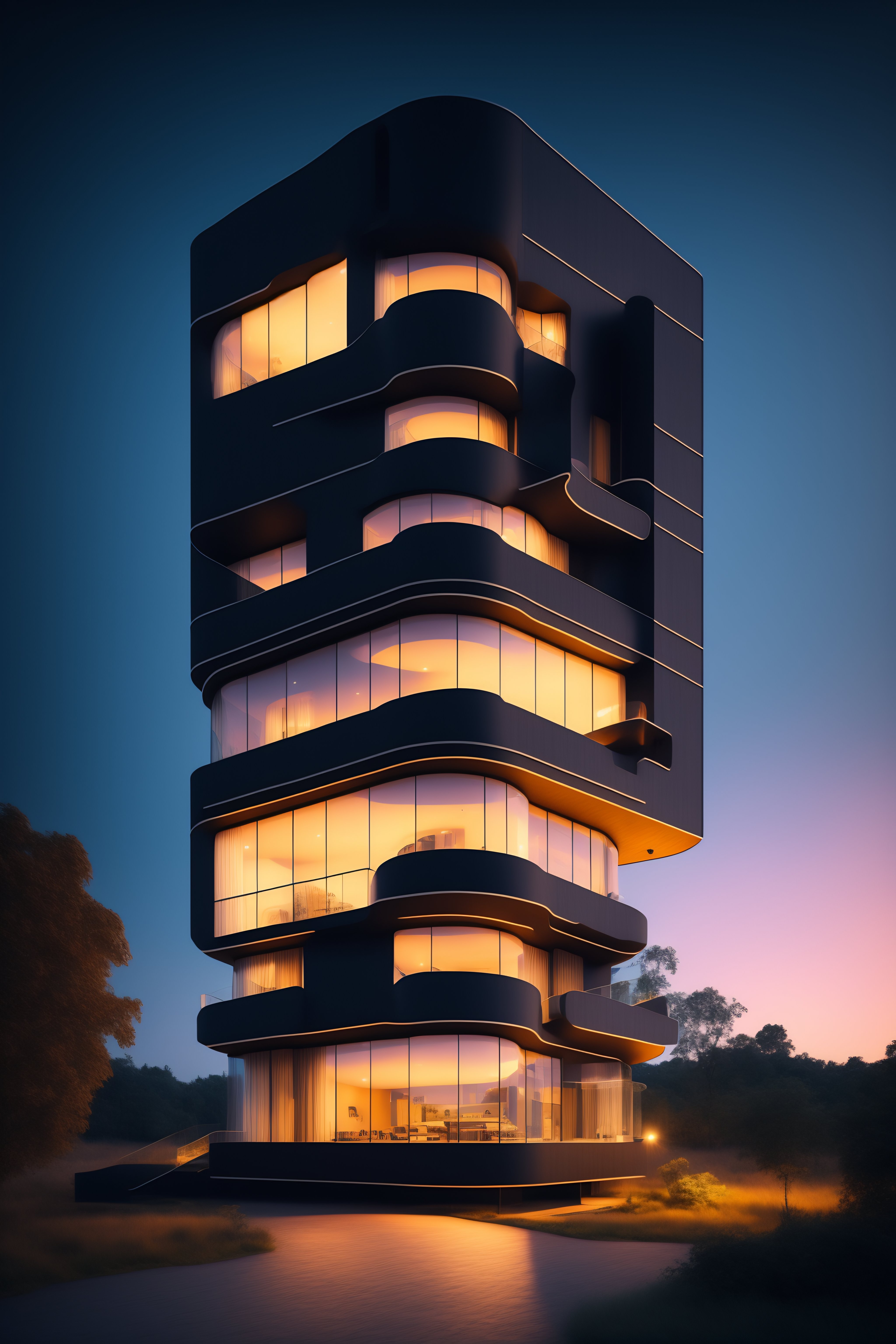 Multi-storey house built in the shape of a vertical crescent in the cyberpunk style at night
