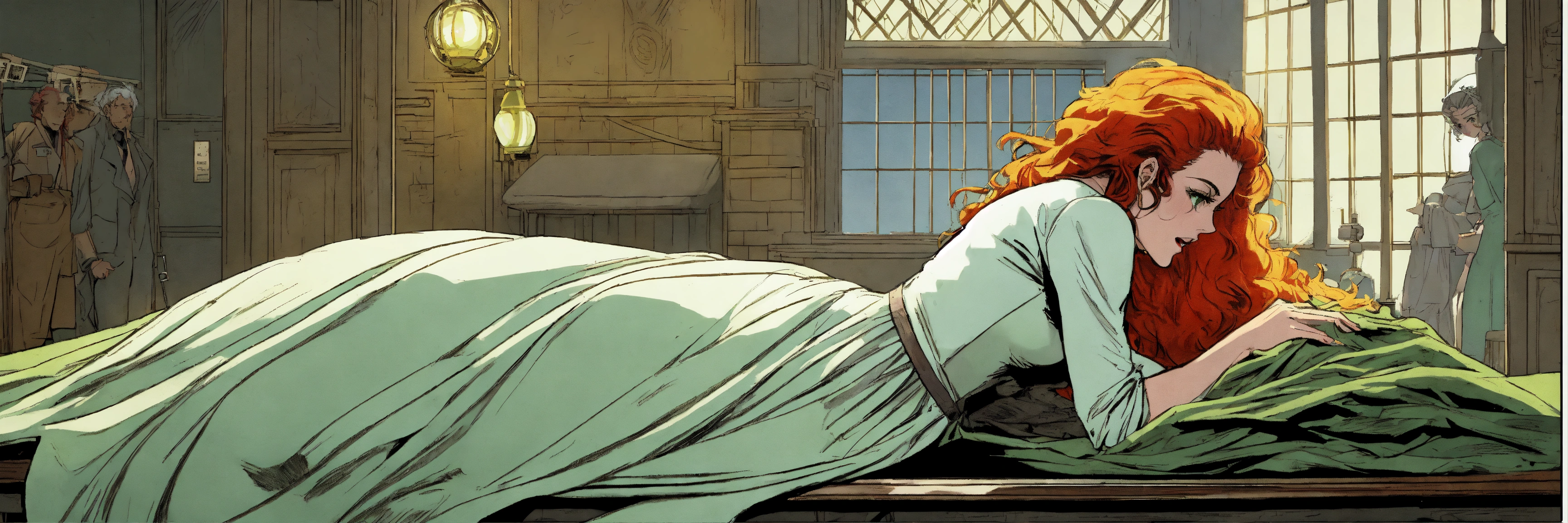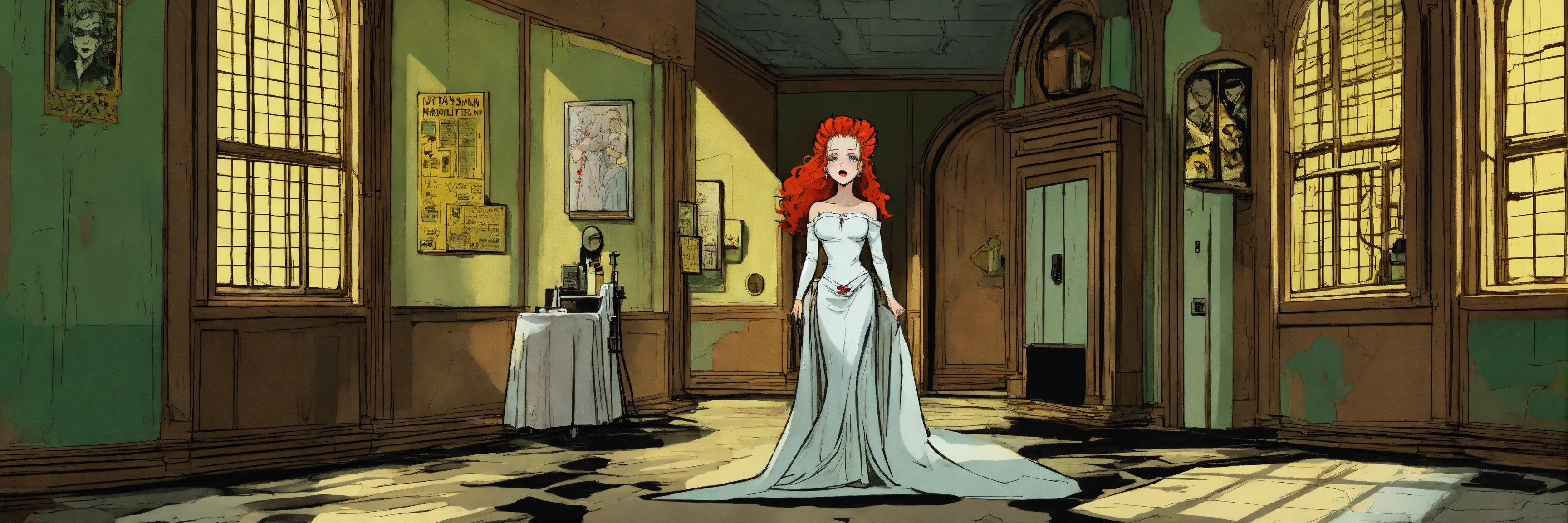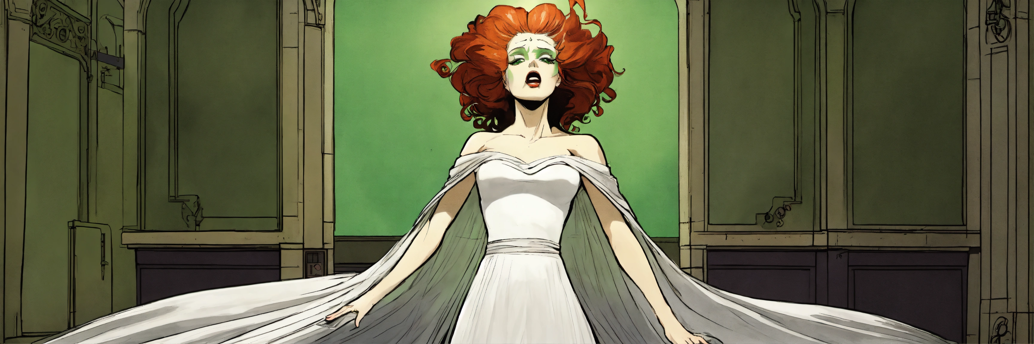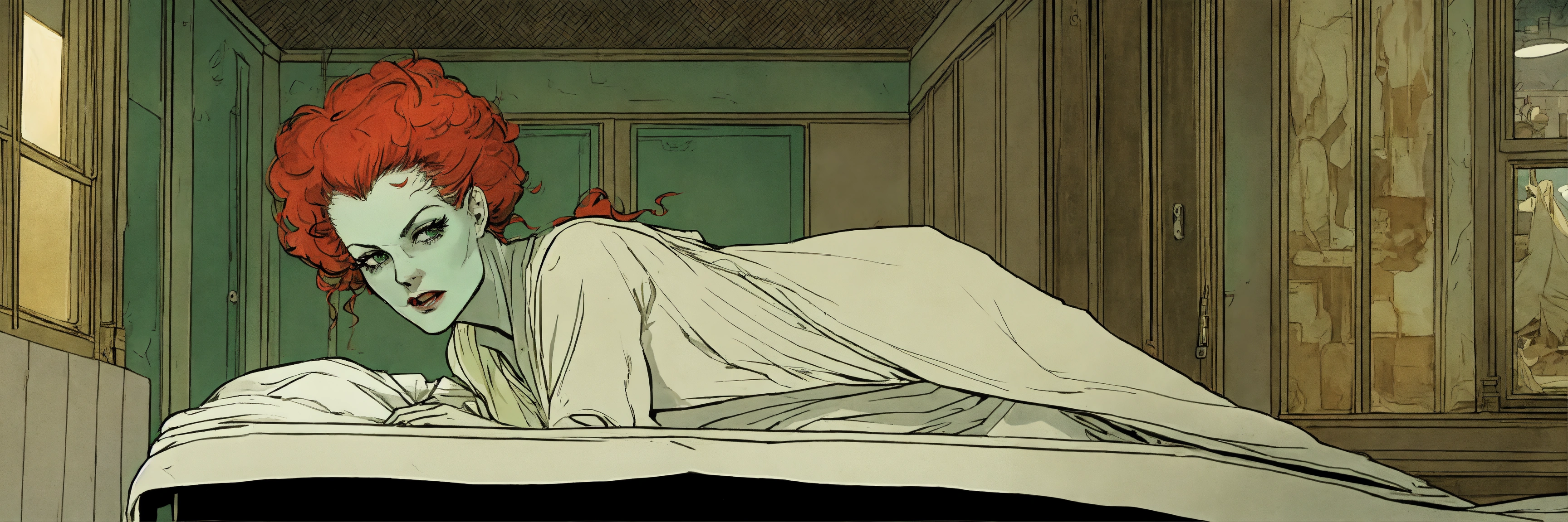 Frame by frame, full body view of a redheaded green-eyed woman as the bride of frankenstein, rising up from the dead from under a sheet, off from on top of a hospital operating table, from her back in an old castle tower laboratory, she has white streaks of gray hair through her hair from behind her eyes, that run root to tip. drawn like a 1960 black and white comic book.