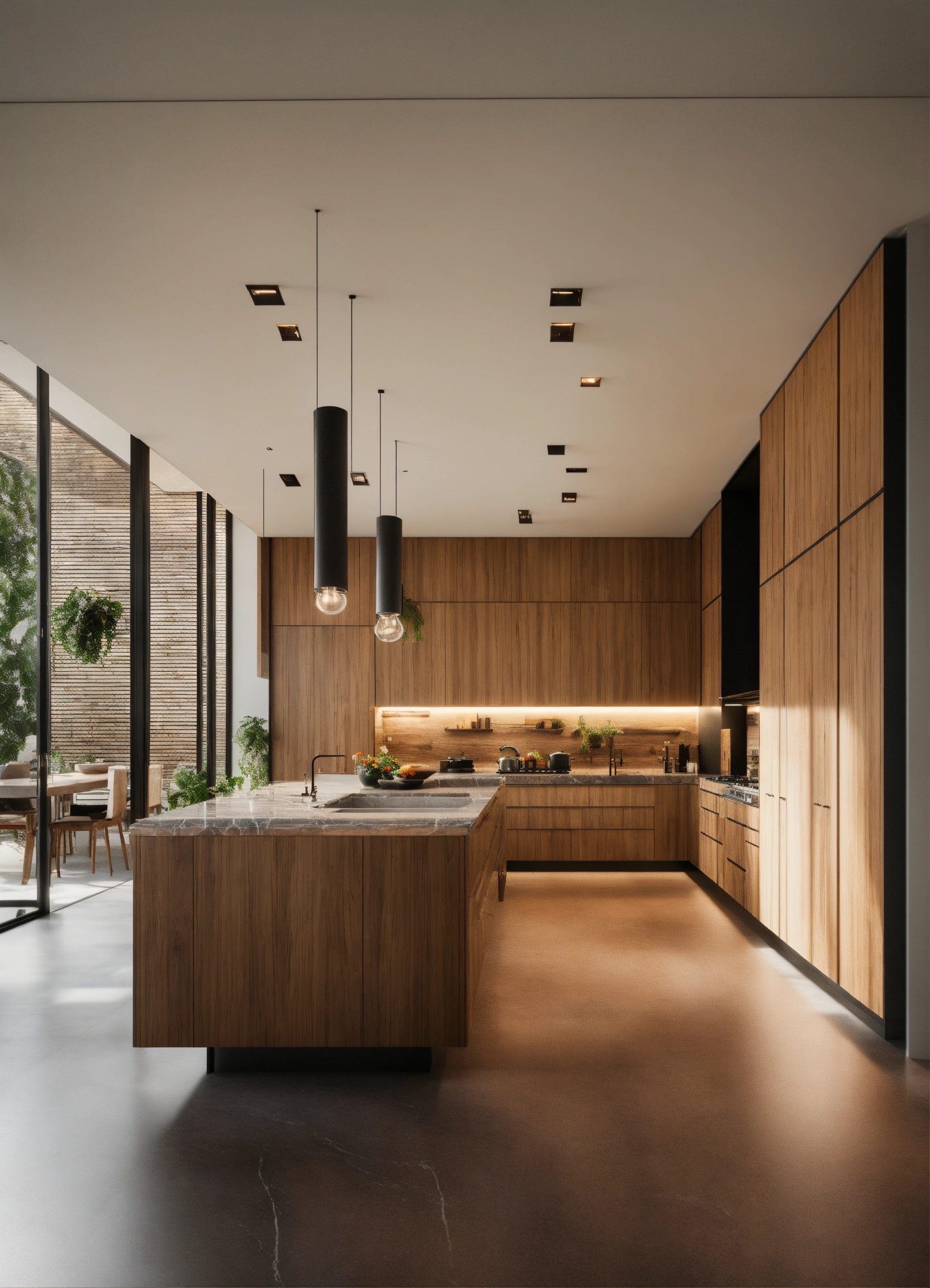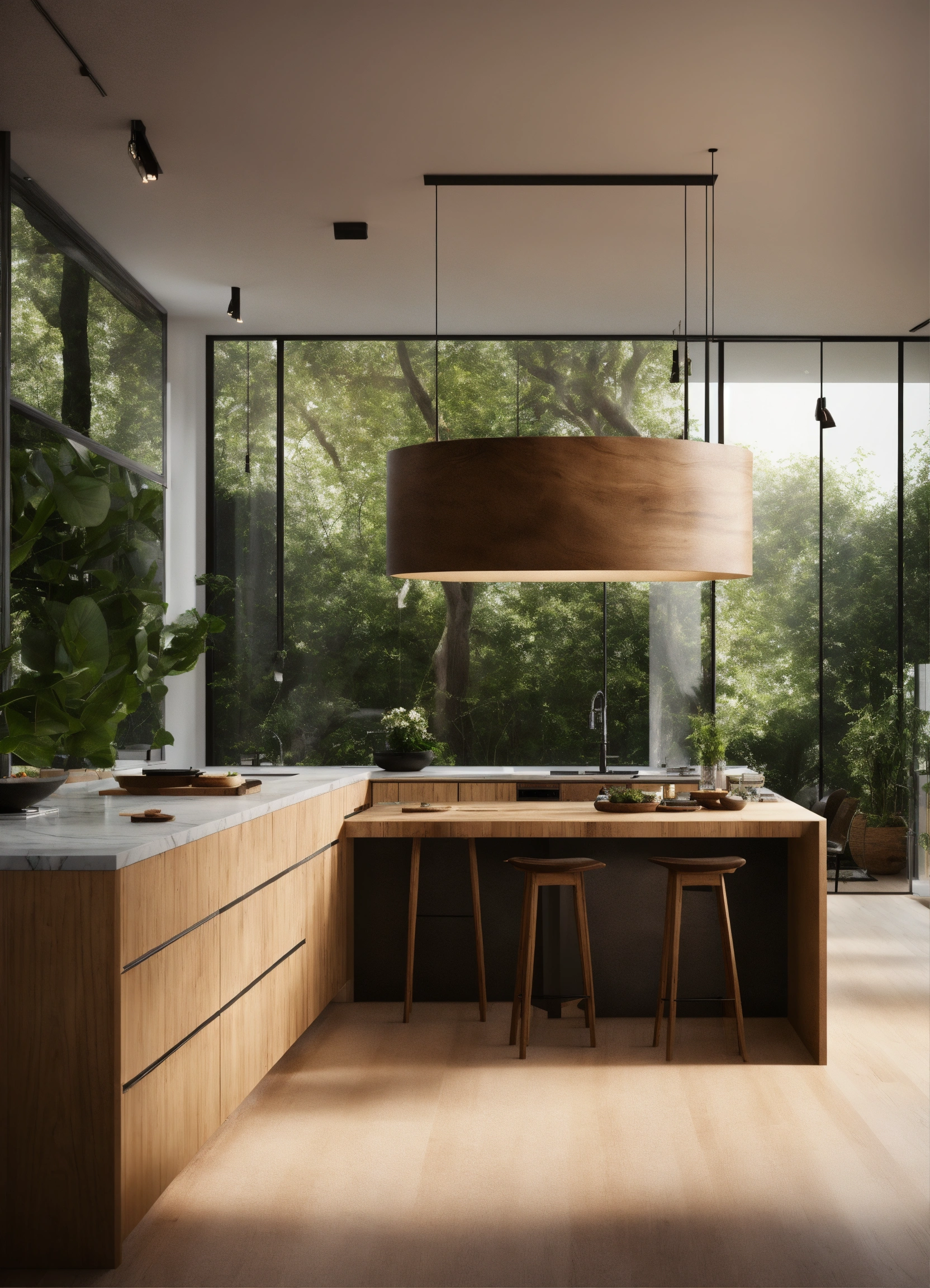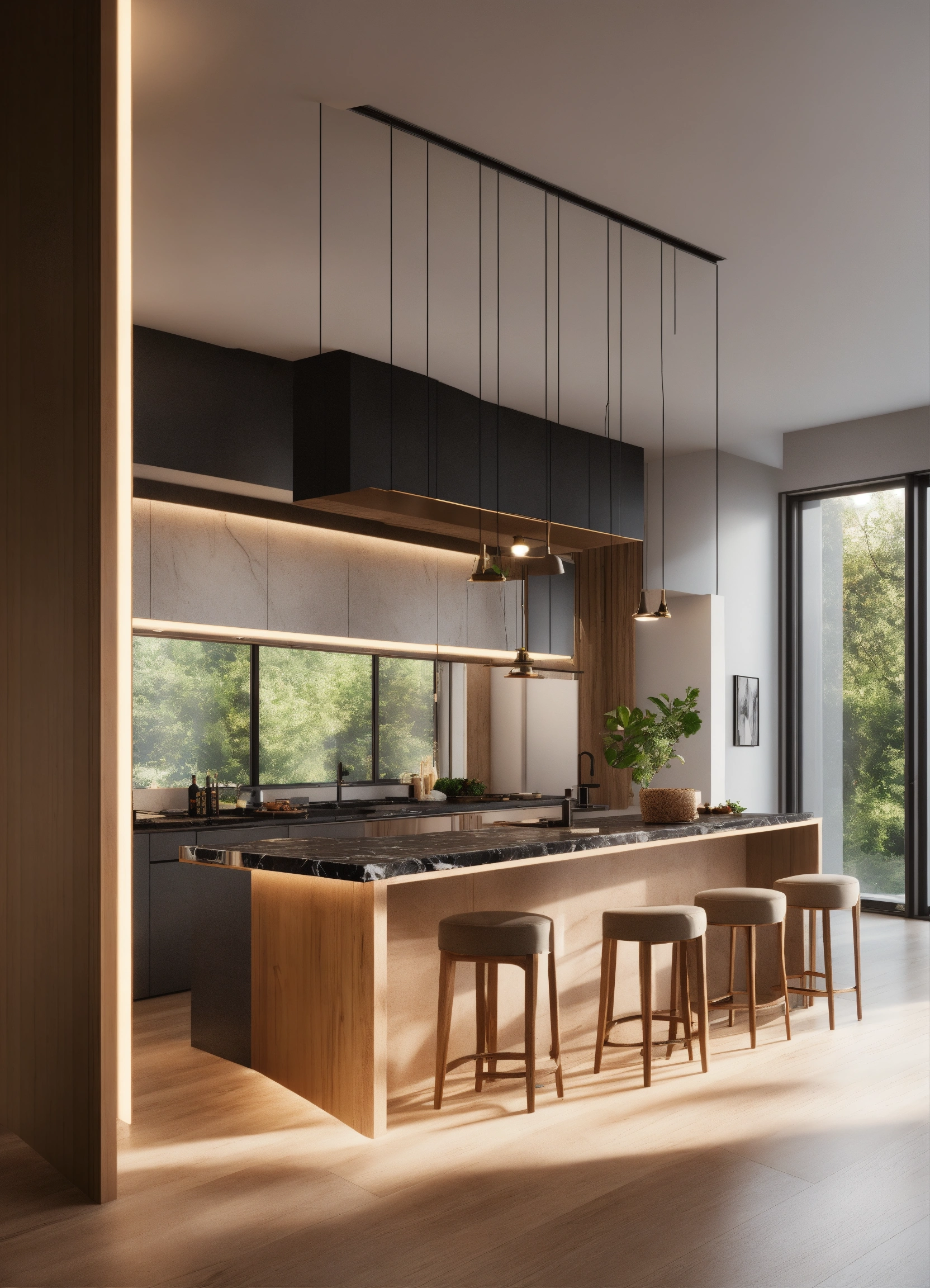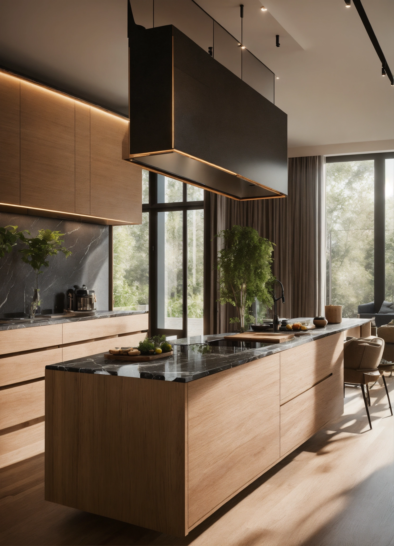 Highly detailed, shot with nikon reflex d3200, natural lighting, hyperrealistic cinematic, highly detailed, unreal engine 5, ultra detailed, 8k, cinematic lighting, depth of field, photorealistic, intricate details, camera shots, contemporary atmosphere, wood and black marble kitchen design architecture, modern design, minimalist room, plants that hang from the ceiling above the centre island of the kitchen, central kitchen island, indirect lighting, a minimalist interior atmosphere, large bay window, ultra design atmosphere