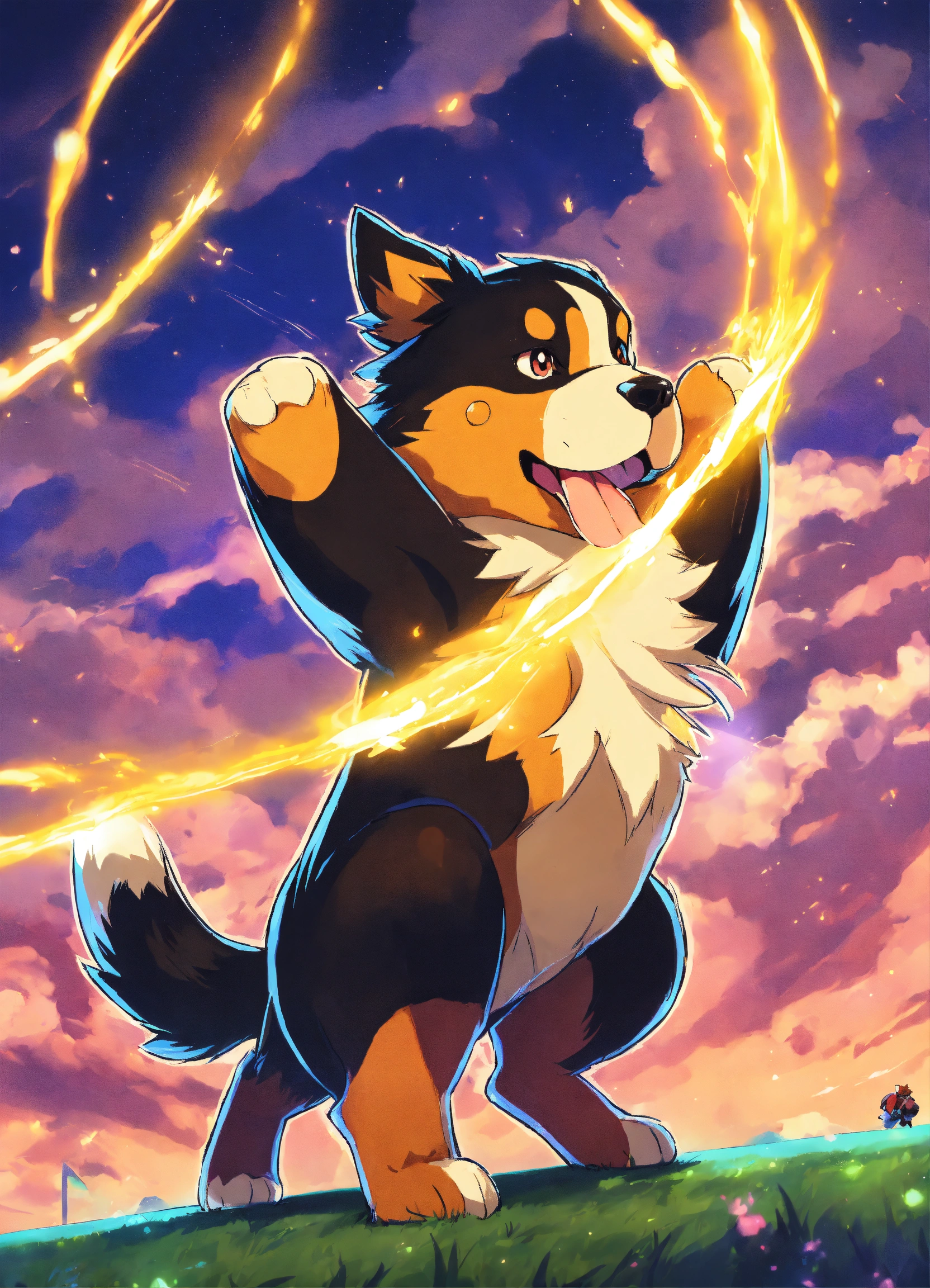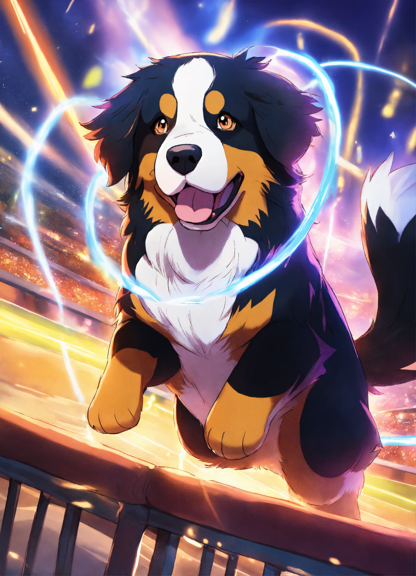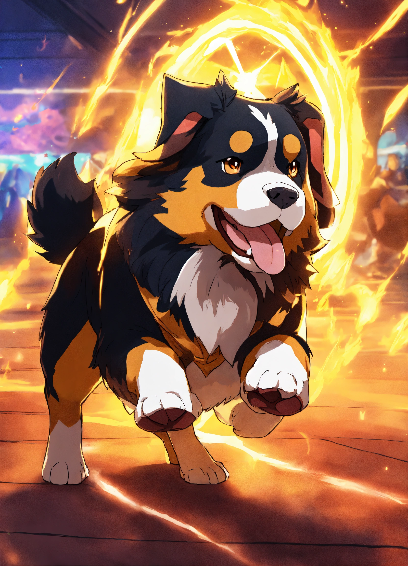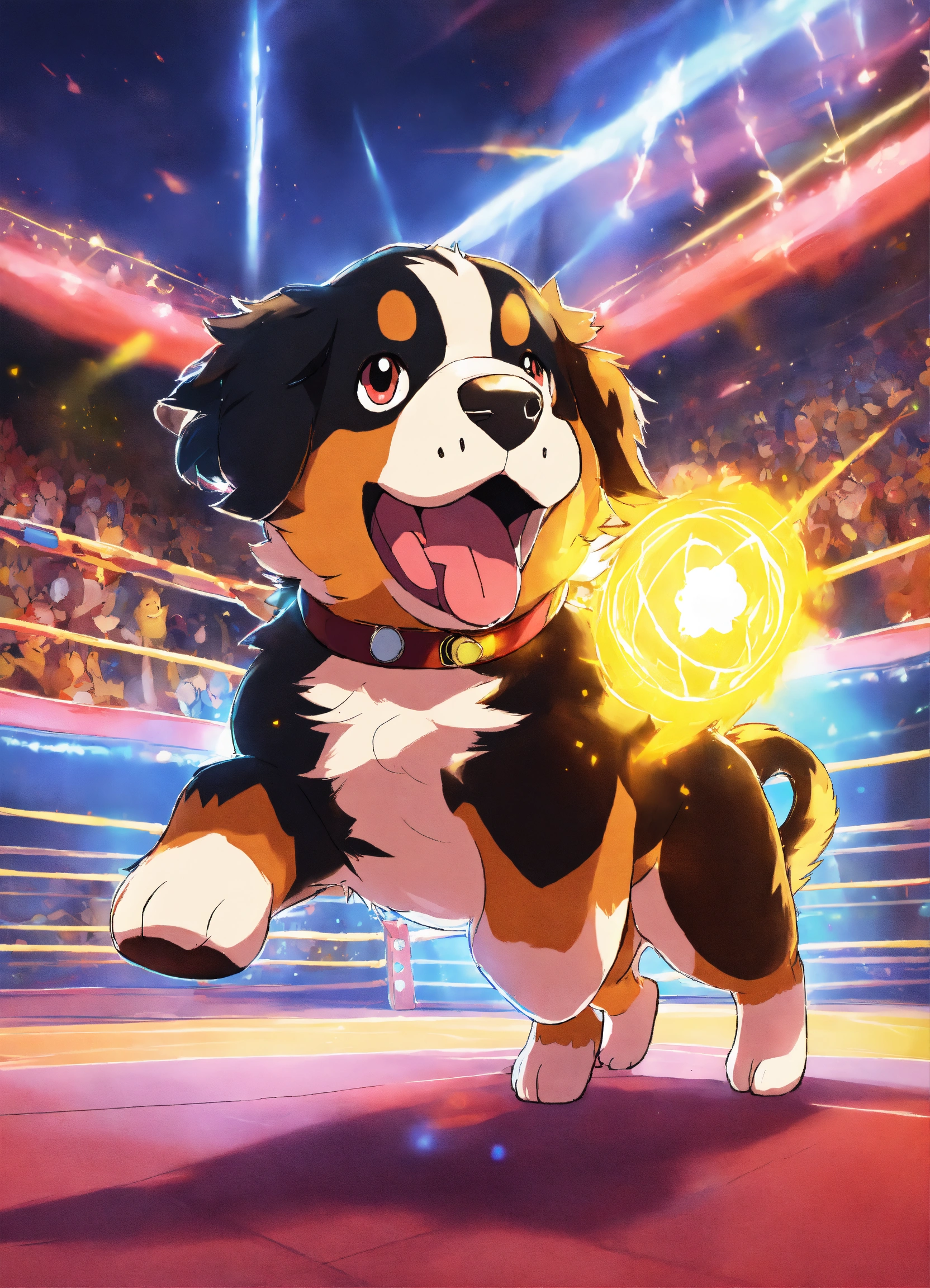 Pokemon art, anthropomorphized bernese mountain dog, glowing with magic, in a fighting ring against pikachu
