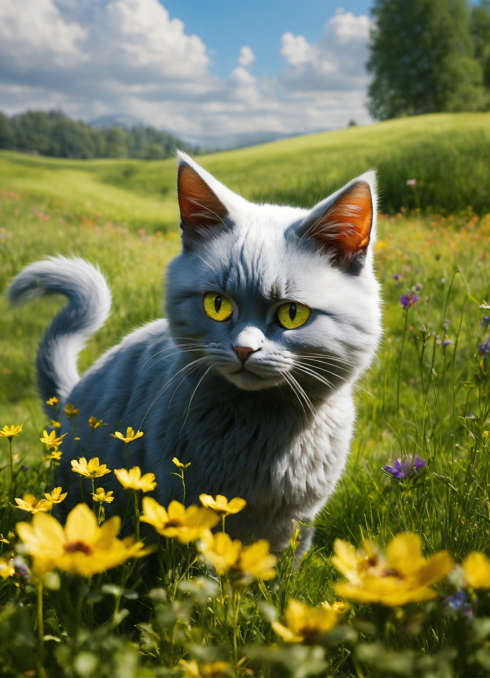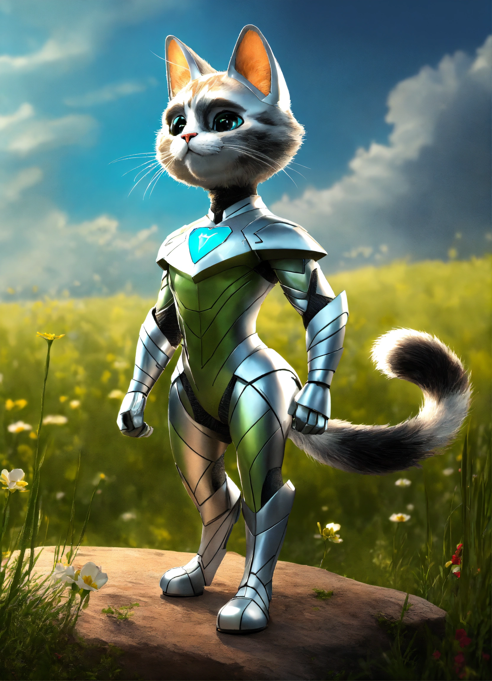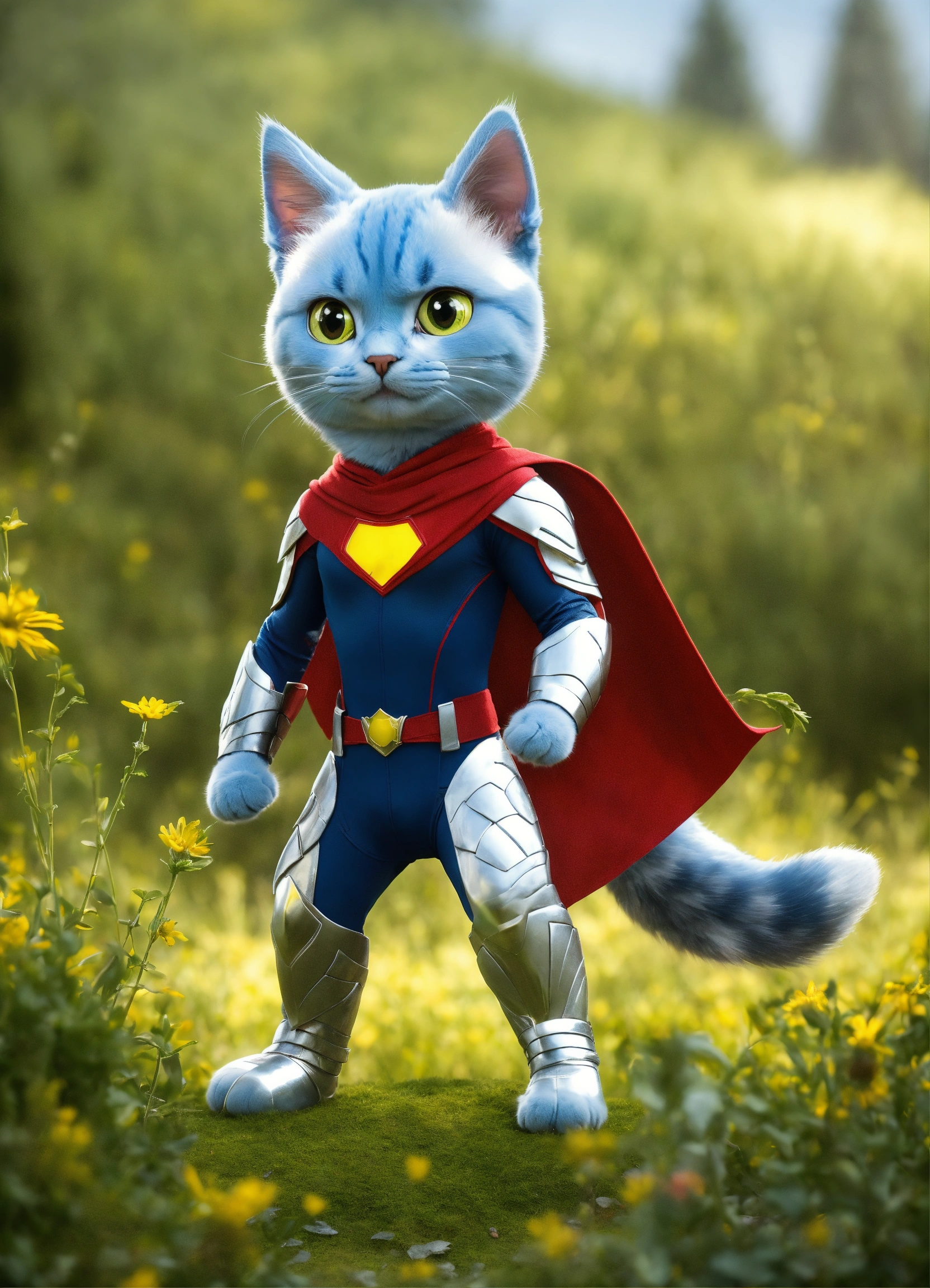 Cat adjectives agile, mysterious, heroic verbs silver moves gracefully through the meadow, exuding the agility and charm superhero. his animated movements are captivating, evoking the style of animation pixar. silver has a sleek, superhero-like costume with a hint of mystique that adds to his aura of intrigue and adventure. with his enigmatic yet heroic appearance, silver complements the scene in the meadow, making the trio of characters even more compelling and visually captivating.